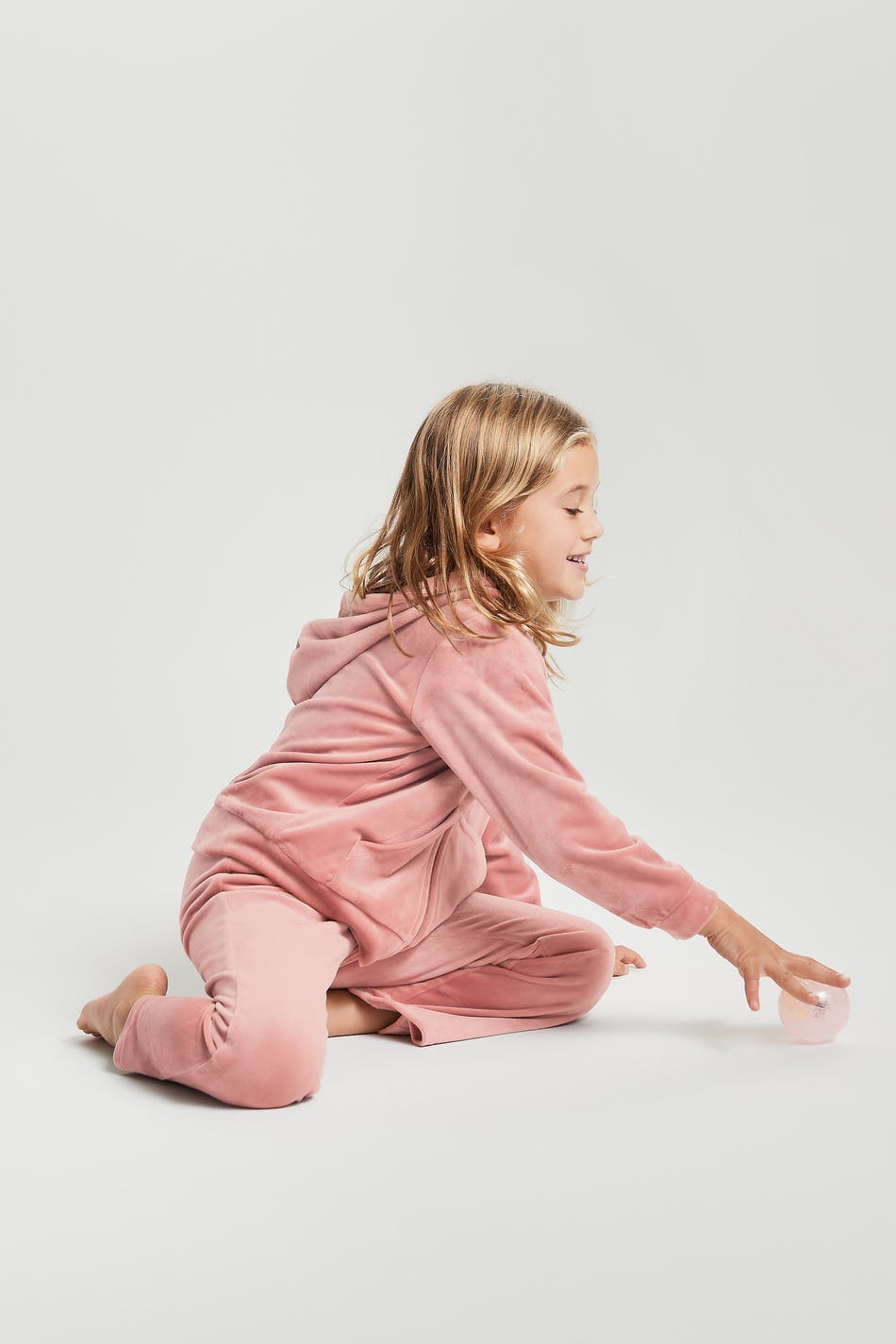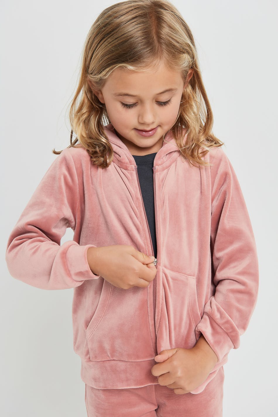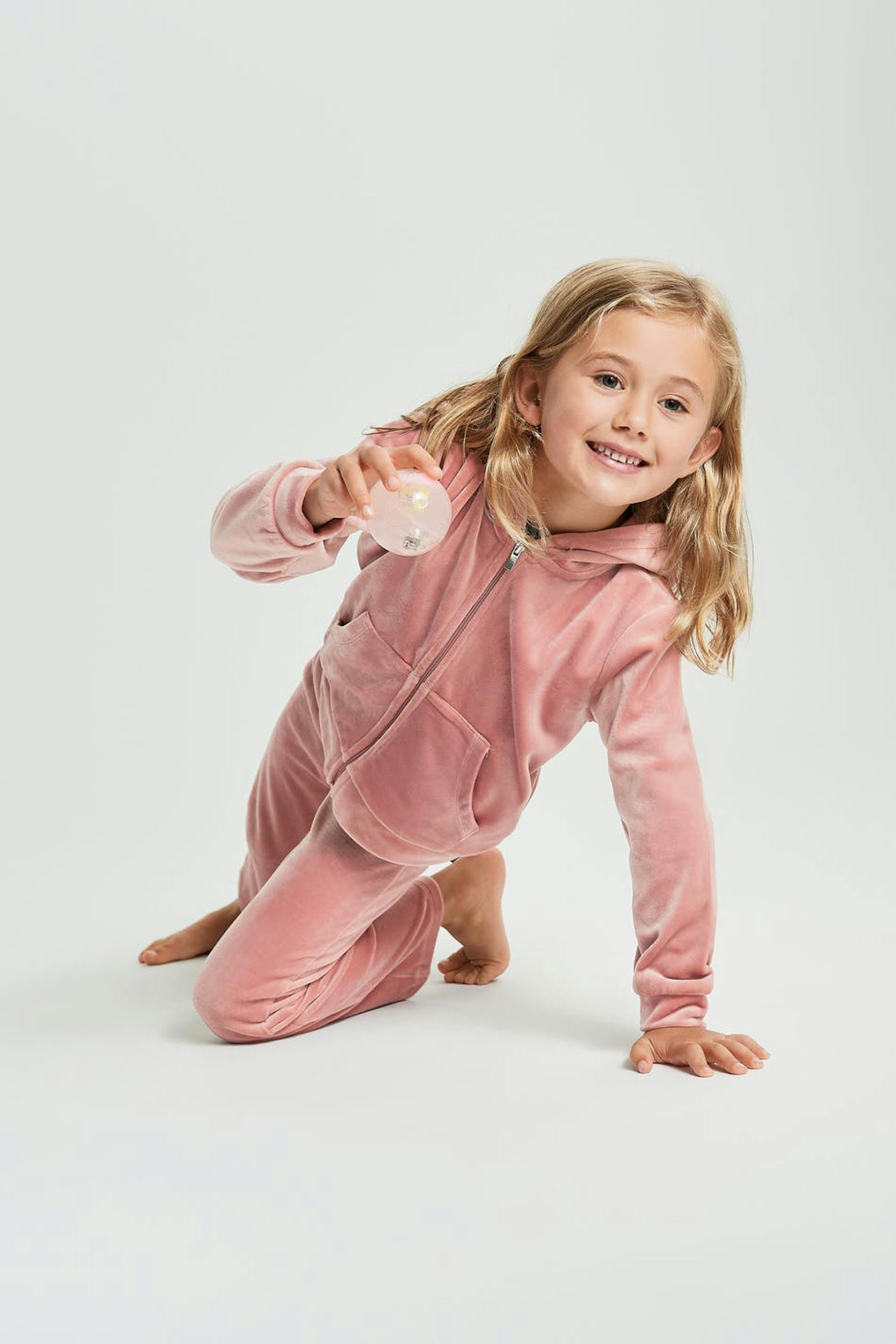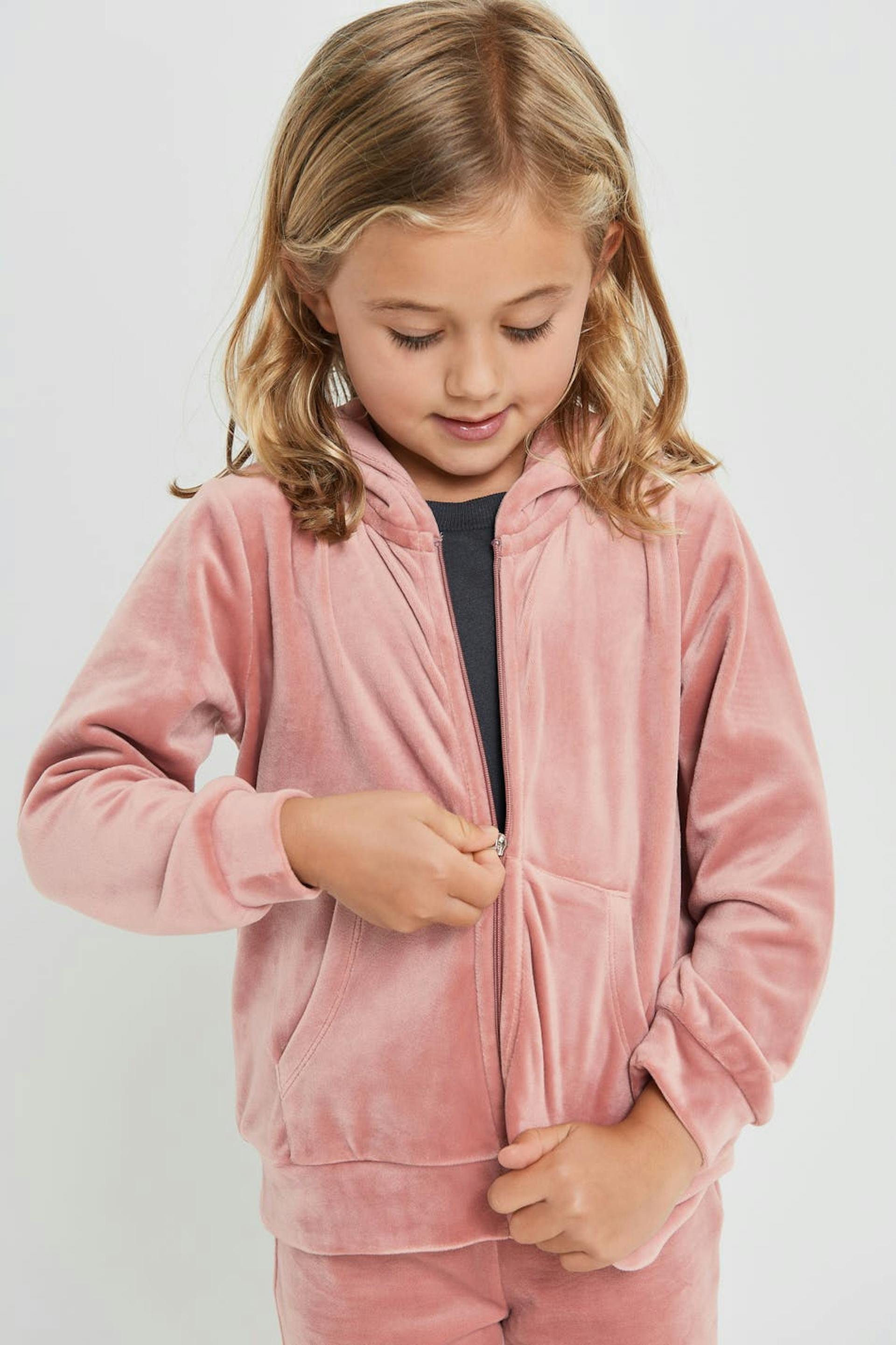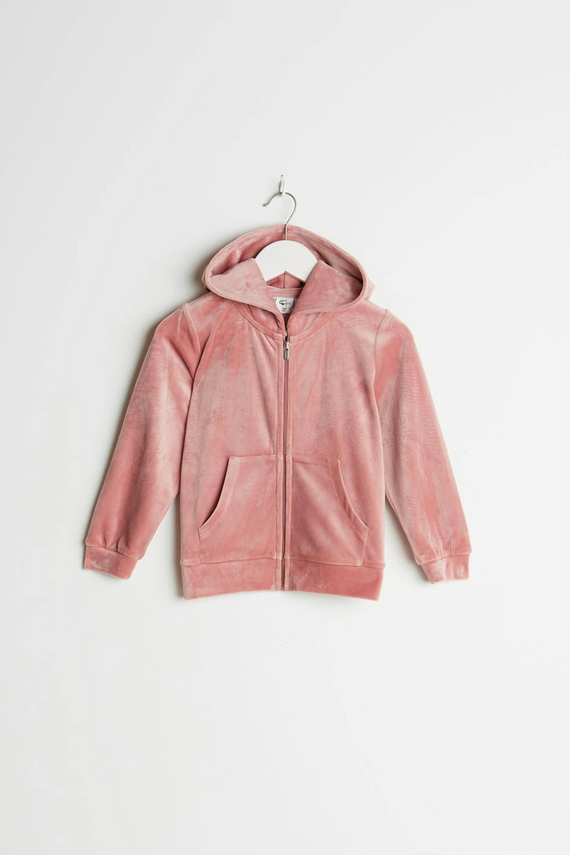Genser for barn med en hette. Genseren er rosa og har en glidelås på framsiden. Den er laget av velur og har en lomme på framsiden. Holdes unna åpen ild.