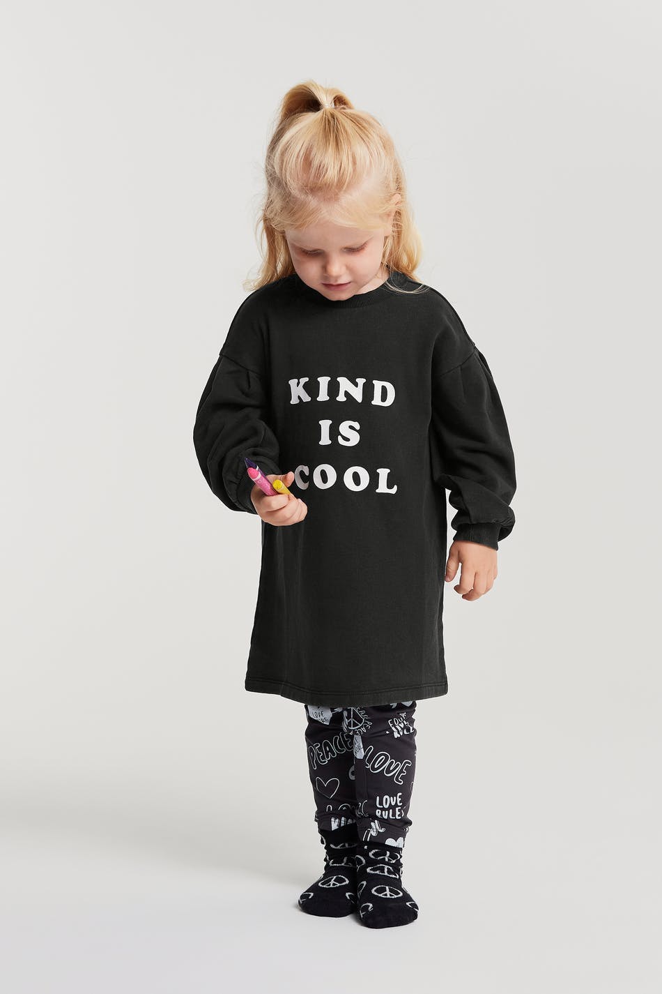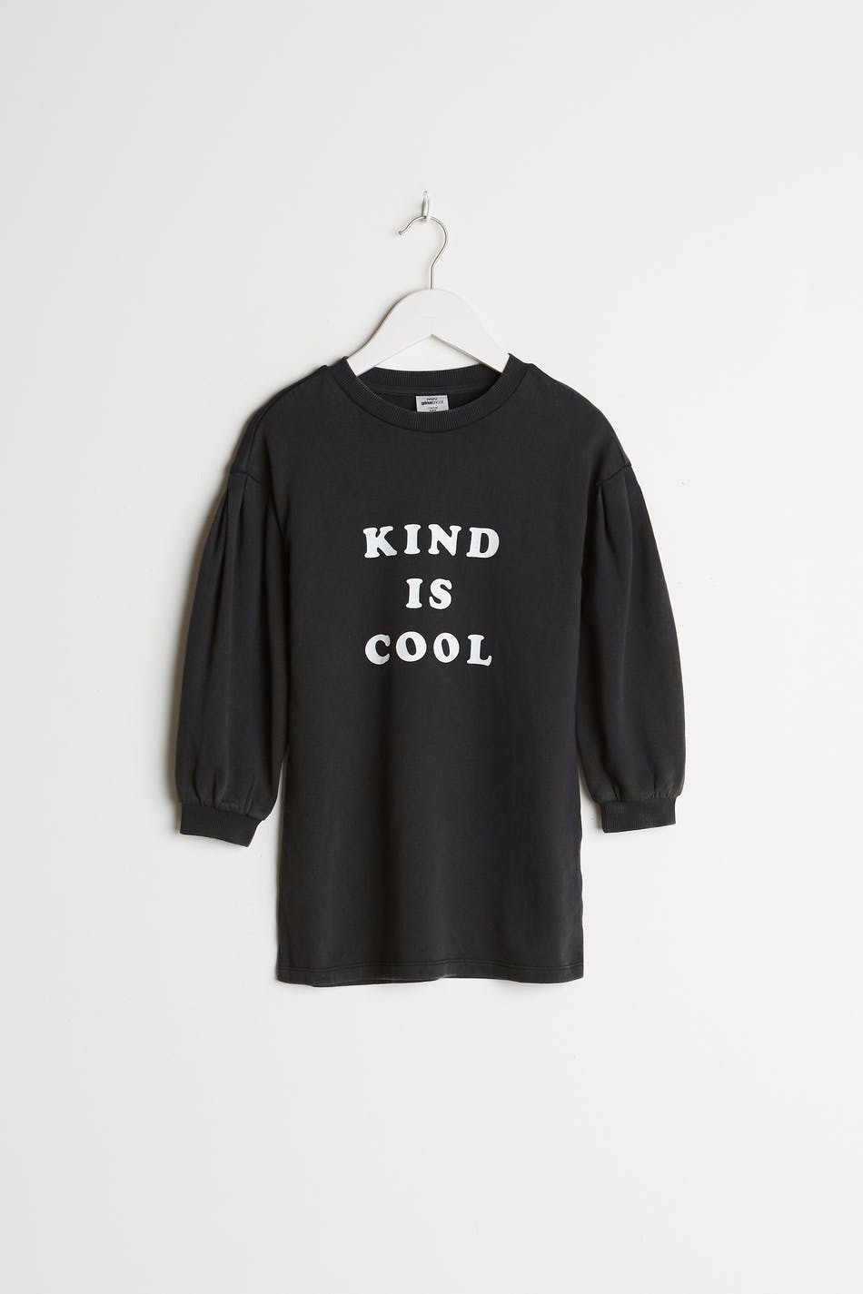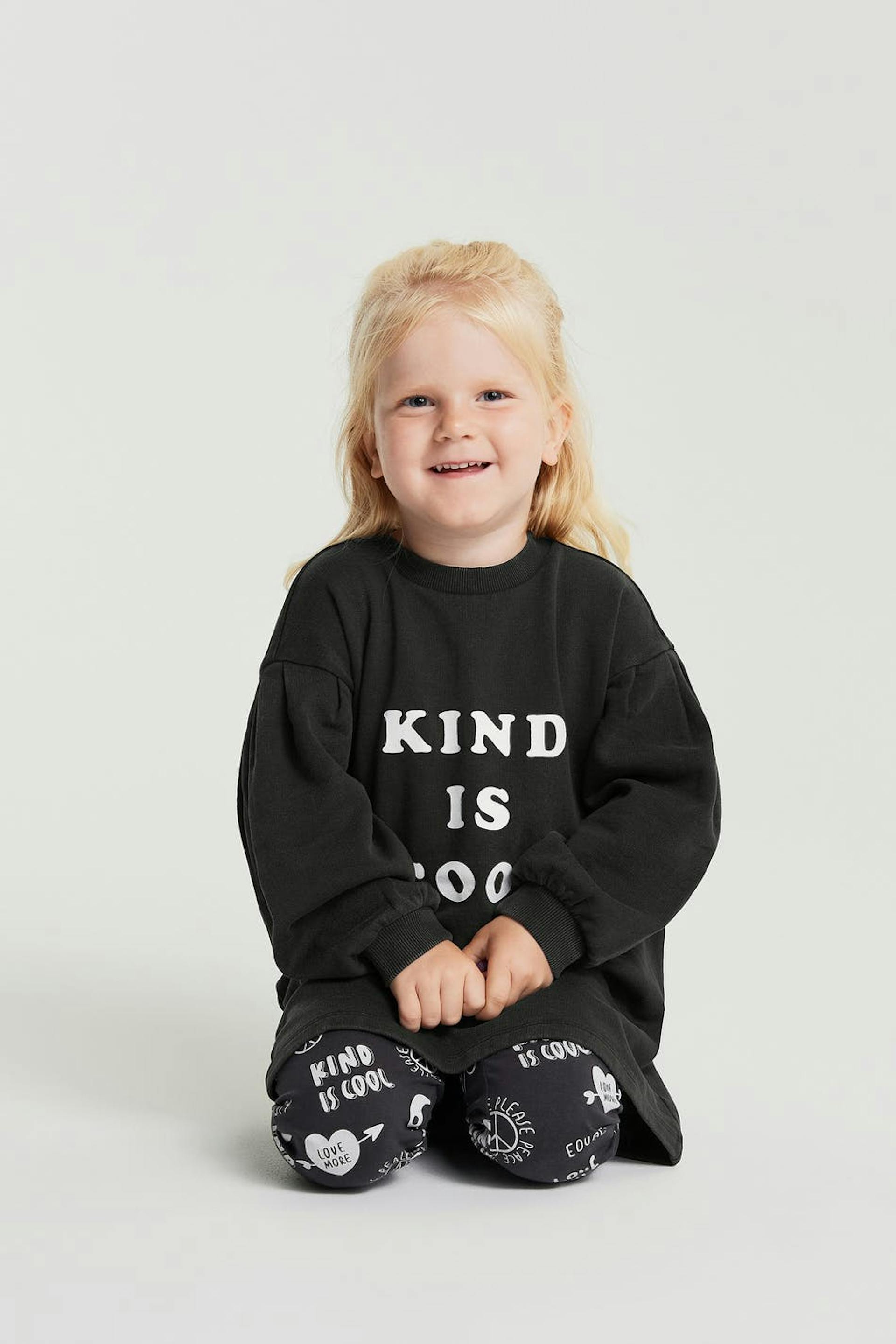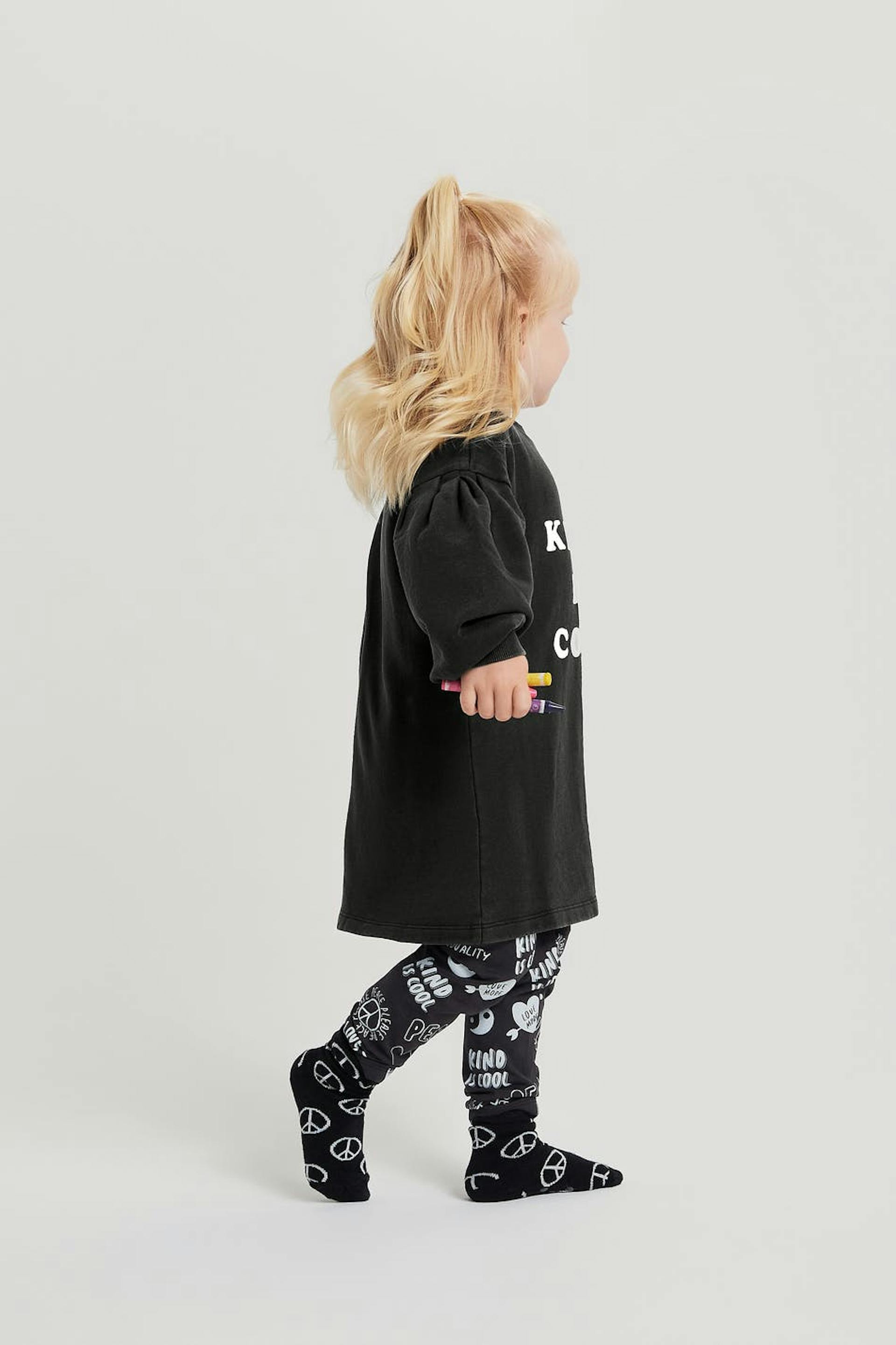 Kjole for barn med en normal passform. Kjolen er svart og har et trykk på framsiden. Den er laget av genserstoff og har langt, utringet puffermet og en elastisk strikk på enden av ermene og på halslinjen.