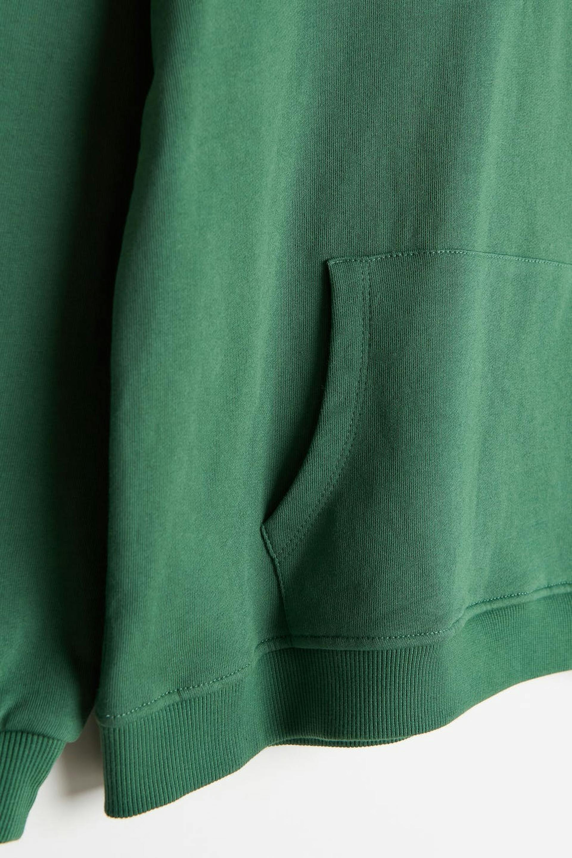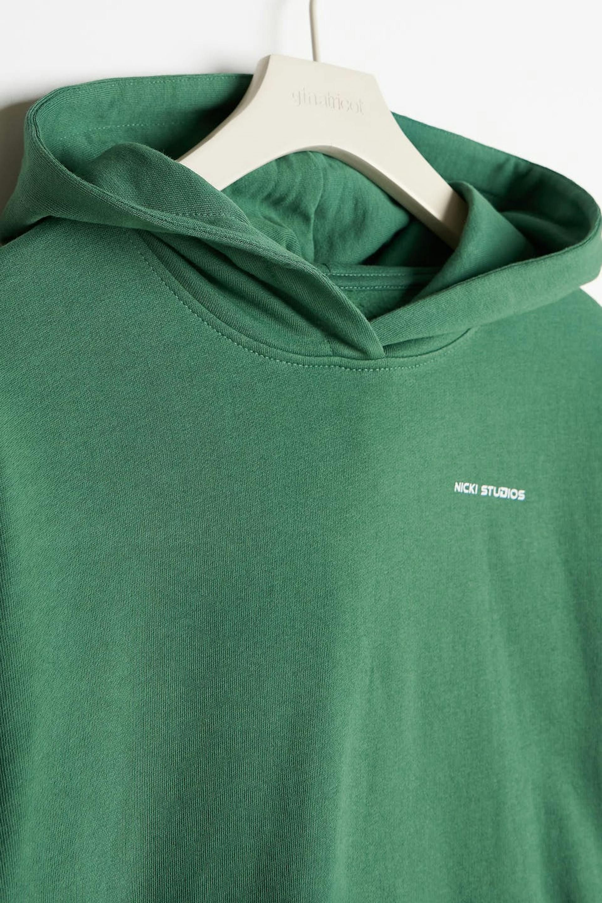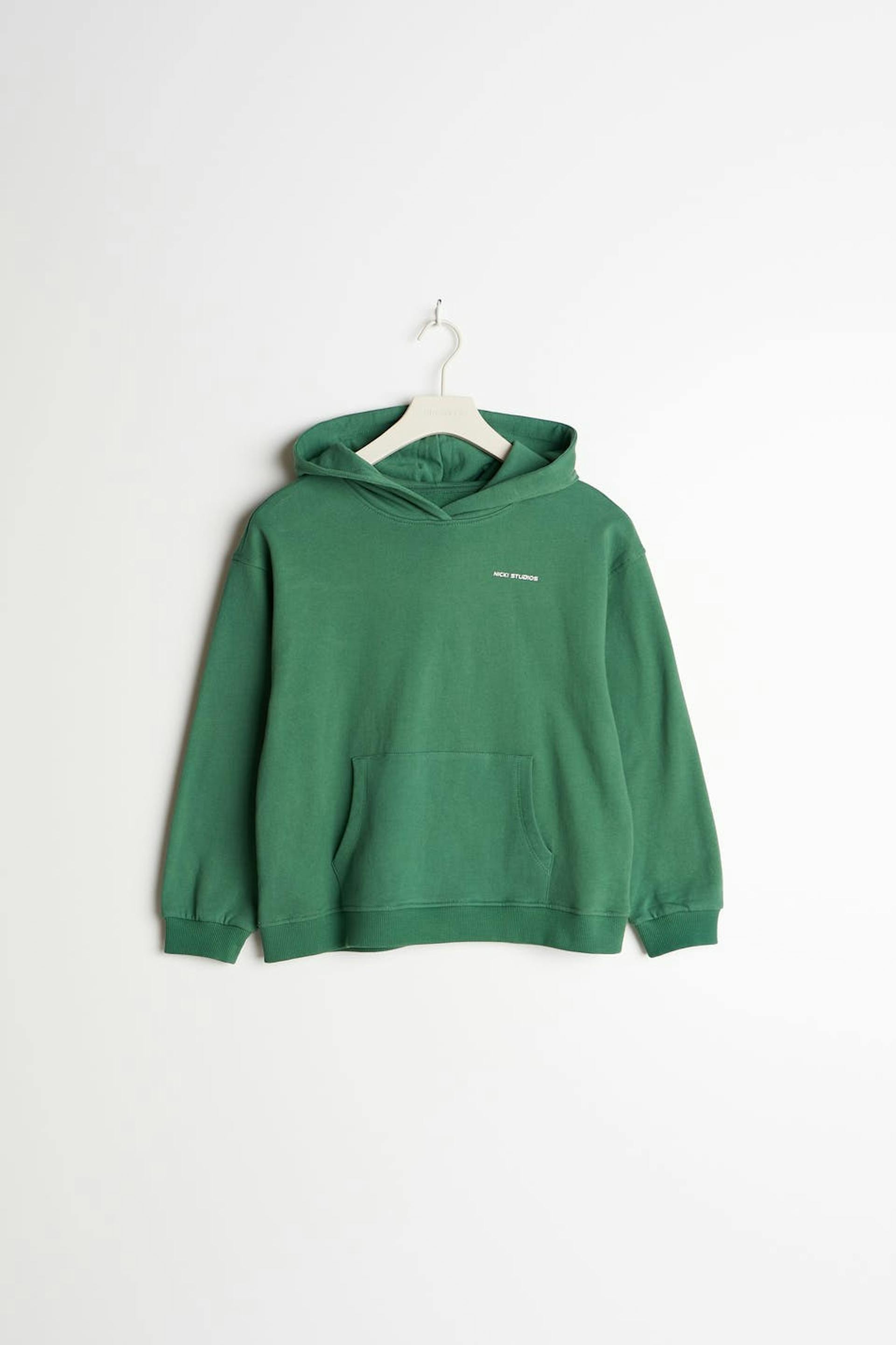 Nicki Studios X Gina Tricot. Hettegenser for barn med en oversized passform. Hettegenseren er grønn og har en stor lomme foran. Den har en hette, en ribbestrikket linning og et logotrykk foran.
