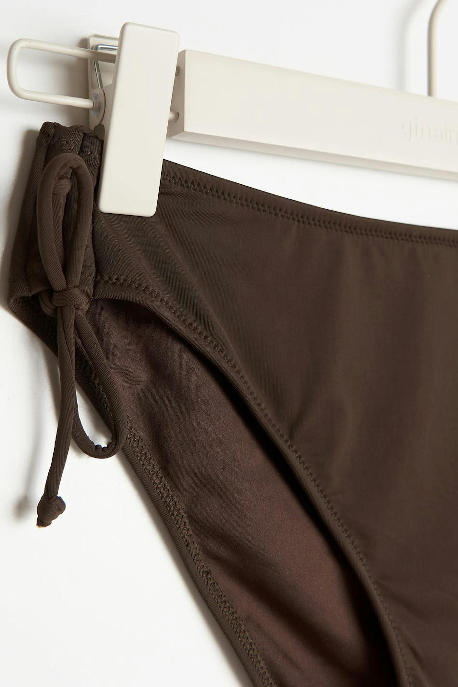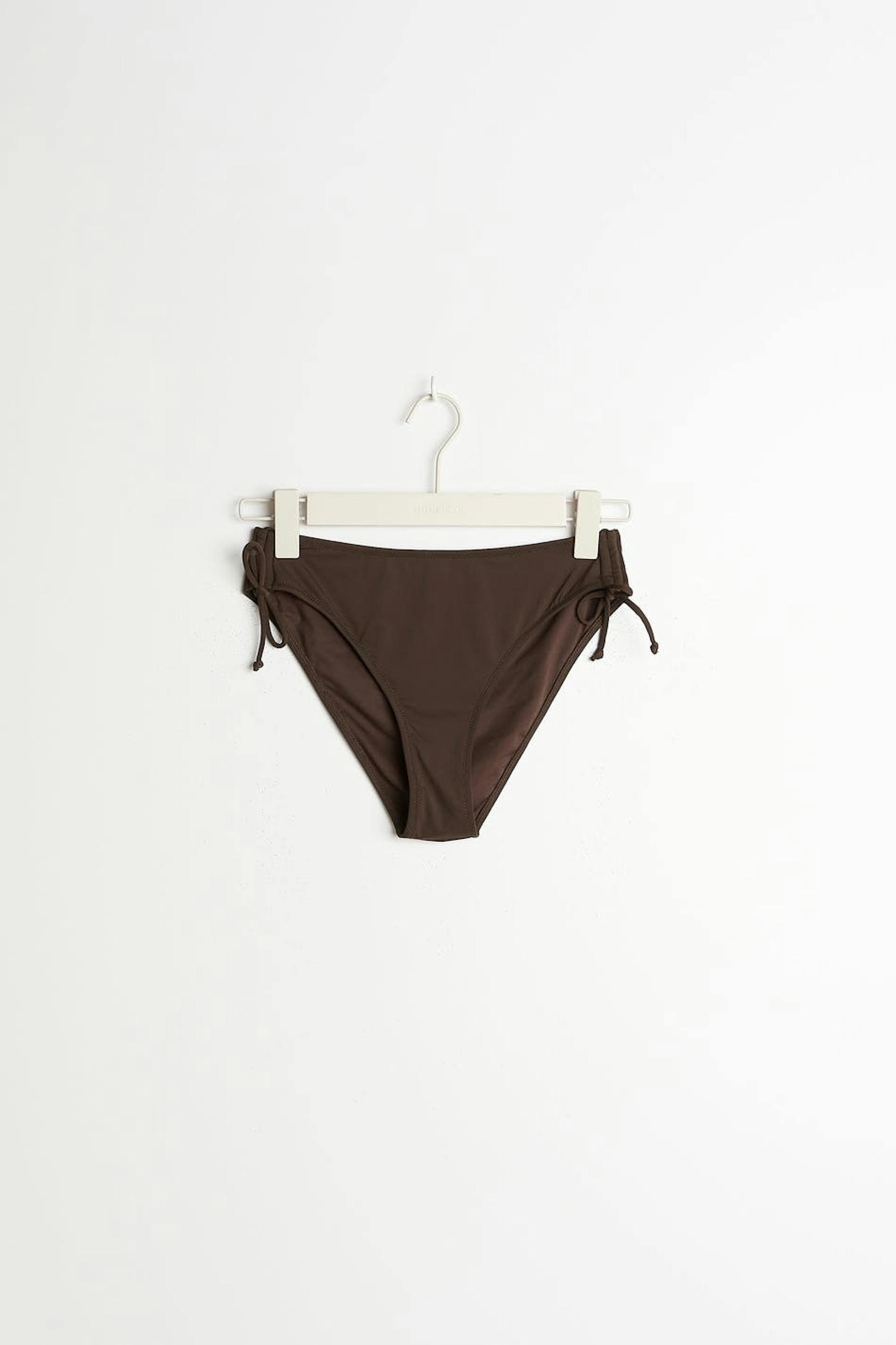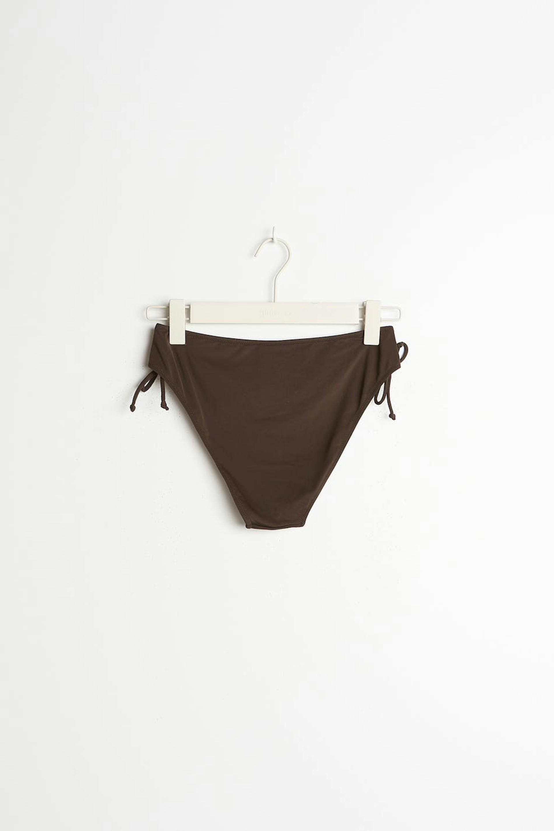 Fôrede bikiniunderdeler med knyting i sidene. Trusene er brune og har et halvskinnende badedraktmateriale. De har gummistrikk ved midjen og på benåpningene.