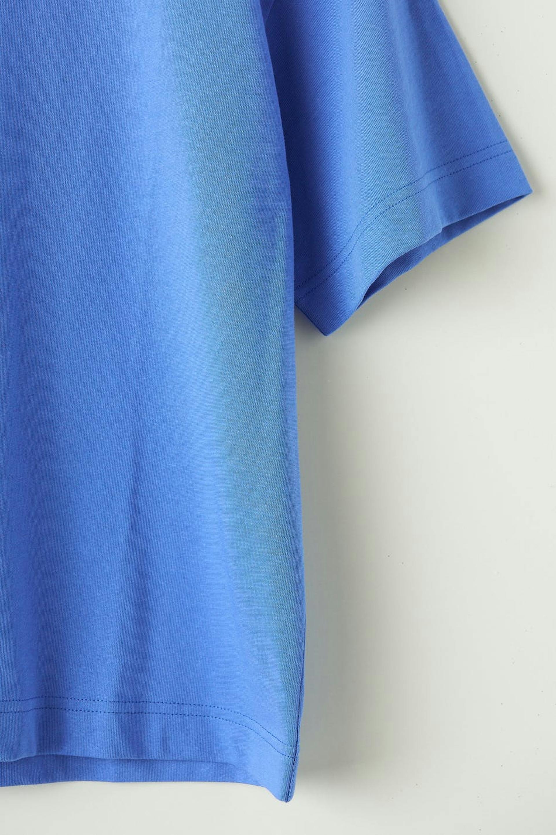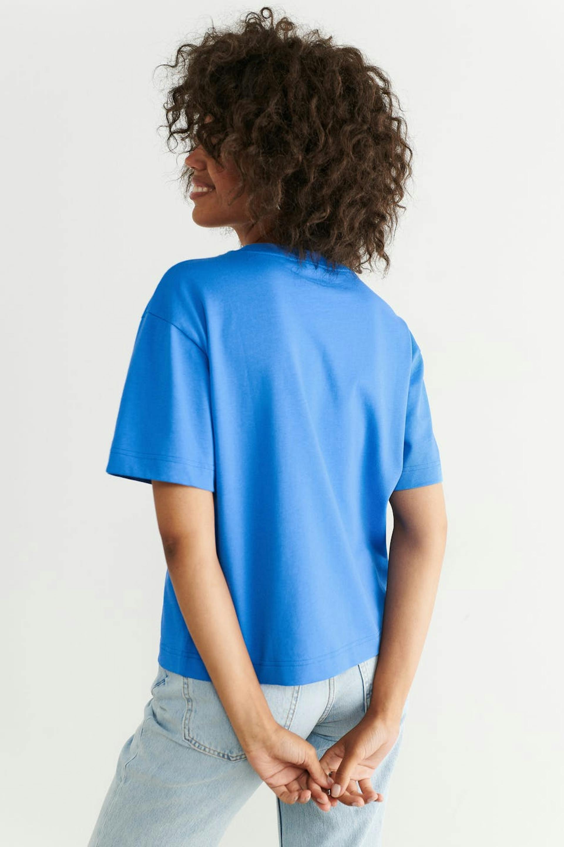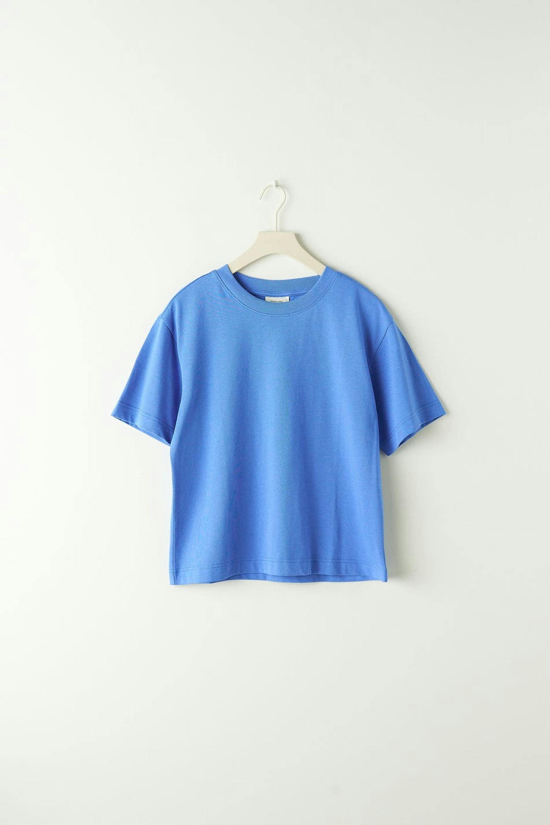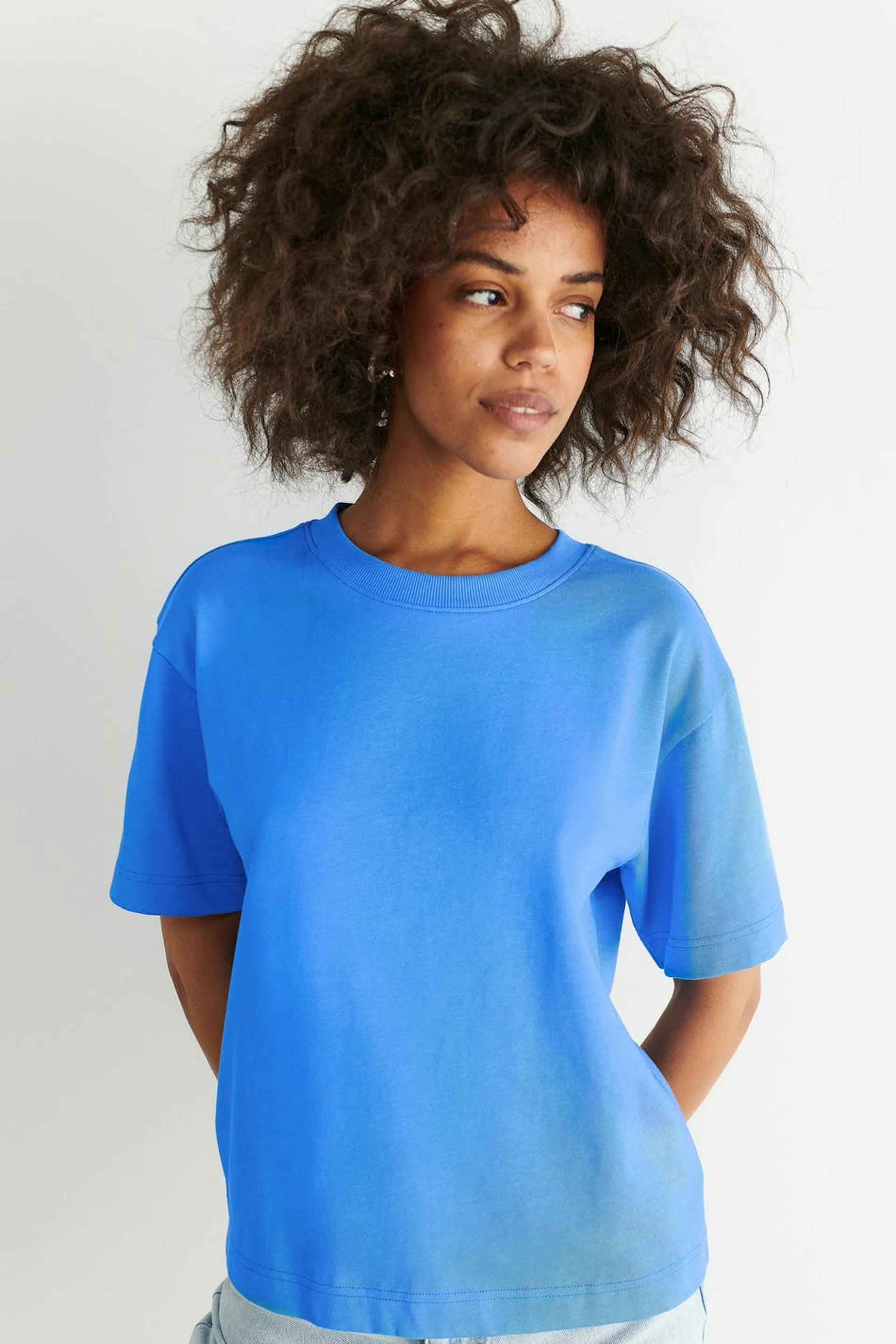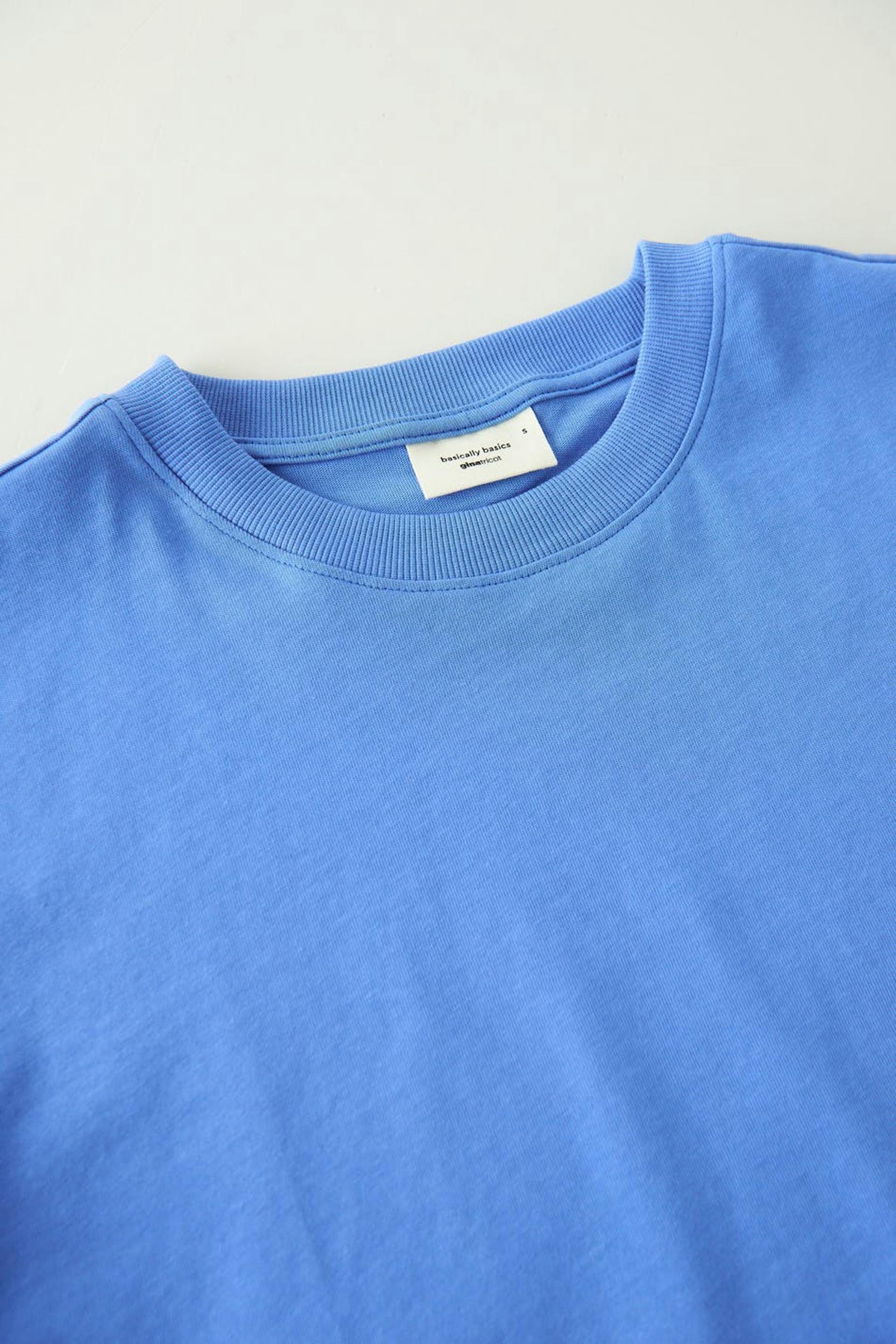 T-skjorte med en oversized passform. T-skjorten er blå og har et mykt, tykkere materiale i bomull. Den har en ribbet mansjett på halslinjen.
