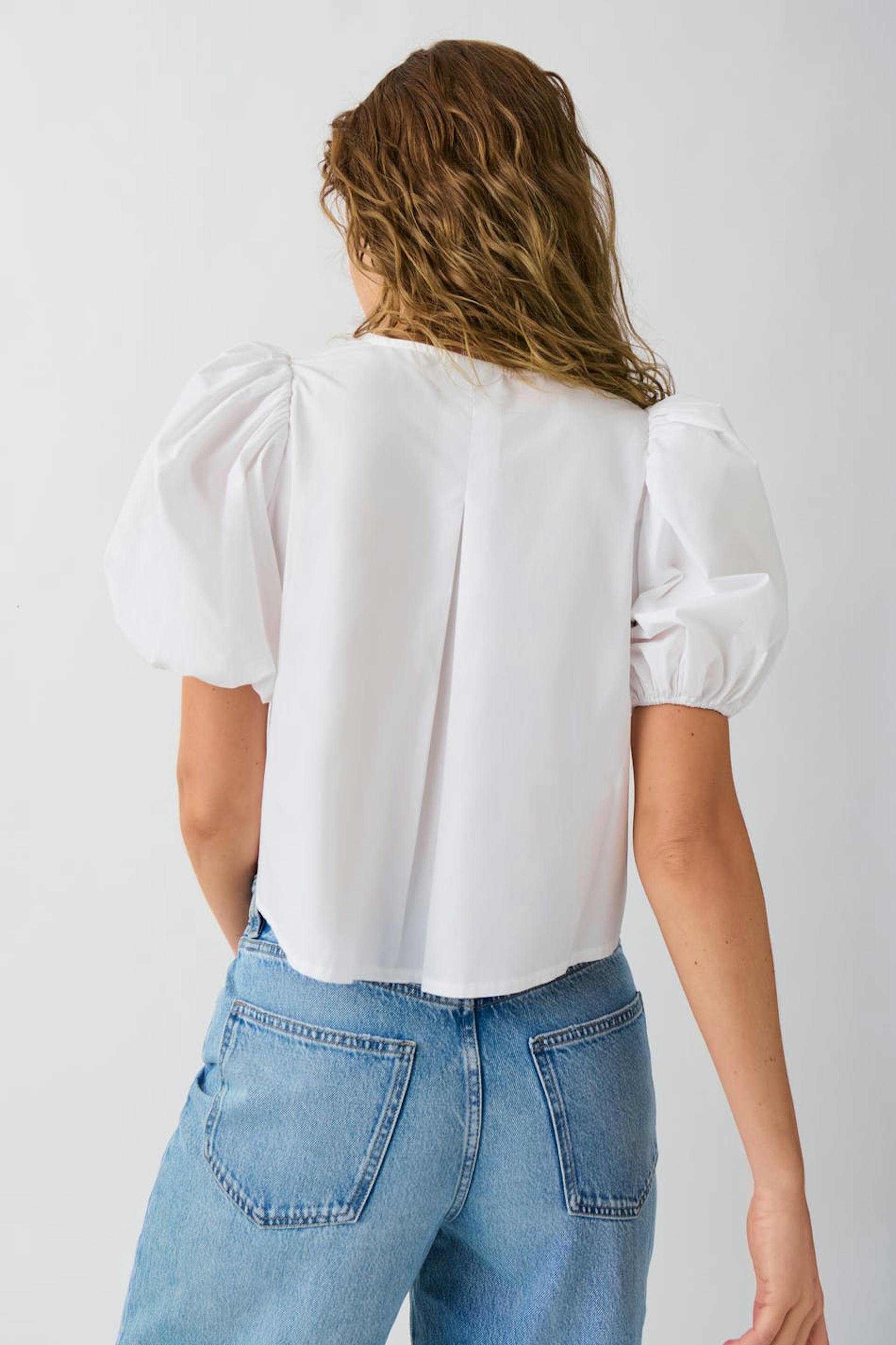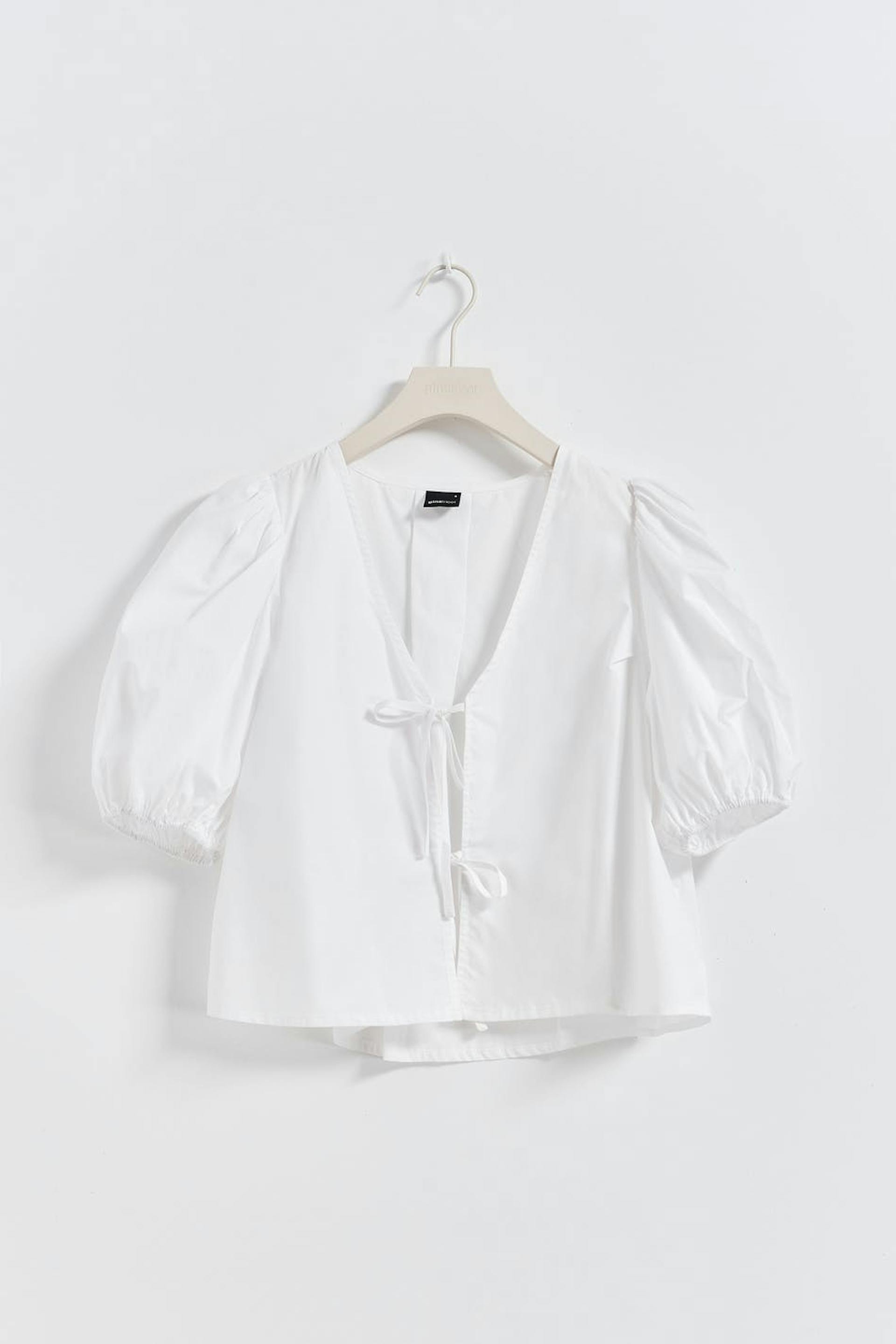 Knytebluse med kort pufferme. Blusen er hvit og har knutelukking foran. Den har v-ringning og avkortet lengde.