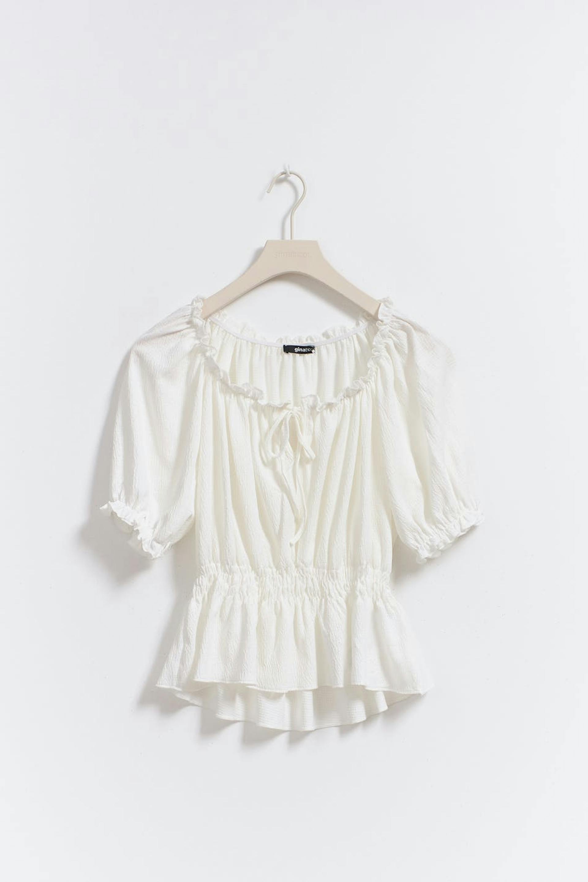 Strukturert off shoulder-topp med pufferme. Toppen er hvit og har smock-midje. Den har vanlig passform, avkortet lengde, knytbar detalj foran, myk gummistrikk på halslinjen og rysjet kant på toppen.