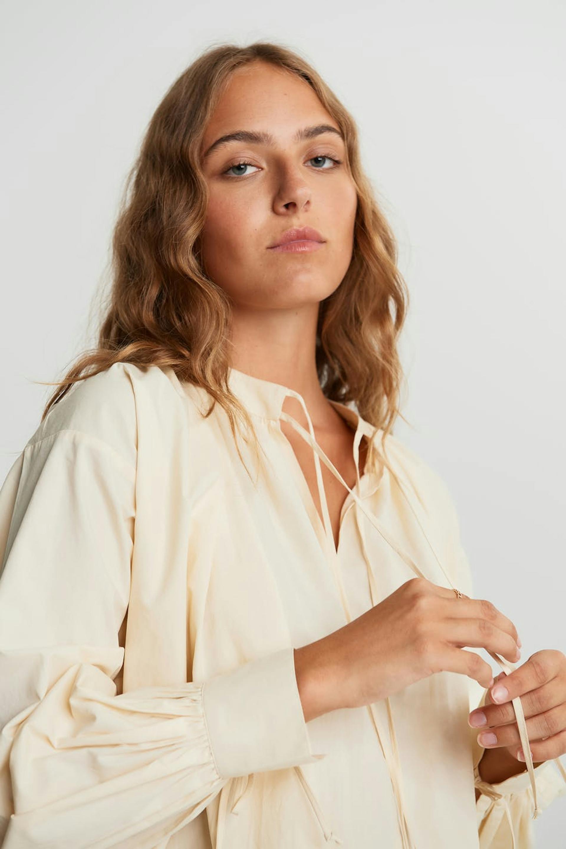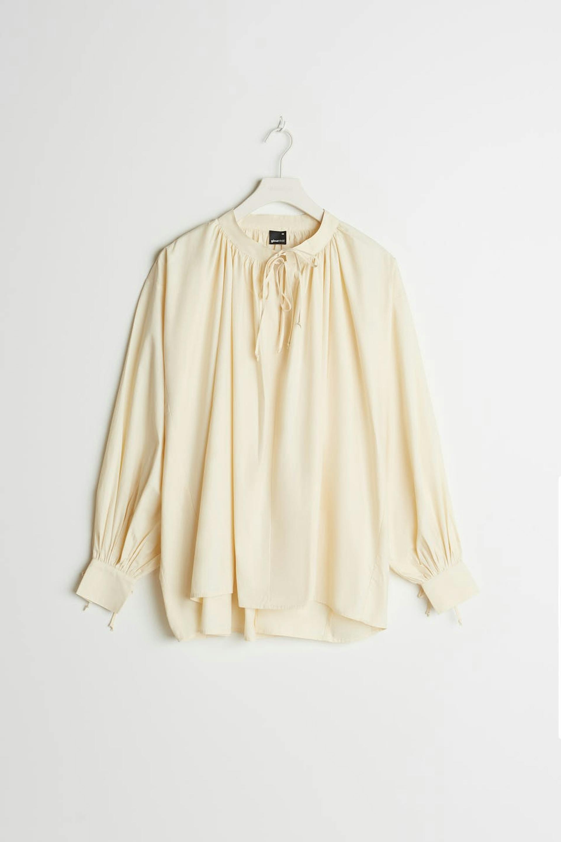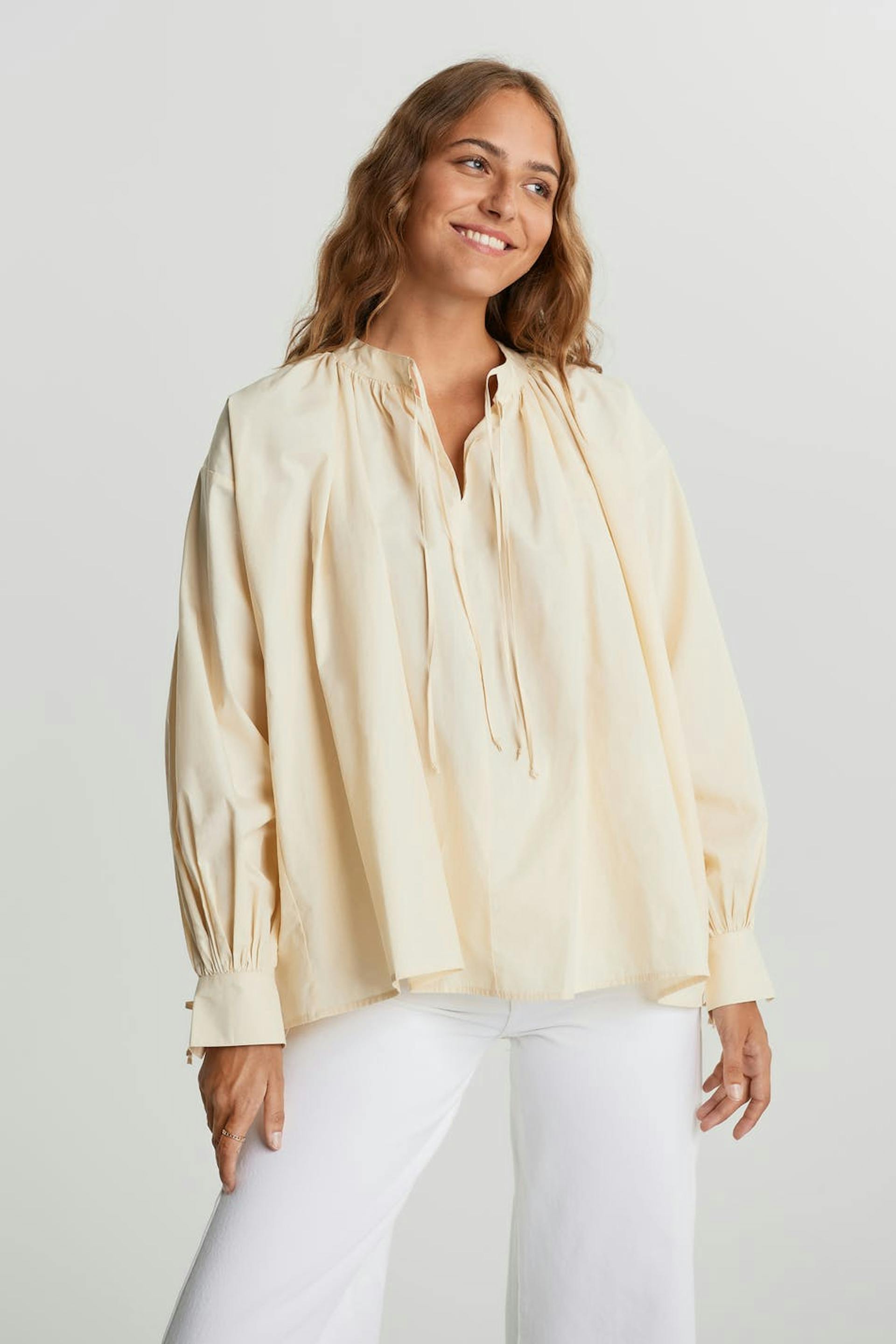 Bluse med mengde. Blusen er beige og har puffermer. Den har en knyting til halsen og på enden av ermene.