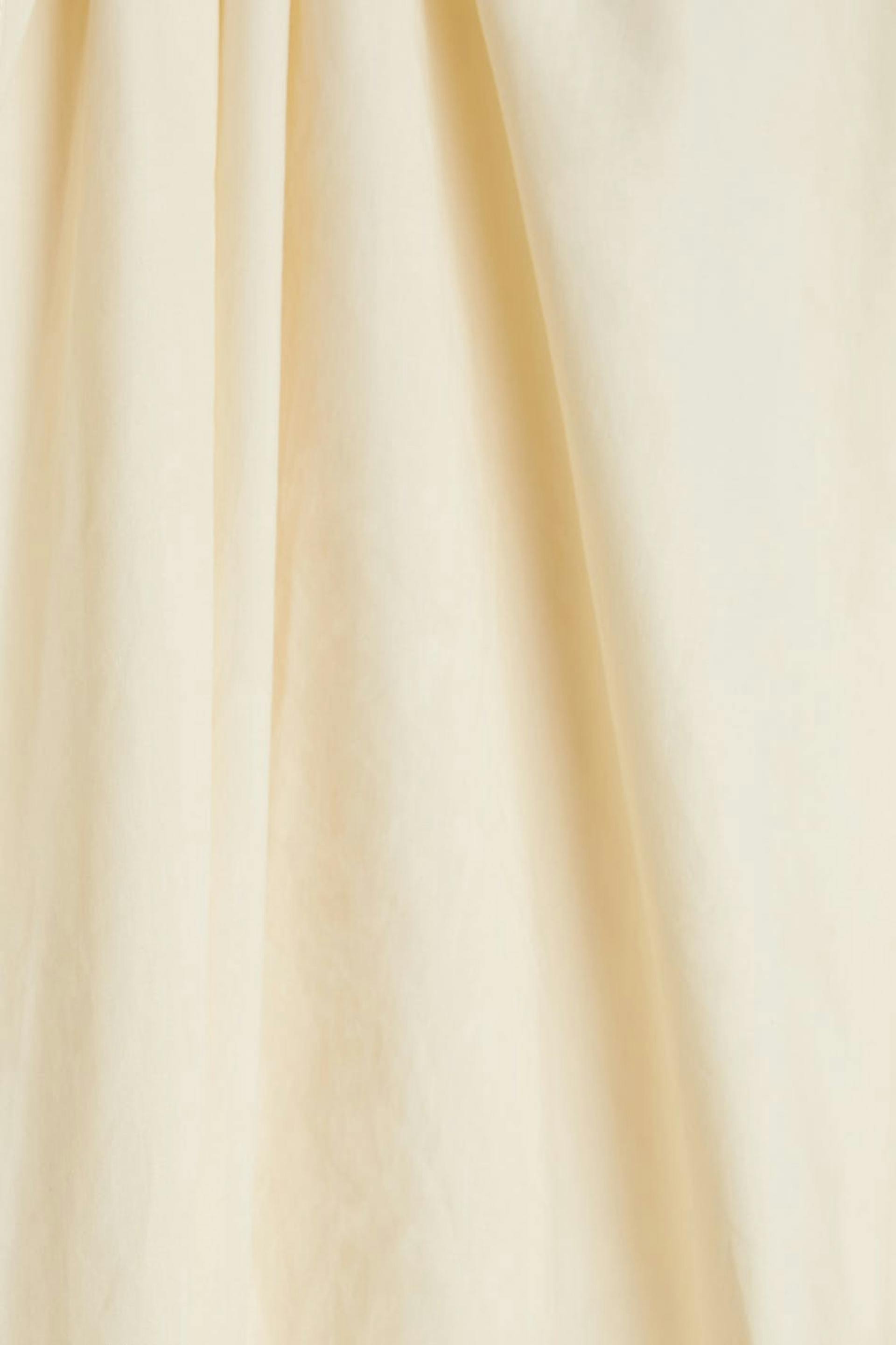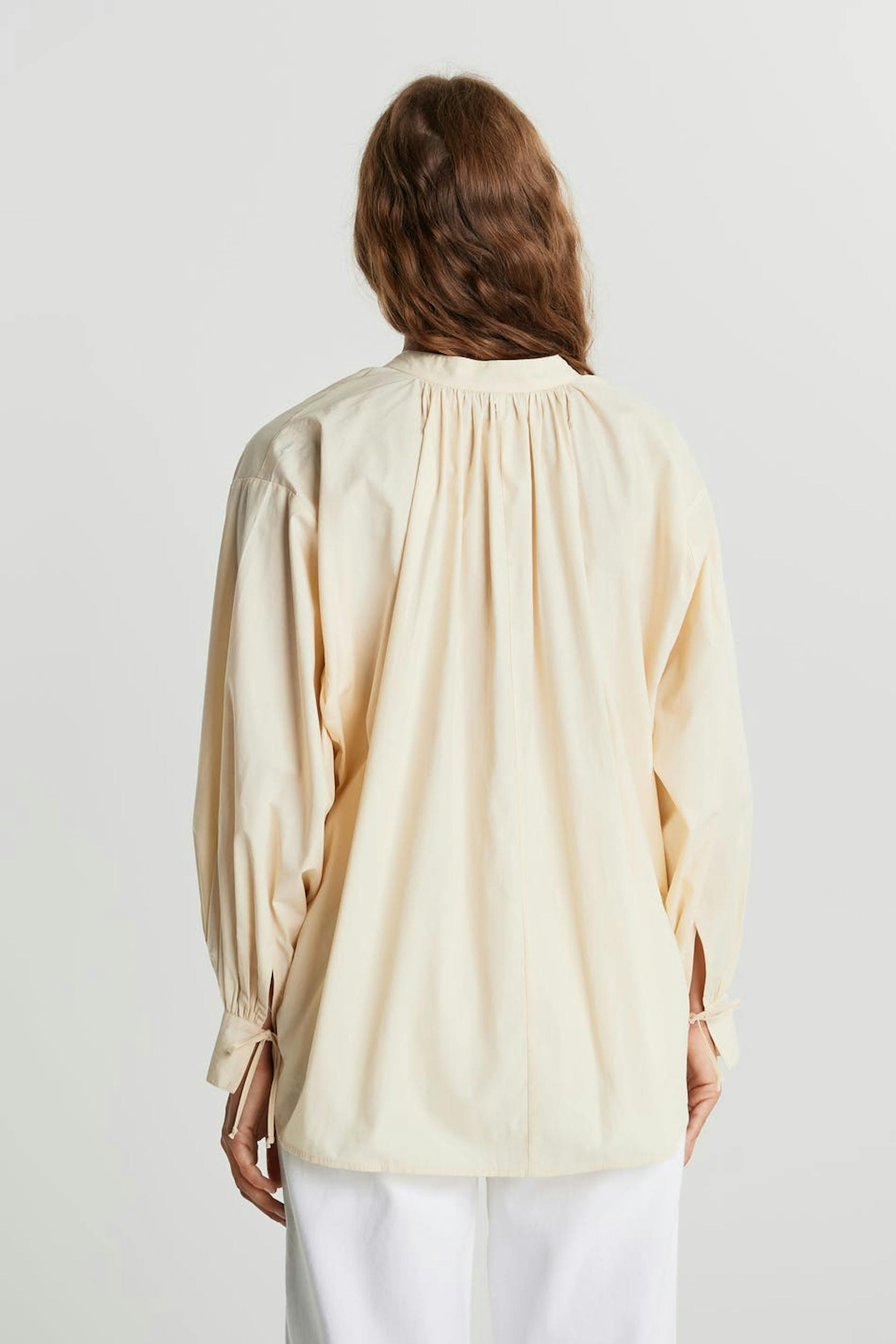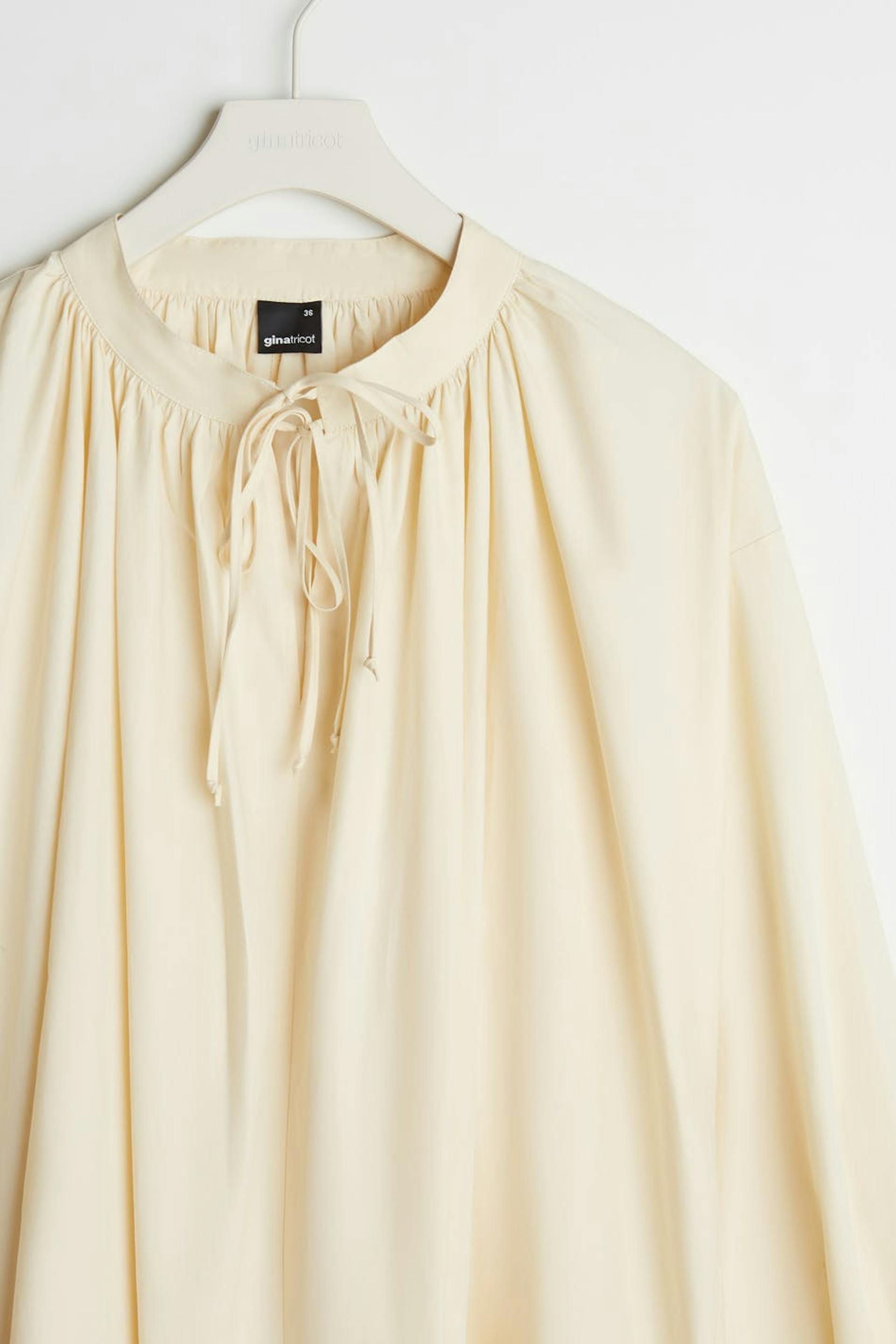Bluse med mengde. Blusen er beige og har puffermer. Den har en knyting til halsen og på enden av ermene.