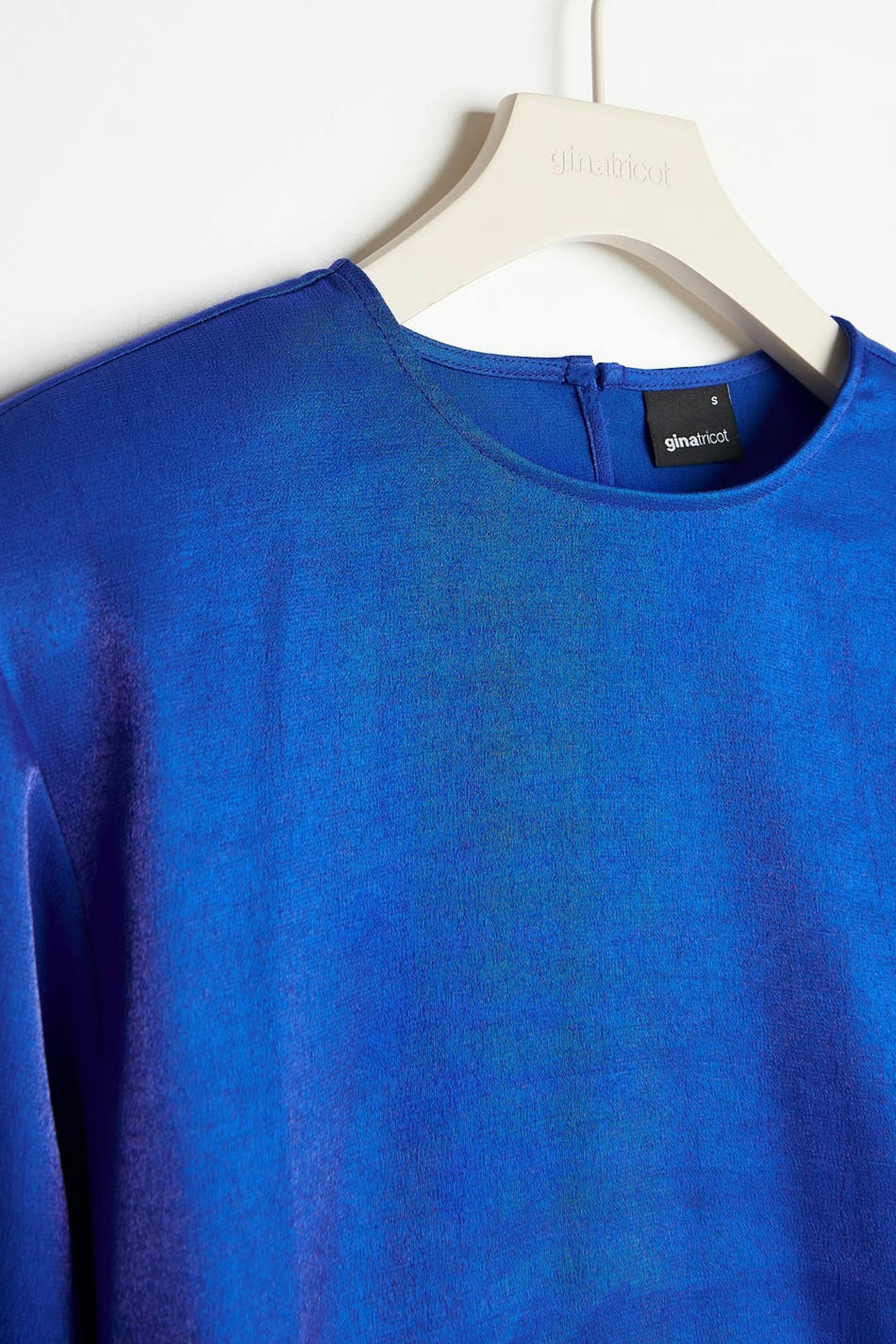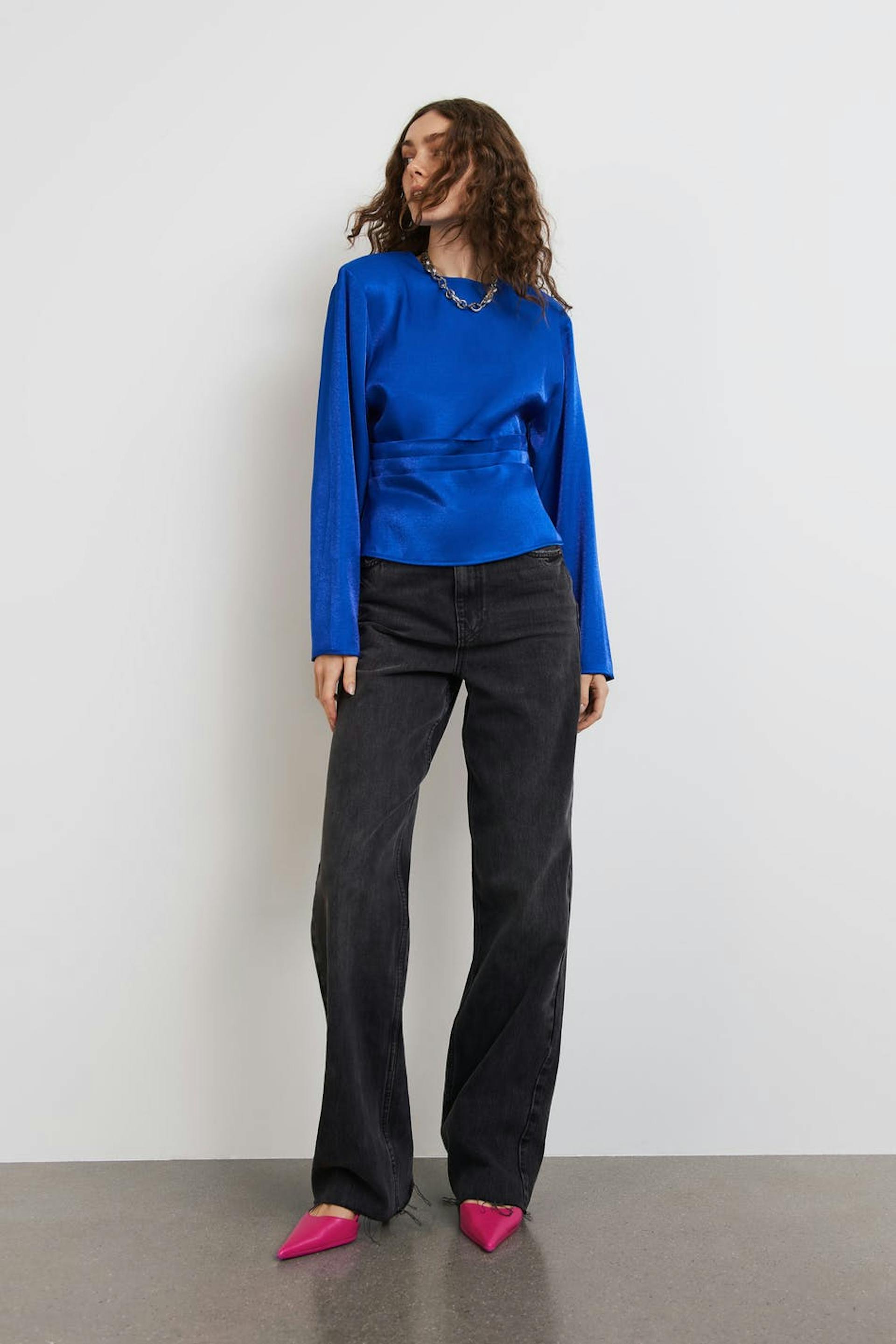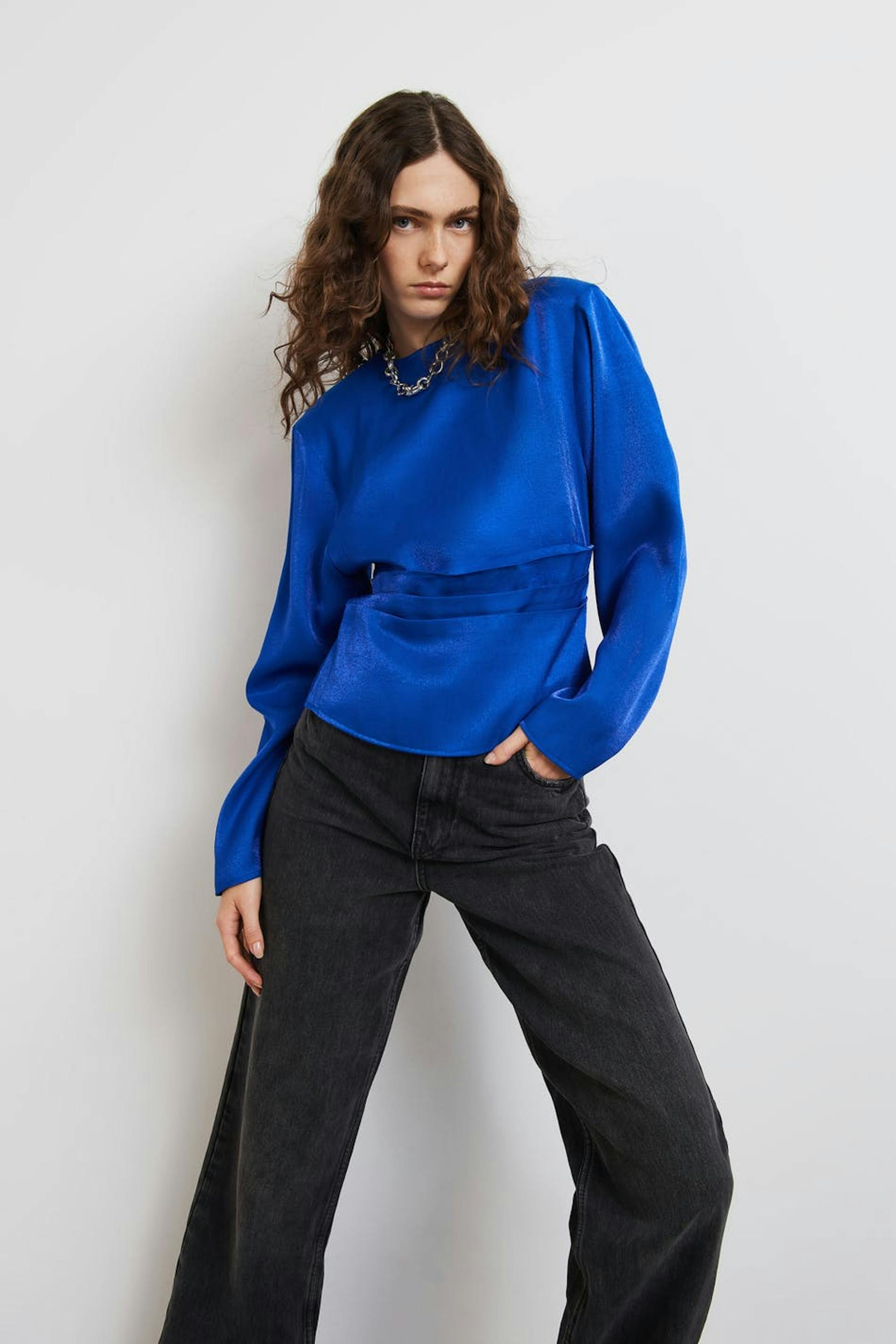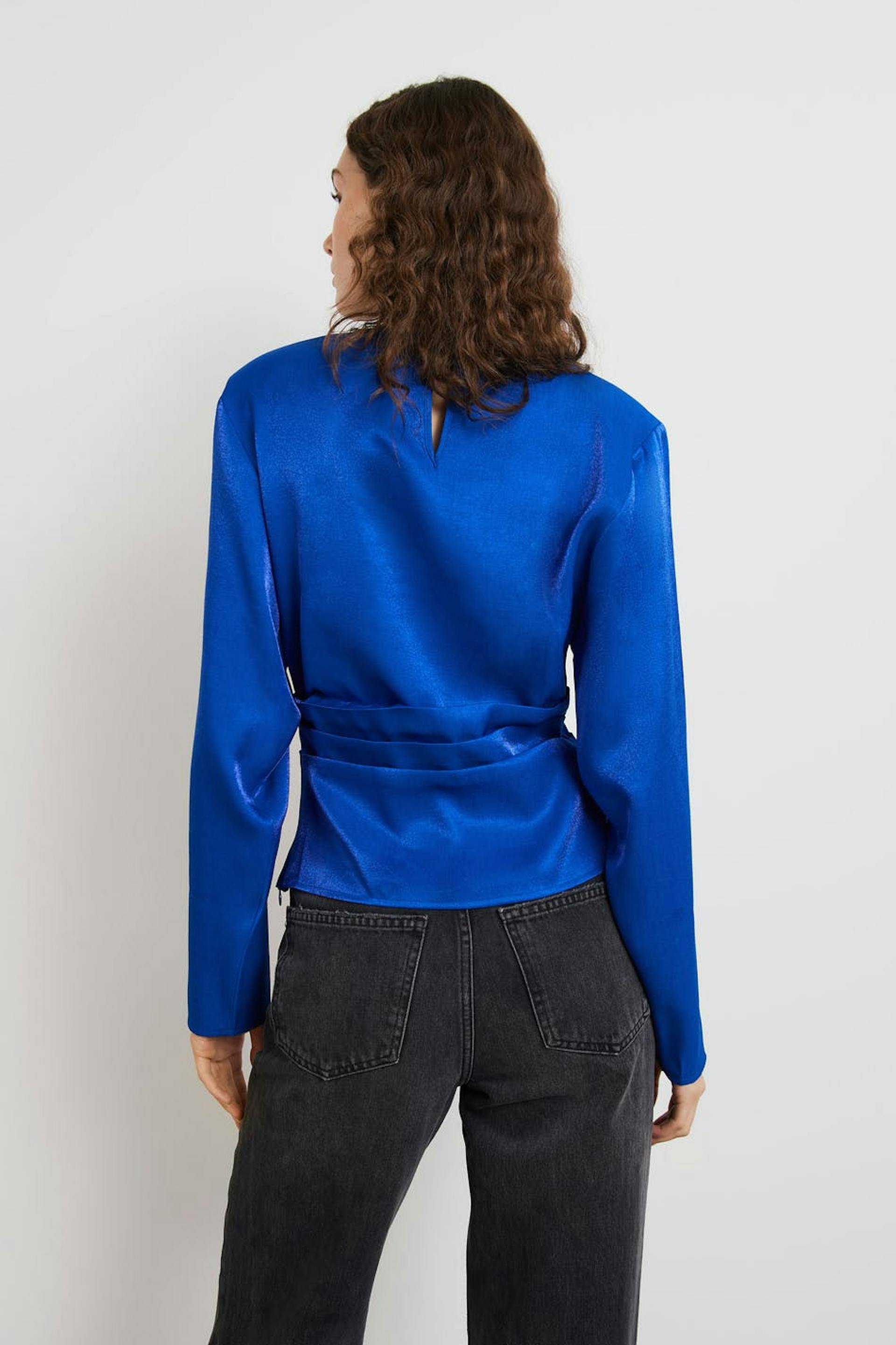 Kort bluse med plissé detaljer ved midjen. Blusen er perfekt for festen, blå og langermet. Den har skulderputer, en tilpasset midje og en nøkkelhulsåpning i ryggen med knappstolpe.