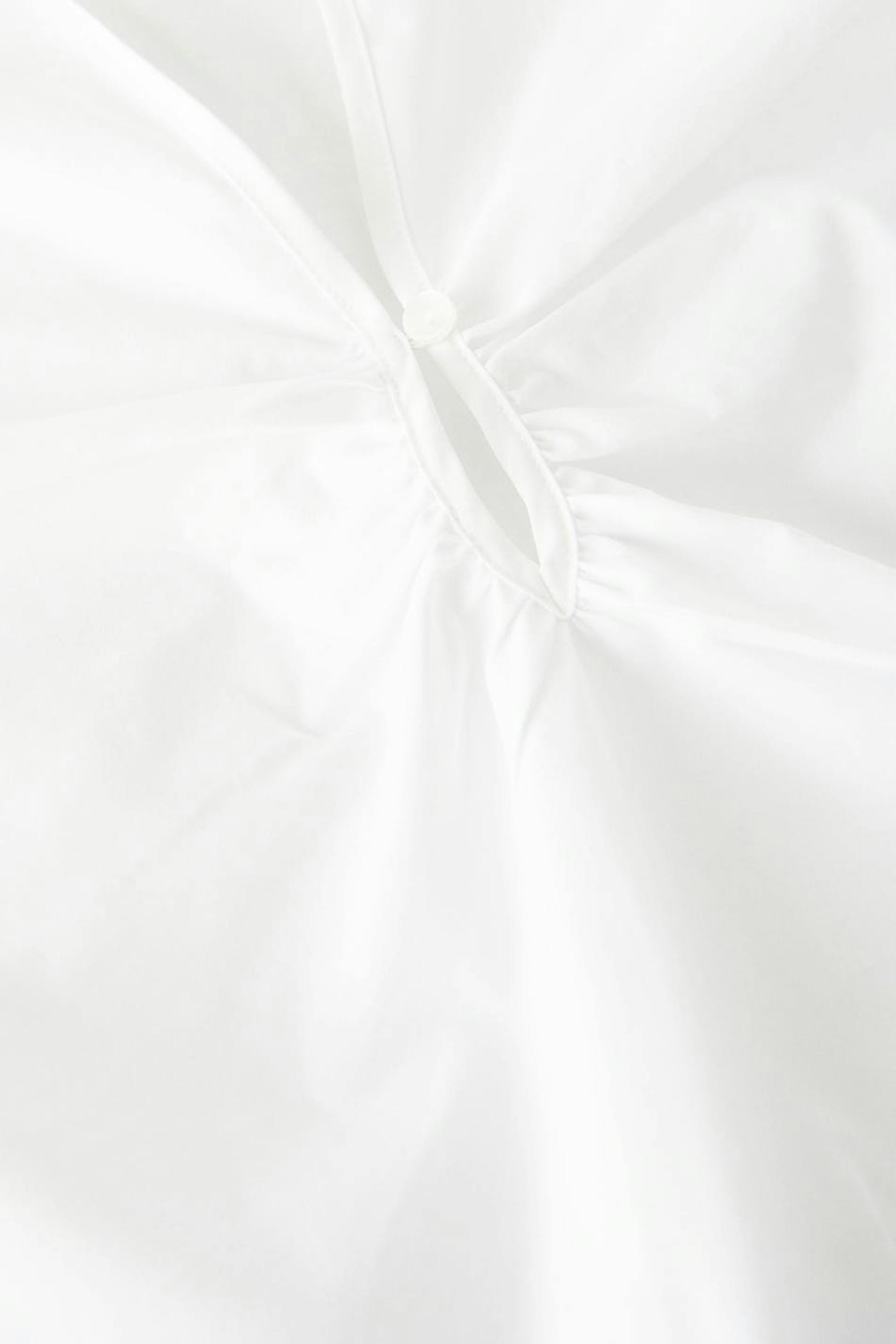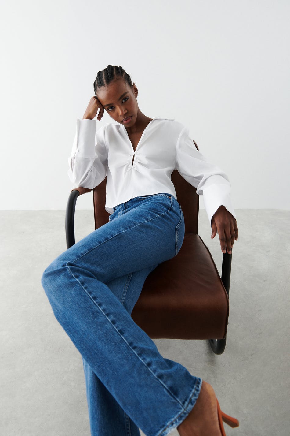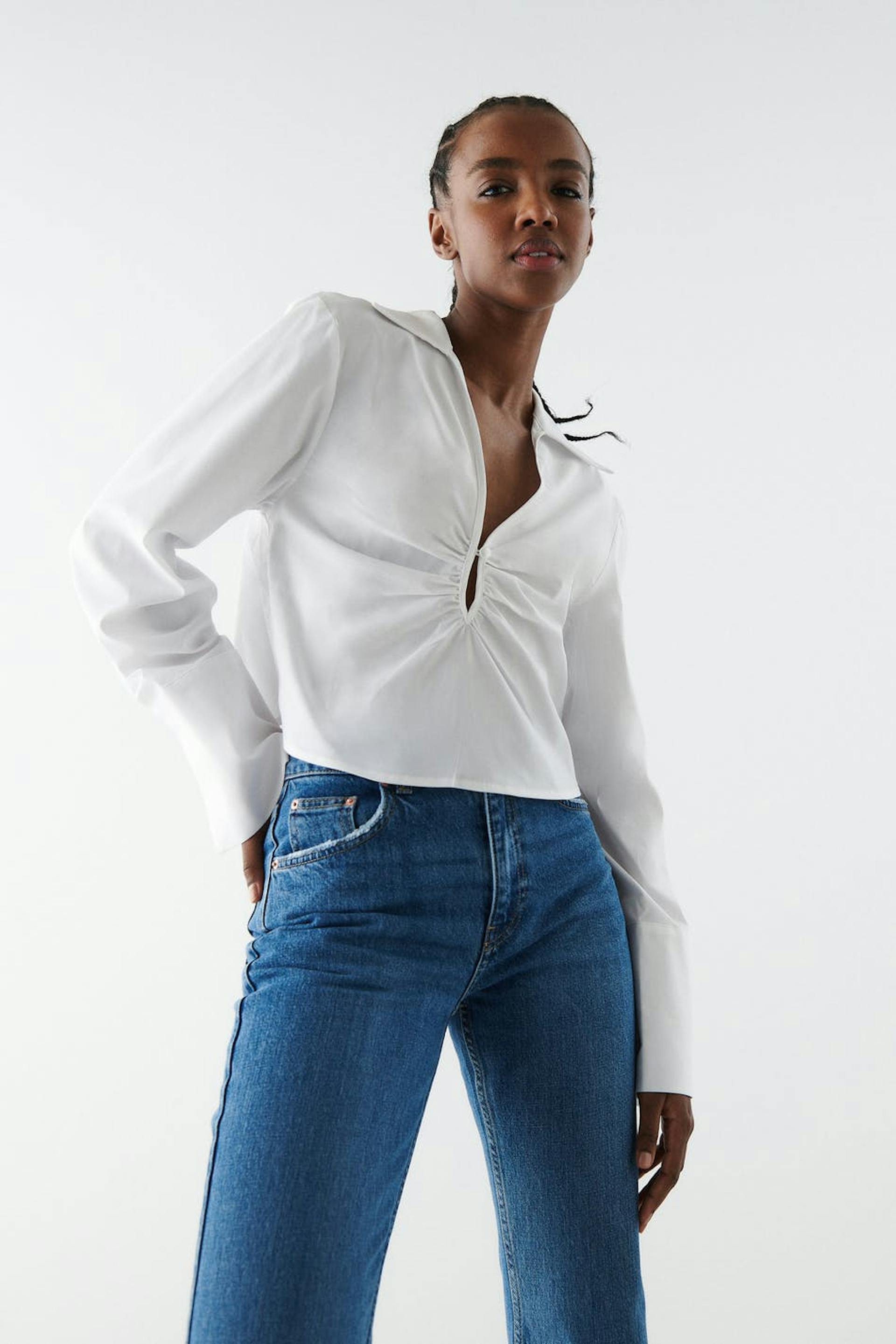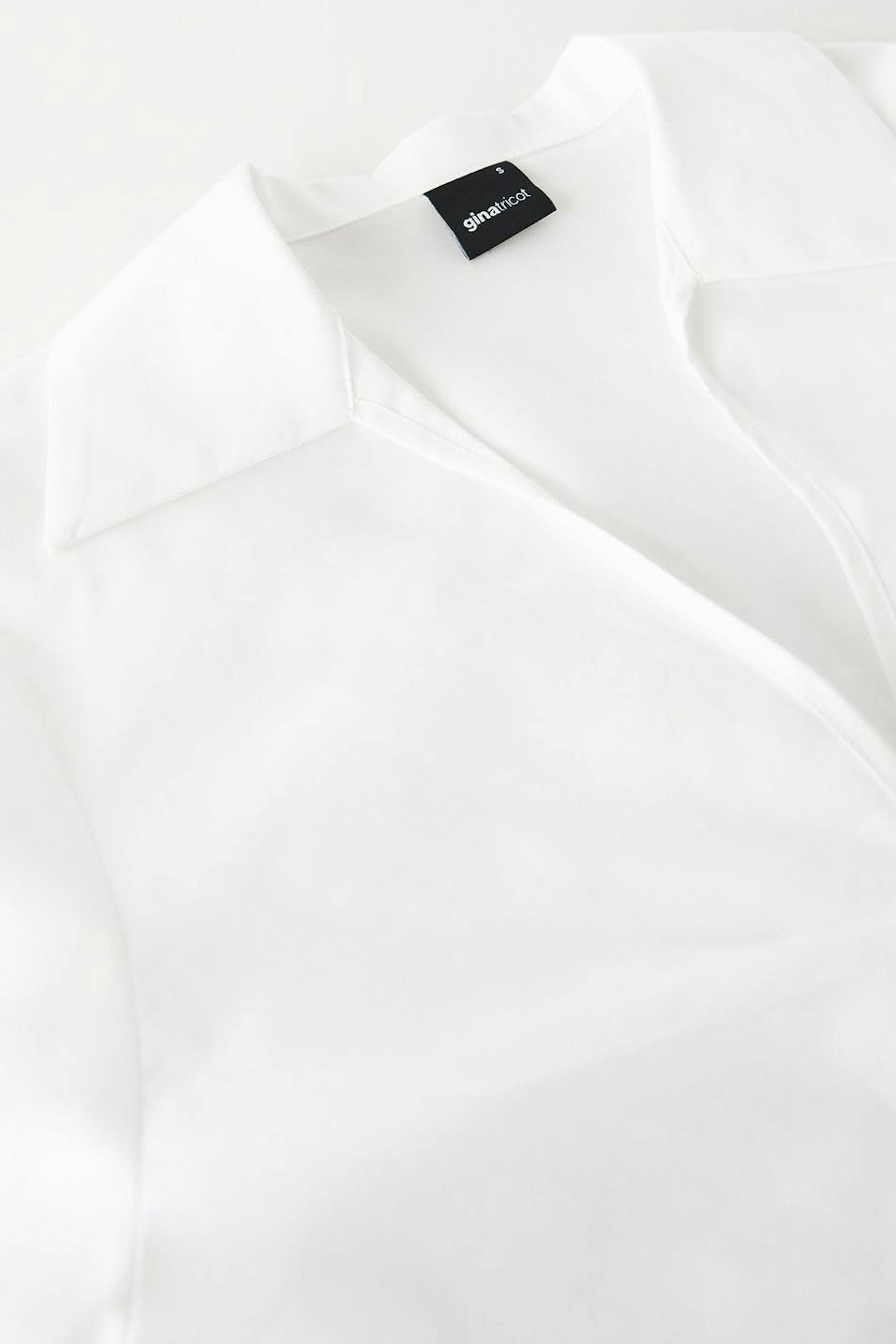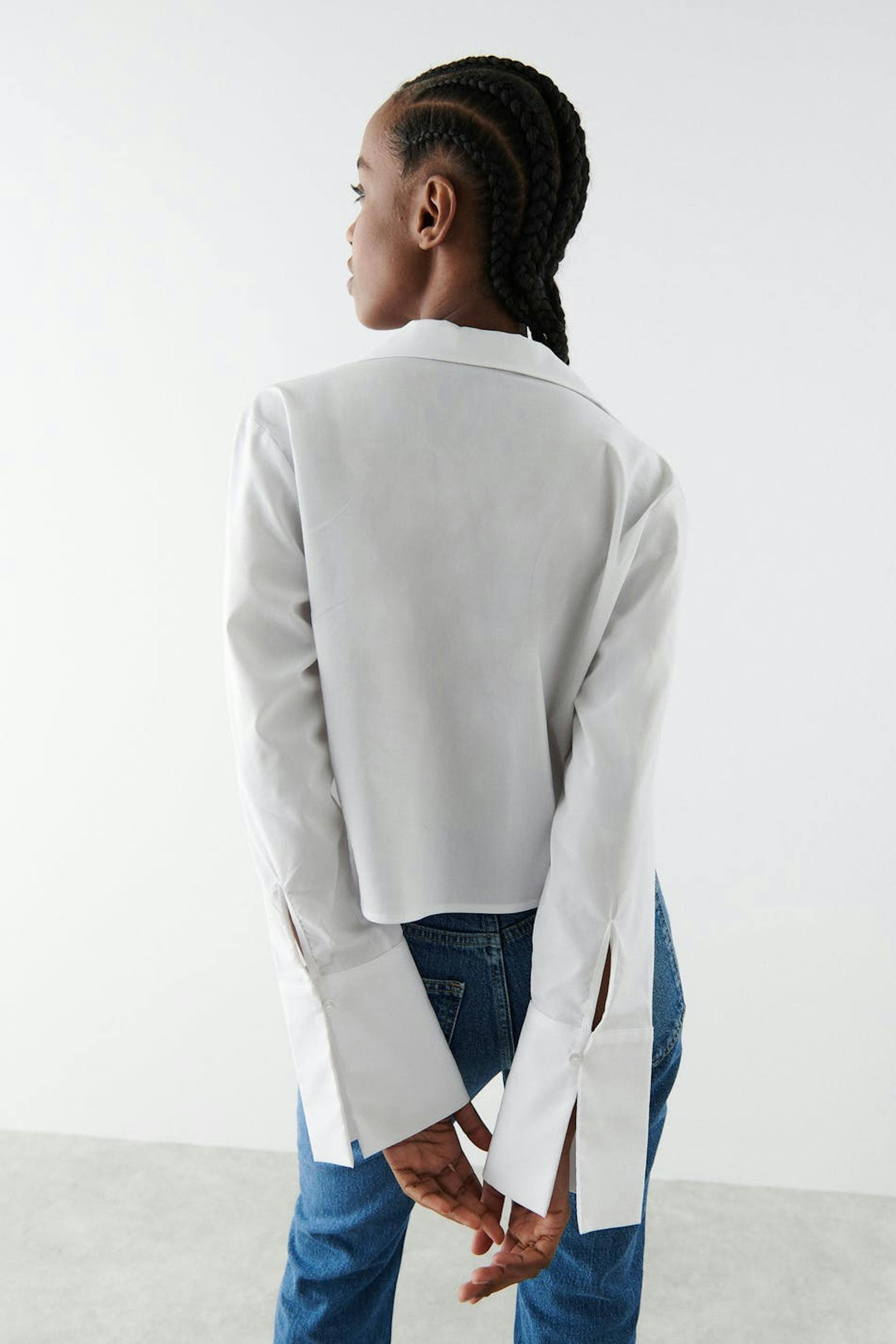 Avkortet skjorte med v-hals snitt. Skjorten er hvit og har nøkkelhulsåpning foran med knappelukking og samlede detaljer. Den har krage og brede mansjetter med knappstolpe.