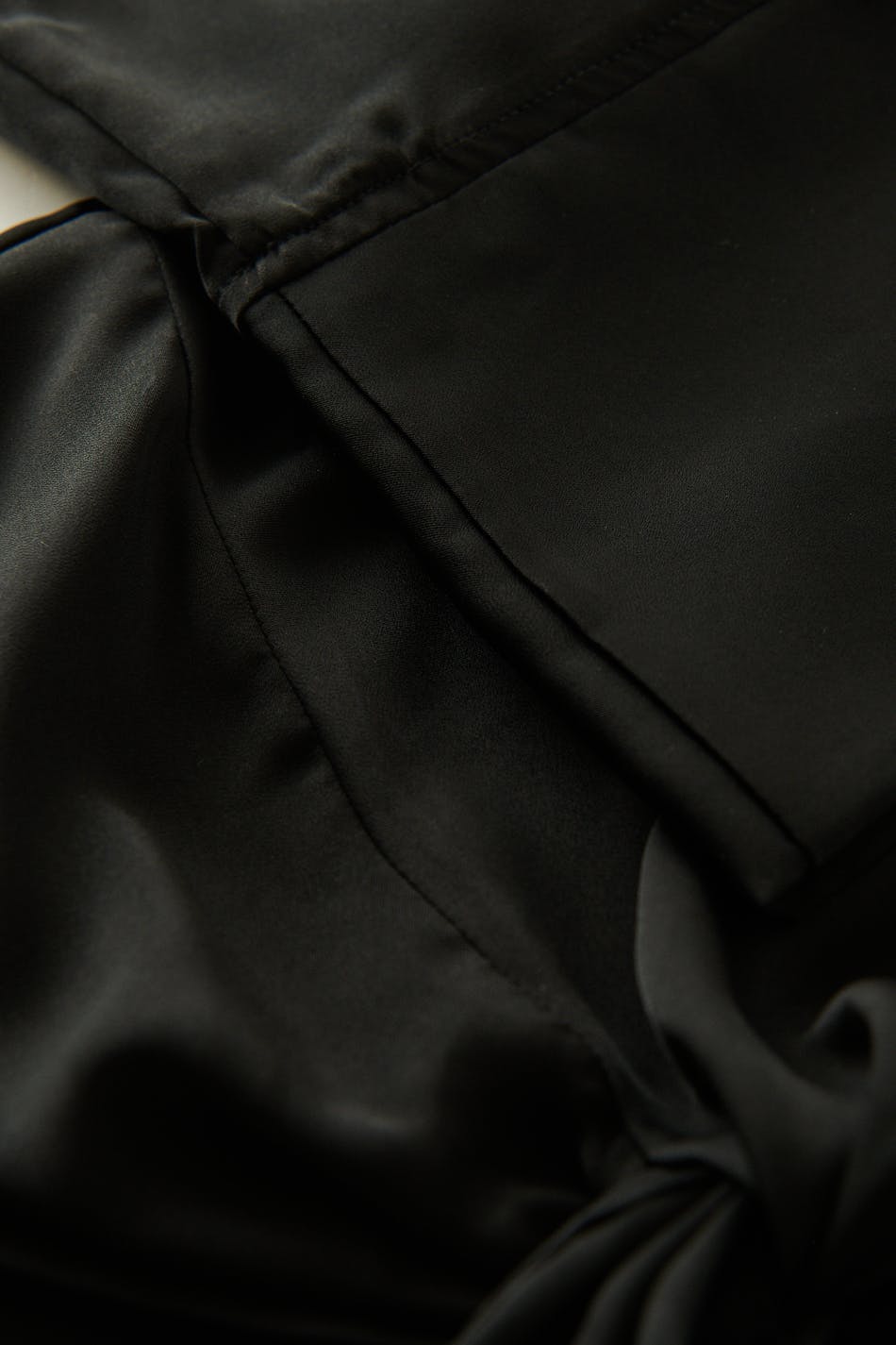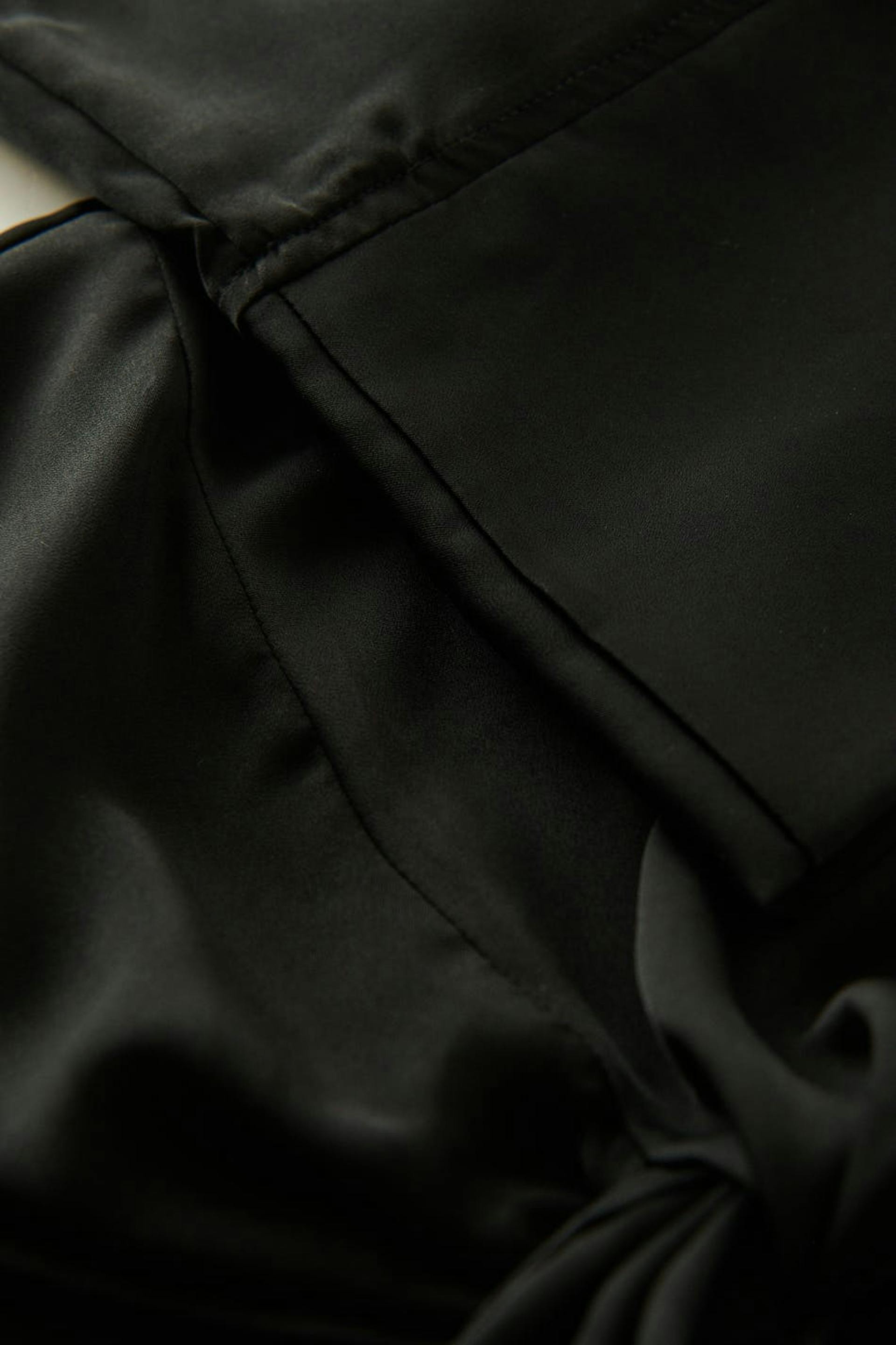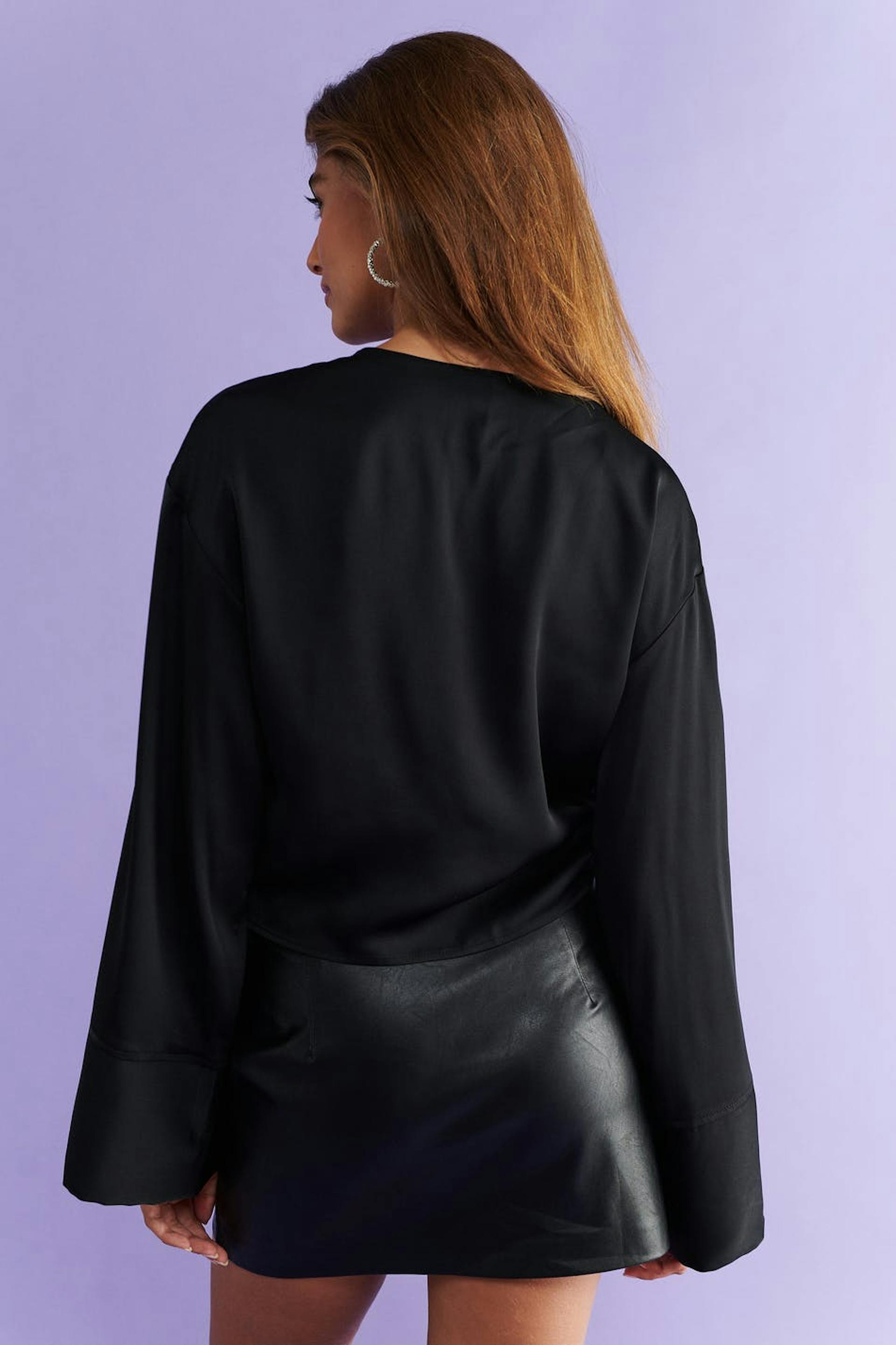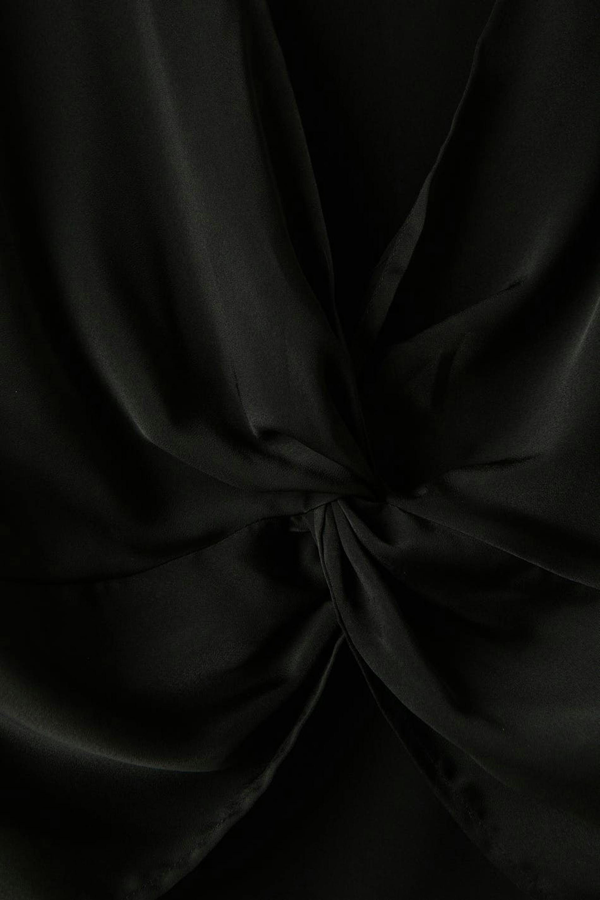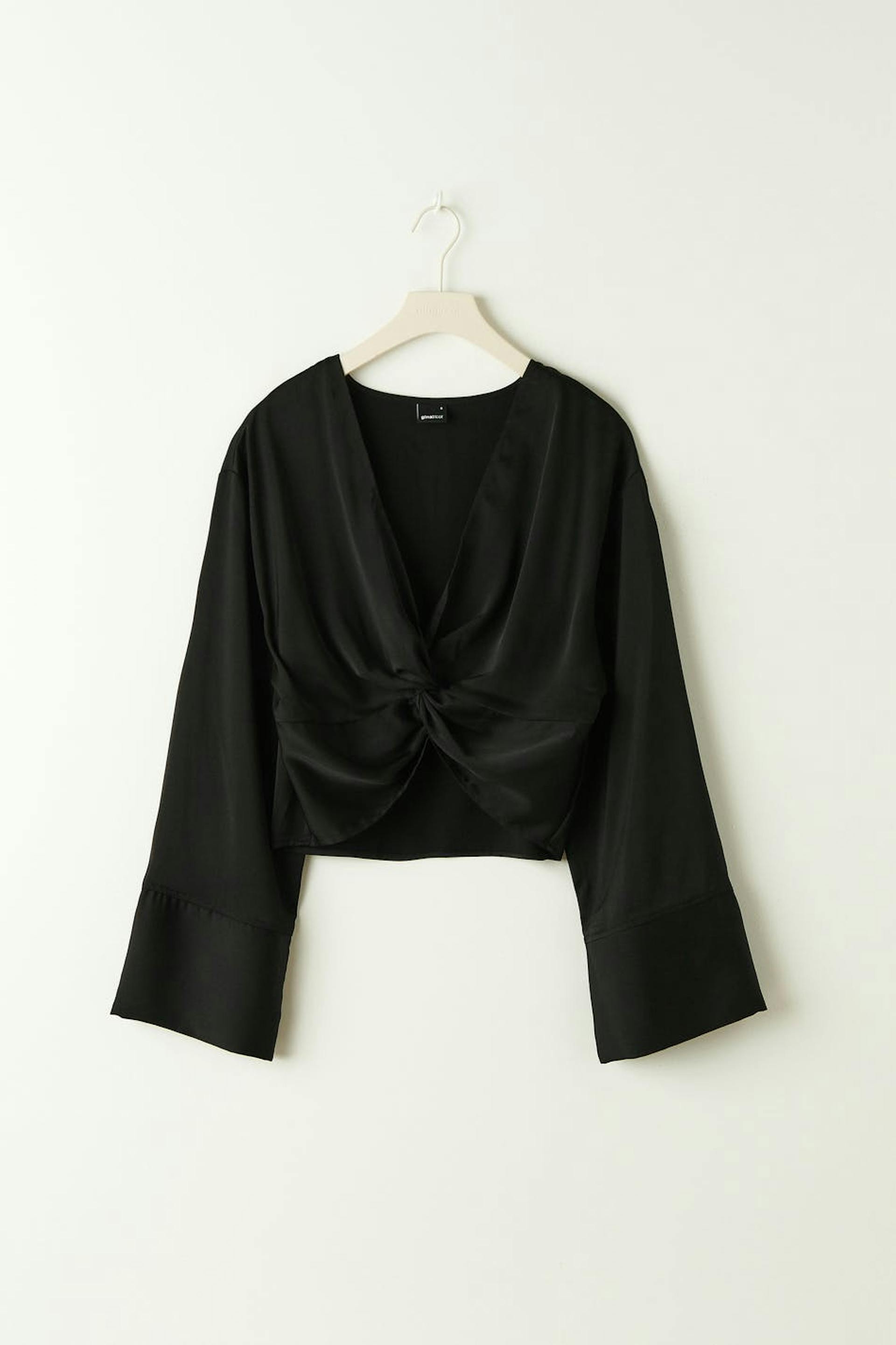 Avkortet bluse i sateng med vridd detalj foran. Blusen er svart og har tilpasset passform. Den har v-ringning og brede armer med mansjetter.