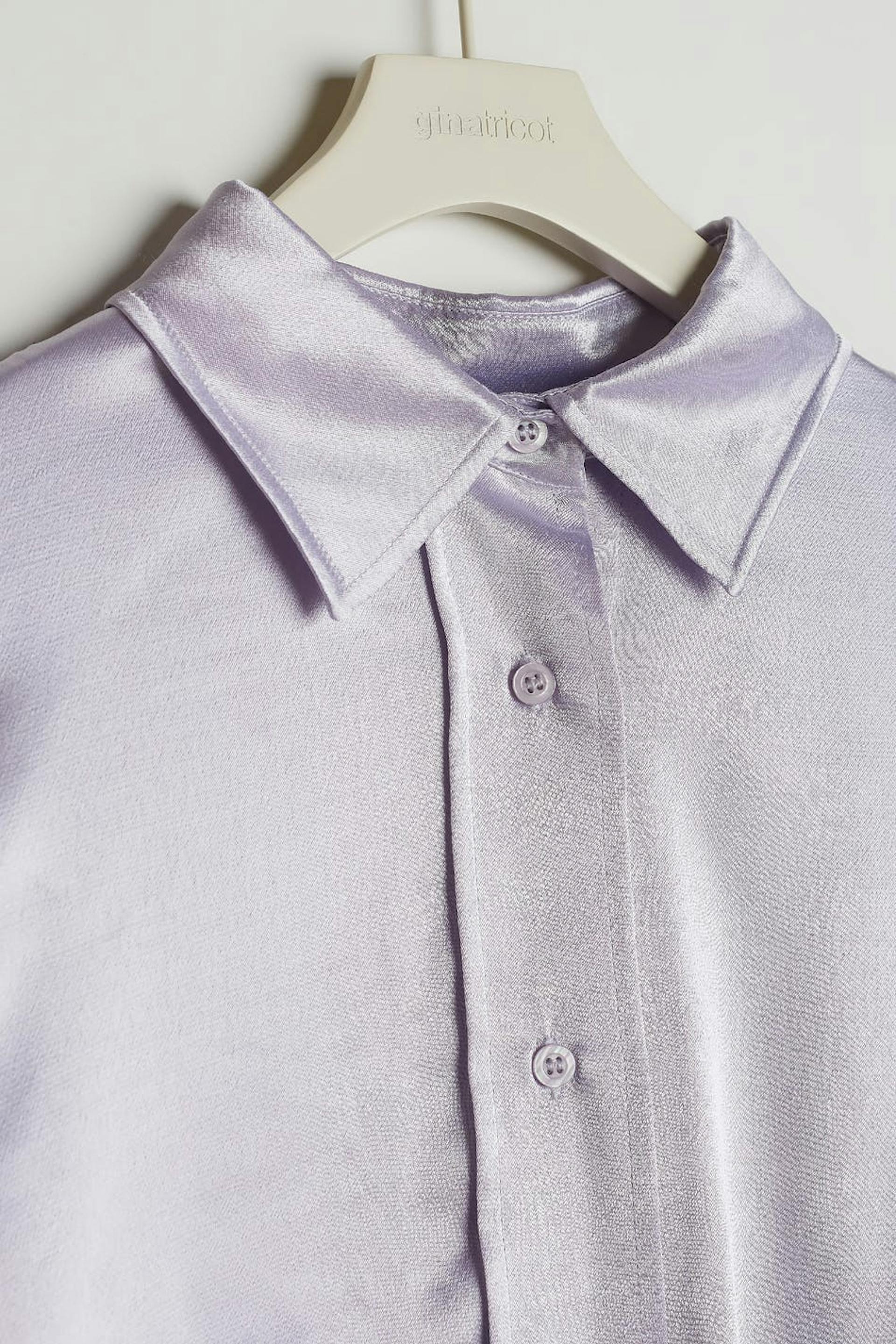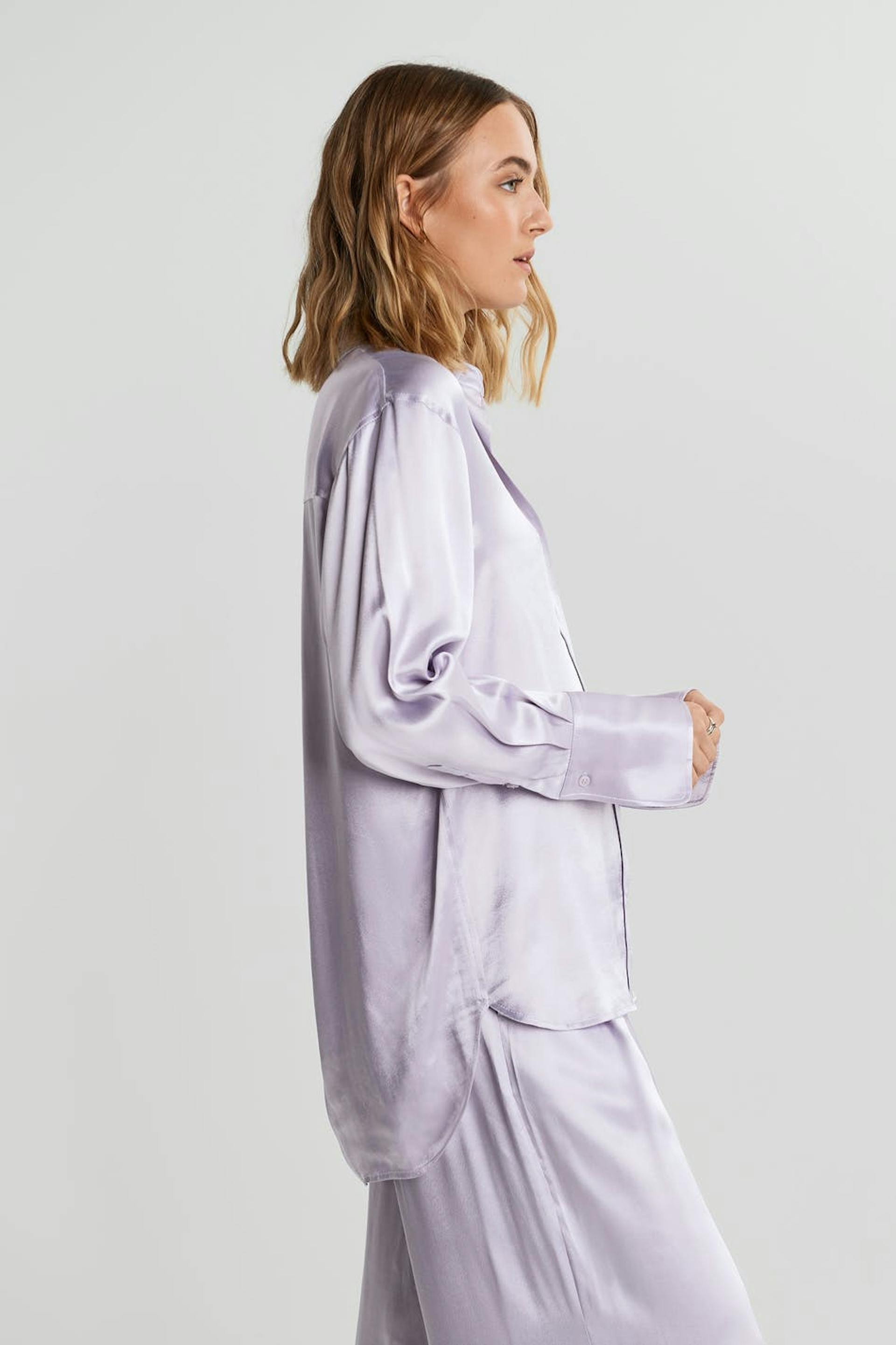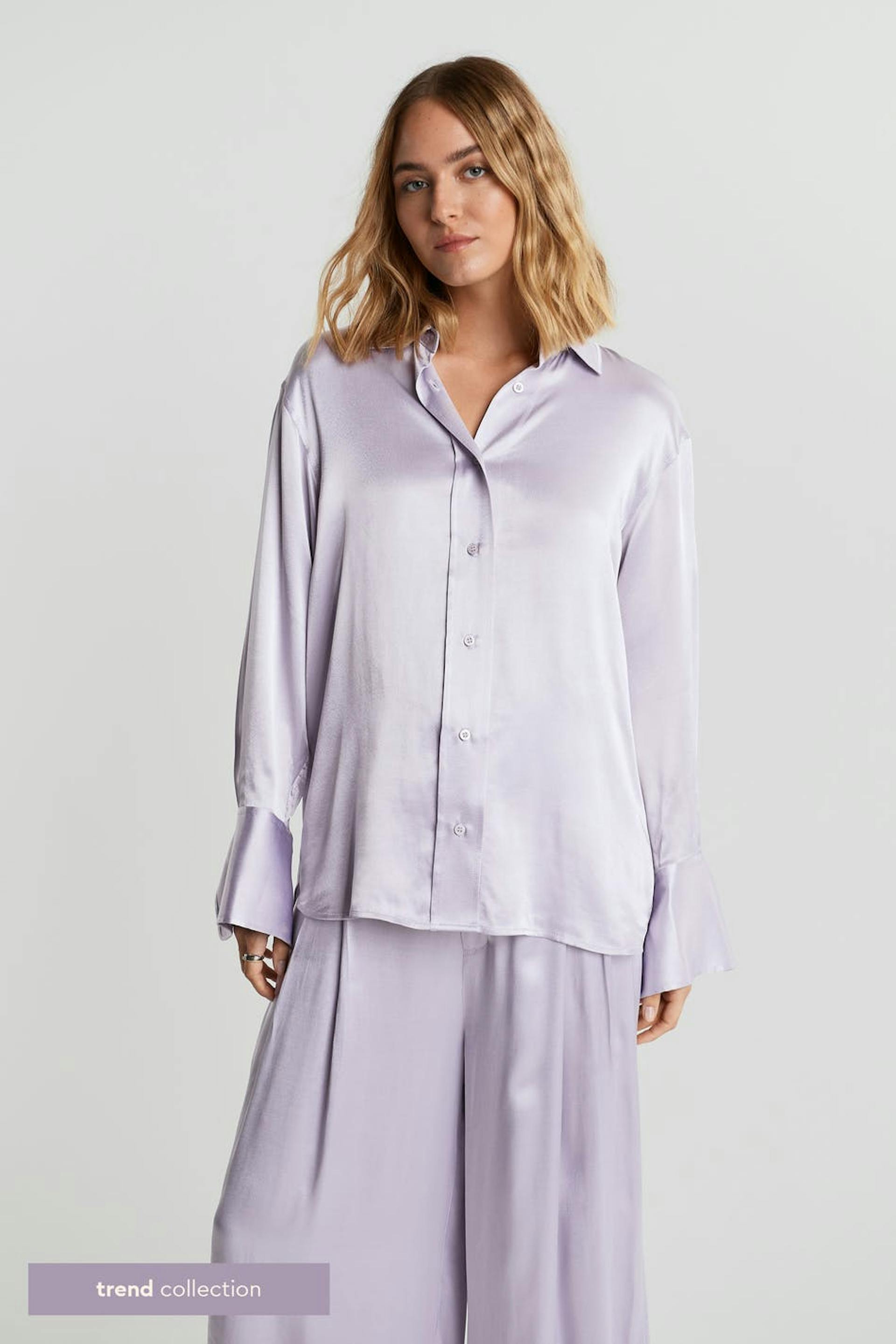 Luftig bluse med en oversized-passform. Blusen er lilla og har et satengaktig materiale. Den har knapper foran.