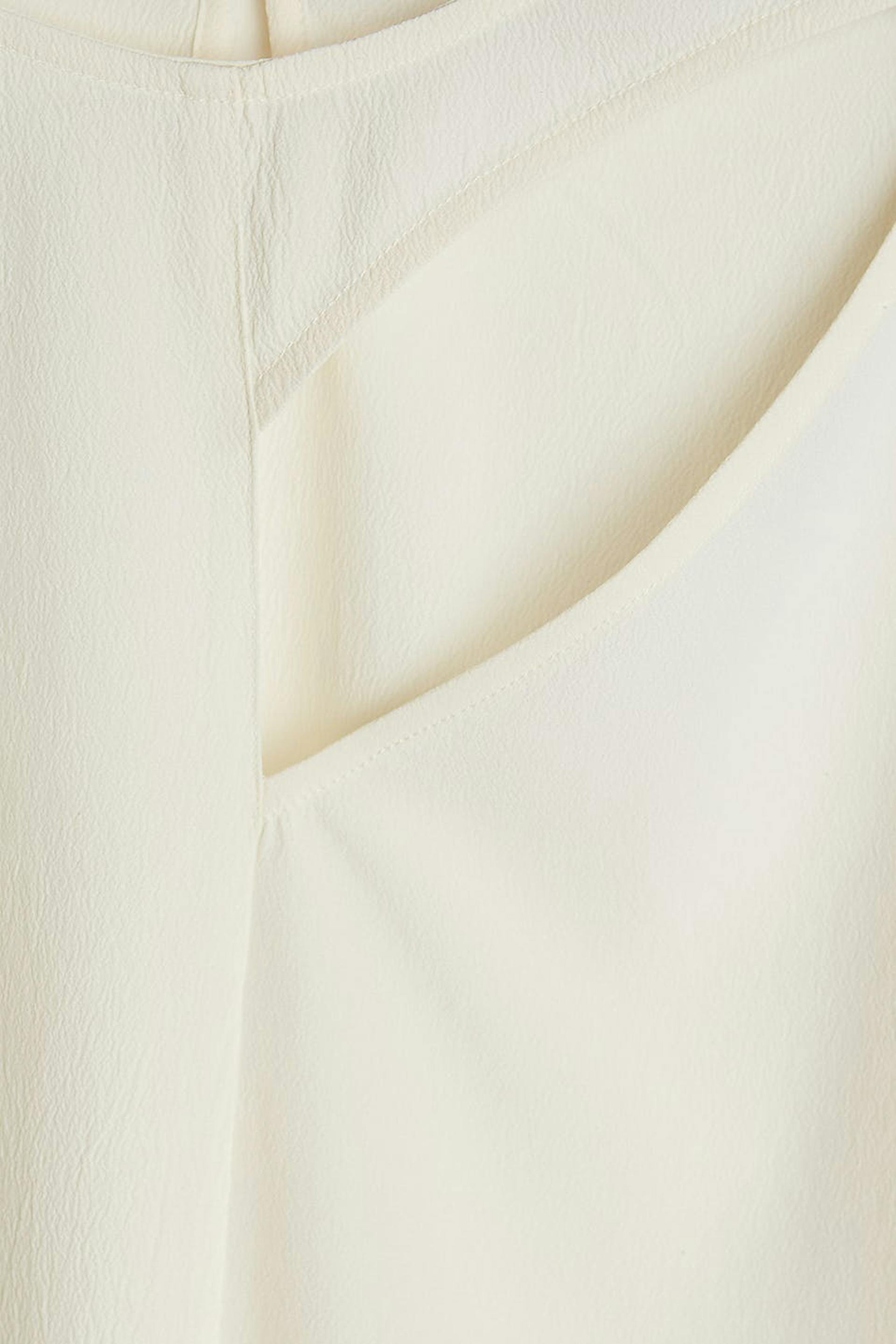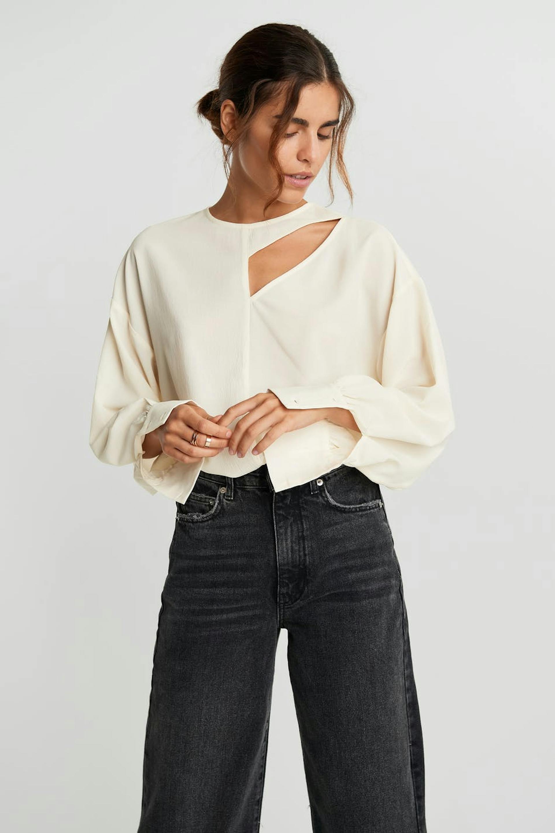 Langermet bluse med en detalj på framsiden med et utsnittet. Blusen er hvit. Den er laget av sateng.