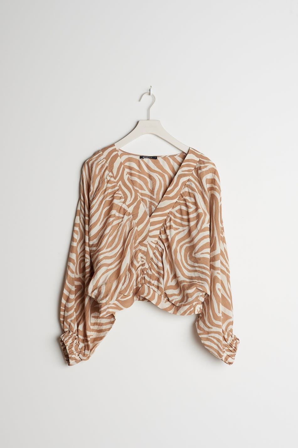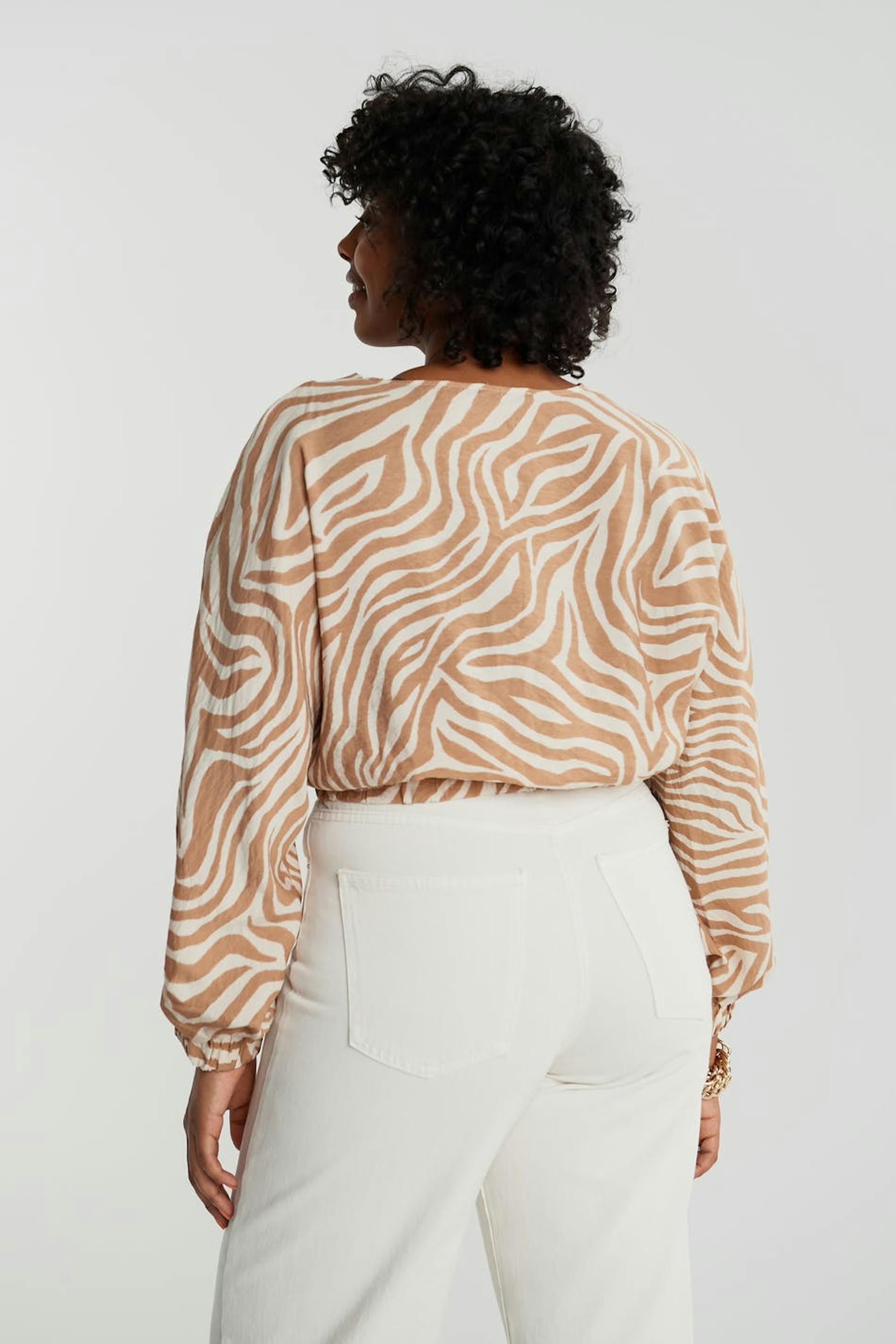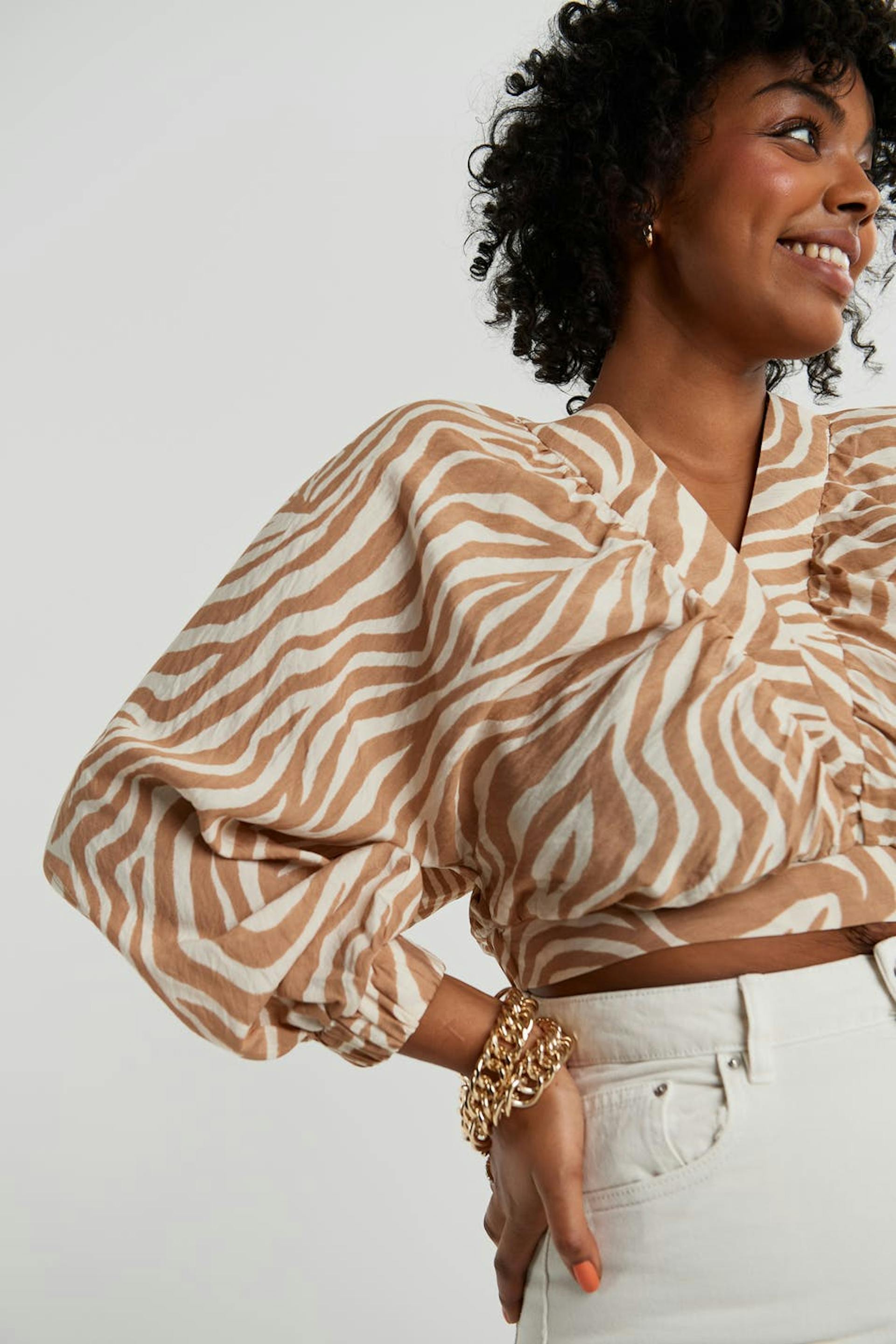Zebramønstret bluse med lange, voluminøse armer. Beige, hvit, luftig og kort. Den har en gummistrikk på enden av ermene og på linningen og en v-hals.