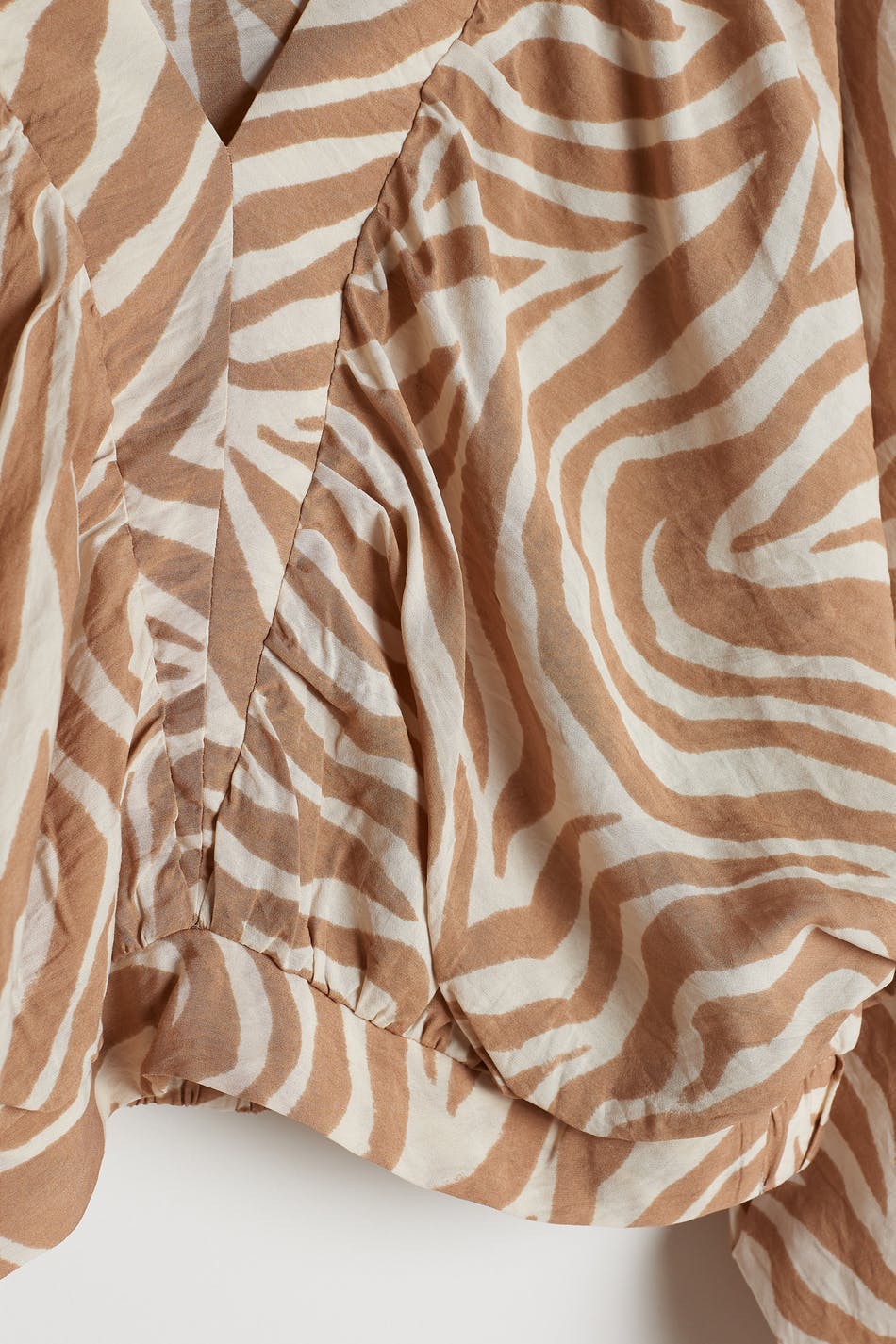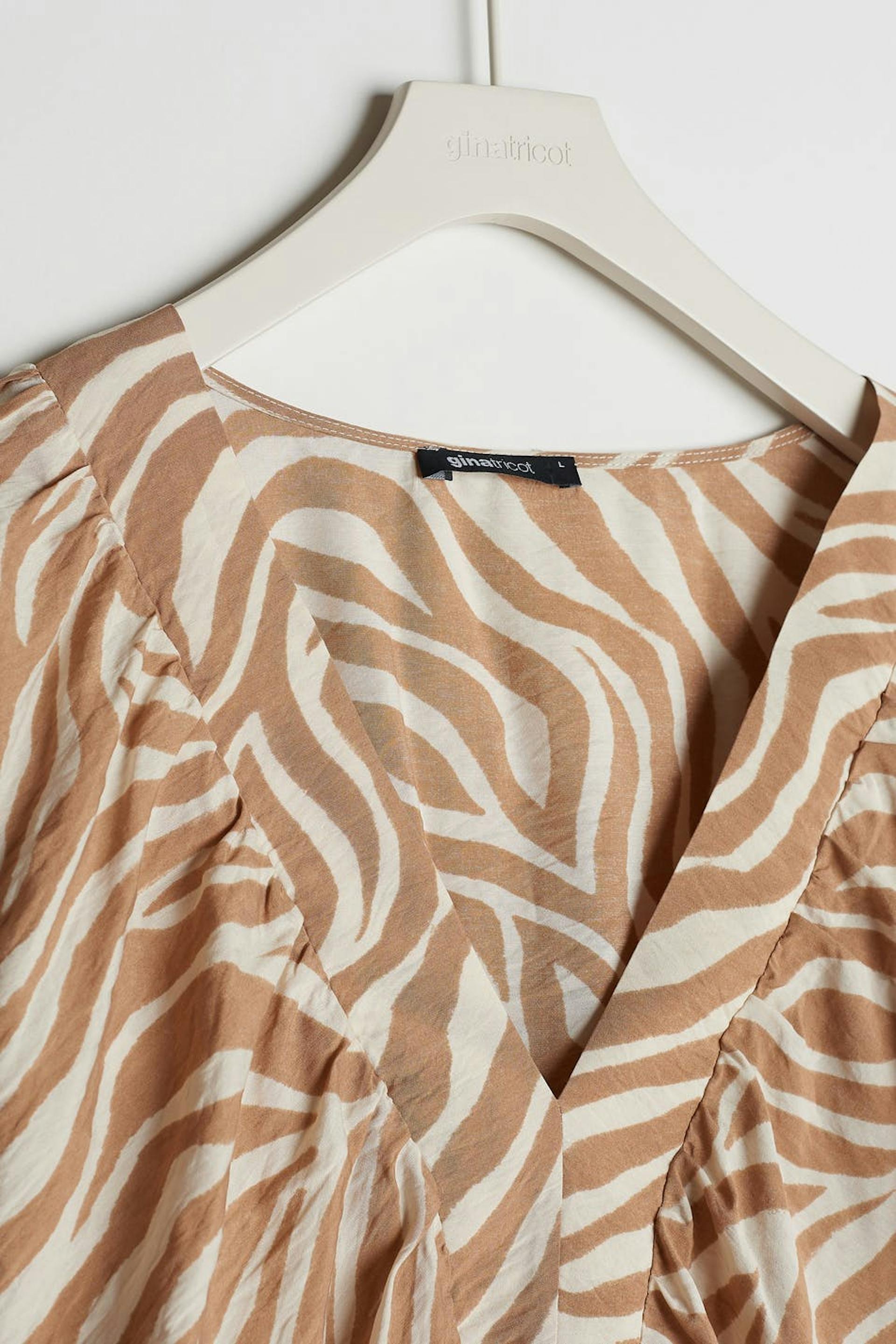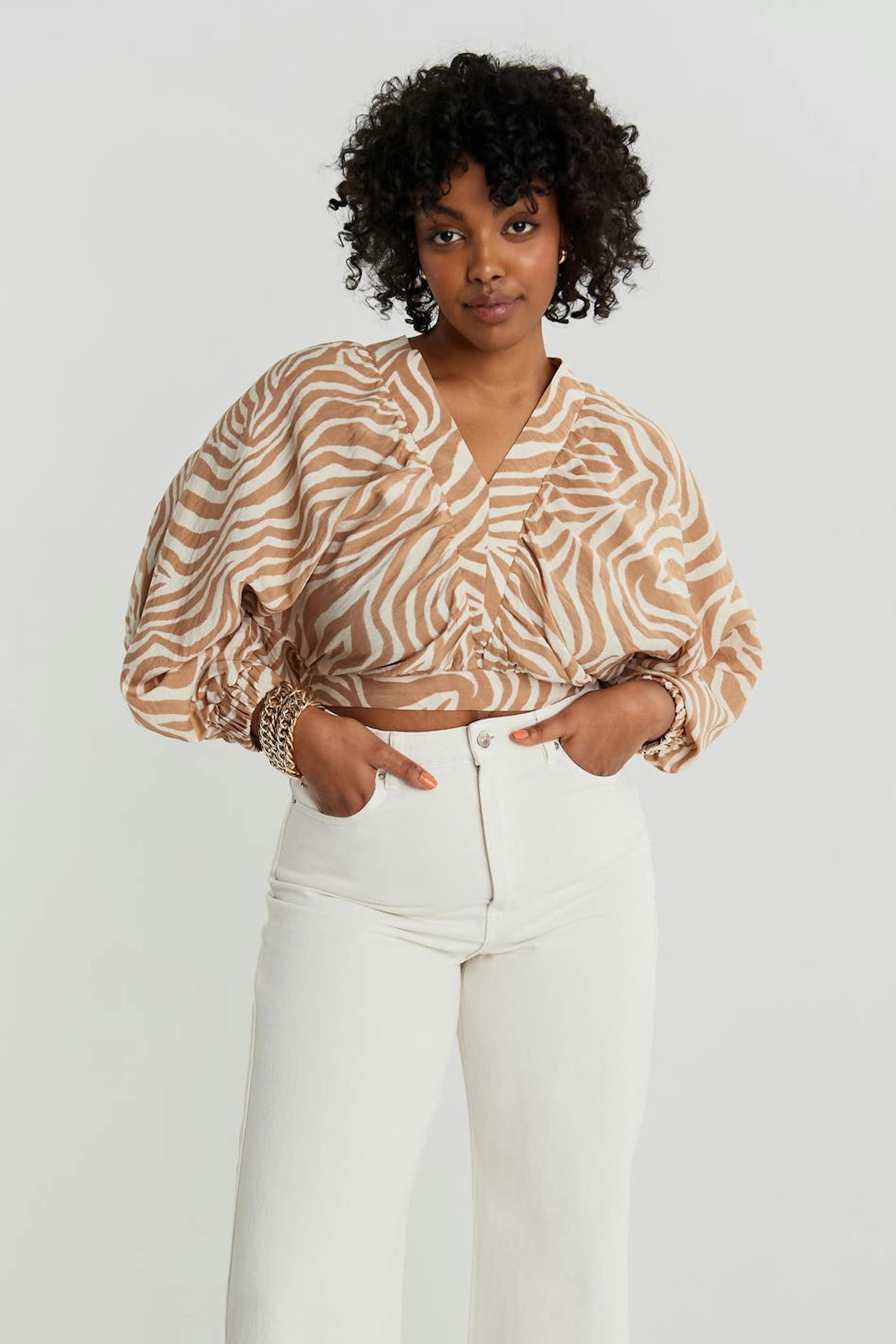 Zebramønstret bluse med lange, voluminøse armer. Beige, hvit, luftig og kort. Den har en gummistrikk på enden av ermene og på linningen og en v-hals.