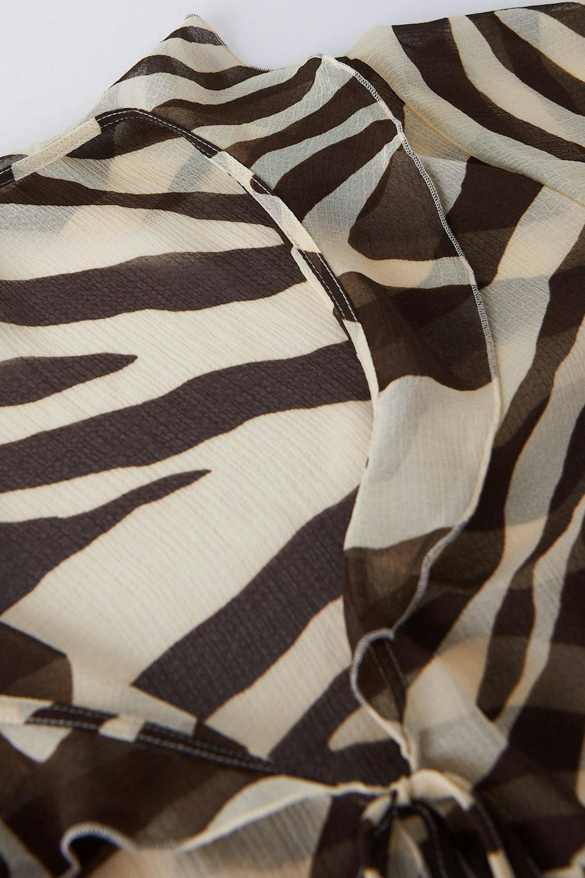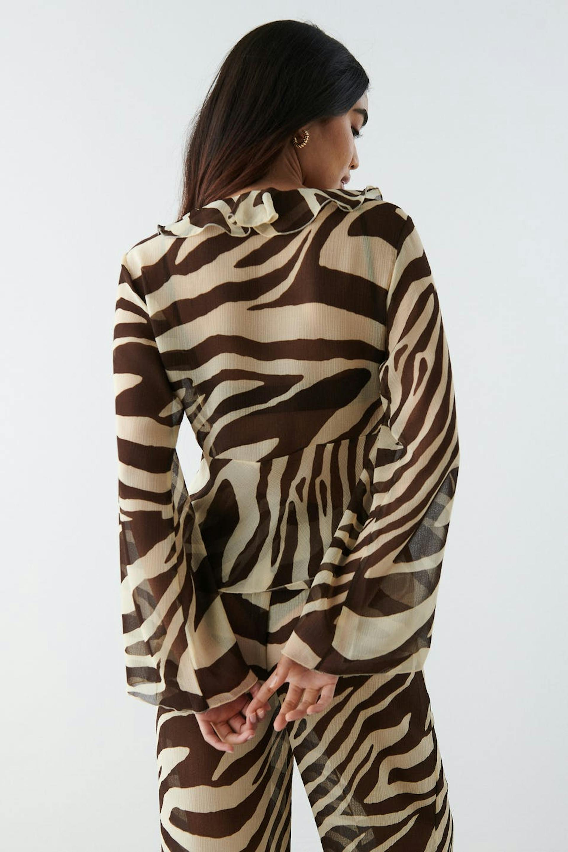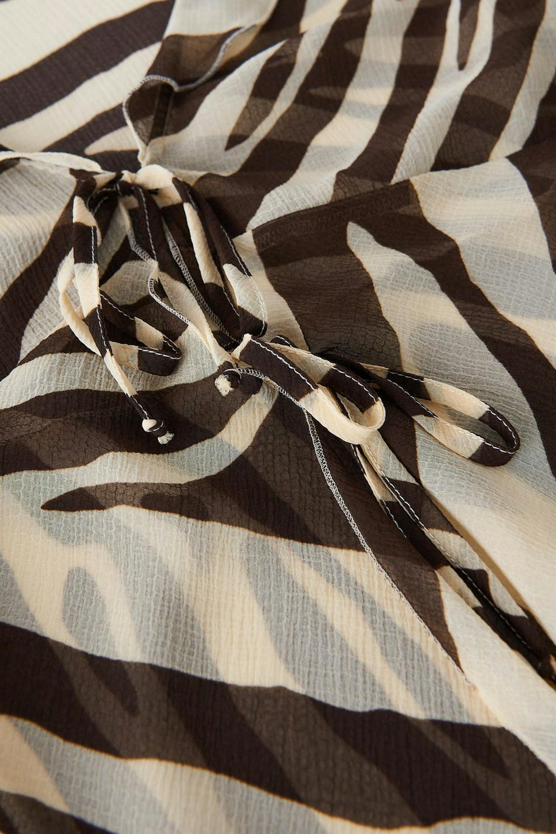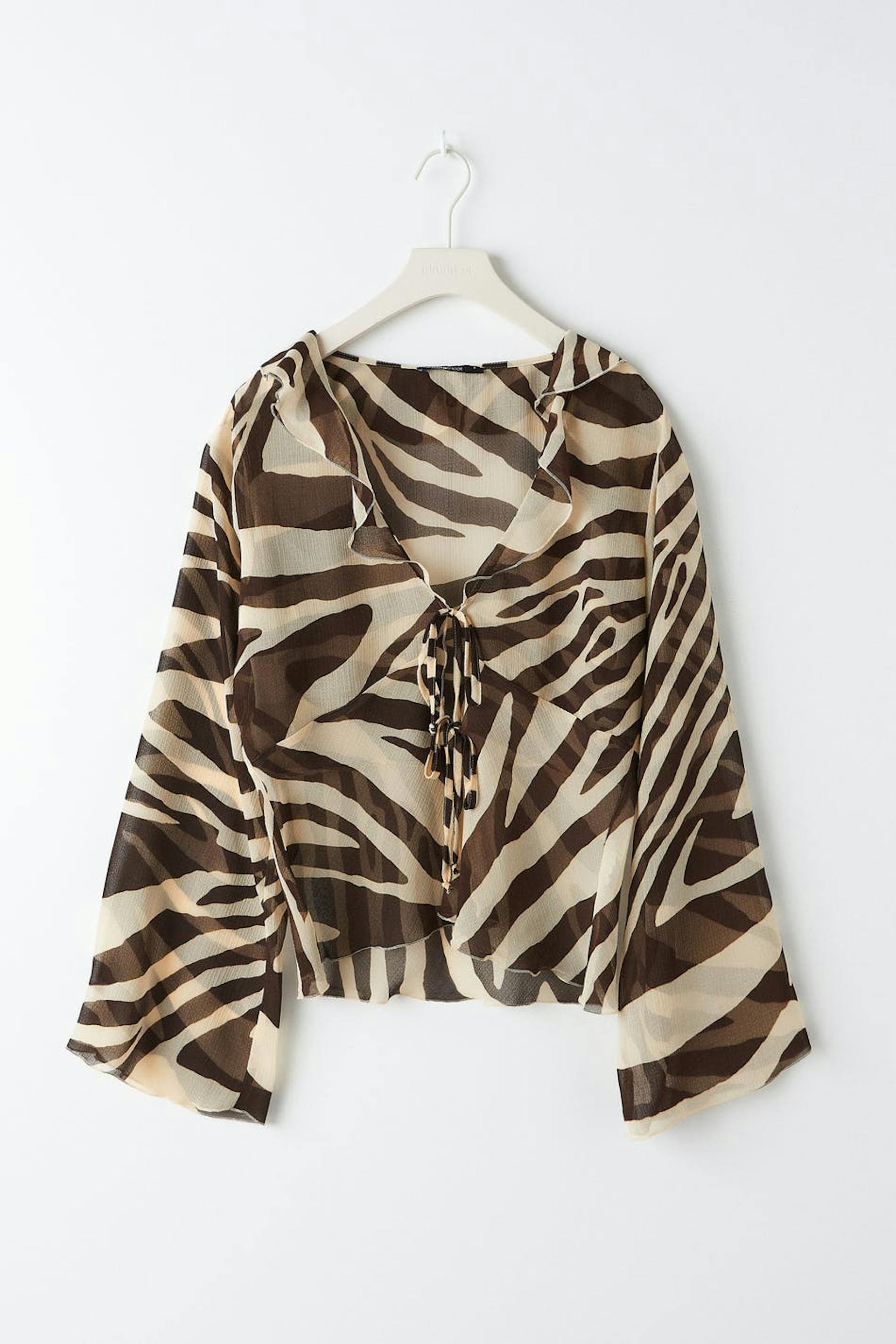 Rent bluse med knutelukking foran. Blusen er zebramønstret og har tynn, strukturert kvalitet i luftig chiffon. Den har en avslappet passform, v-ringning og lange trompetermer.