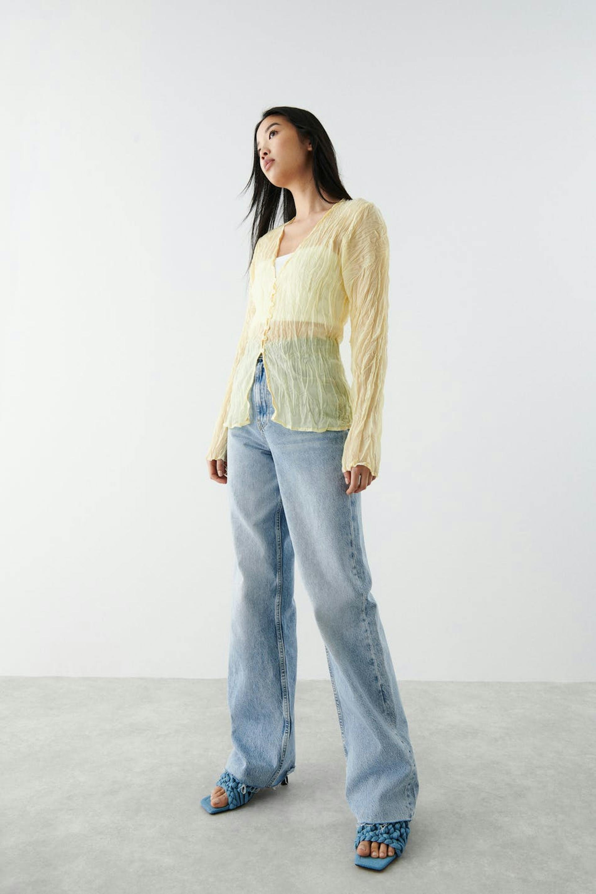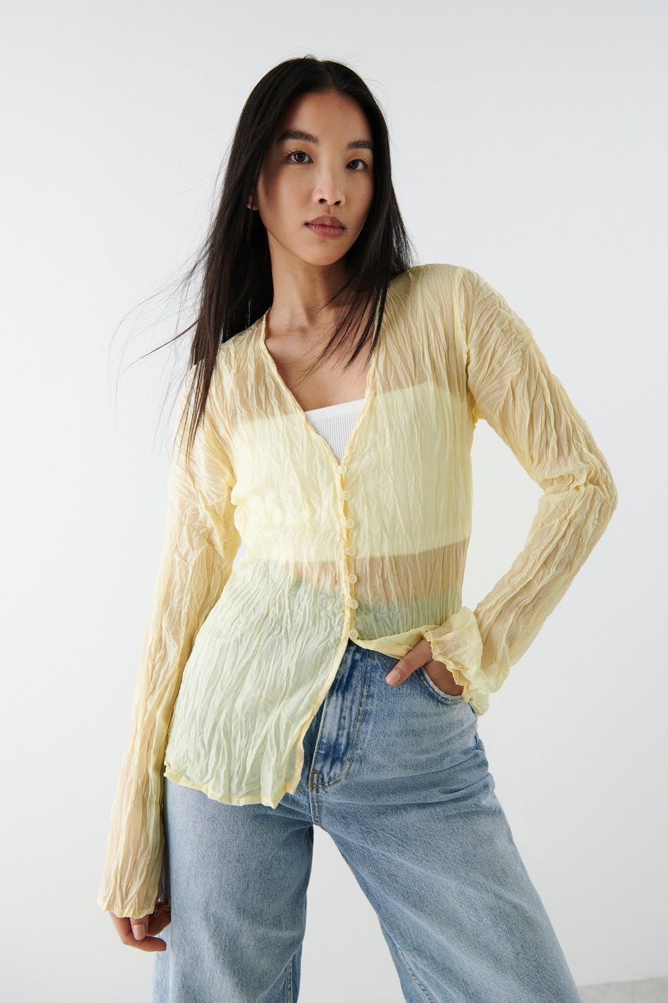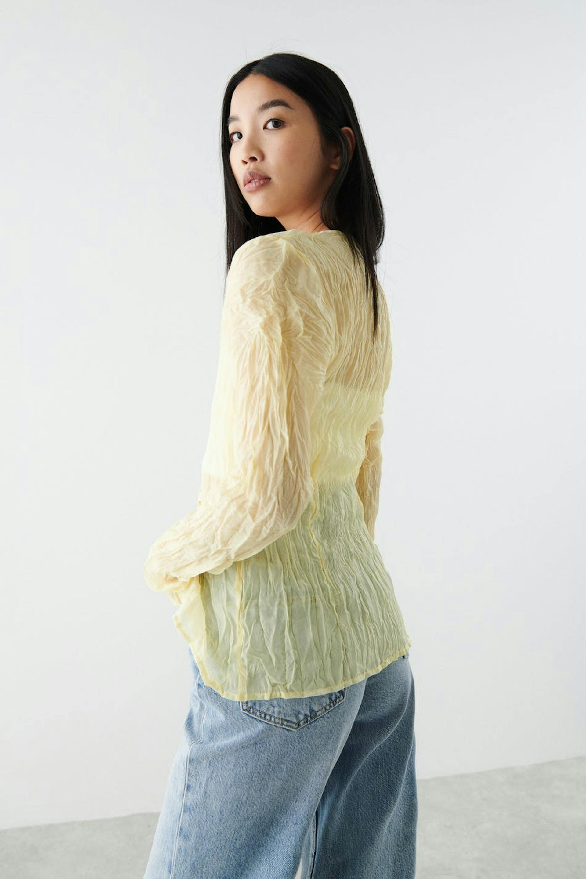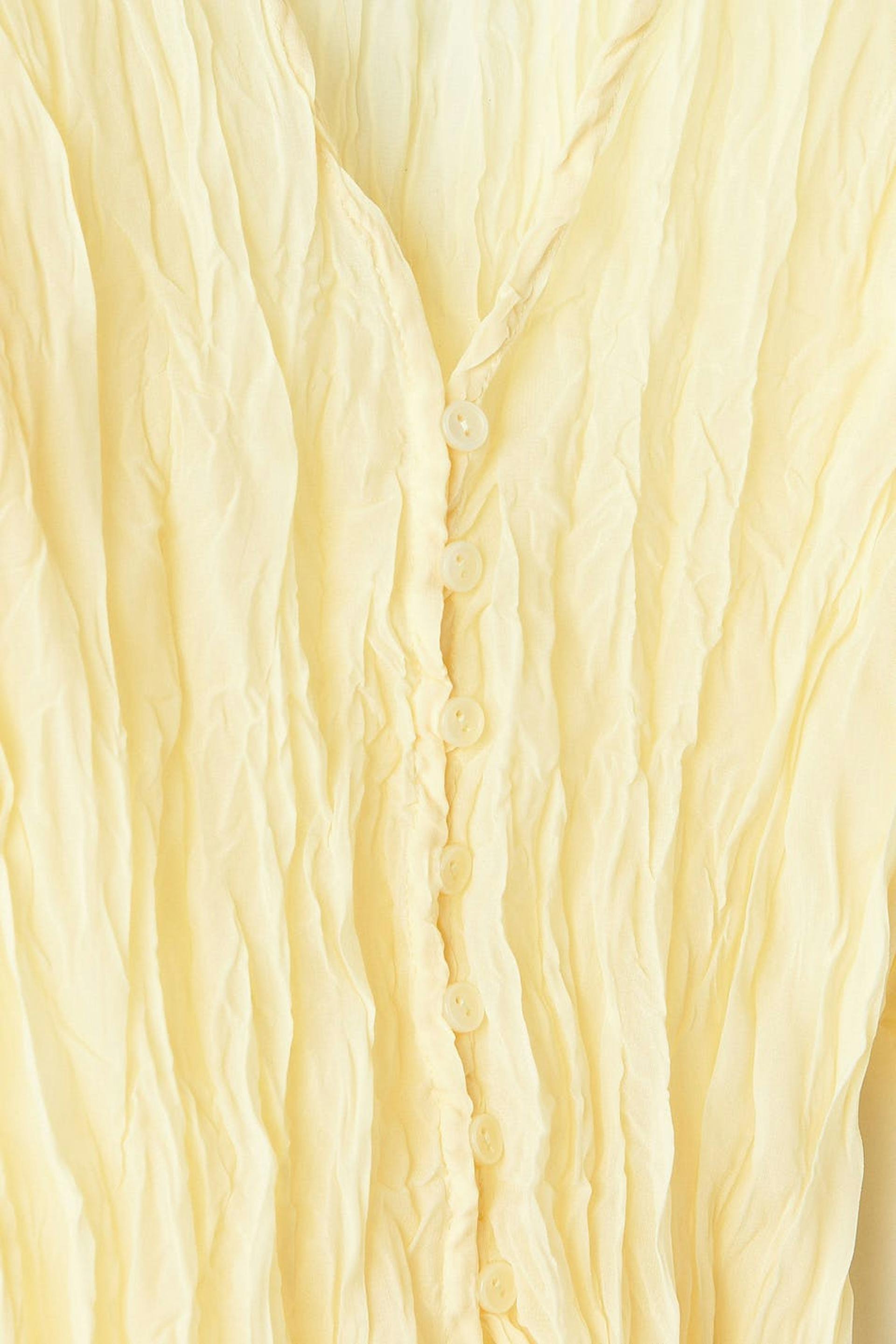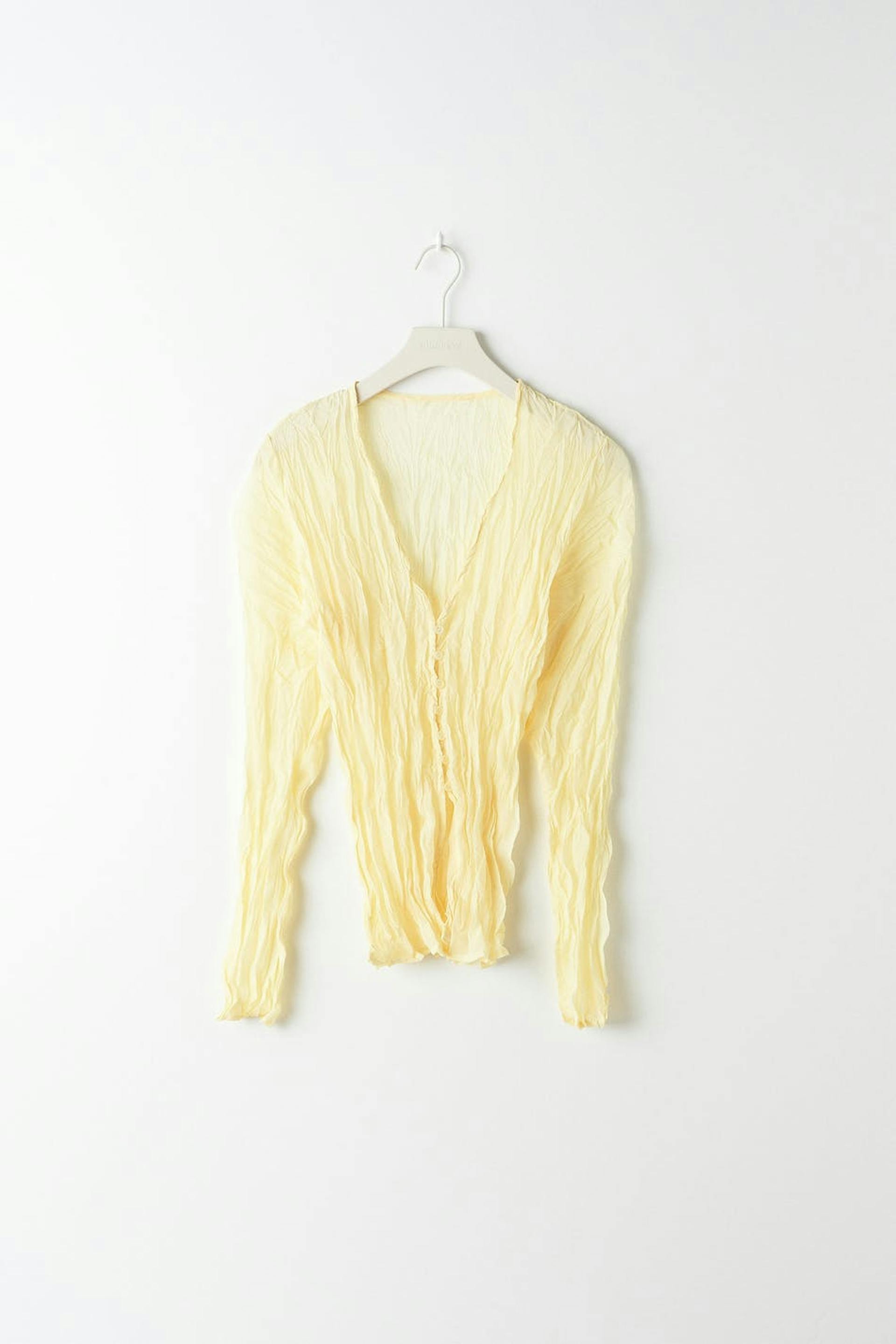 Plissert bluse med knappstolpe foran. Blusen er gul og har luftig vevd stoff i polyester.