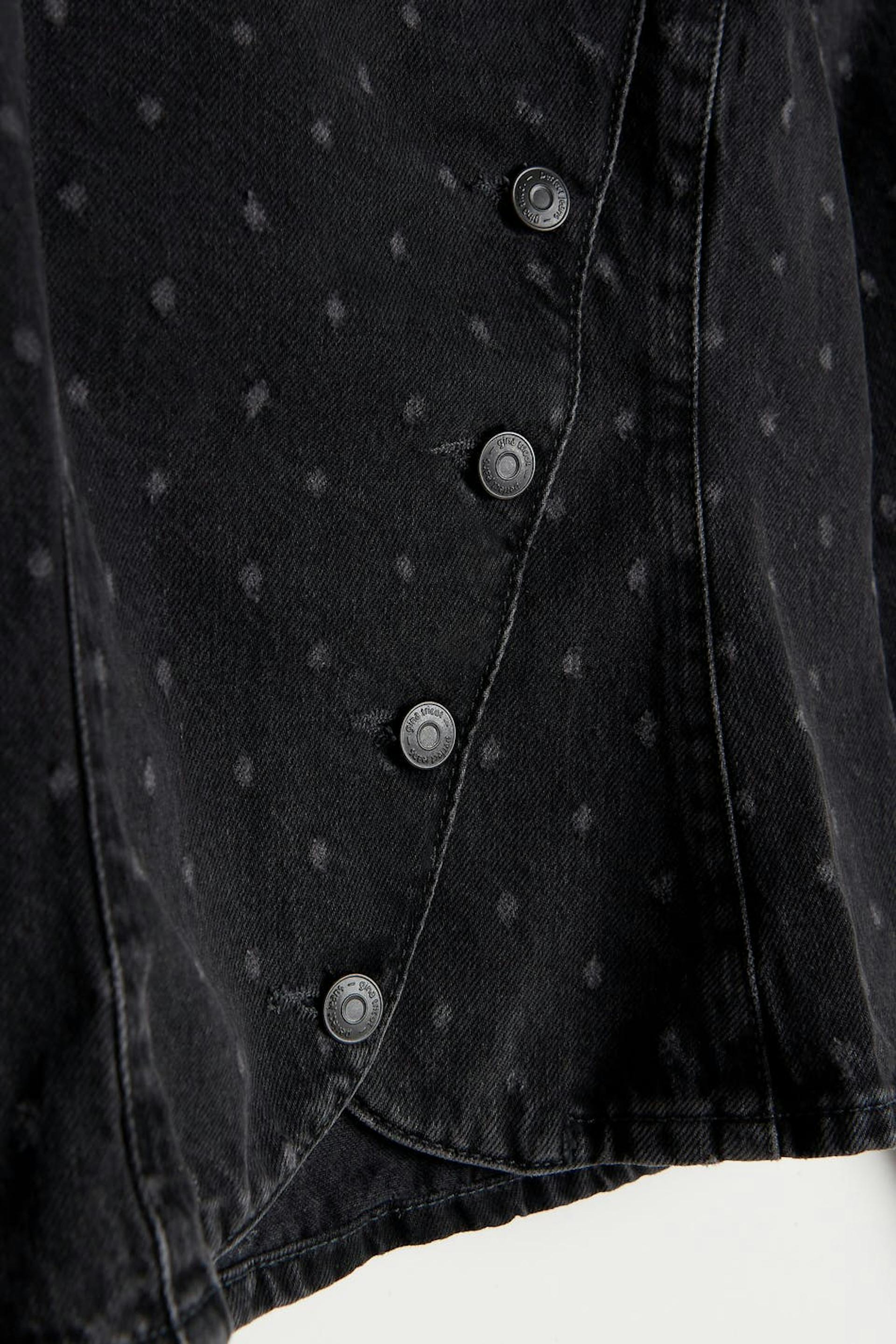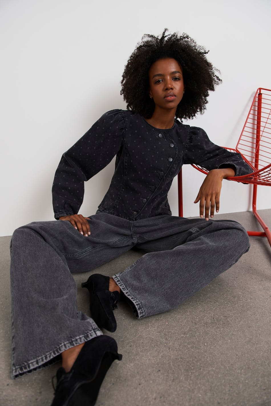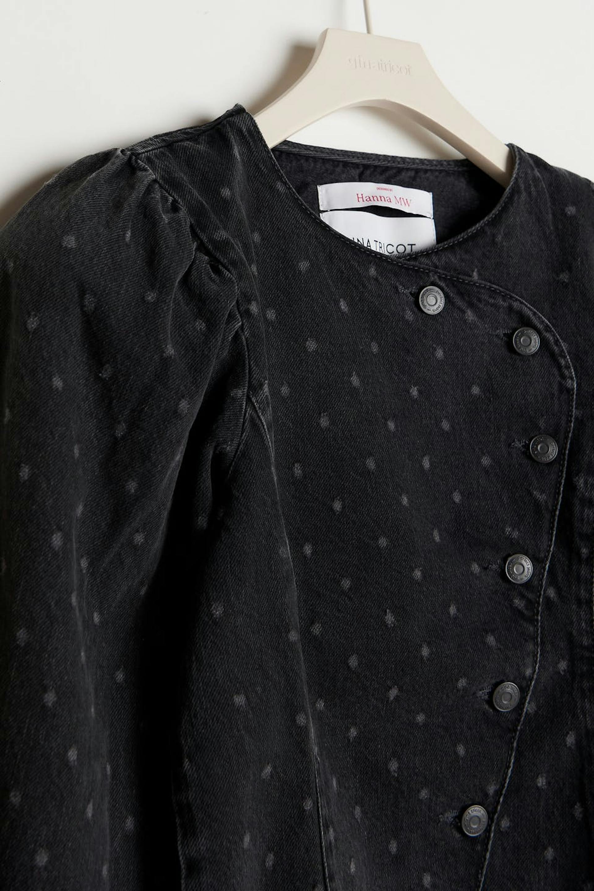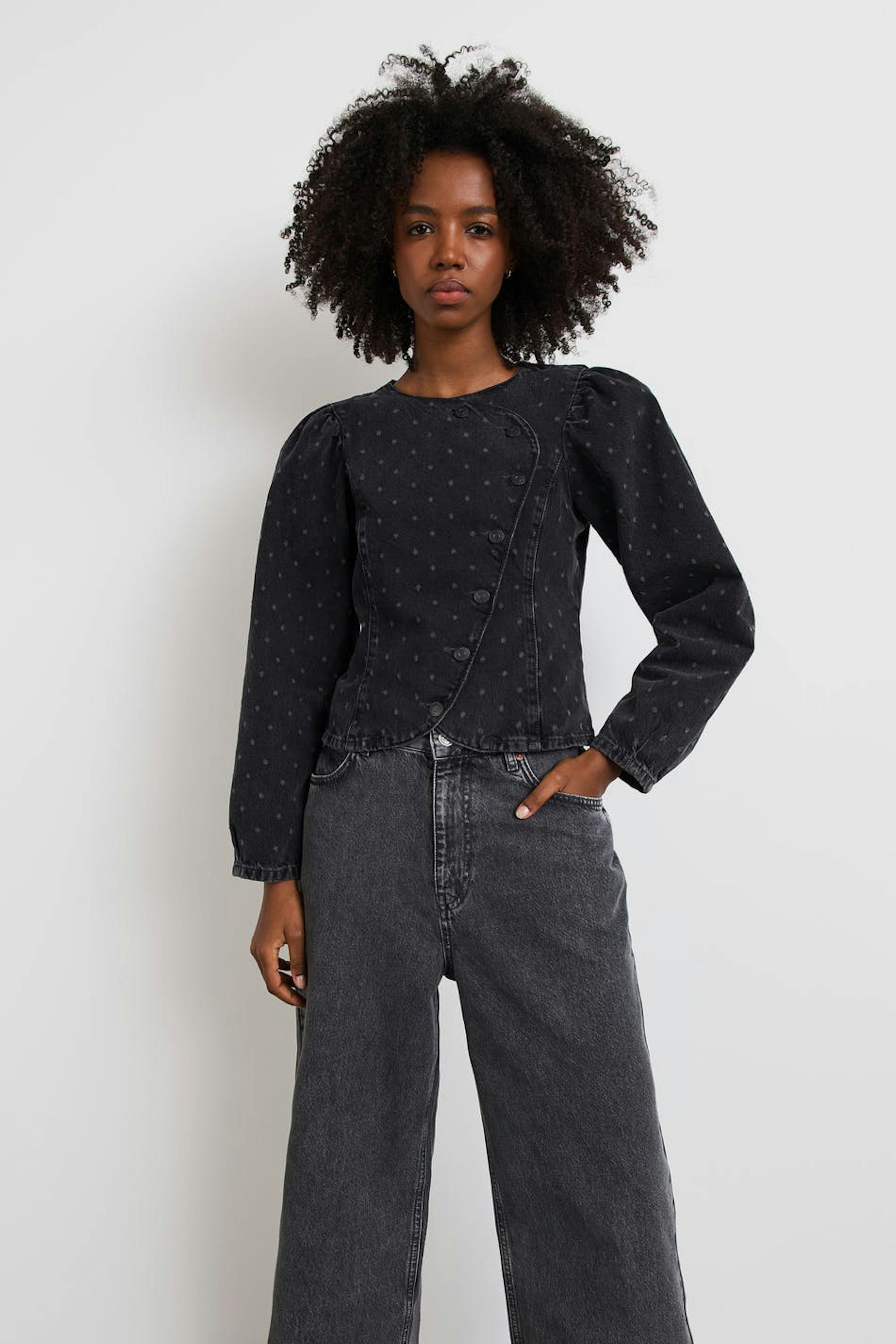 Hanna MW X Gina Tricot. Denimbluse med prikket og en tilpasset passform. Blusen er mørke grå og har puffermer. Den har en rund halsringning og en asymmetrisk knappelukking foran. .