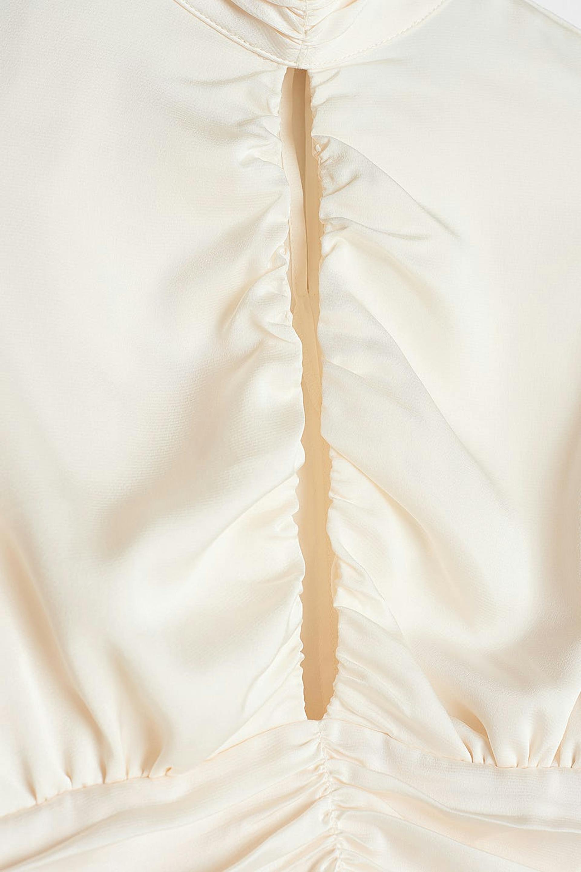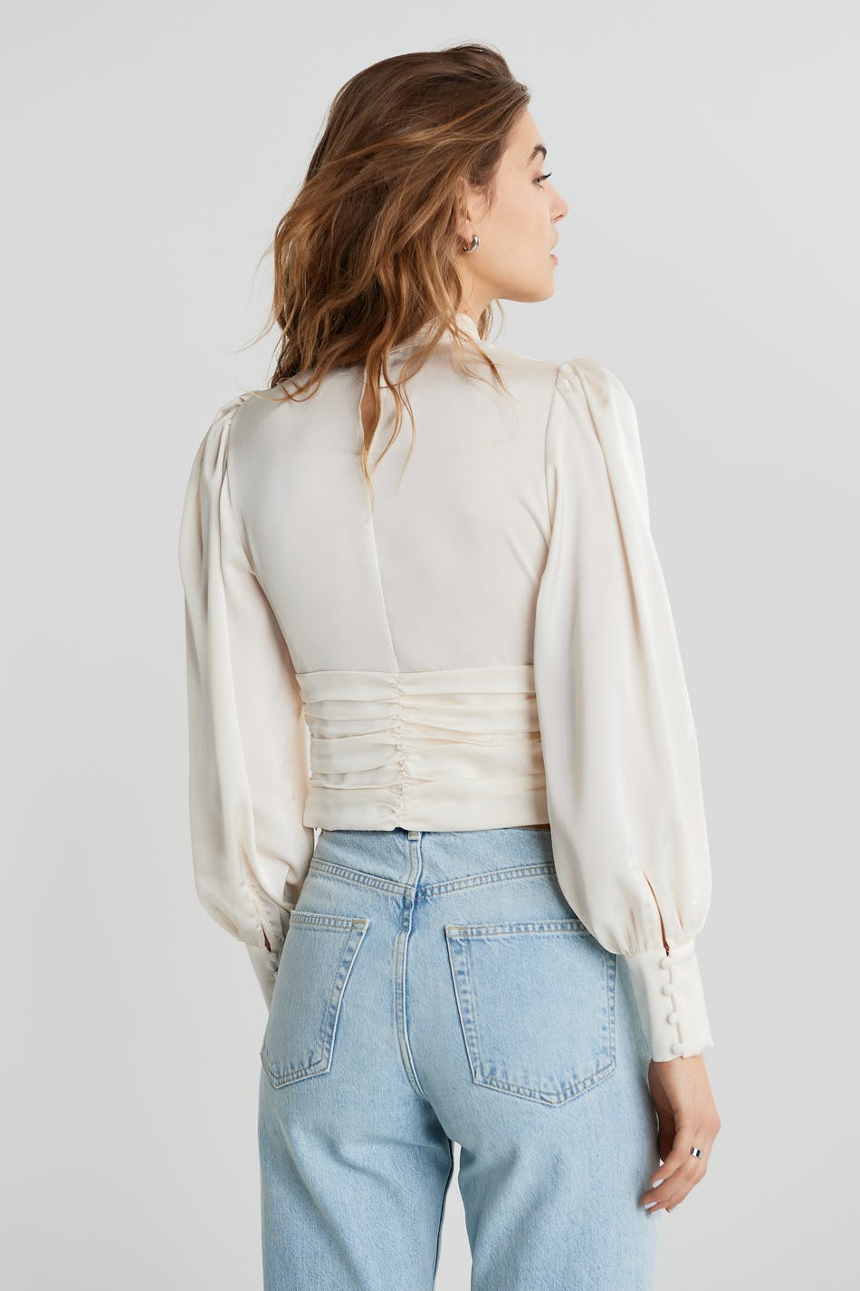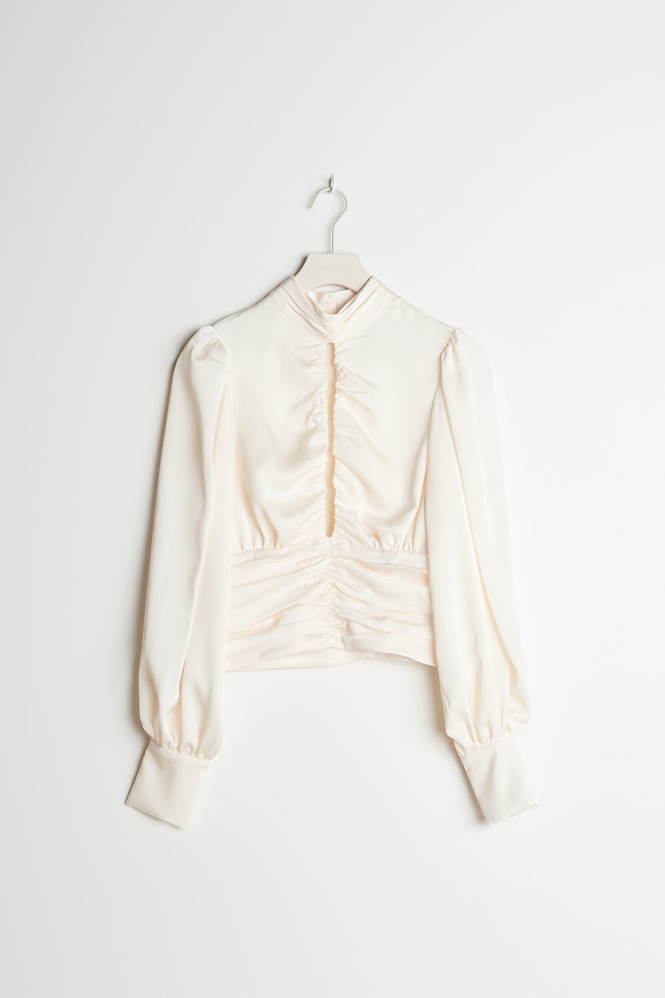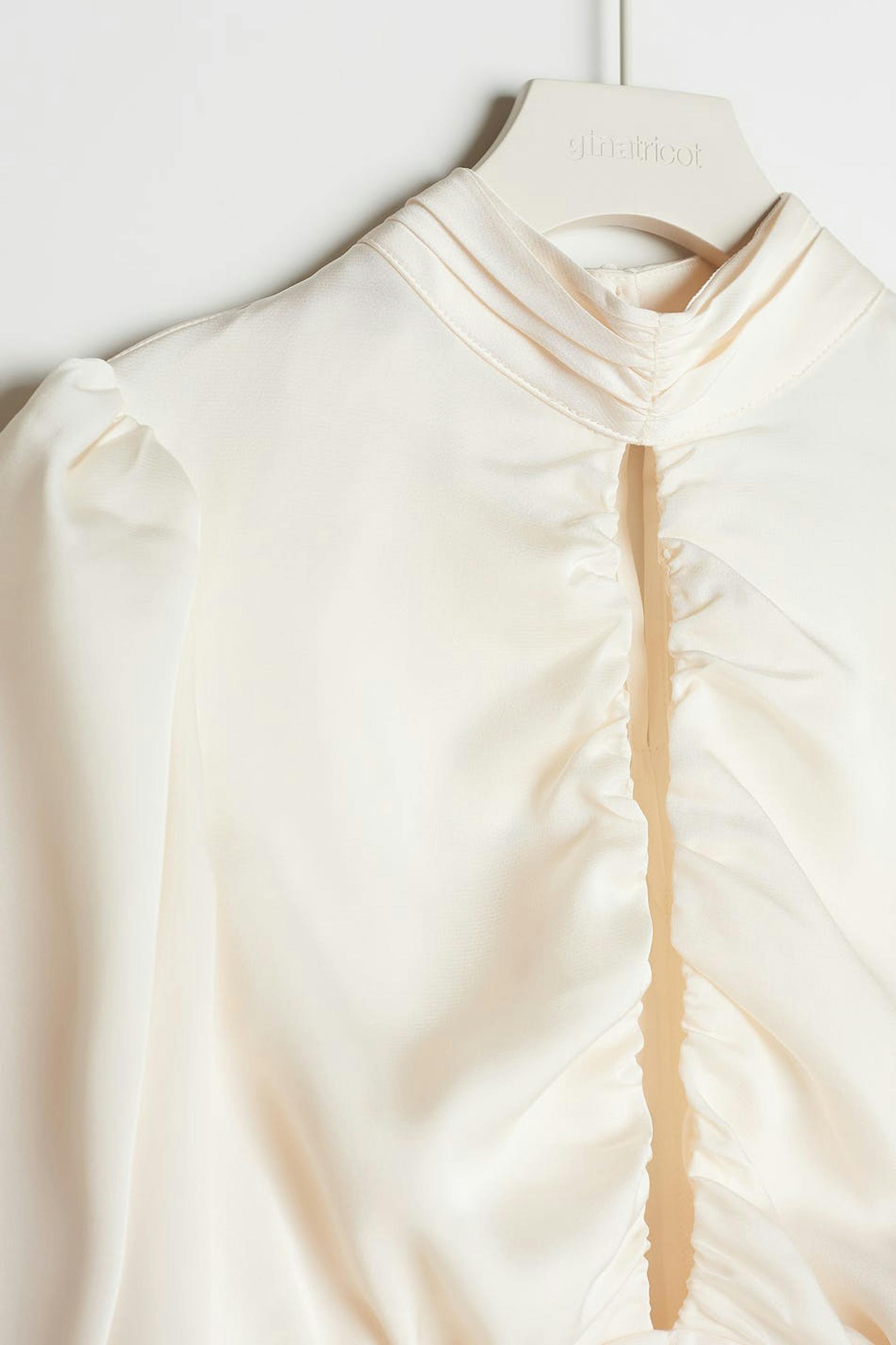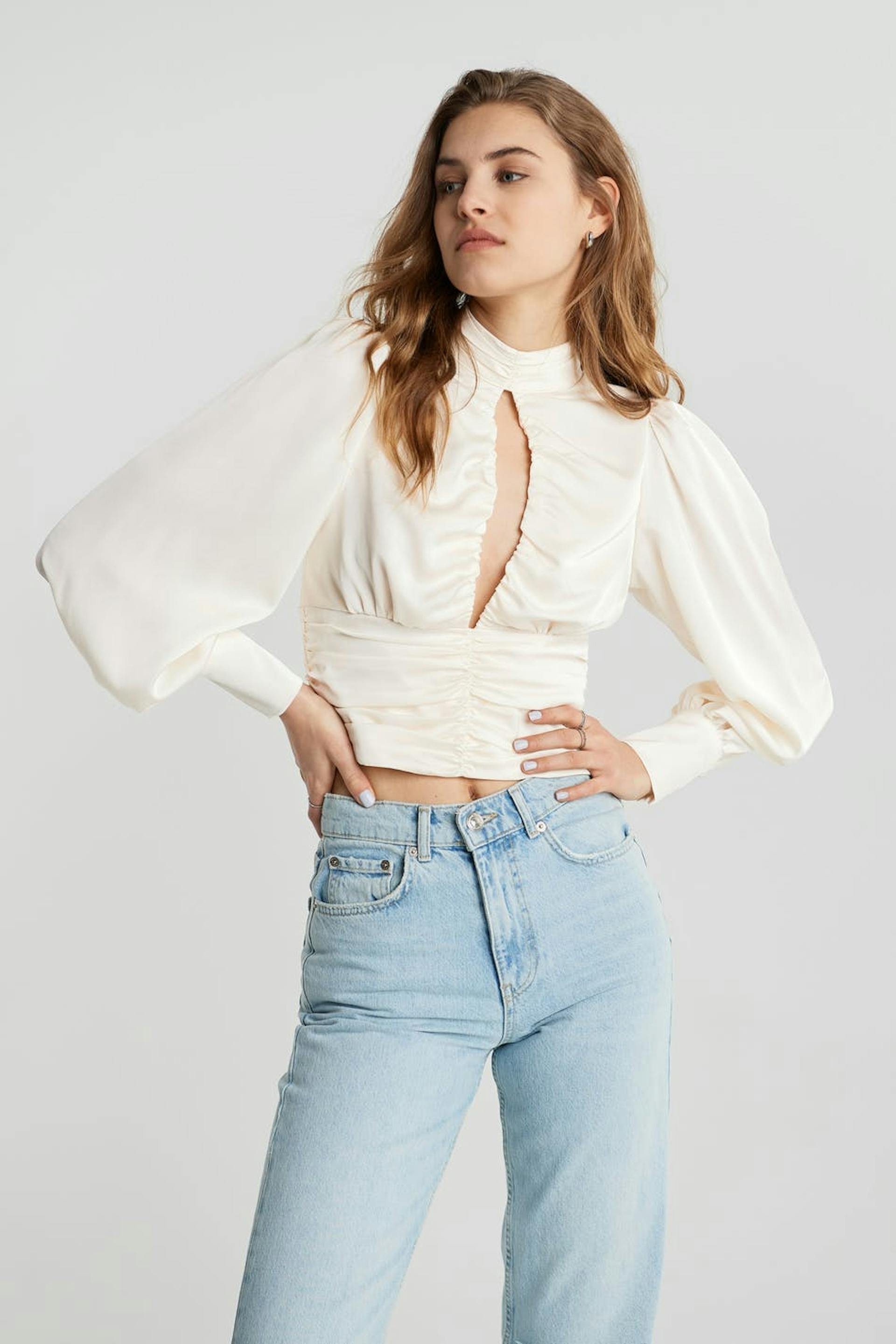 Kort bluse med lange puffermer. Blusen er perfekt for festen og hvit og har rynke på linningen. Den har en nøkkelhulsåpning foran og en høy hals.