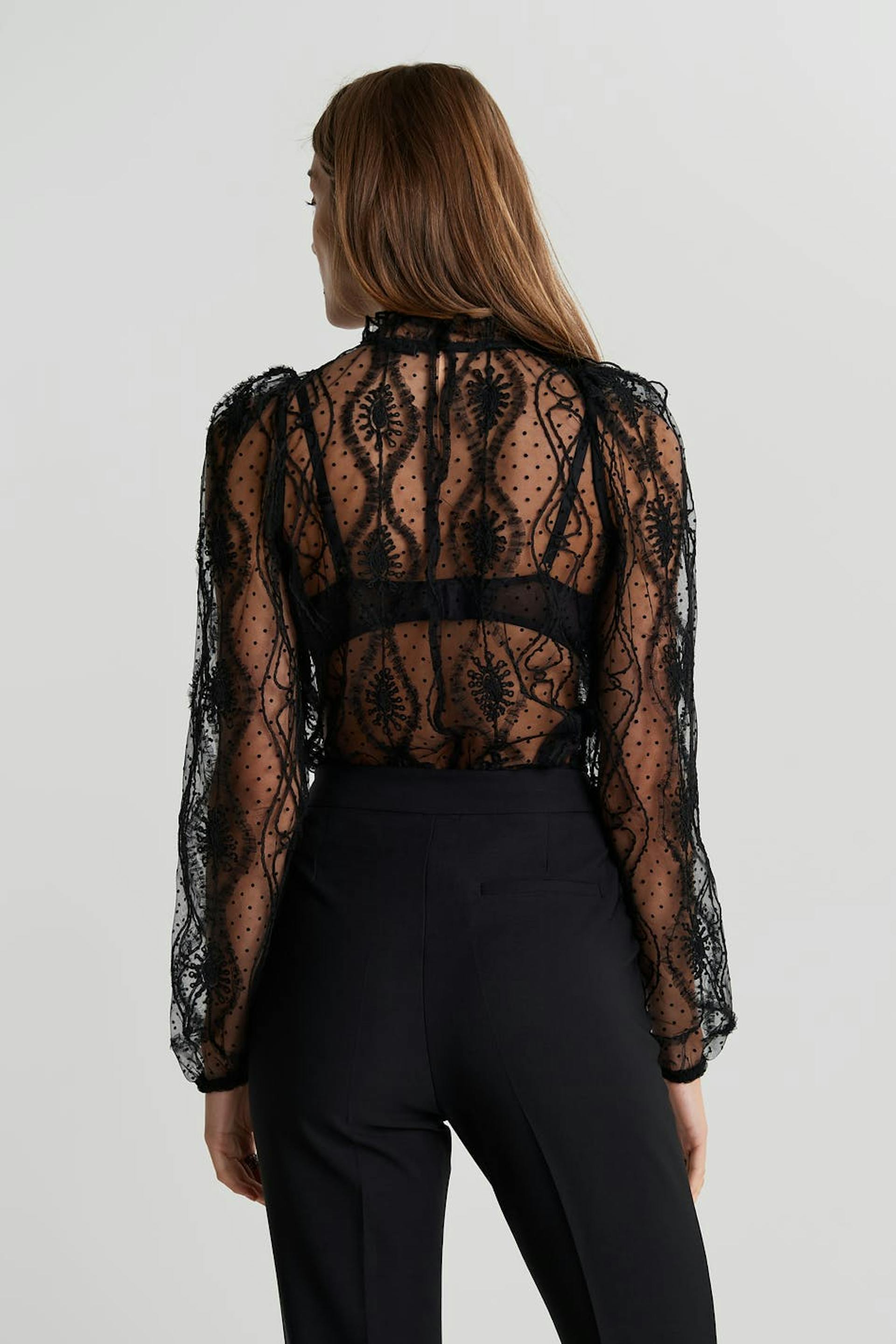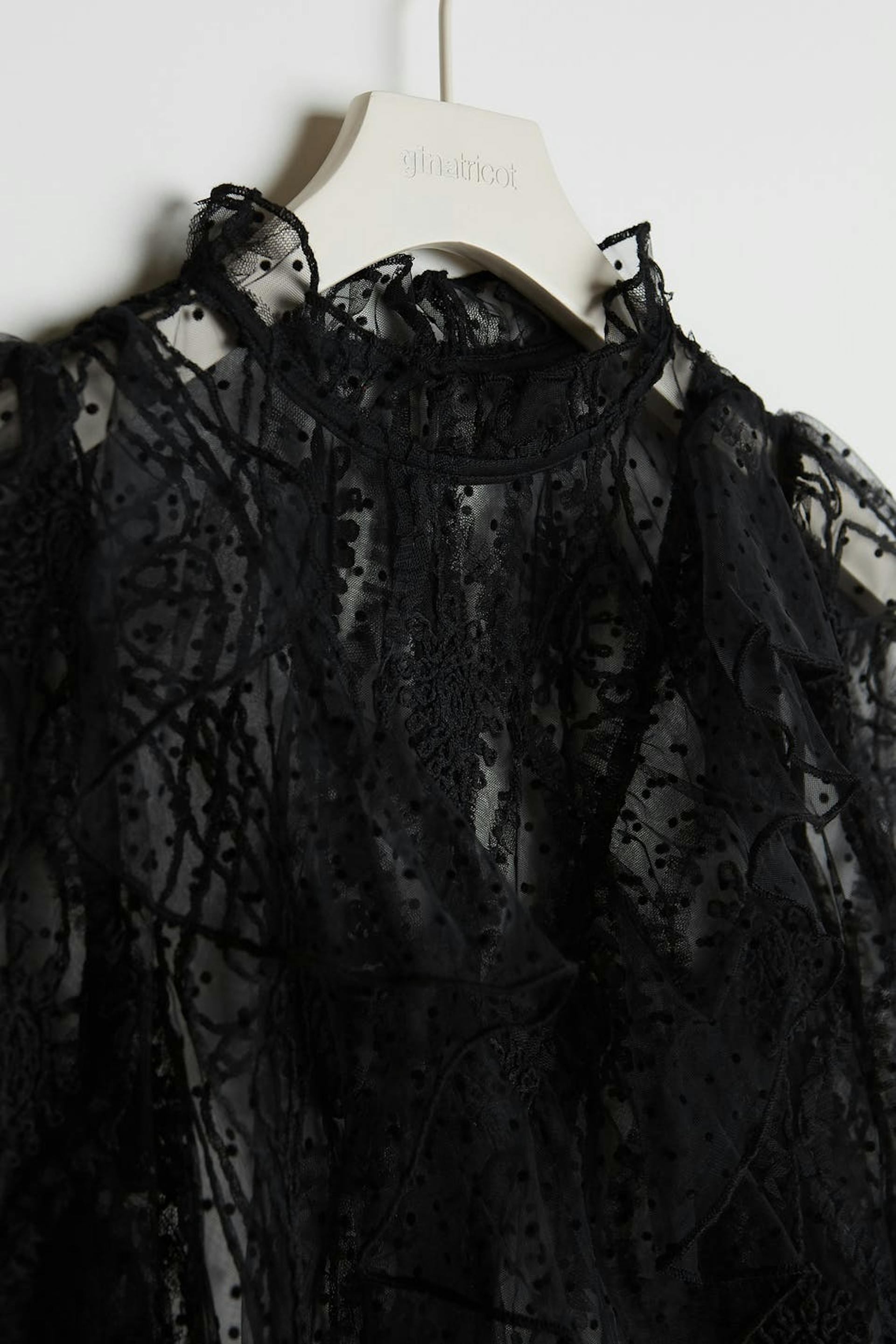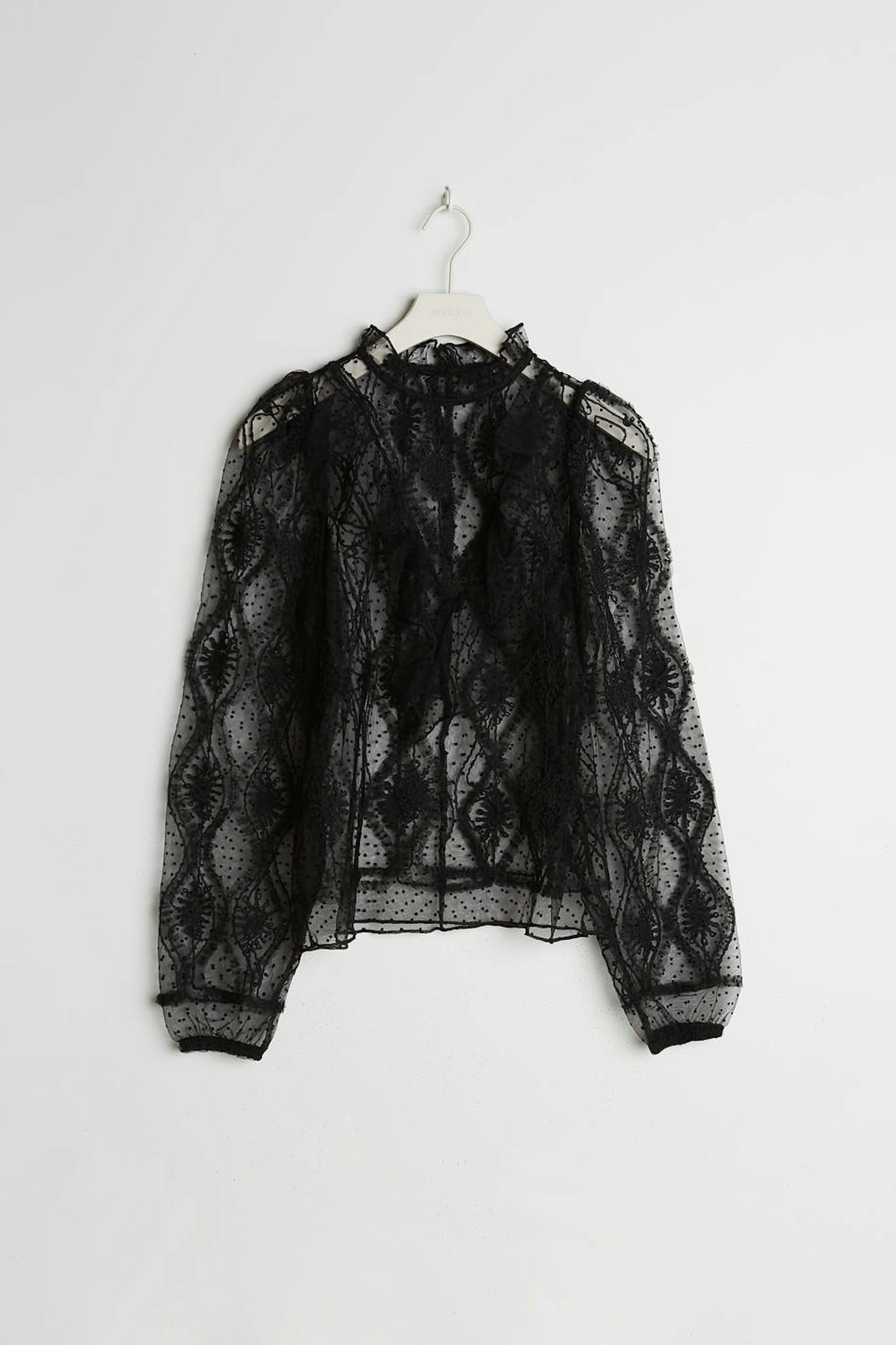 Bluse med en høy hals med en volang. Blusen er svart og har lange, diskrete puffermer med en elastisk strikk på enden av ermene. Den er laget av blonde.