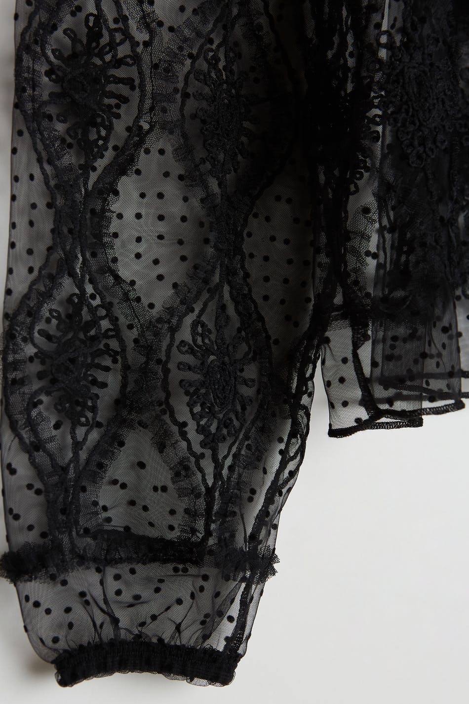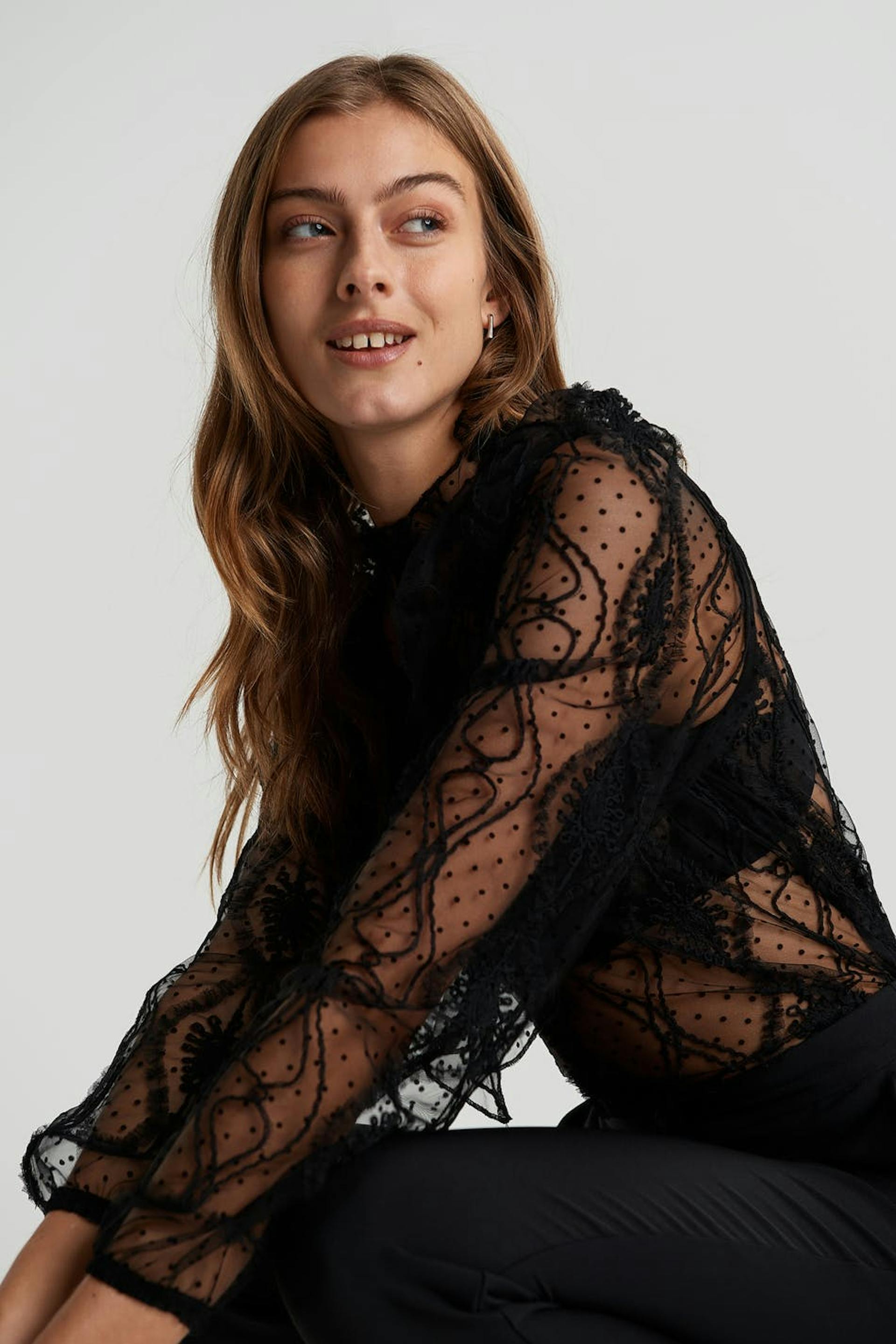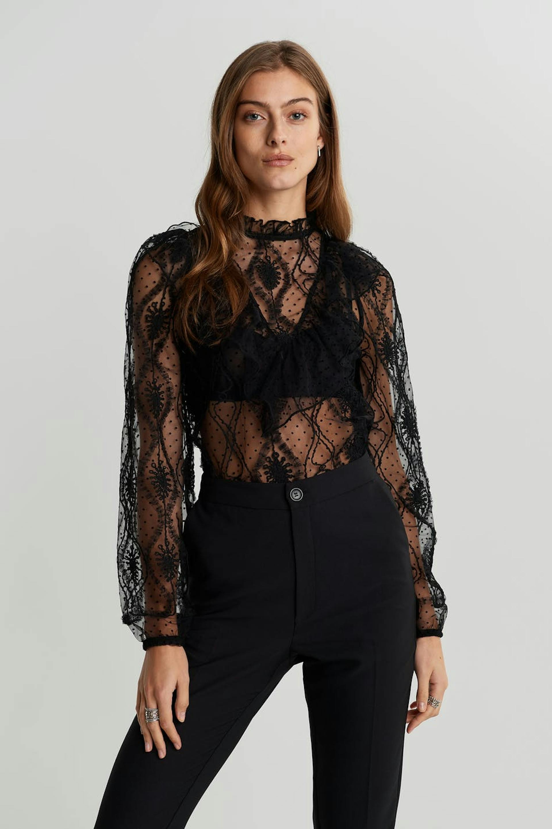 Bluse med en høy hals med en volang. Blusen er svart og har lange, diskrete puffermer med en elastisk strikk på enden av ermene. Den er laget av blonde.