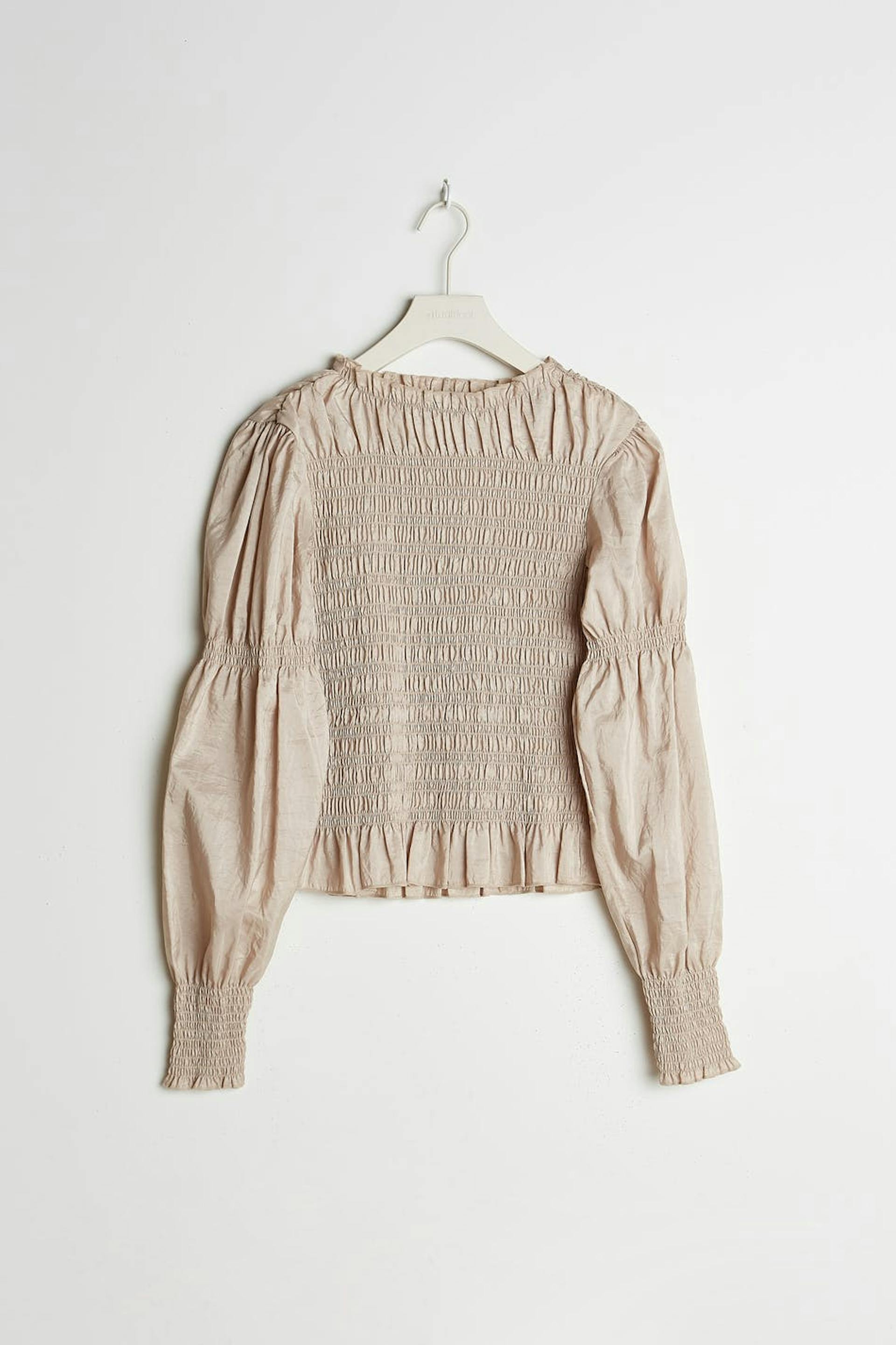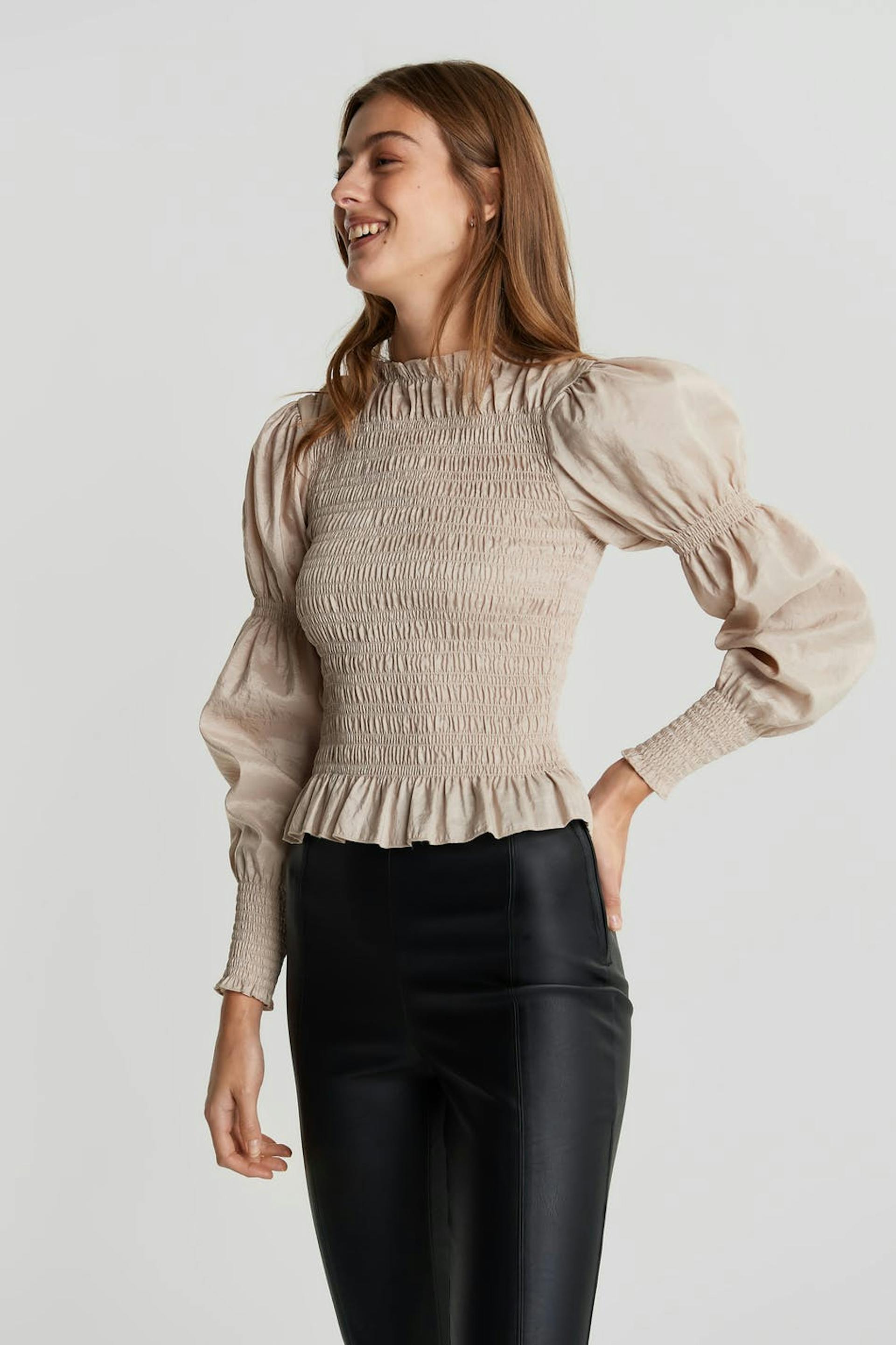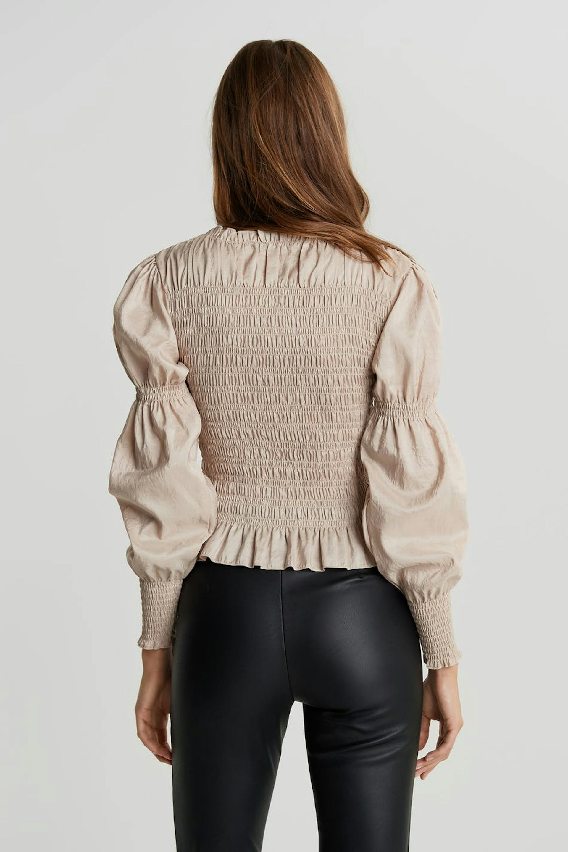Sjampagnefarget bluse med en vaffelsøm på overkroppen, på enden av ermene og på ermene. Blusen er beige og langermet og har puffermer.