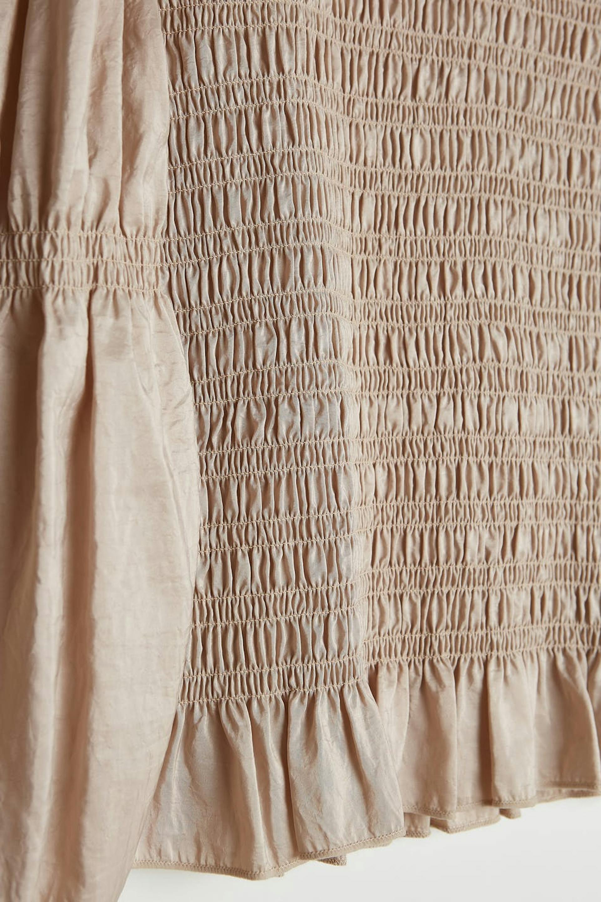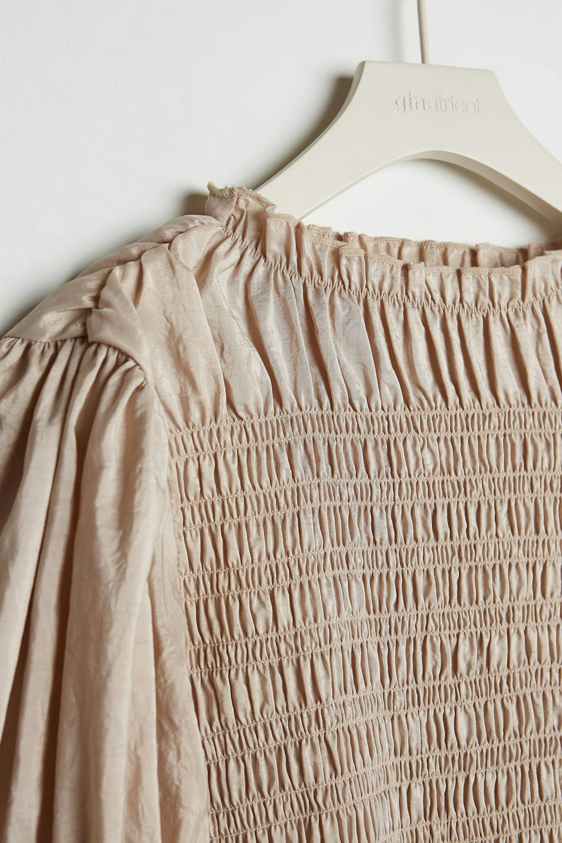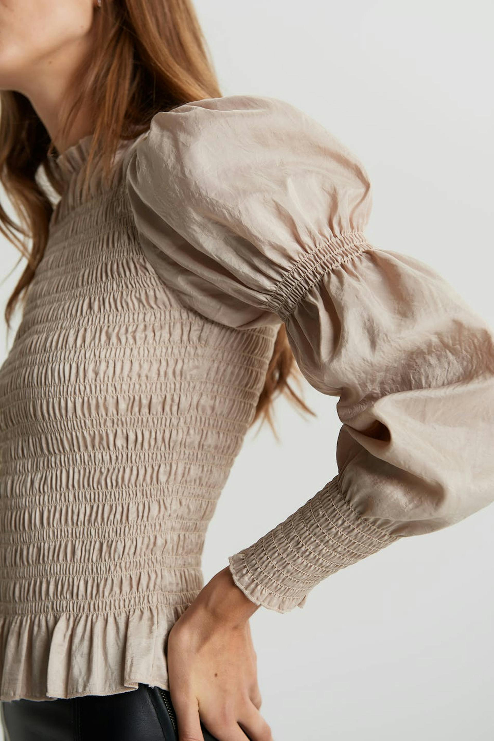 Sjampagnefarget bluse med en vaffelsøm på overkroppen, på enden av ermene og på ermene. Blusen er beige og langermet og har puffermer.