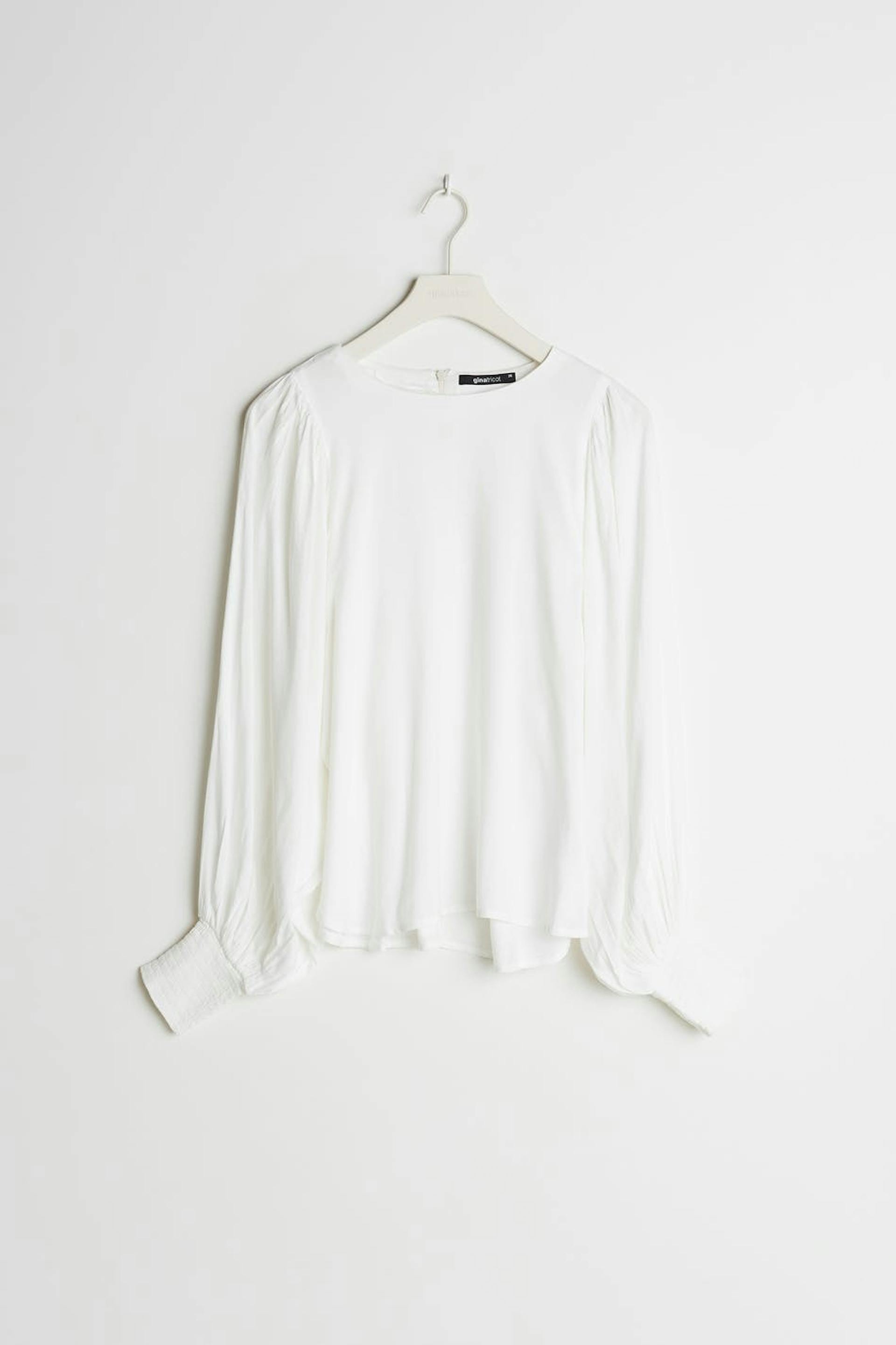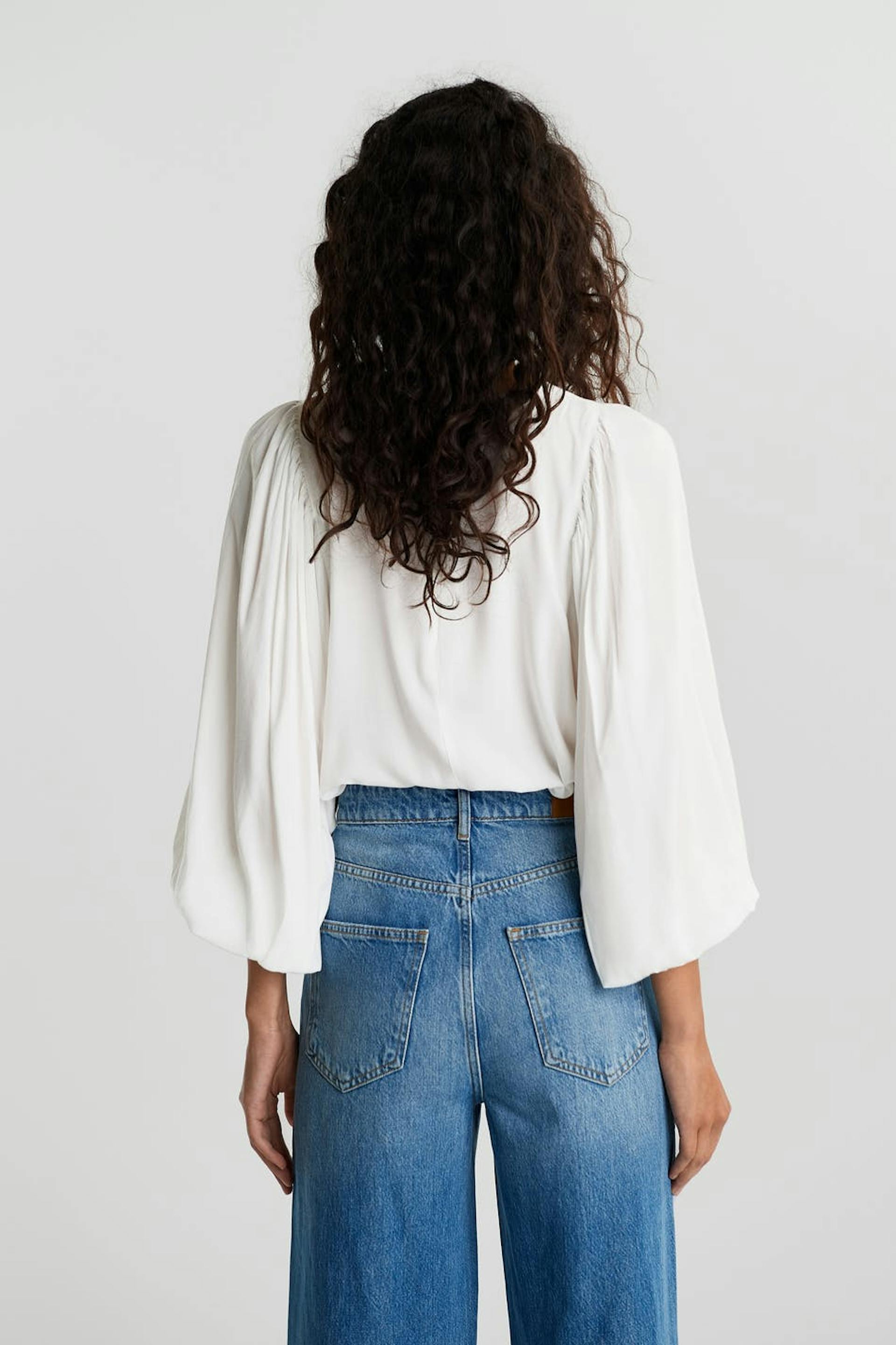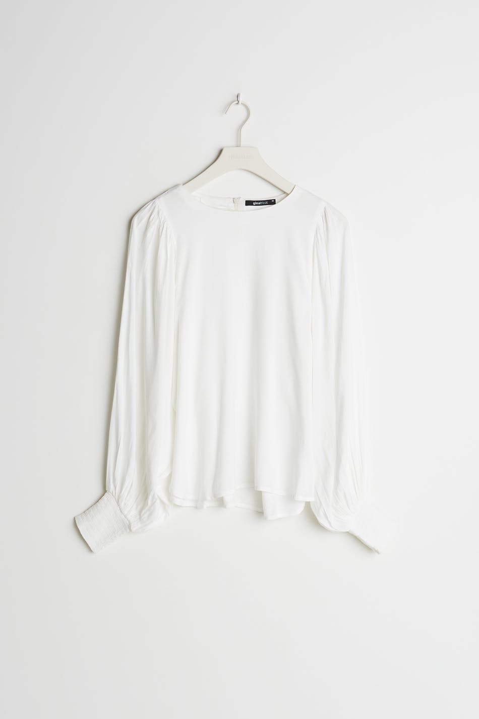 Bluse med romslige armer med rynke på toppen og elastisk stropp på enden av ermene. Blusen er hvit.