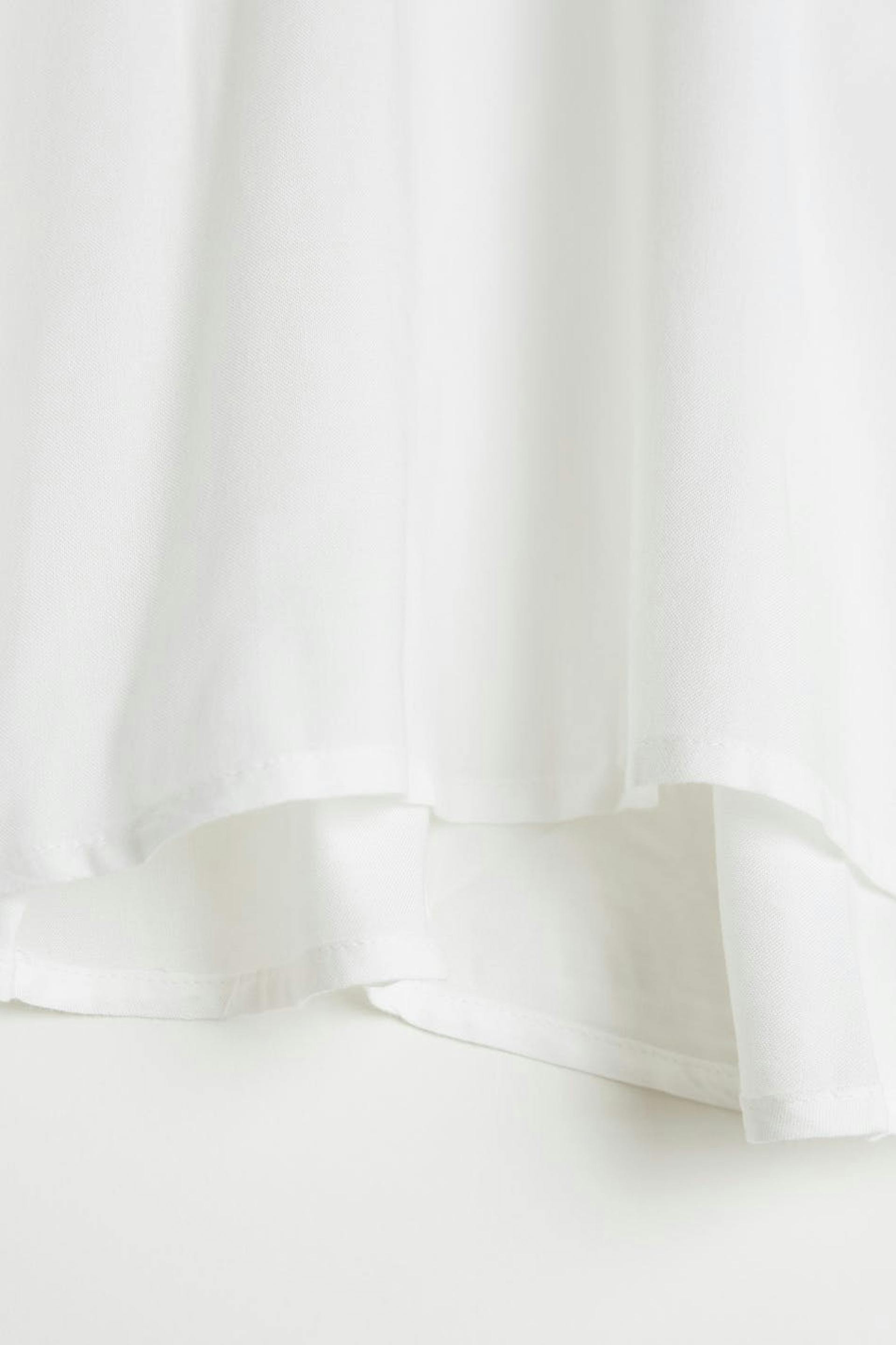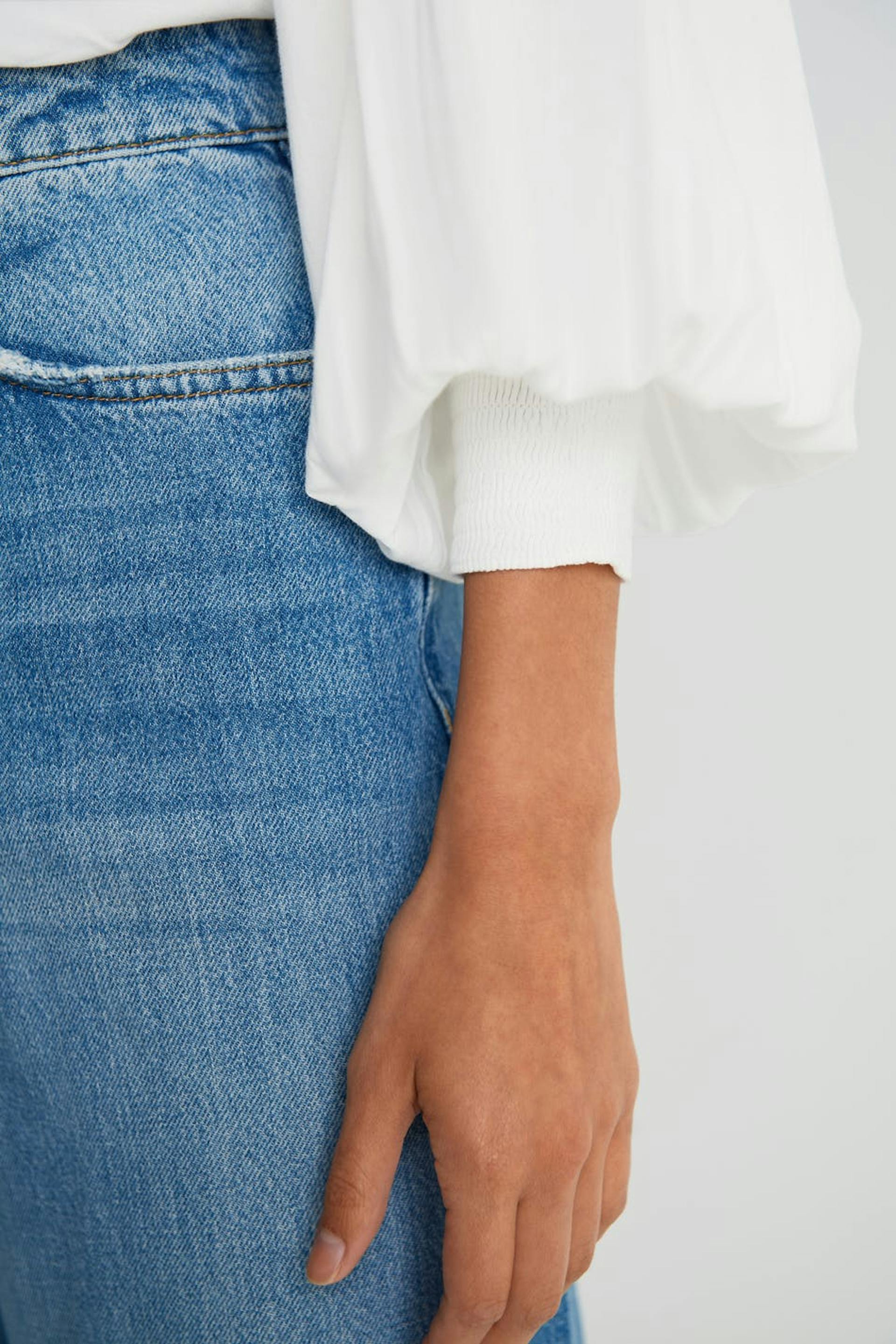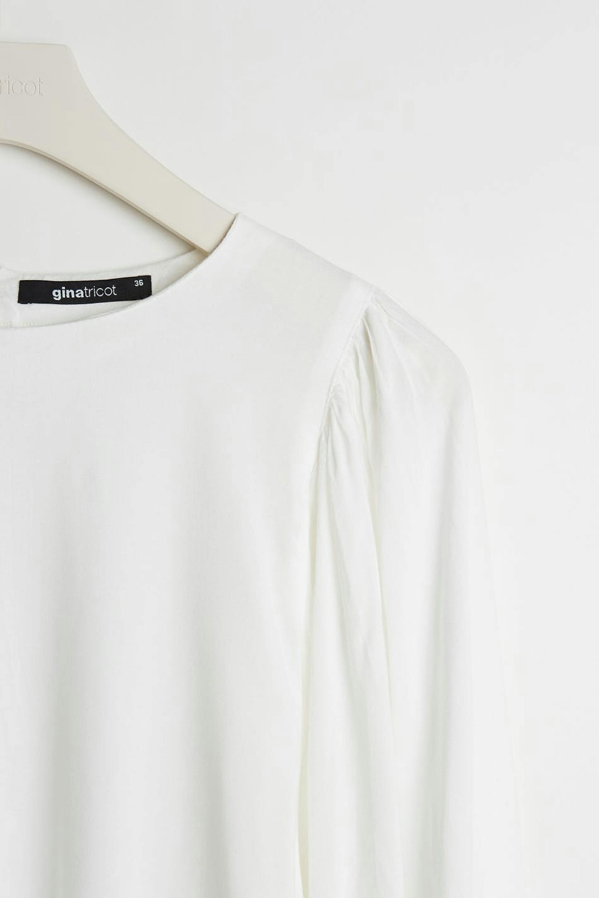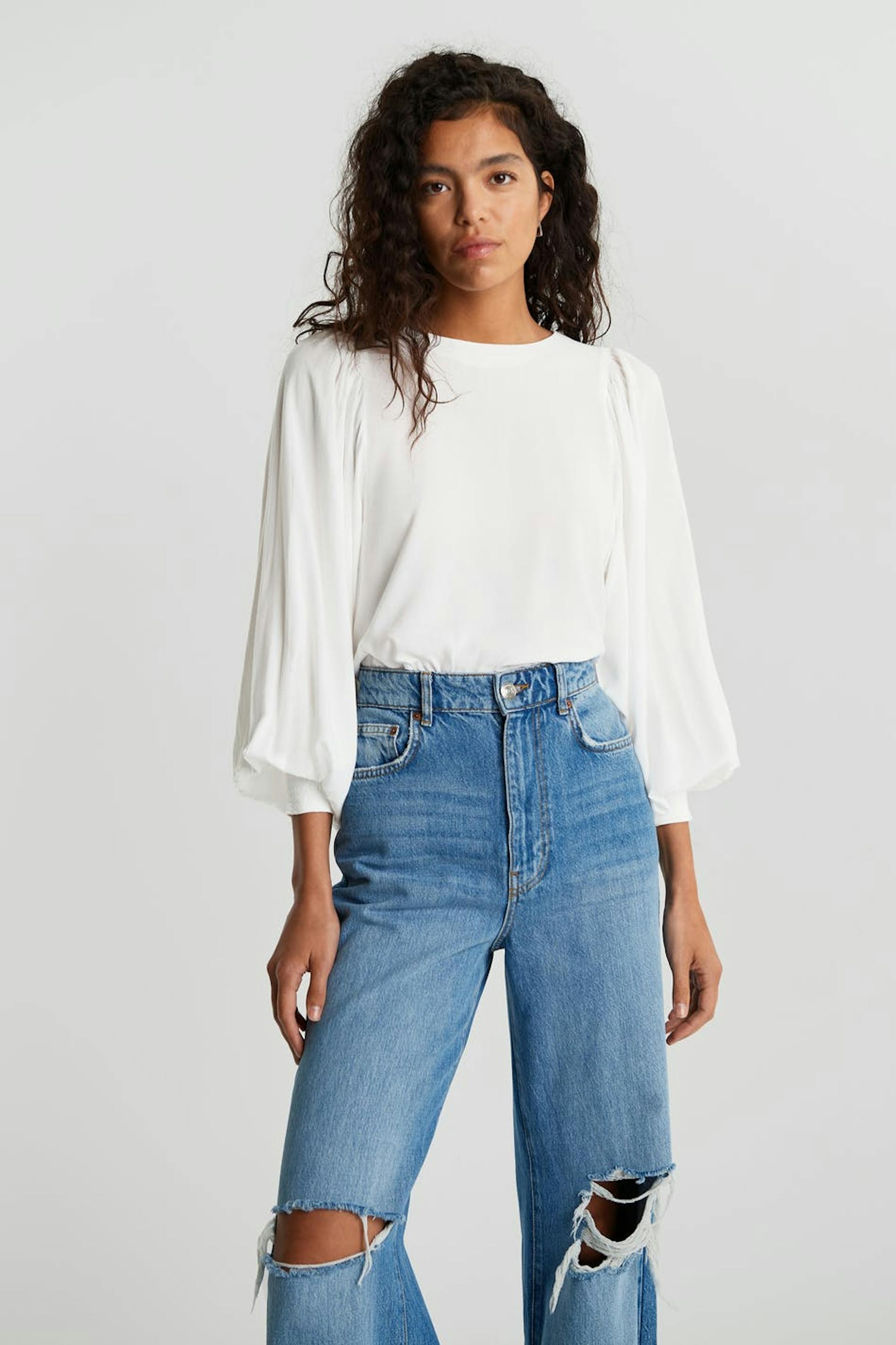Bluse med romslige armer med rynke på toppen og elastisk stropp på enden av ermene. Blusen er hvit.