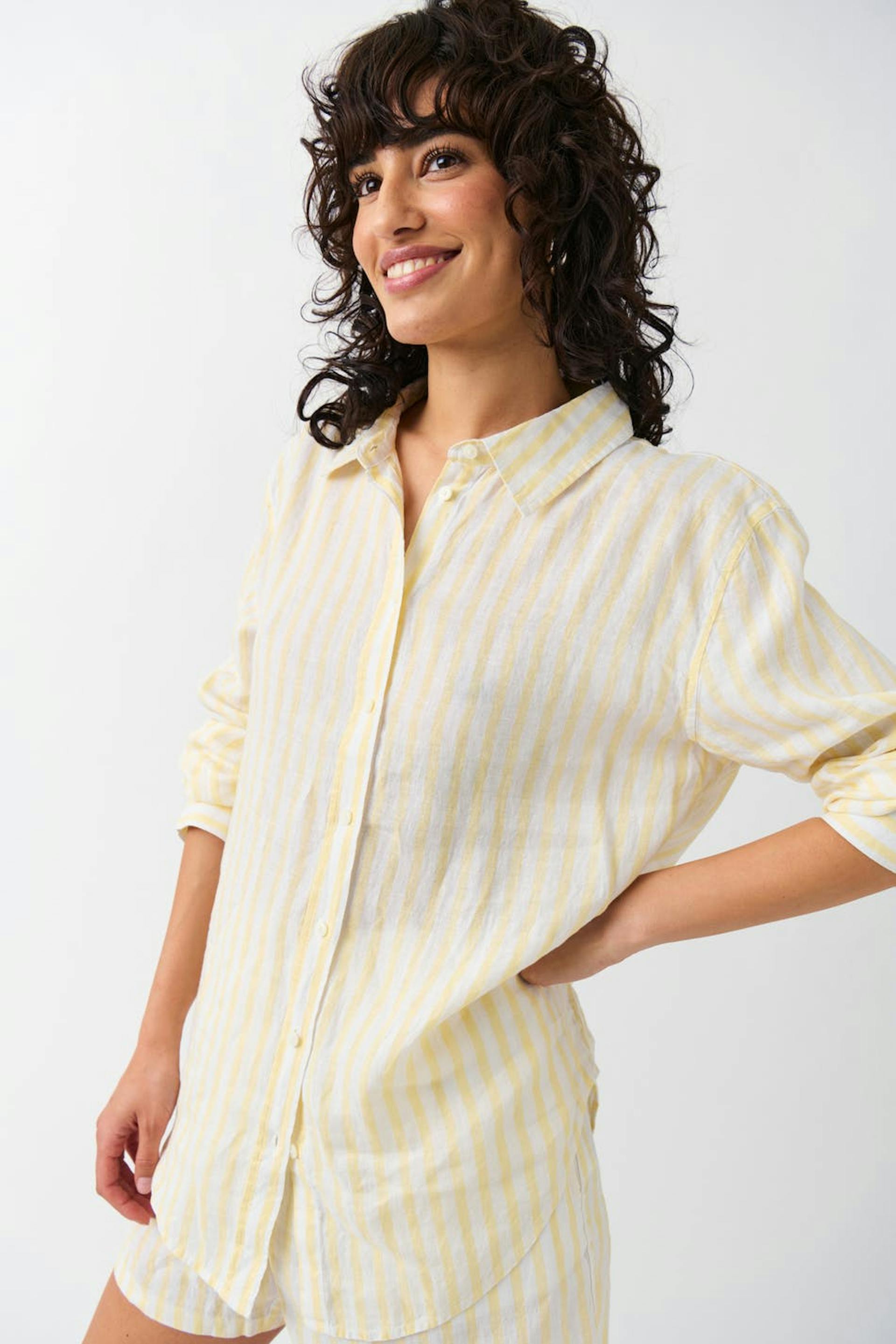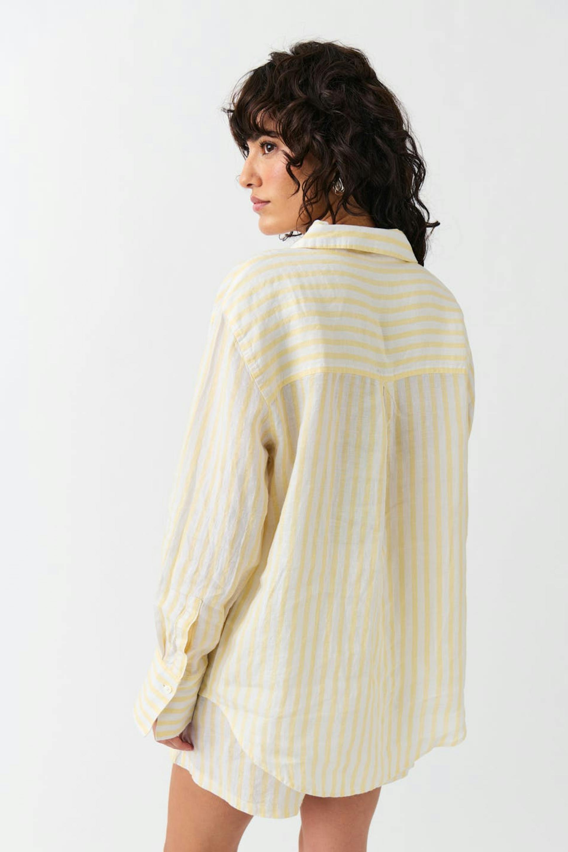 Stripete linskjorte med oversized passform. Skjorten er gul og har knapping på forsiden. Den har krage, bærestykke med folder baktil og langt erme med knapp og mansjett.