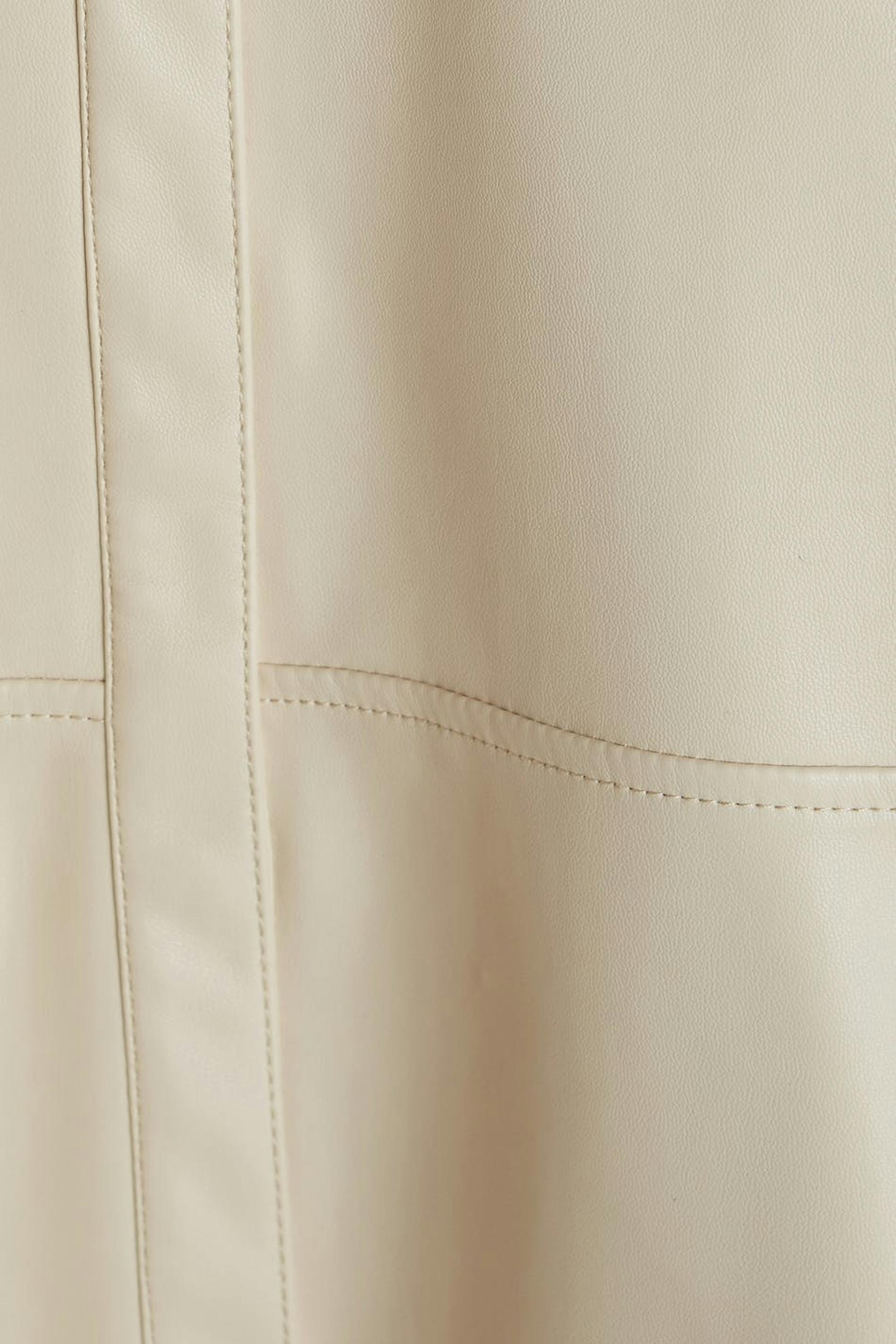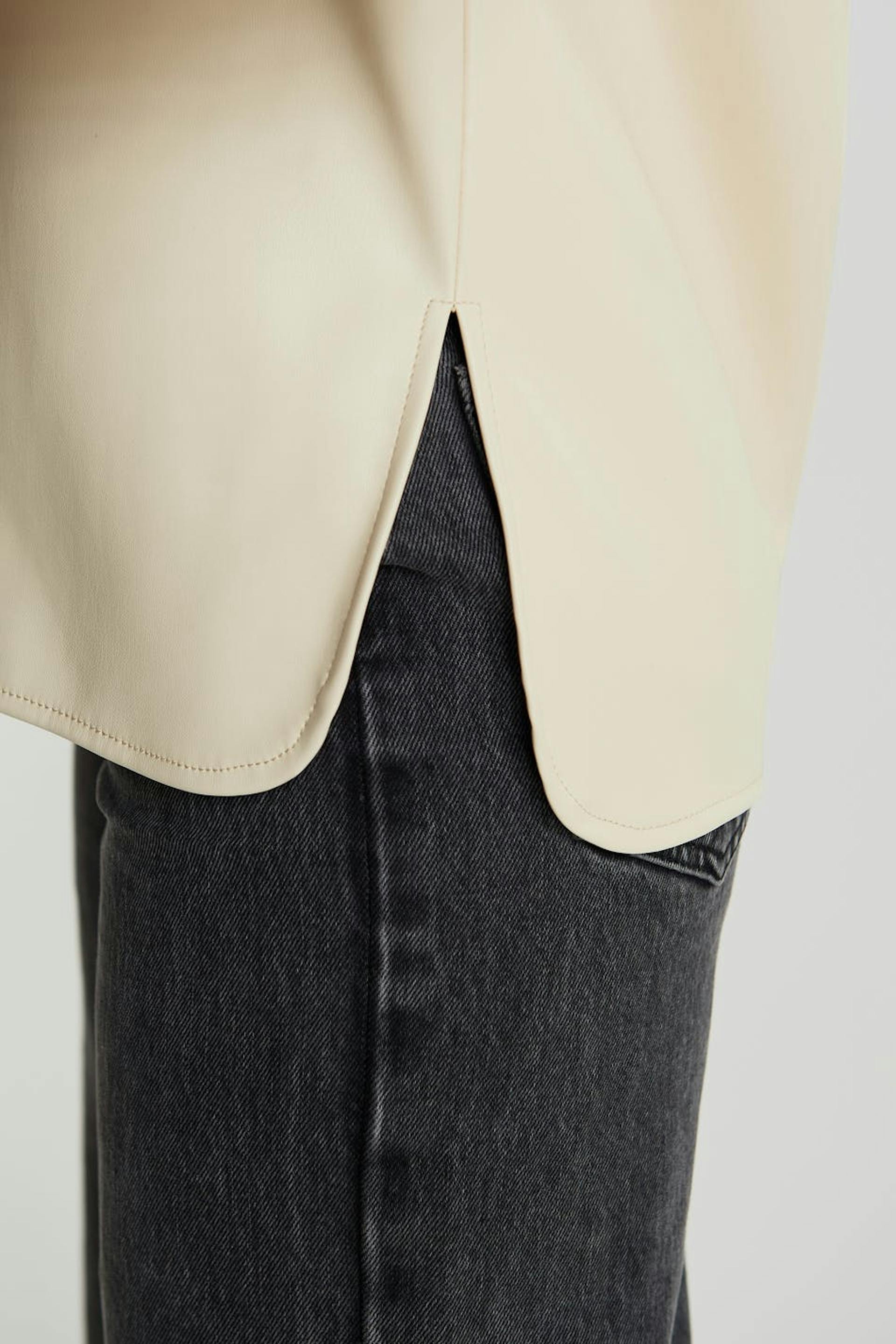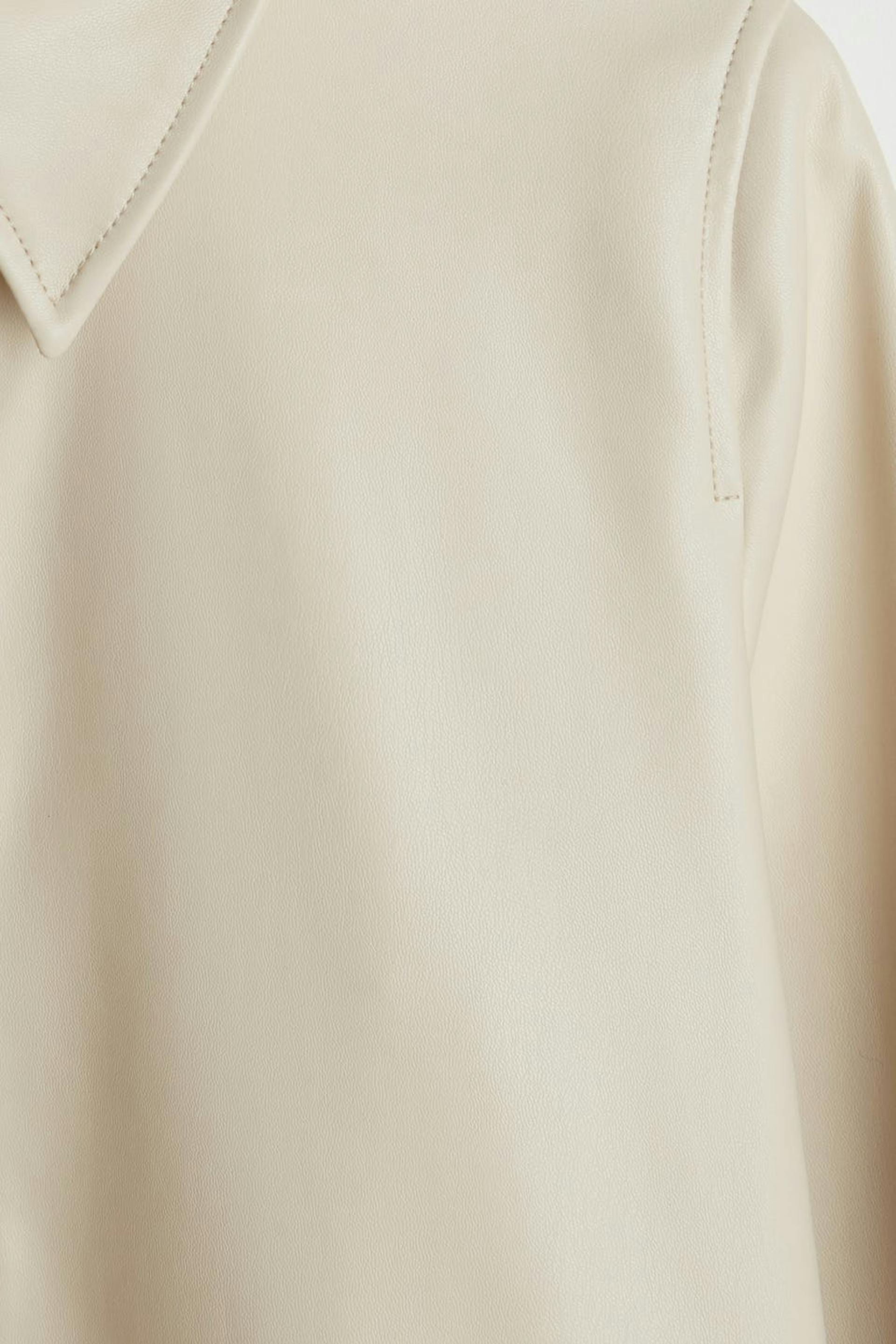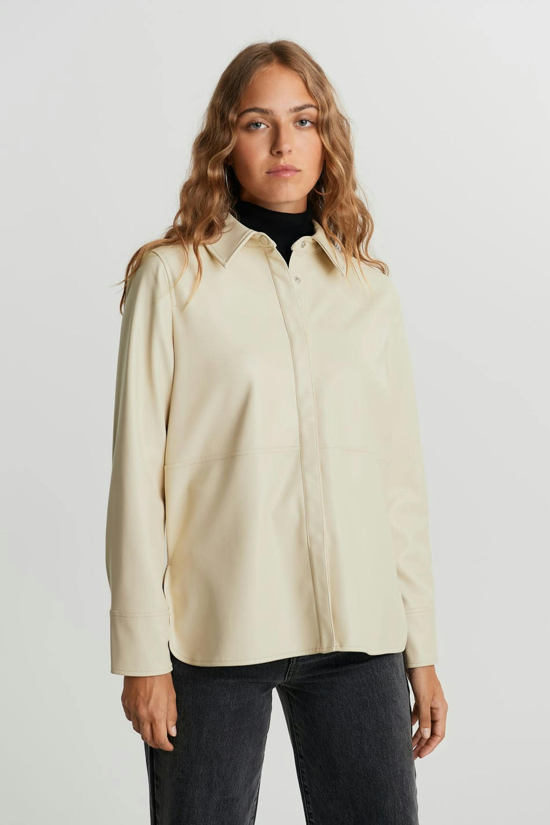Langermet skjorte med en dekorativ søm ved midjen. Skjorten er beige og har skjulte trykknapper. Den er laget av PU.