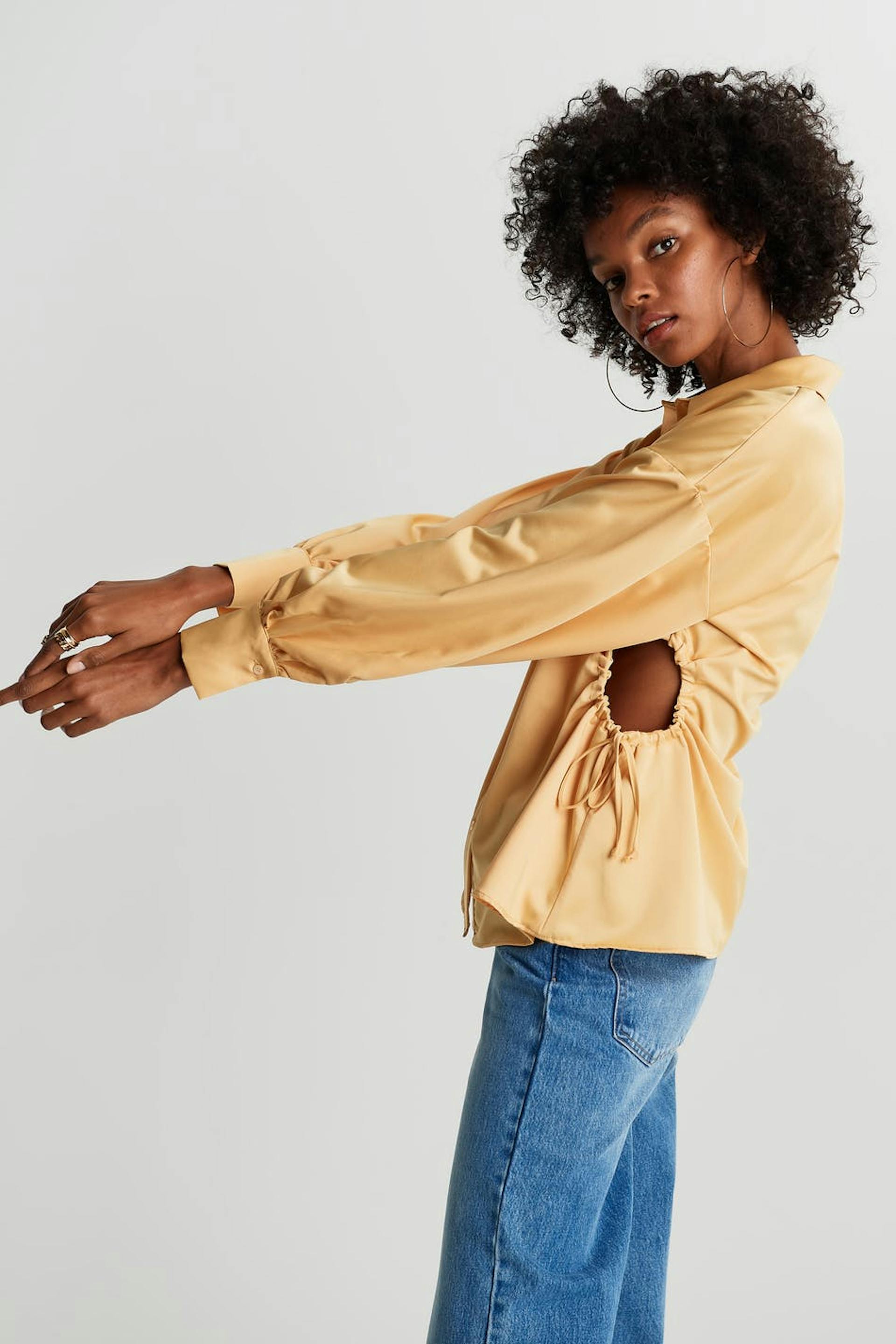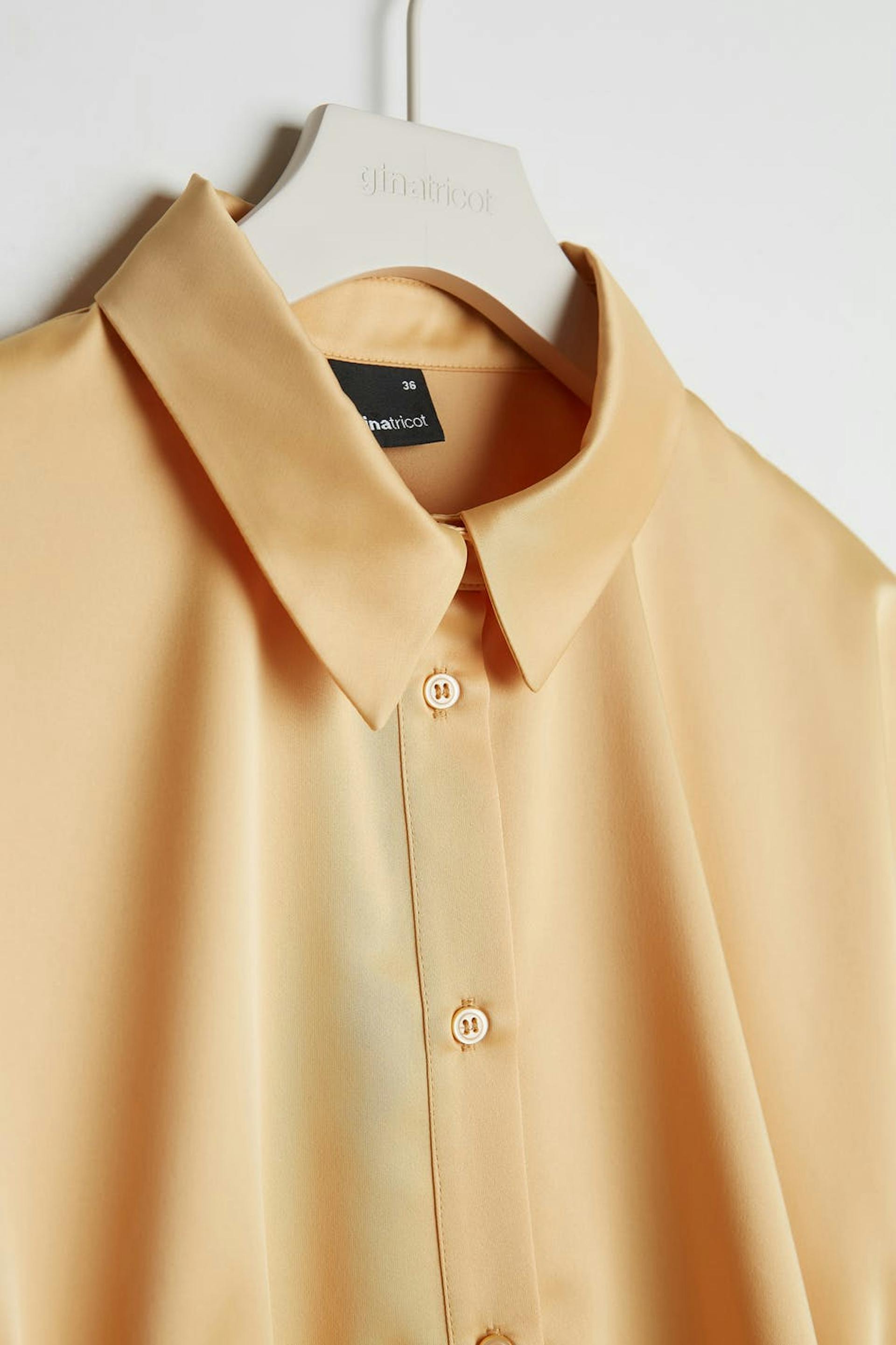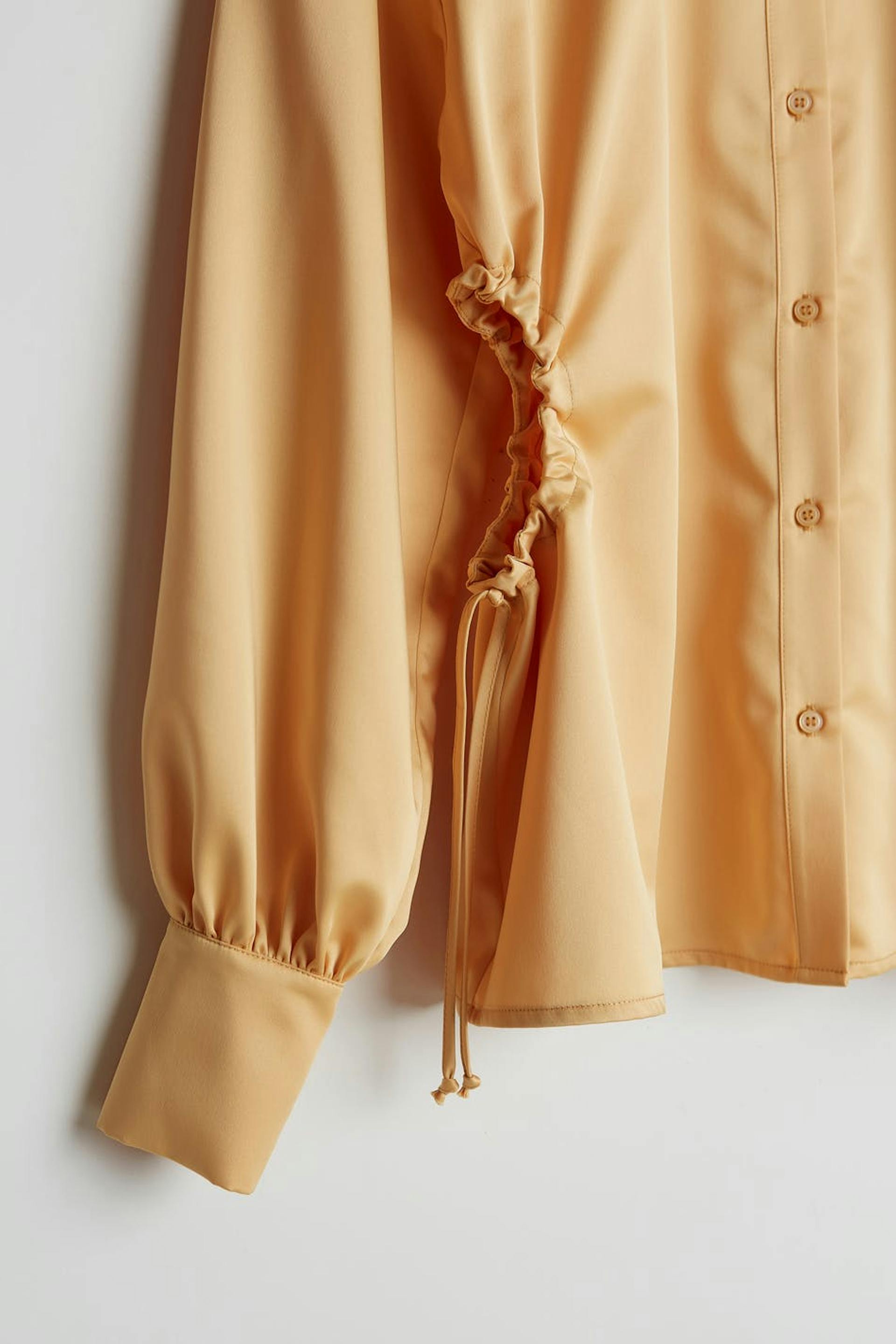 Skjorte med en rynket detalj ved midjen med en snøring med en knytbar stropp og et utsnittet. Skjorten er gul. Den er laget av sateng.