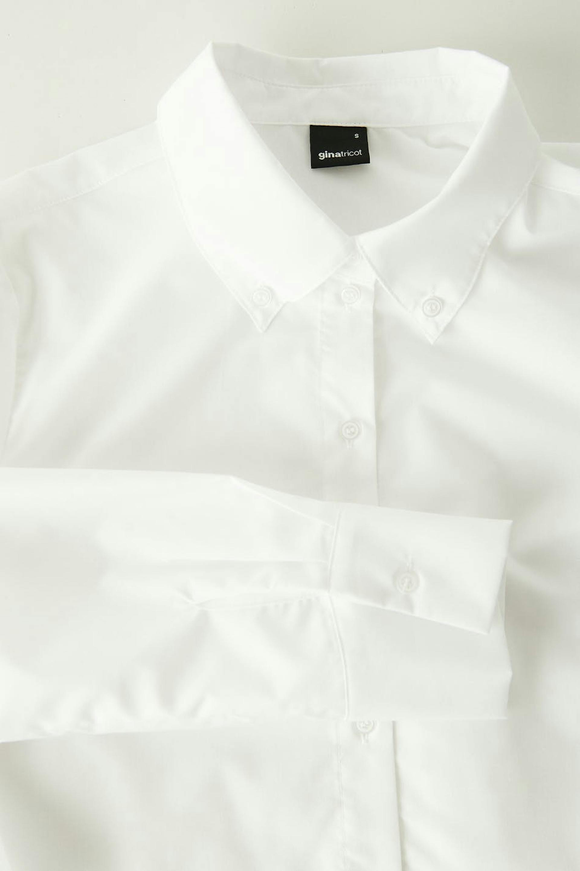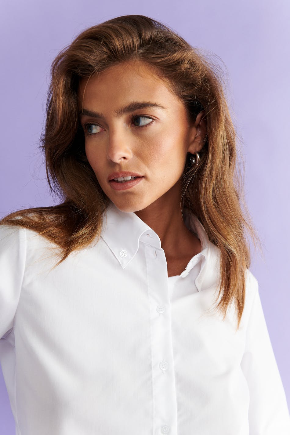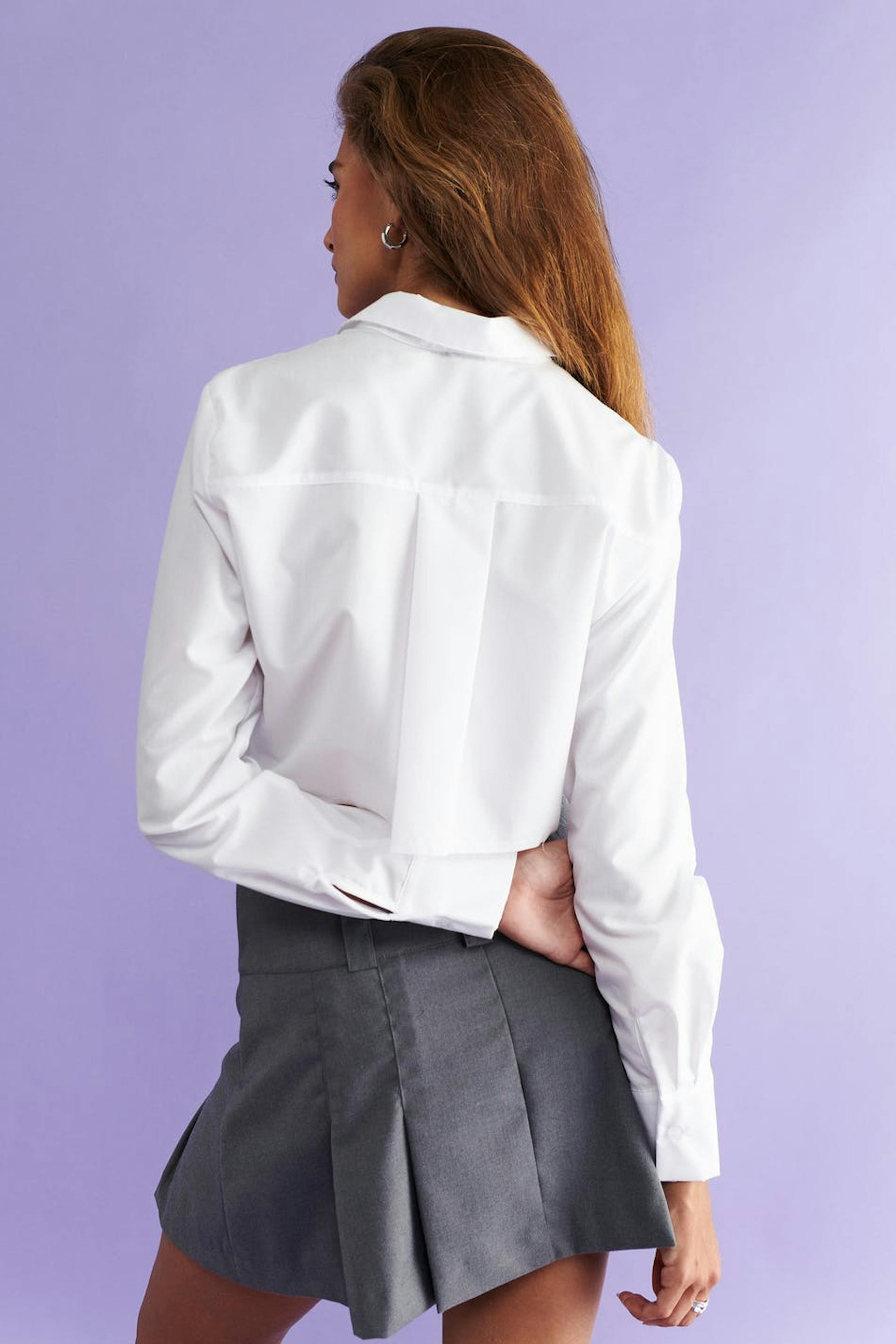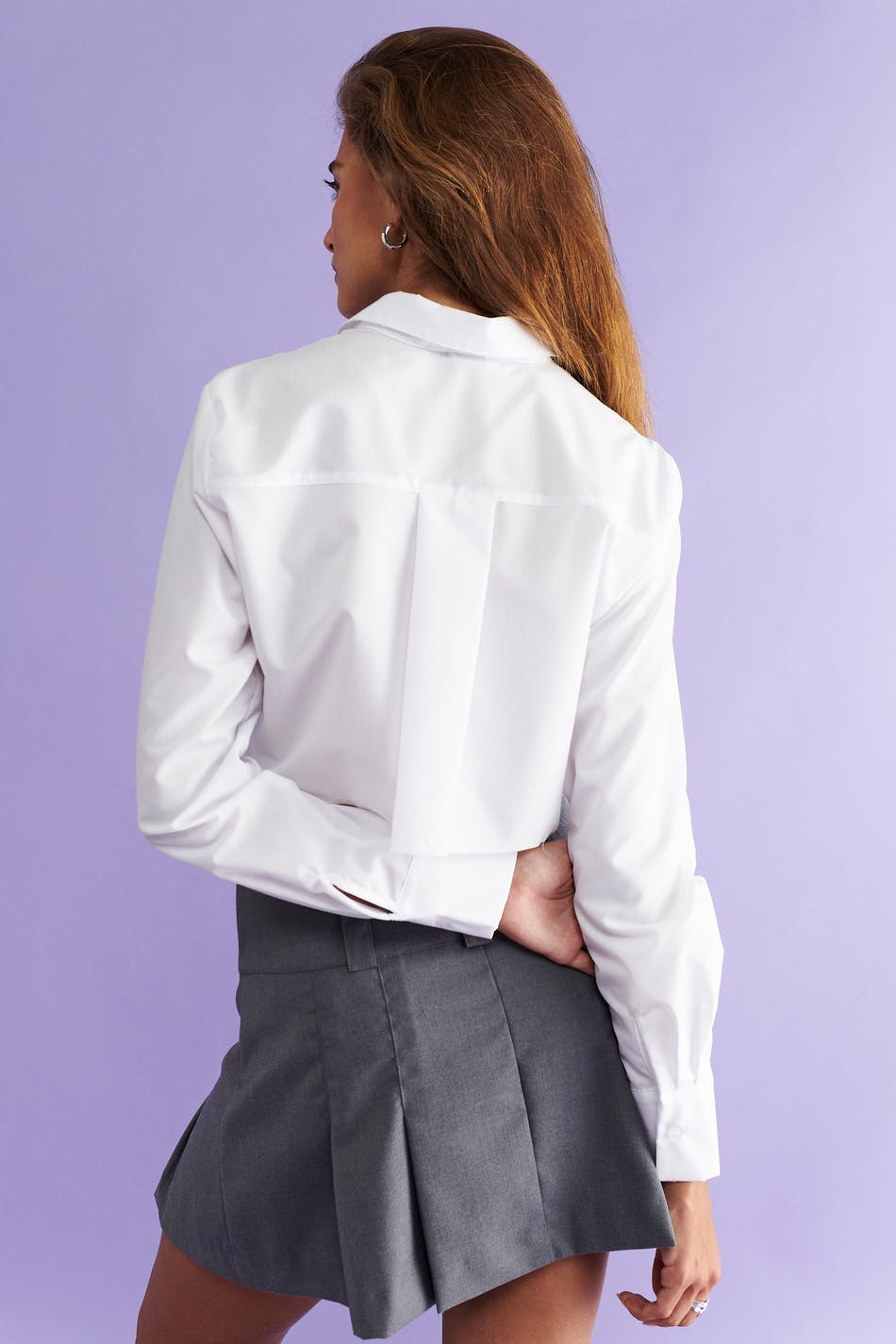 Avkortet skjorte i poplin med rå kant på bunnen. Skjorten er hvit og har avslappet passform. Den har krage og knappstolpe foran.