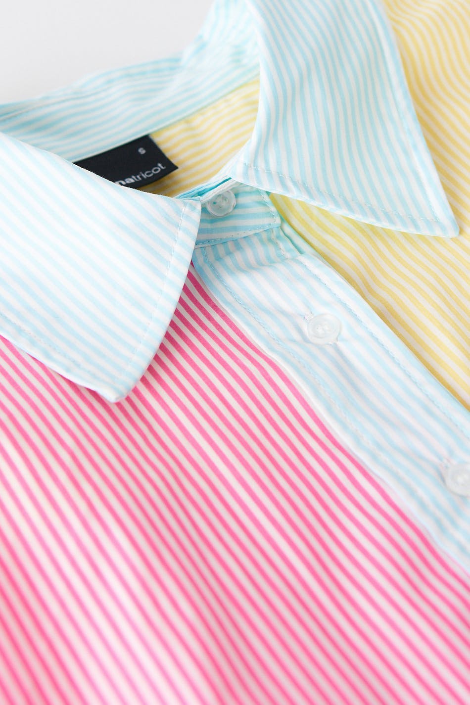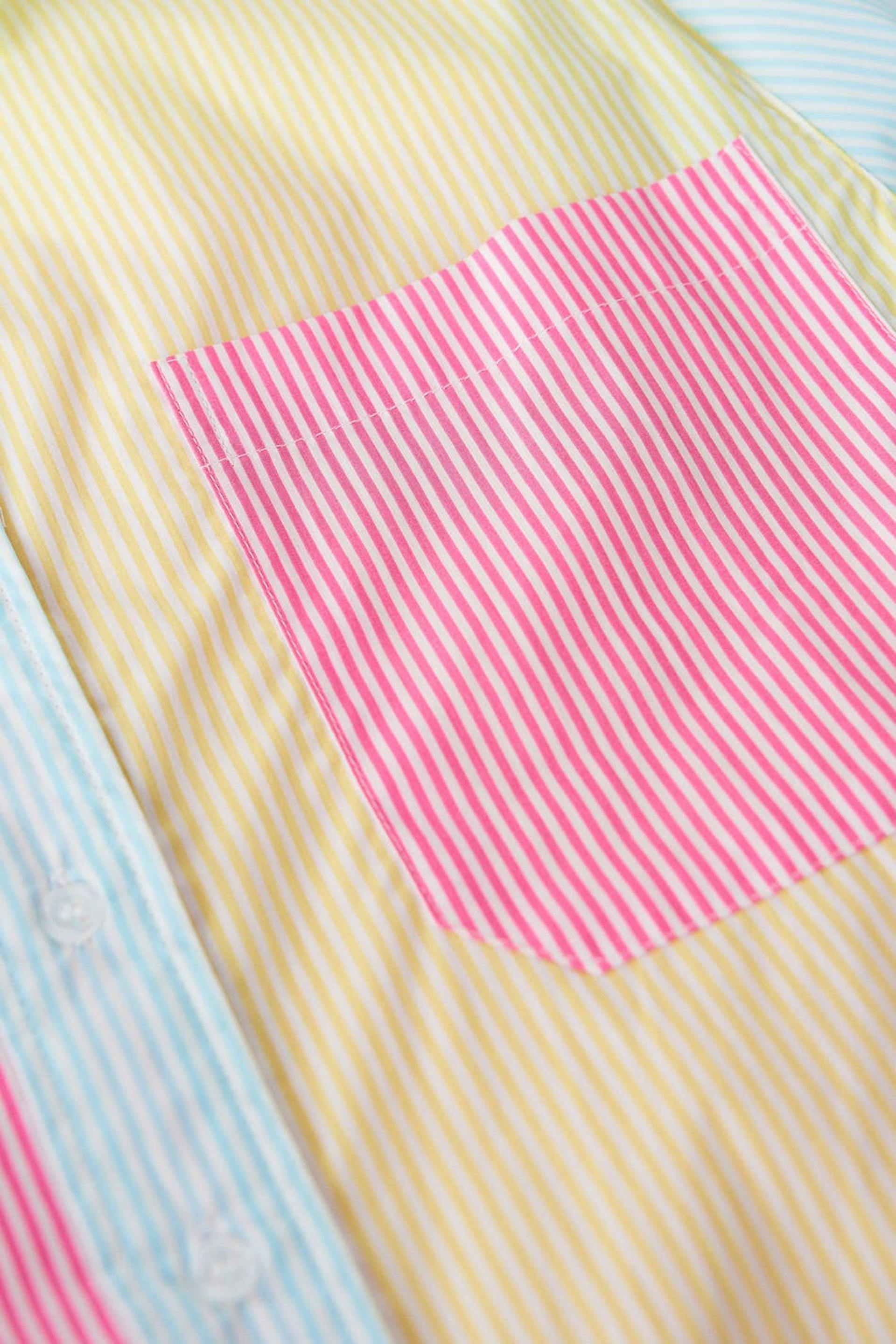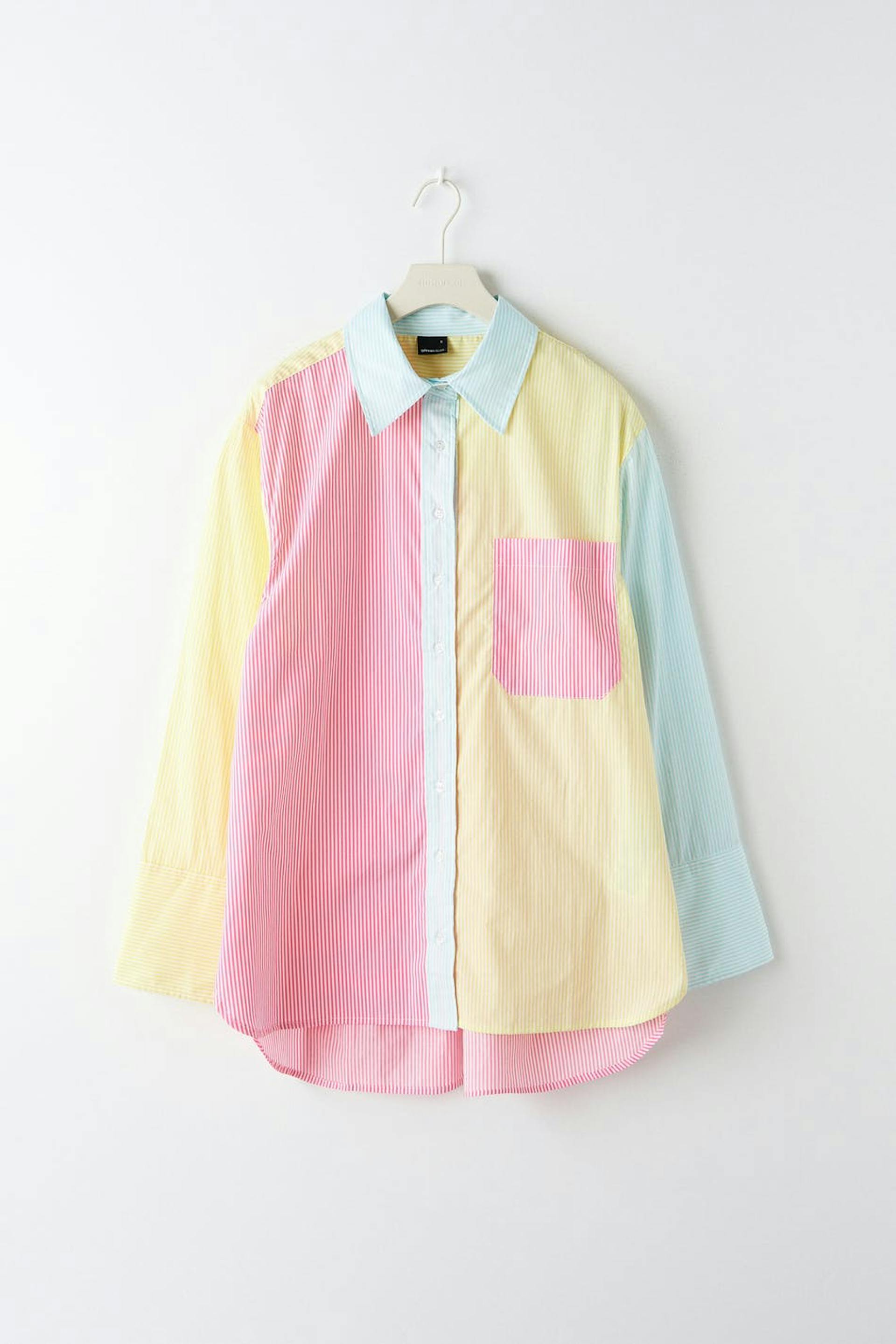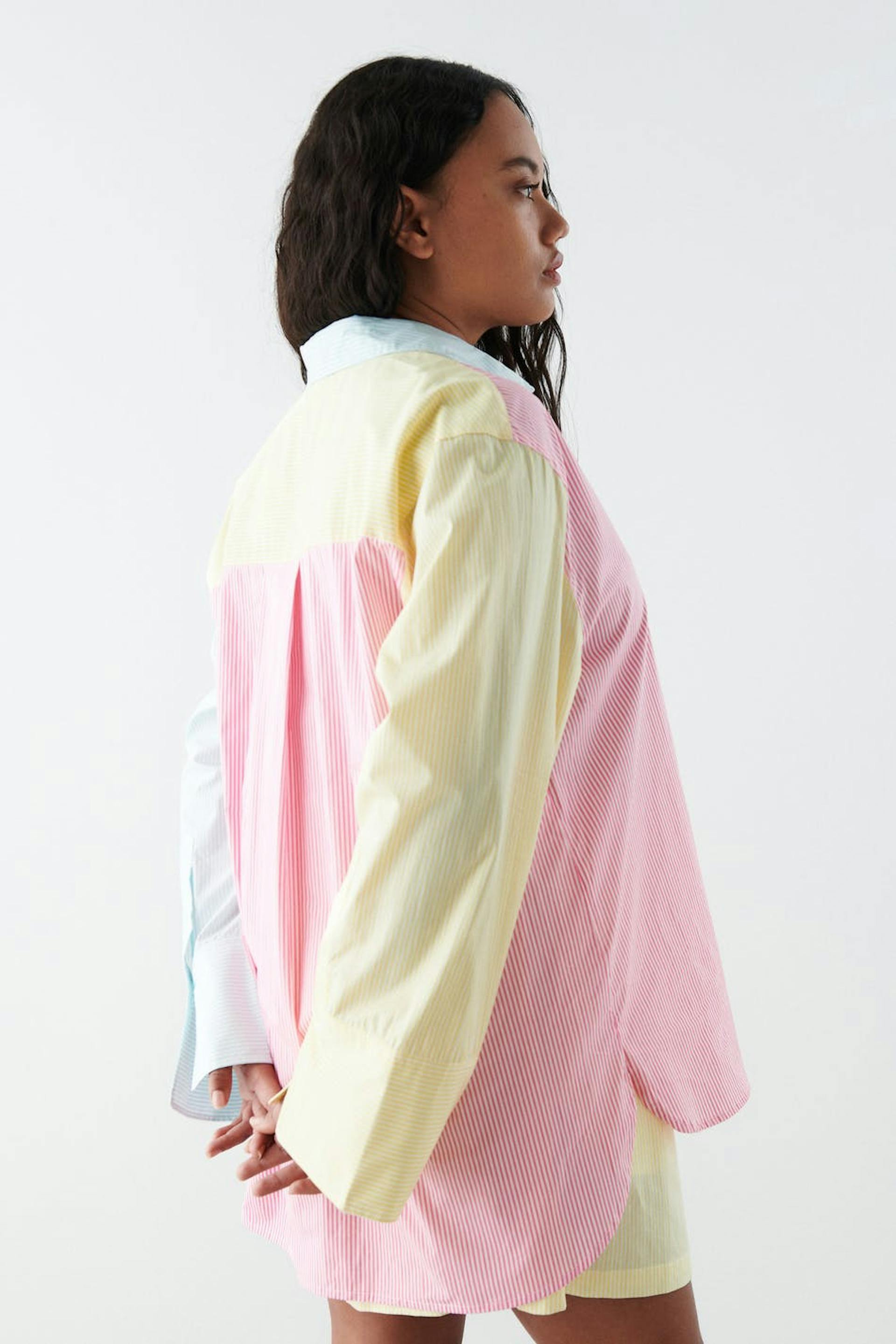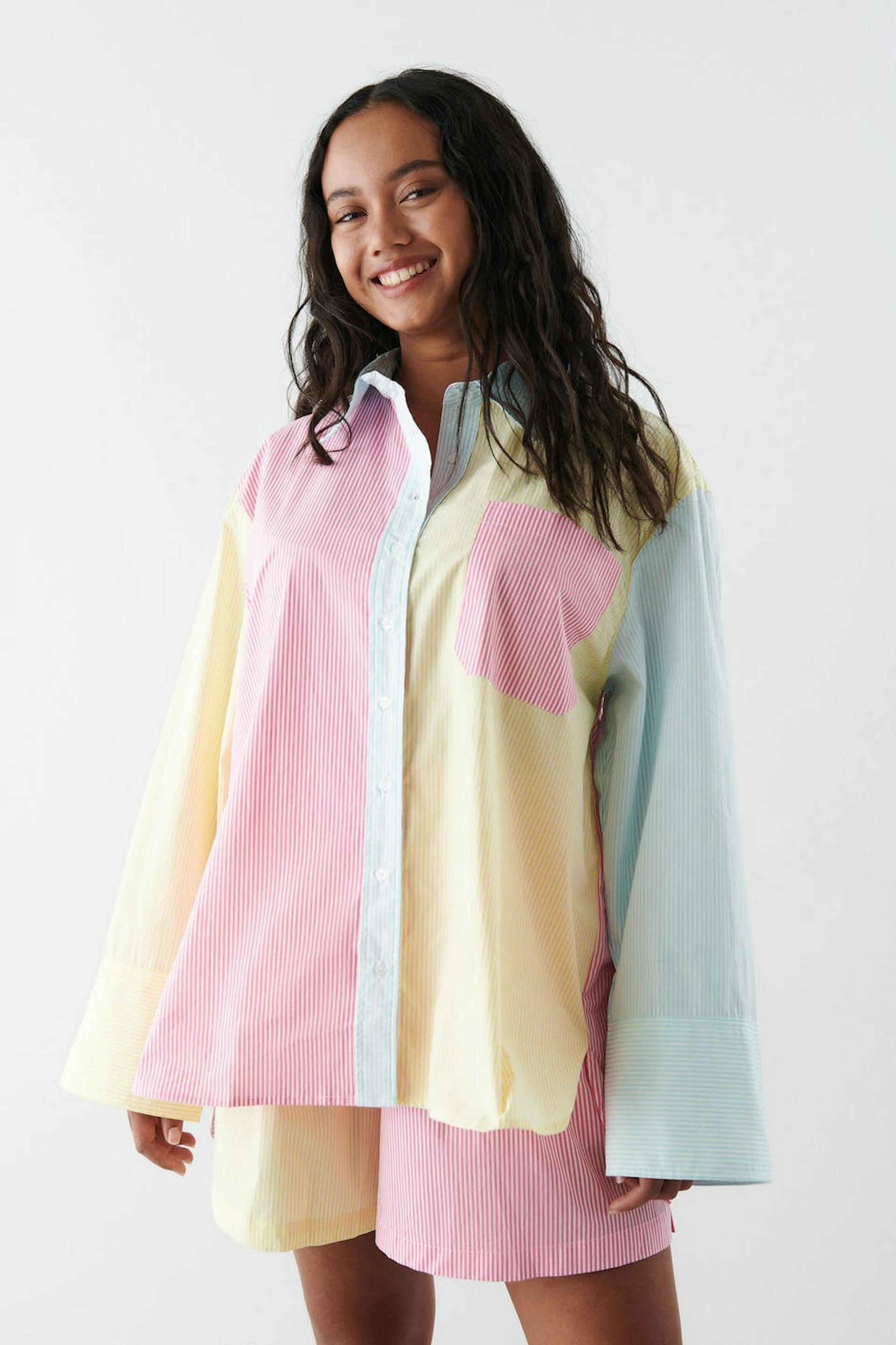 Stripete poplinskjorte med avslappet passform. Skjorten er gul, rosa og oversized. Den har en vevet bomullskvalitet, en brystlomme, brede mansjetter og ventilasjon i sidene.