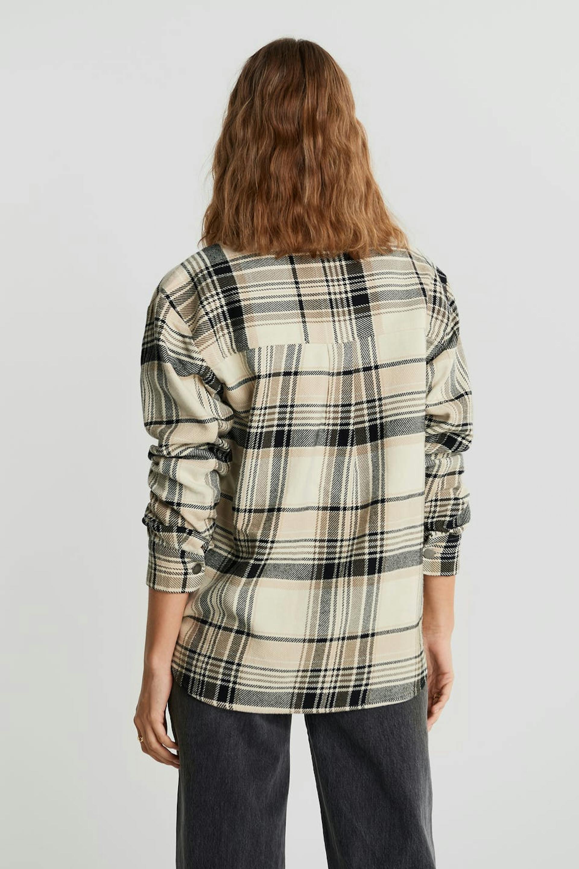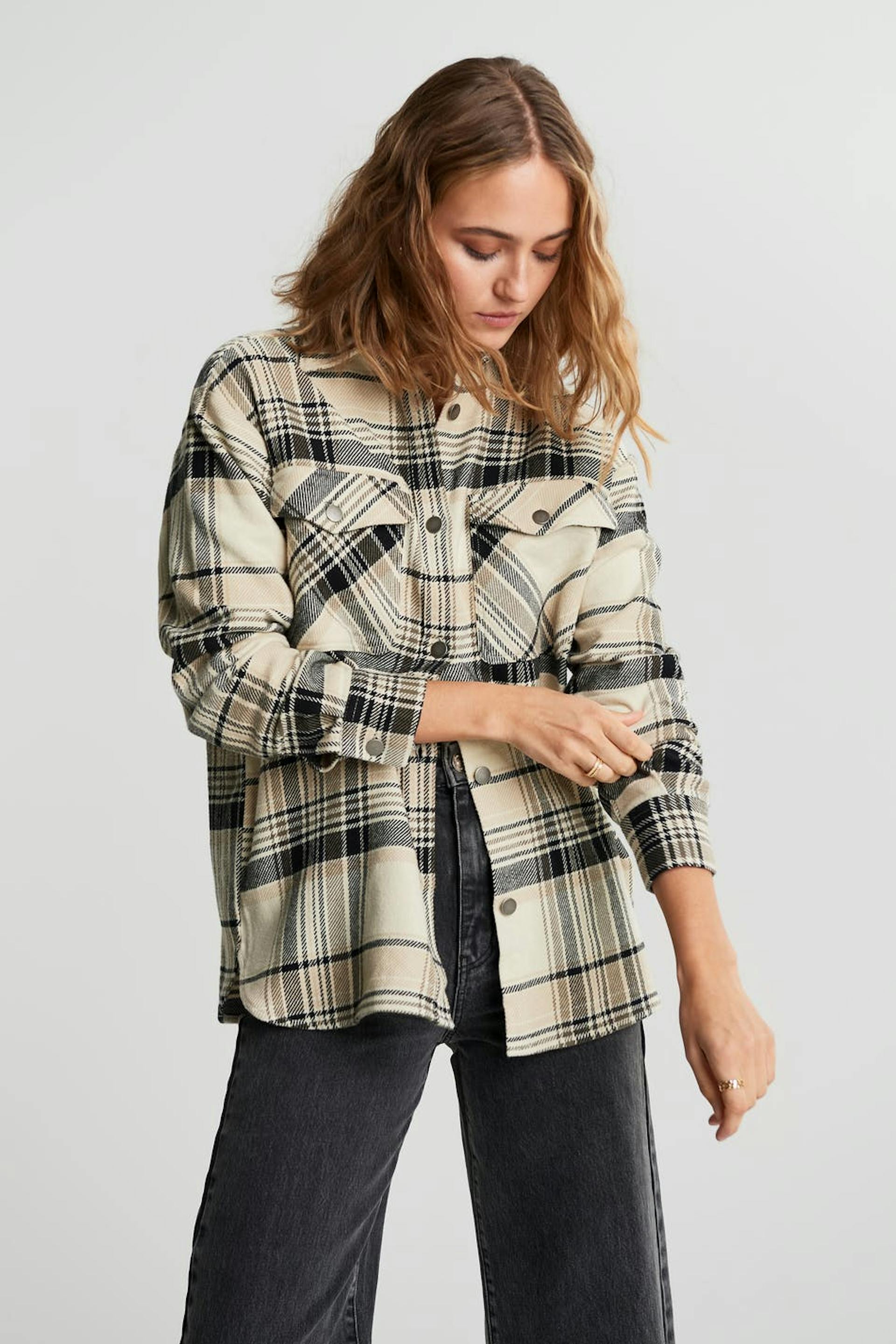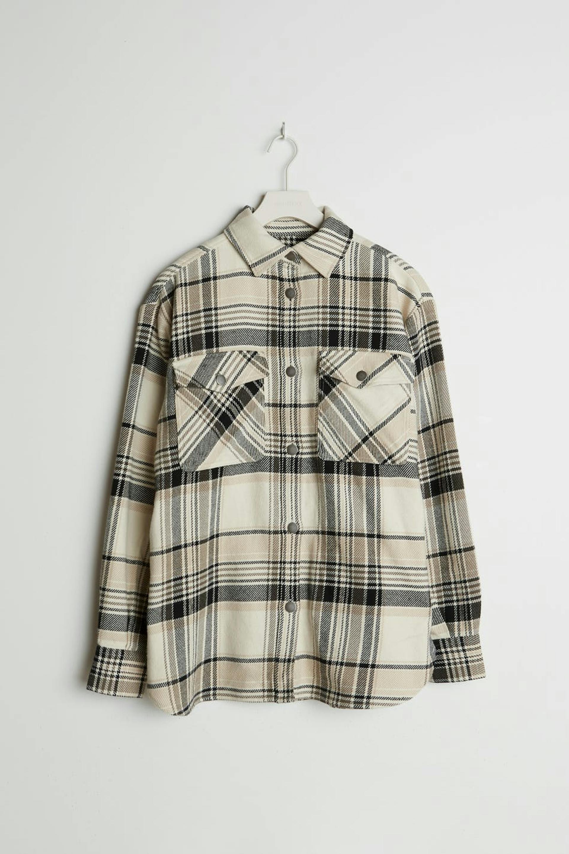 Rutete skjorte med brystlommer. Skjorten er beige, svart og langermet. Den er laget av flanell og har en krage, mansjetter og en knapp foran og på lommene.