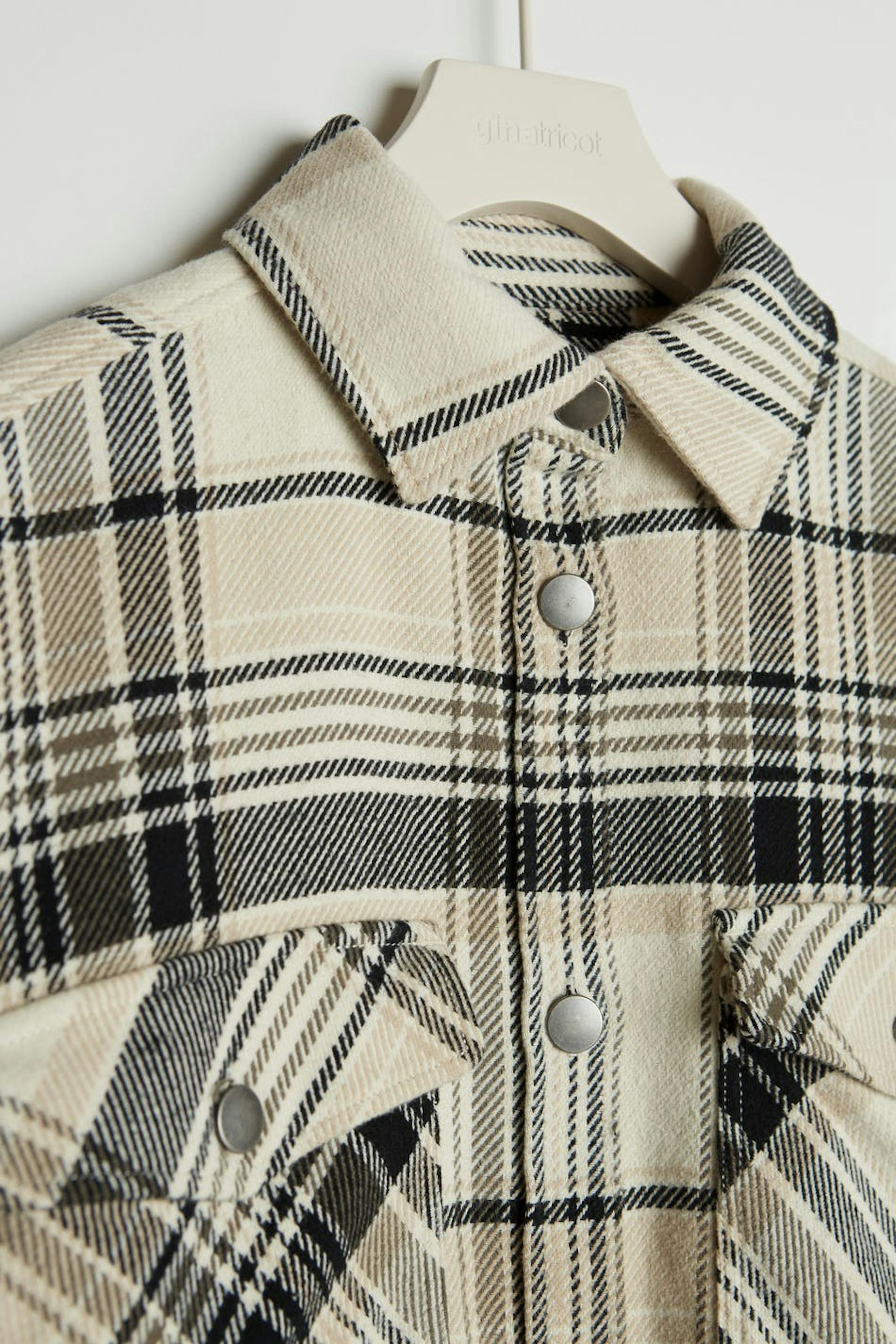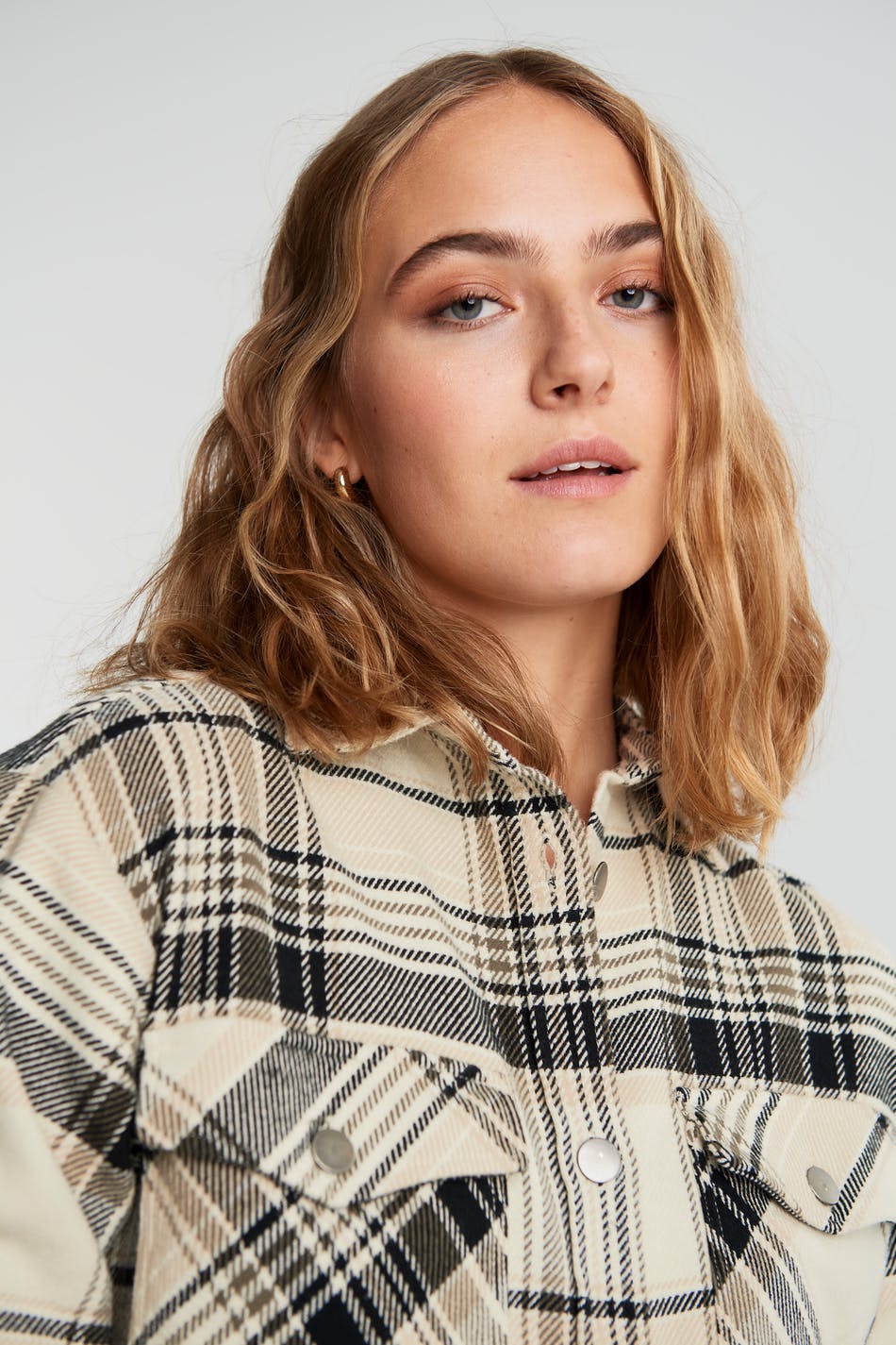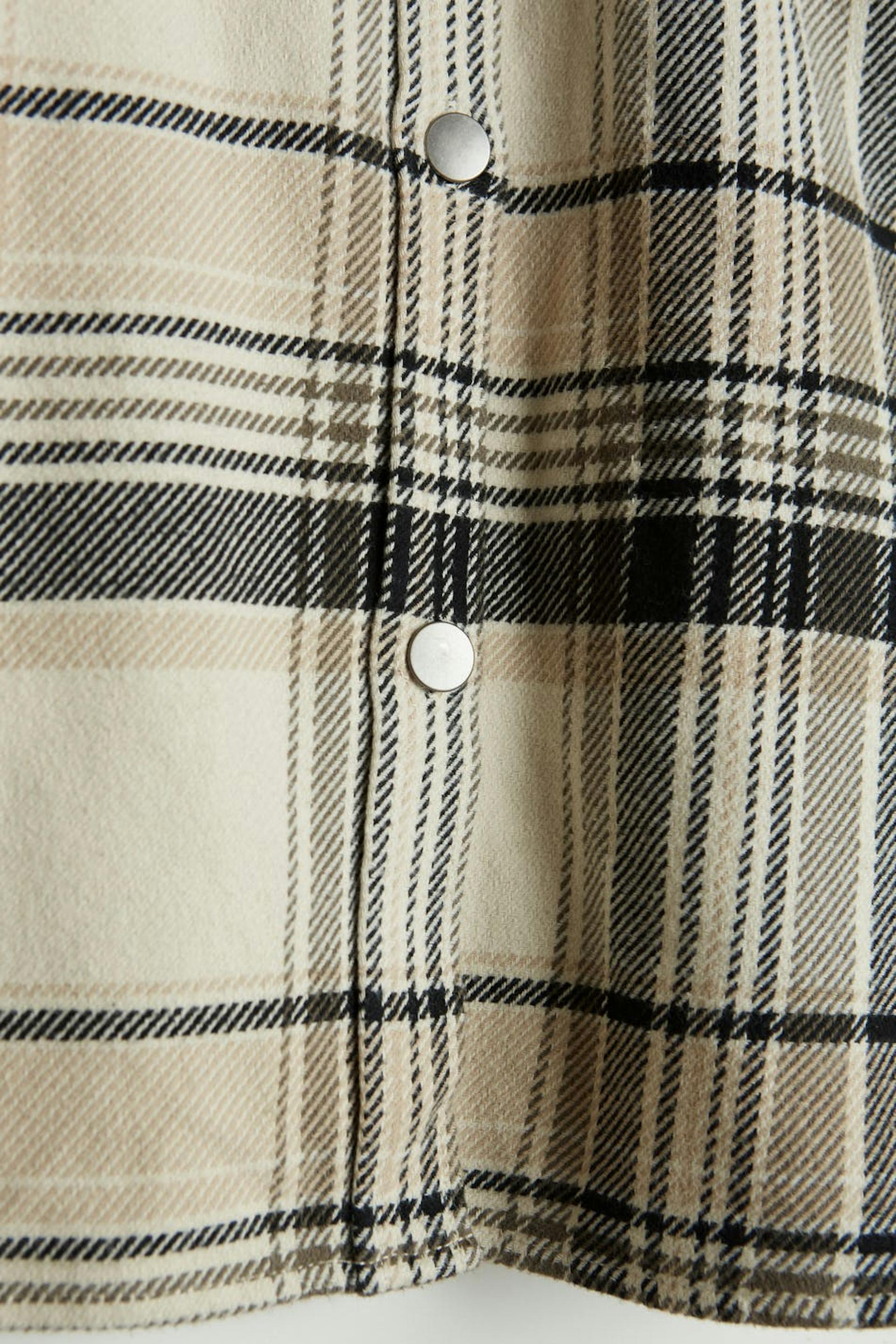 Rutete skjorte med brystlommer. Skjorten er beige, svart og langermet. Den er laget av flanell og har en krage, mansjetter og en knapp foran og på lommene.
