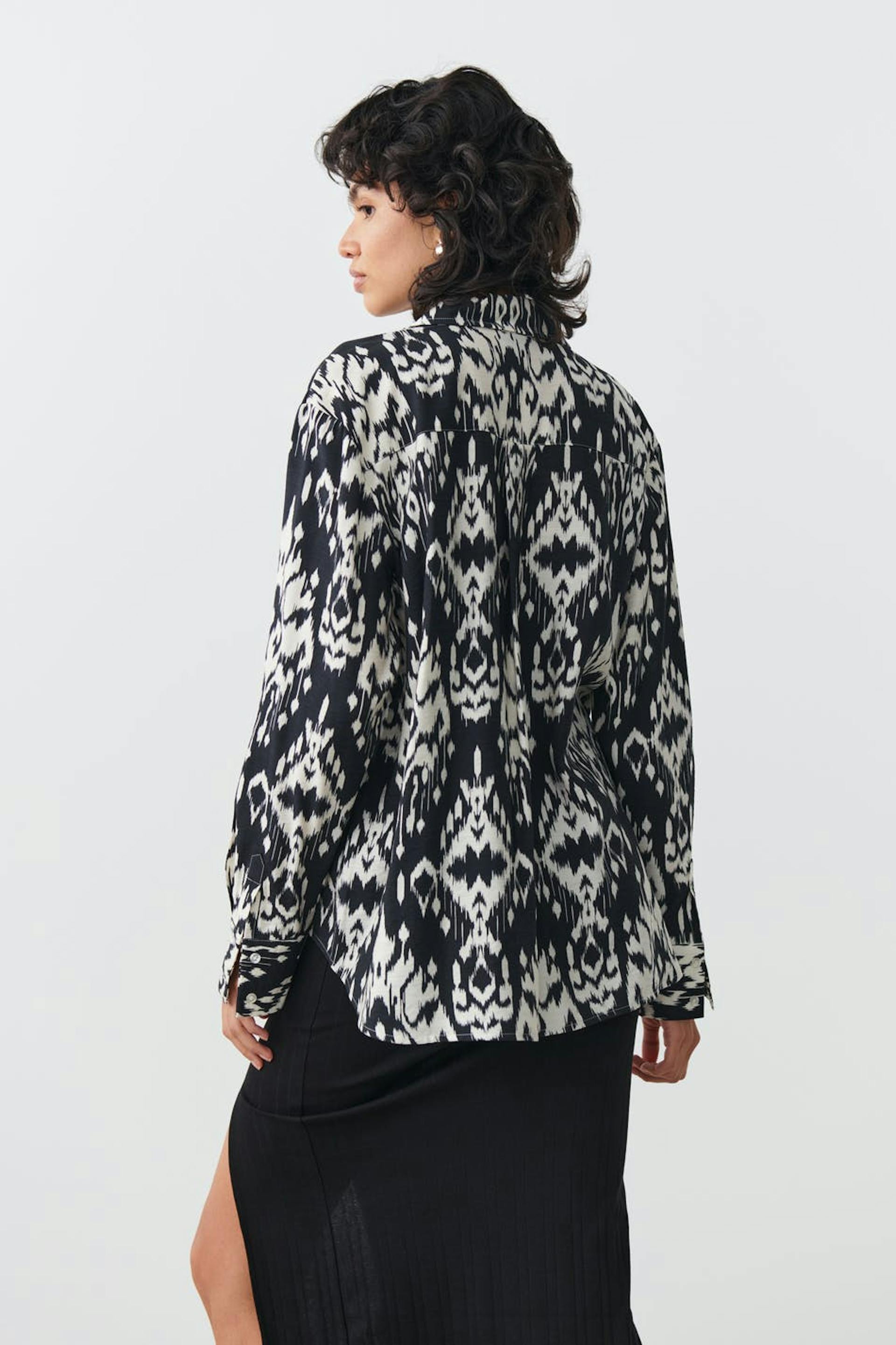 Mønstret skjorte med knapper på forsiden og på enden av ermene. Skjorten er svart, hvit og oversized. Den har langt erme og en brystlomme.