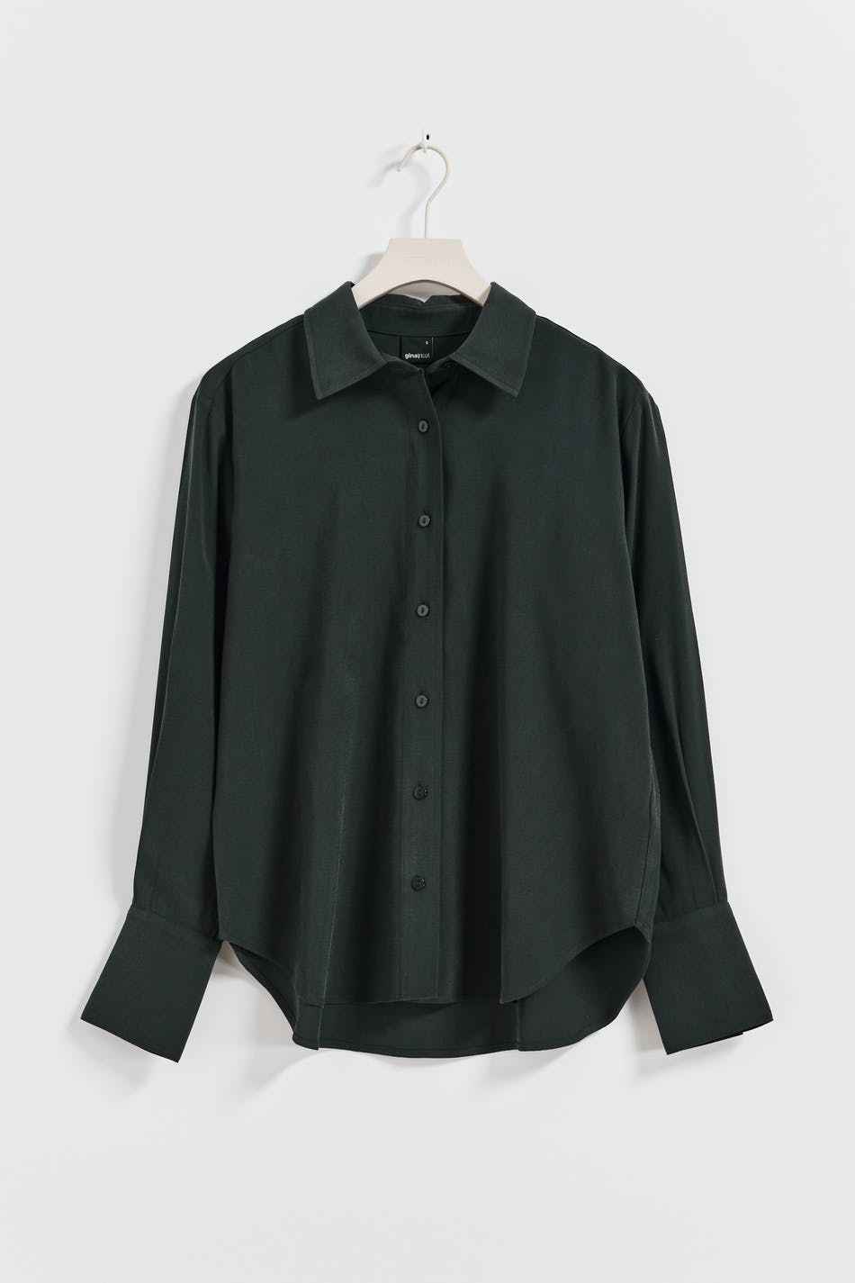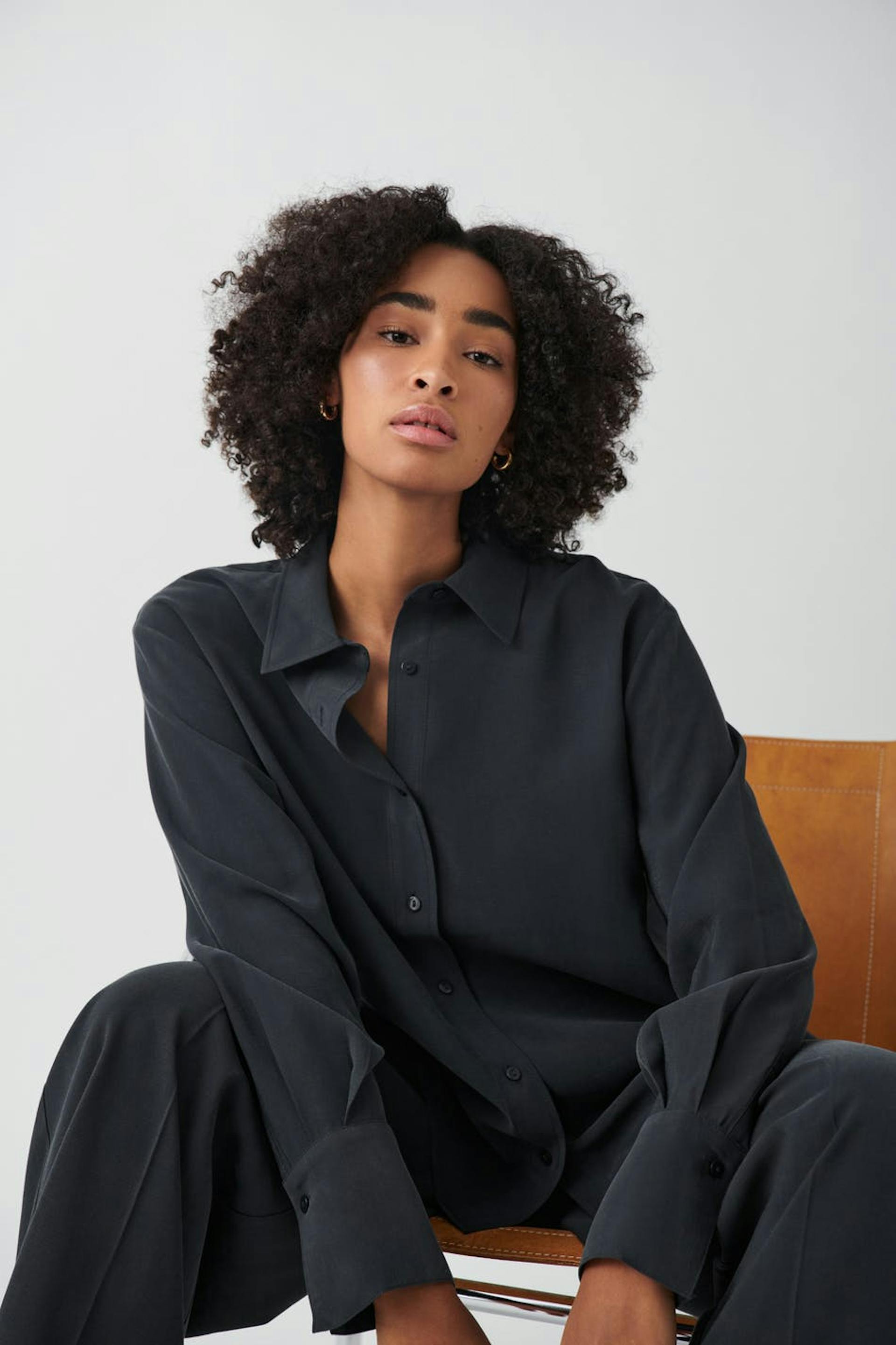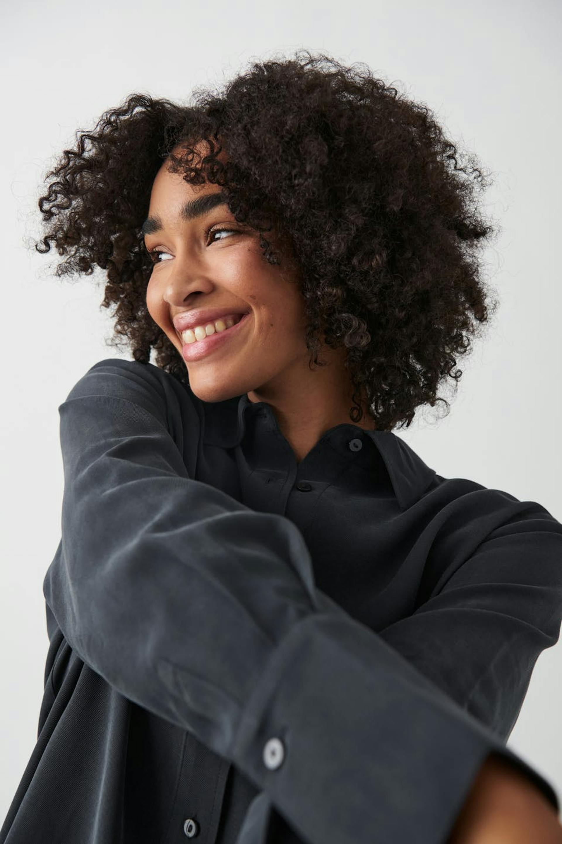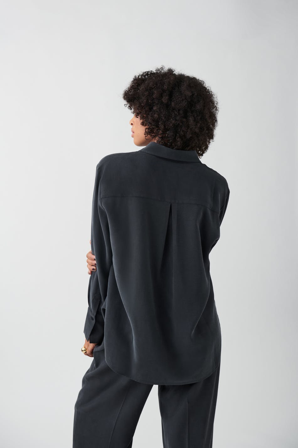Skjorte i viskose med avslappet passform. Skjorten er svartgrå og har knappstolpe på forsiden. Den har krage, bærestykke med fold baktil og langt erme med knapp og mansjett.