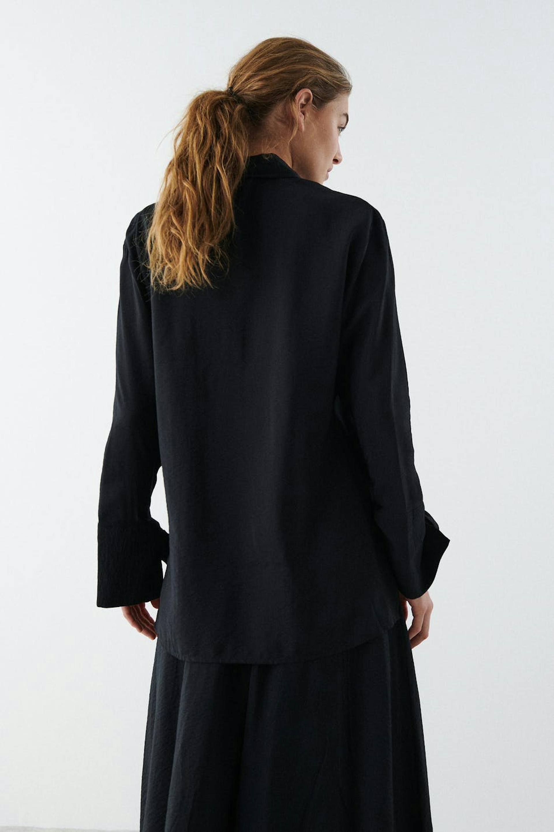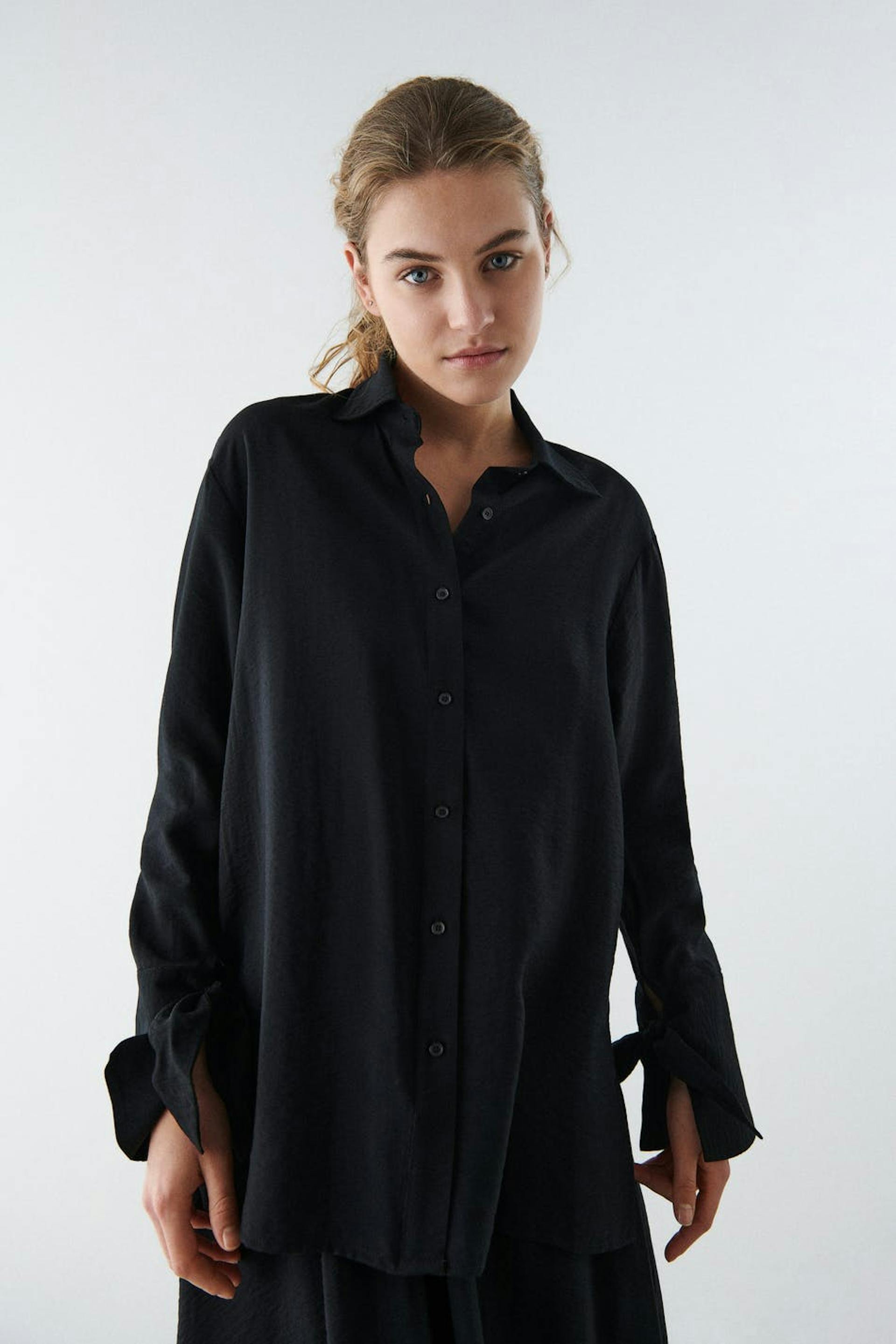Skjorte med en oversized passform. Skjorten er svart og har knappstolpe foran. Den har en krage og mansjetter med knyting.