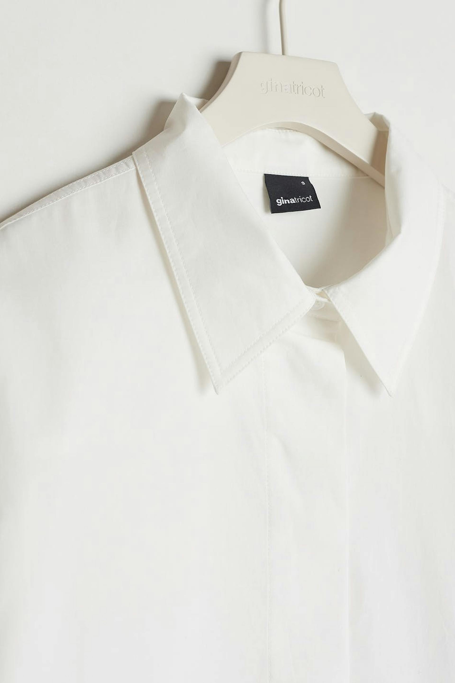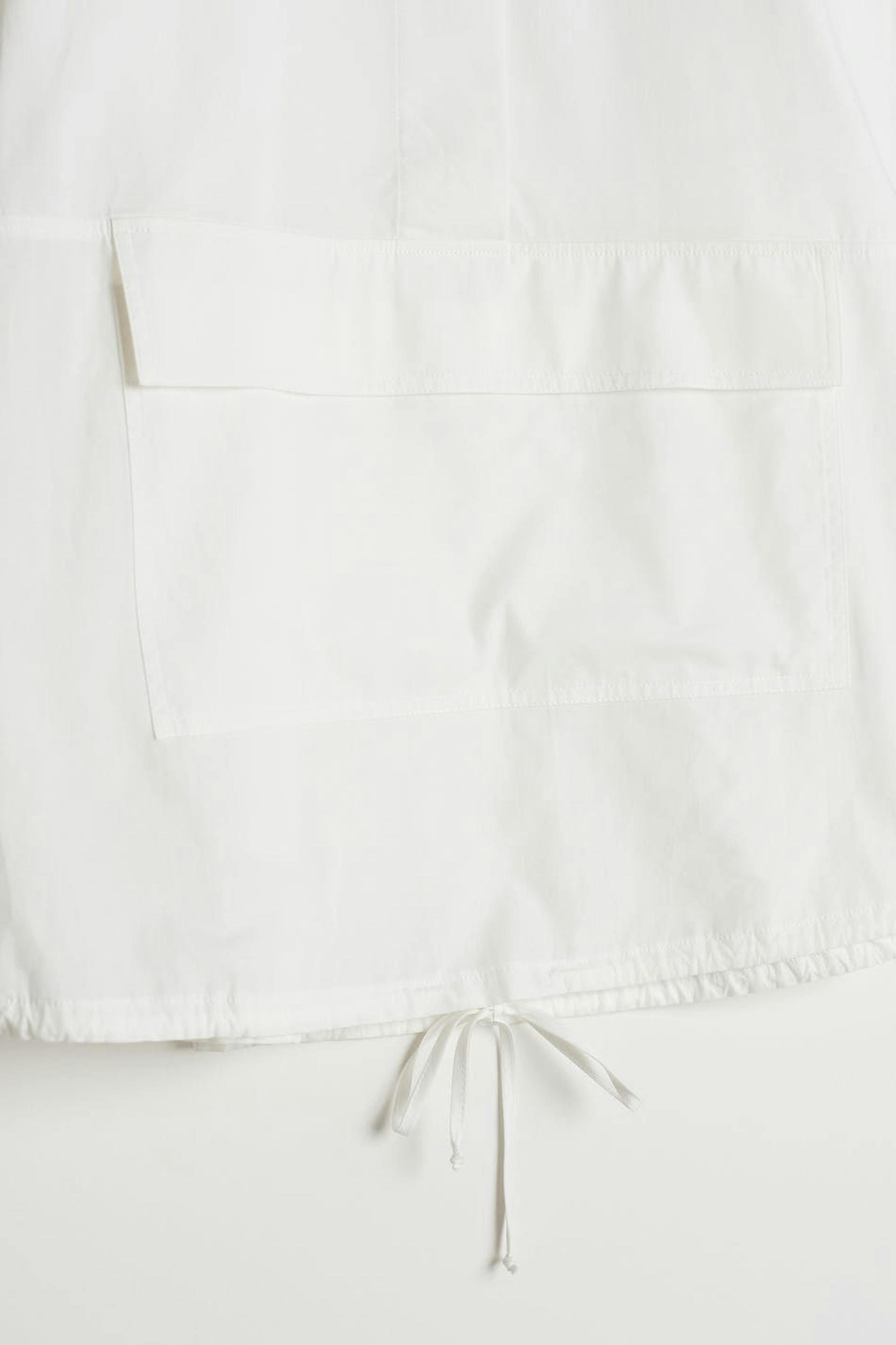 Skjorte med en parkadesign. Skjorten er hvit og har en avslappet, oversize passform. Den er laget av poplin og har knapper på framsiden, en brystlomme med et lokk foran og en snøring med en knyting på bunnen.