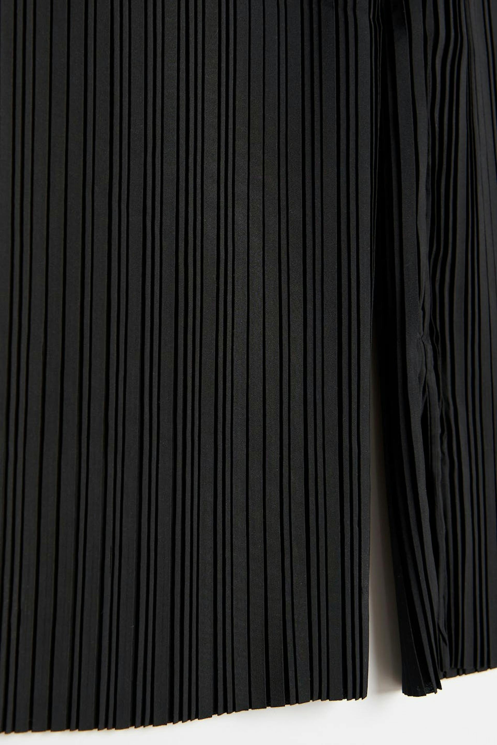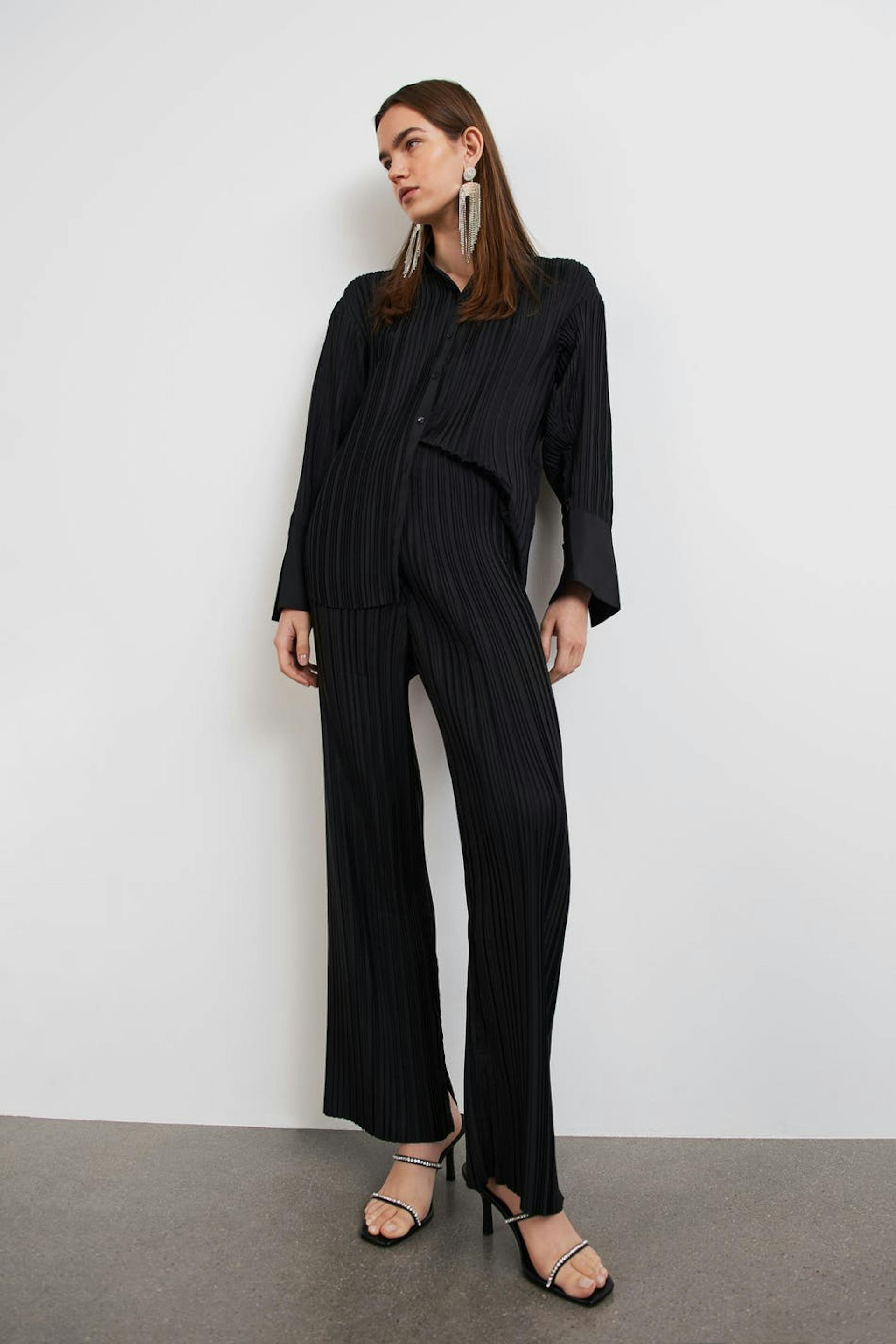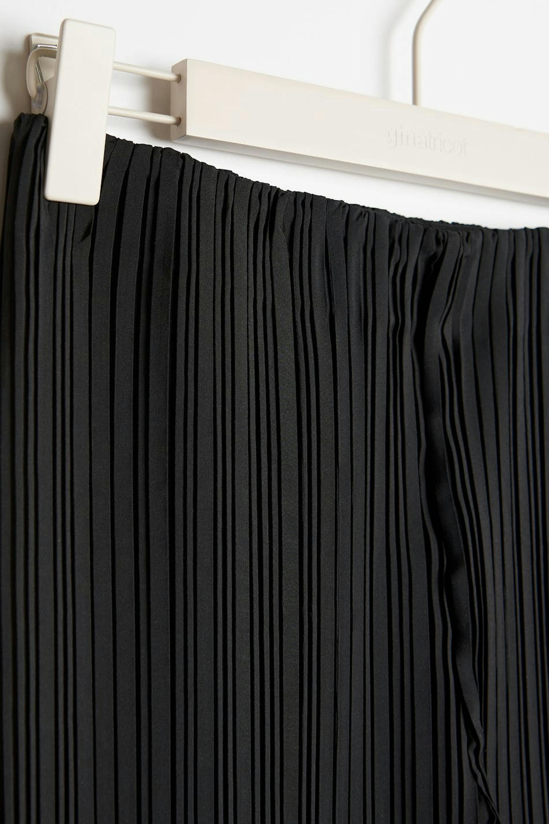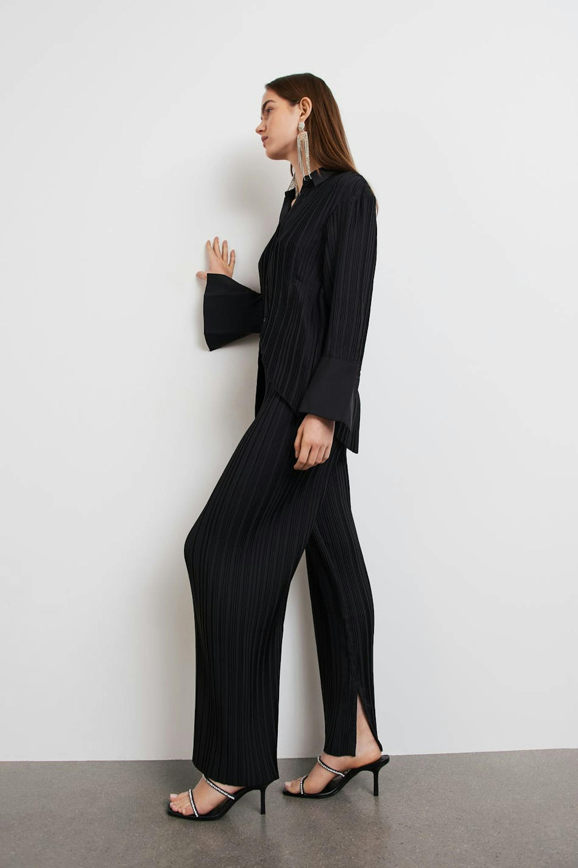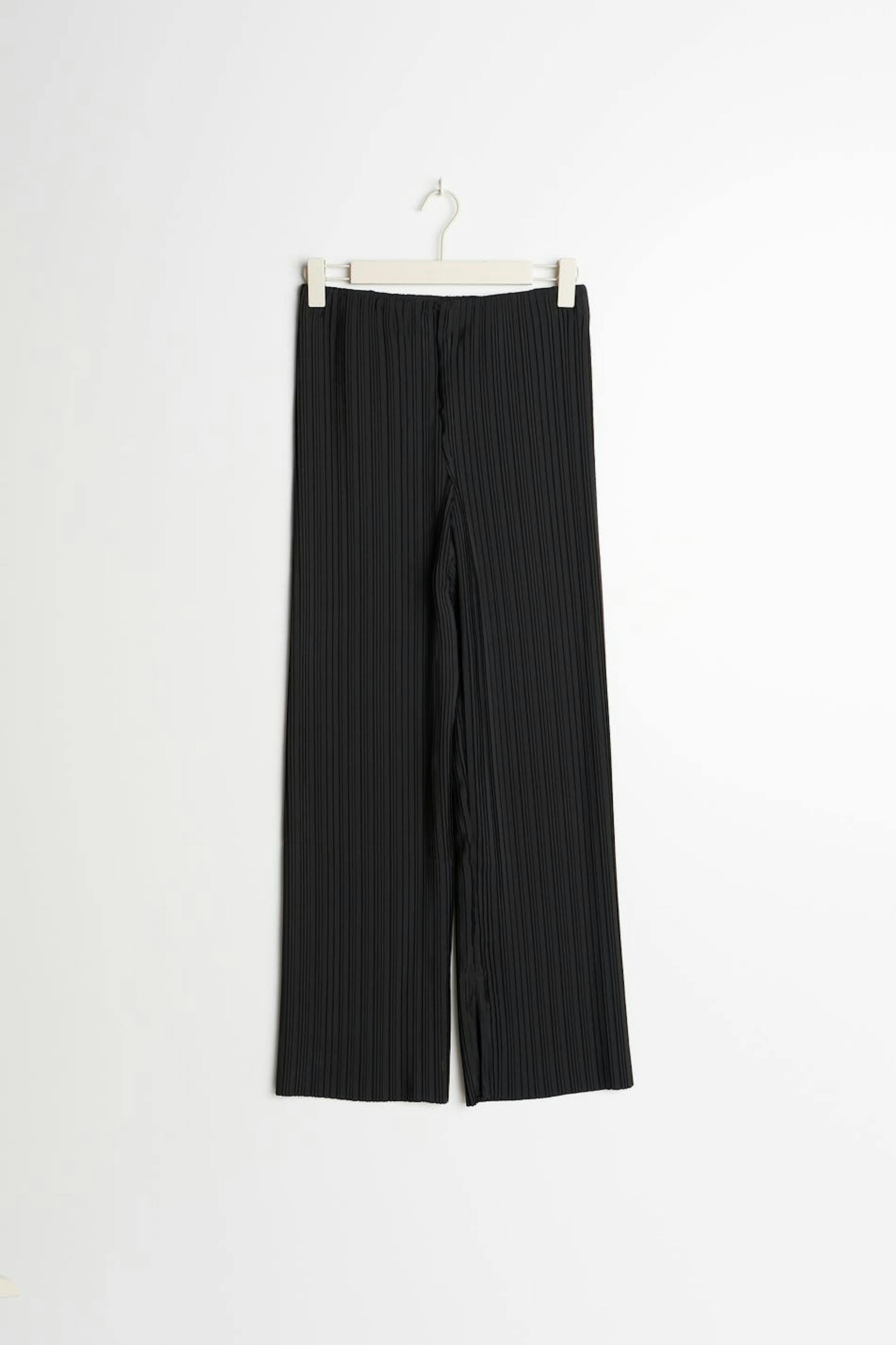 Plisserte bukser med gummistrikk ved midjen. Buksene er perfekte for festen og svarte og har lange, brede buksebein. De har en splitt i enden av benet.