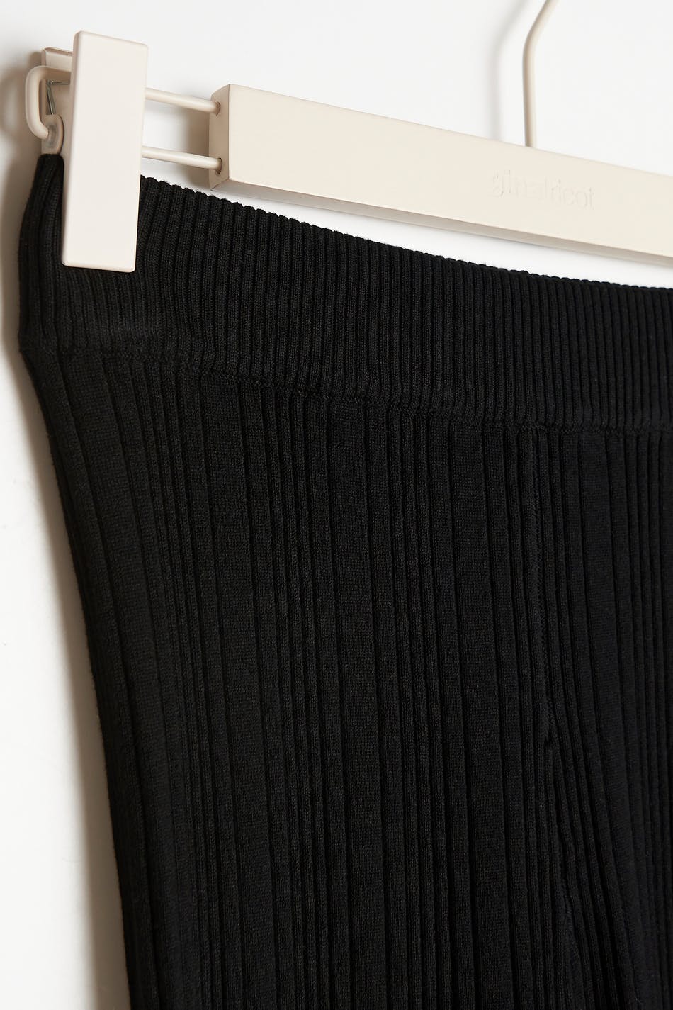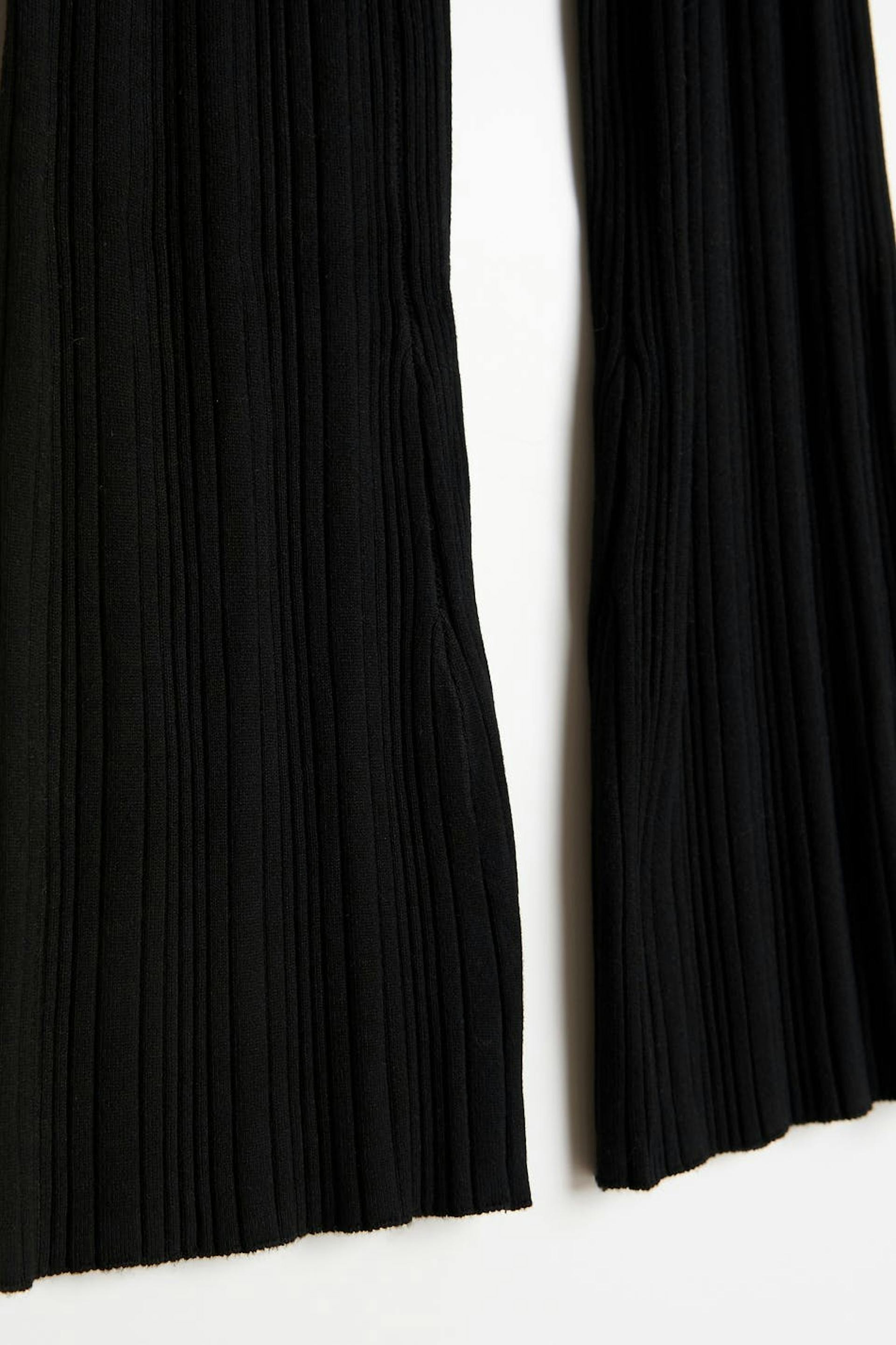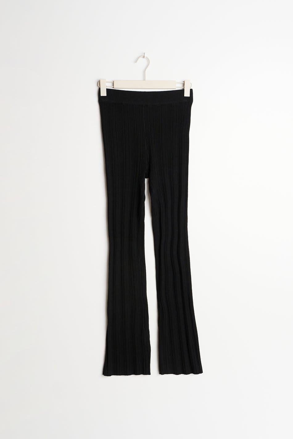 Strikket bukser med uregelmessig ribbestrikket design. Buksene er svarte og har en gummistrikk ved midjen. De har rette bein med litt utsvingede benender.