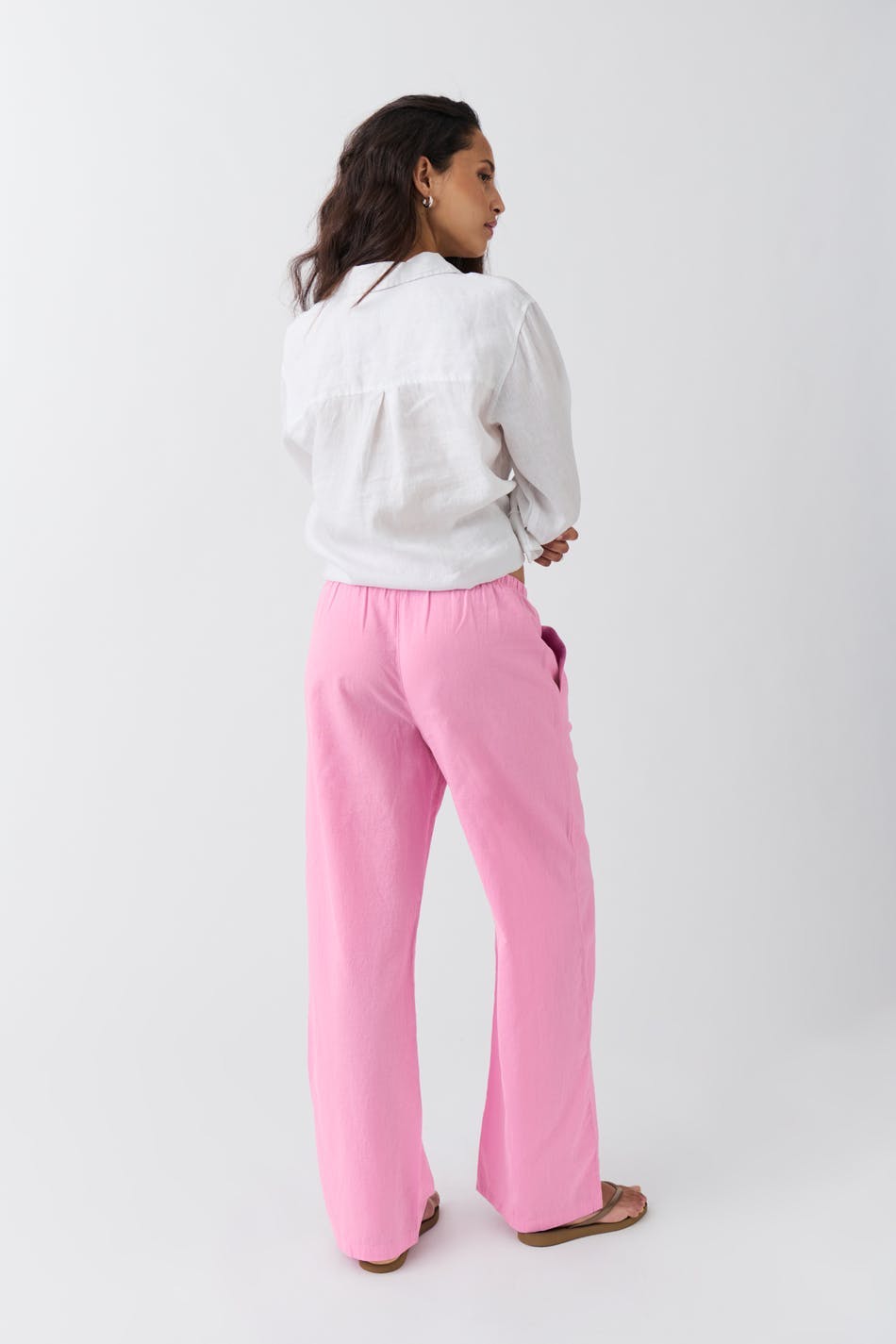 Linbukser med brede bein. Linbuksene er rosa og har medium høy midje. De har sidelommer og gummistrikk ved midjen med knytbar snøre foran.