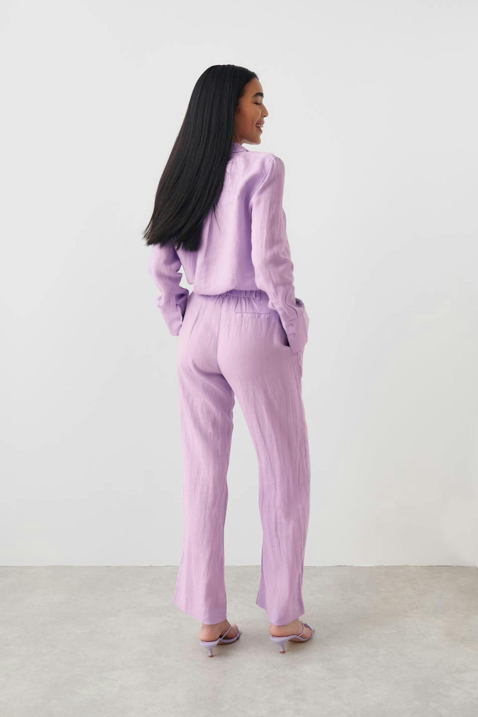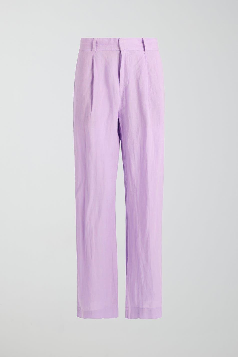 Linbukser med løs passform. Linbuksene er lilla og har folder foran. De har rette bein, gummistrikk i midjen bak, belteløkker, sidelommer og ei passpolert lomme baktil.