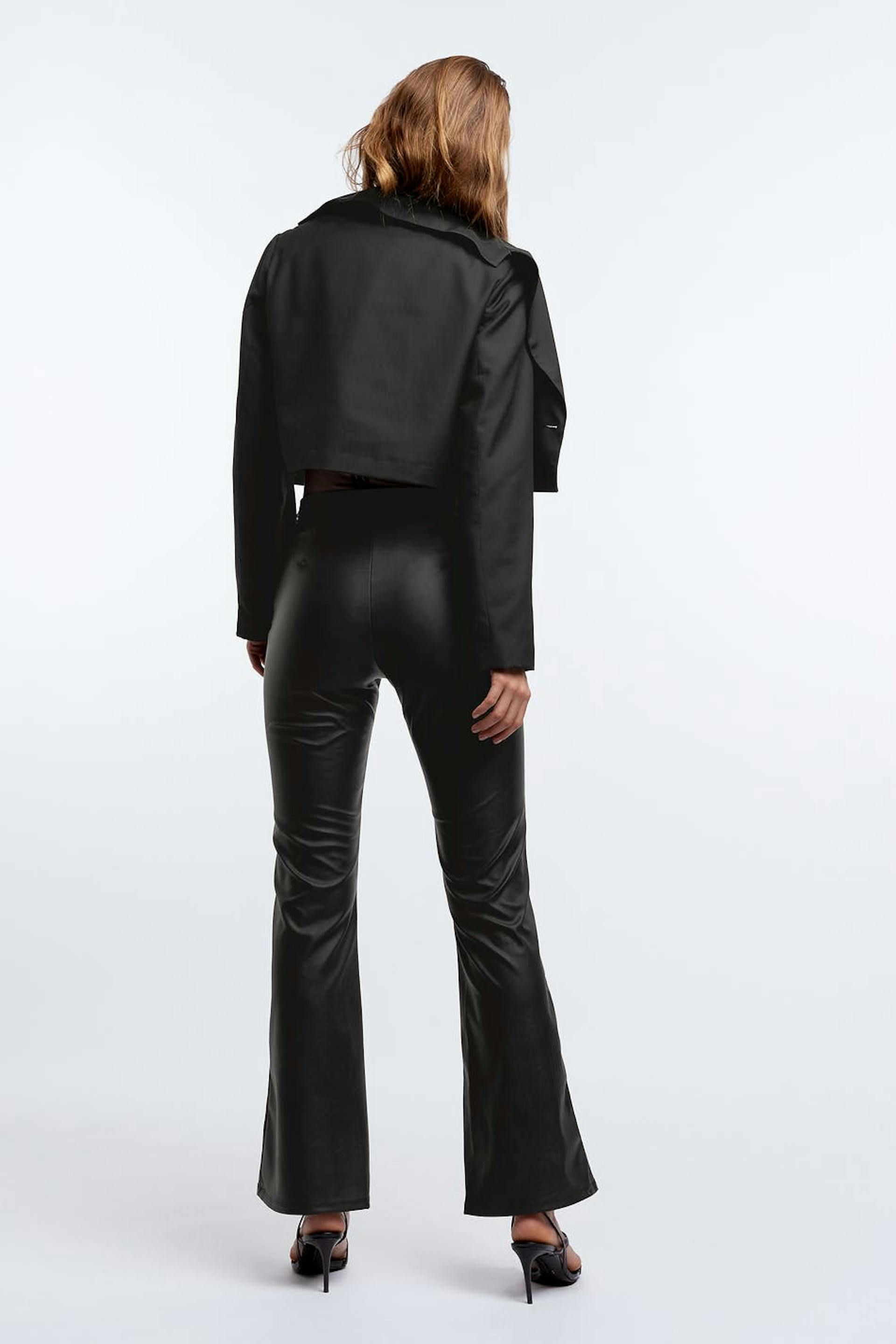 Utsvingte bukser med en tilpasset passform. Buksene er svarte og har en høy midje med en elastisk strikk. De er laget av PU og har en tynn foring i bomull og en glidelås på siden.