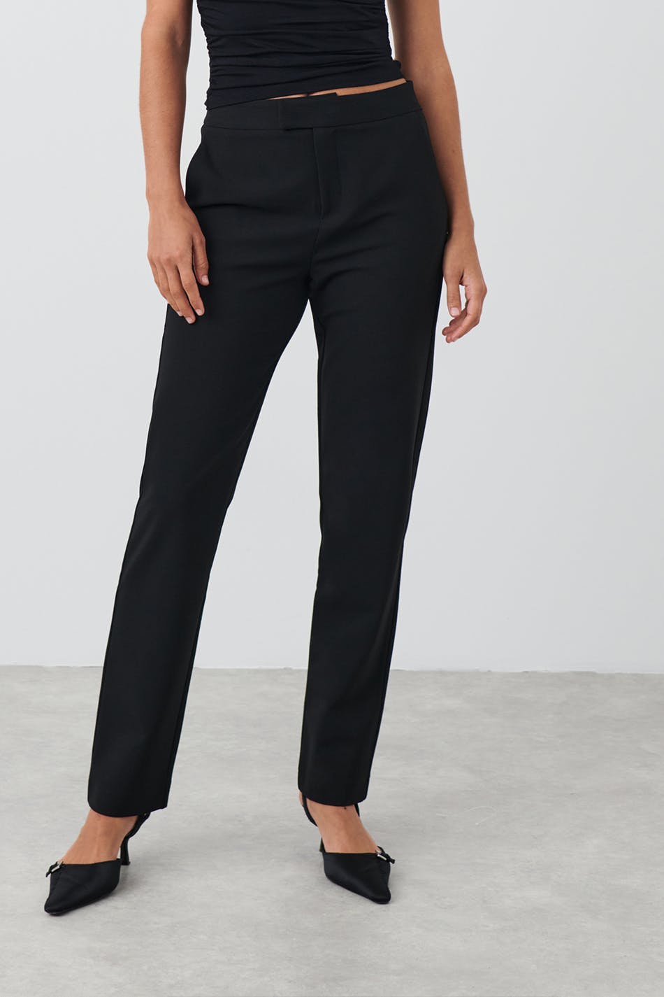 Små dressbukser med slim-fit. Buksene er svarte og har høy midje. De har stretchy kvalitet, avsmalnende bein, sidelommer og lynlås. Passer til deg som er 160 cm eller lavere.