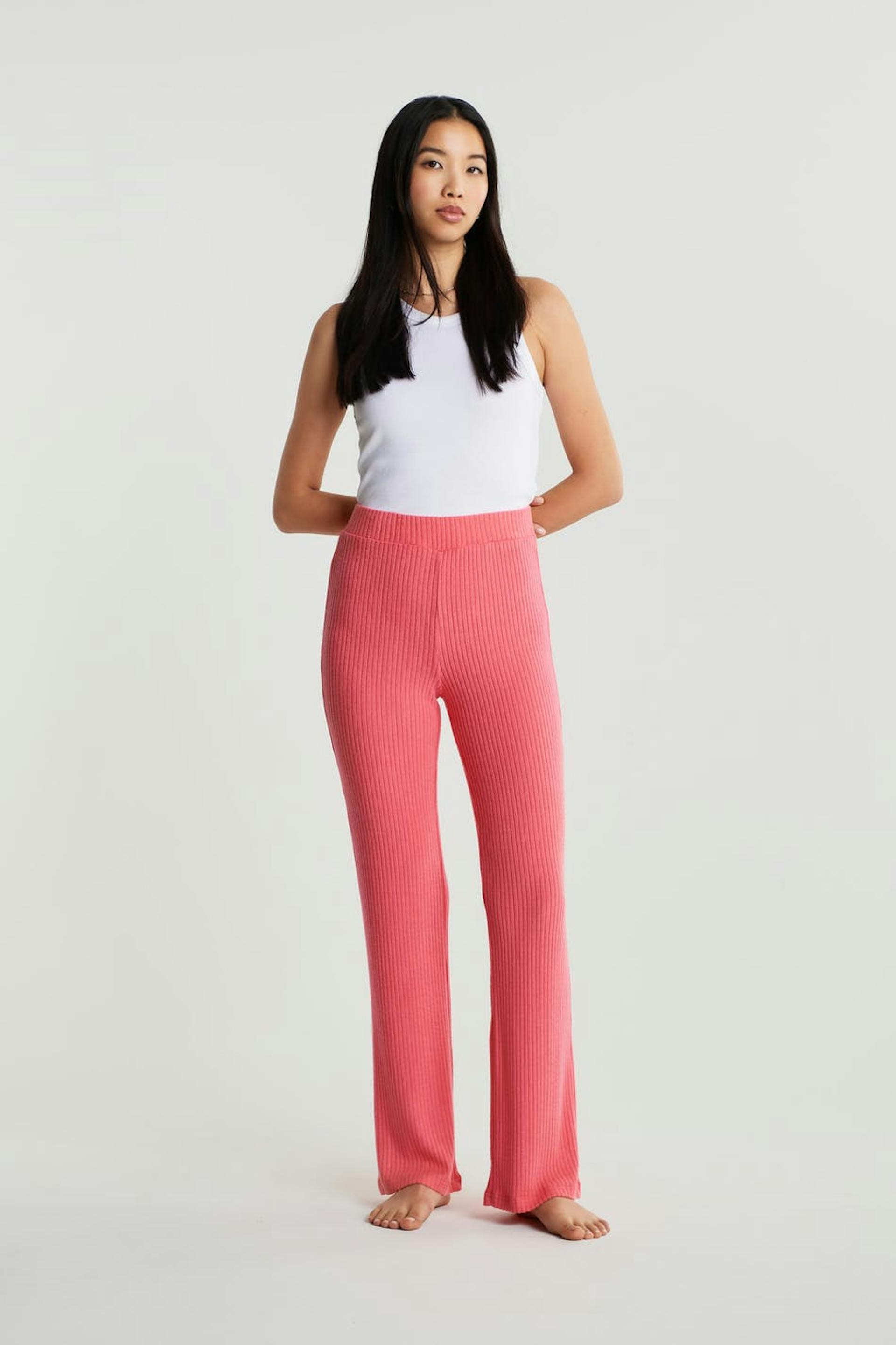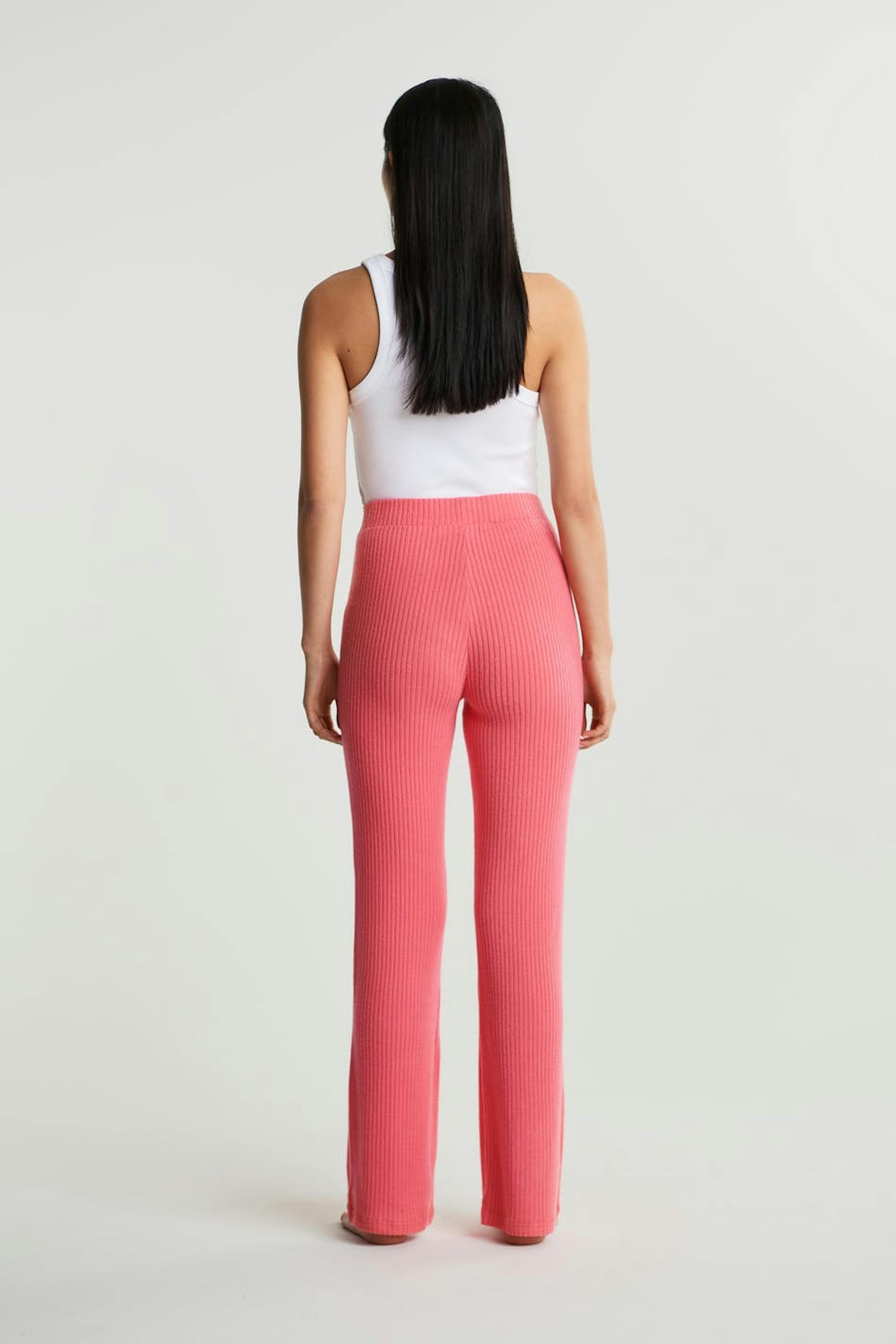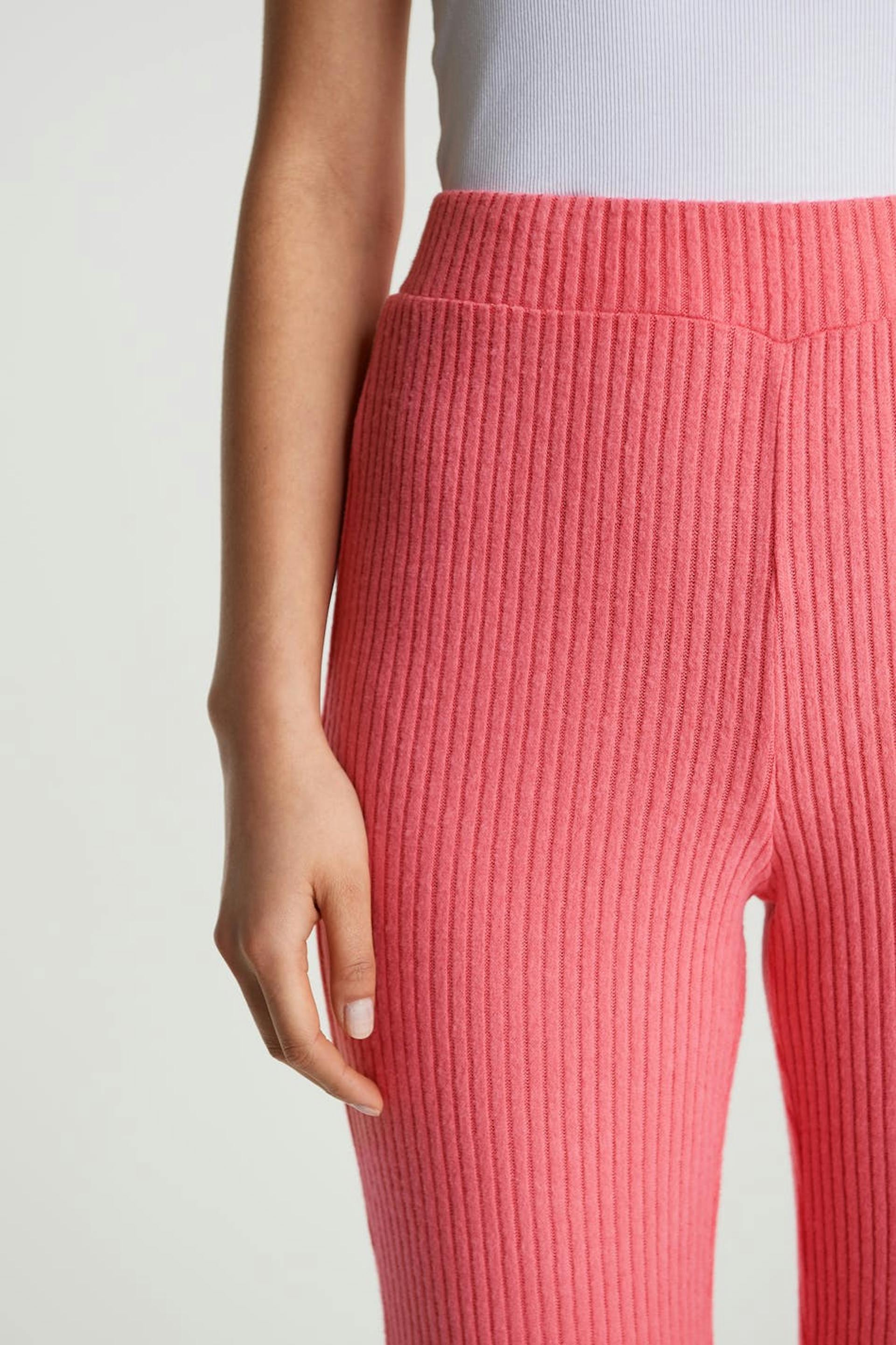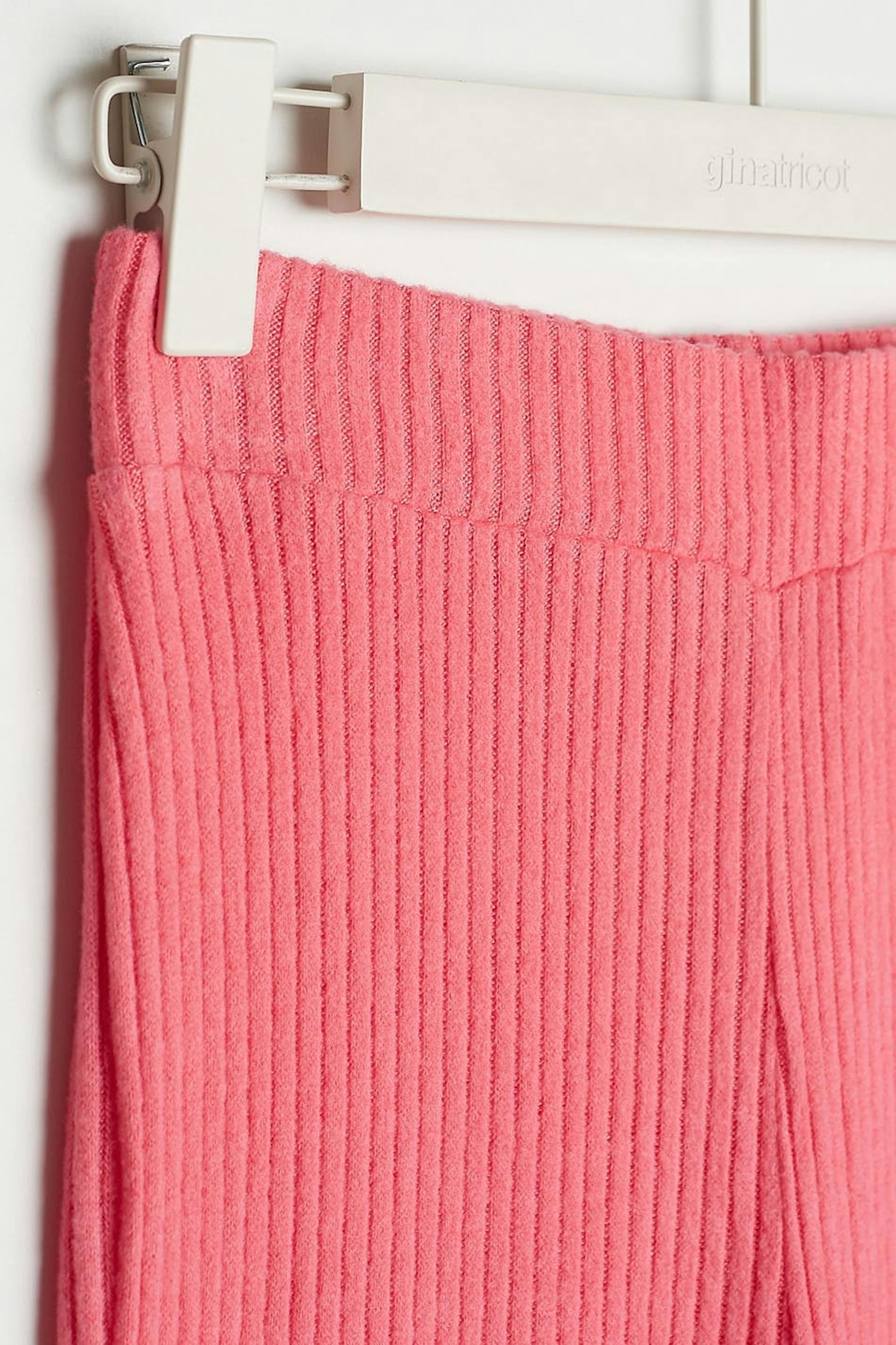 Ribbestrikkede treningsbukser med rette bein. Buksene er rosa og har en myk elastisk strikk ved midjen.