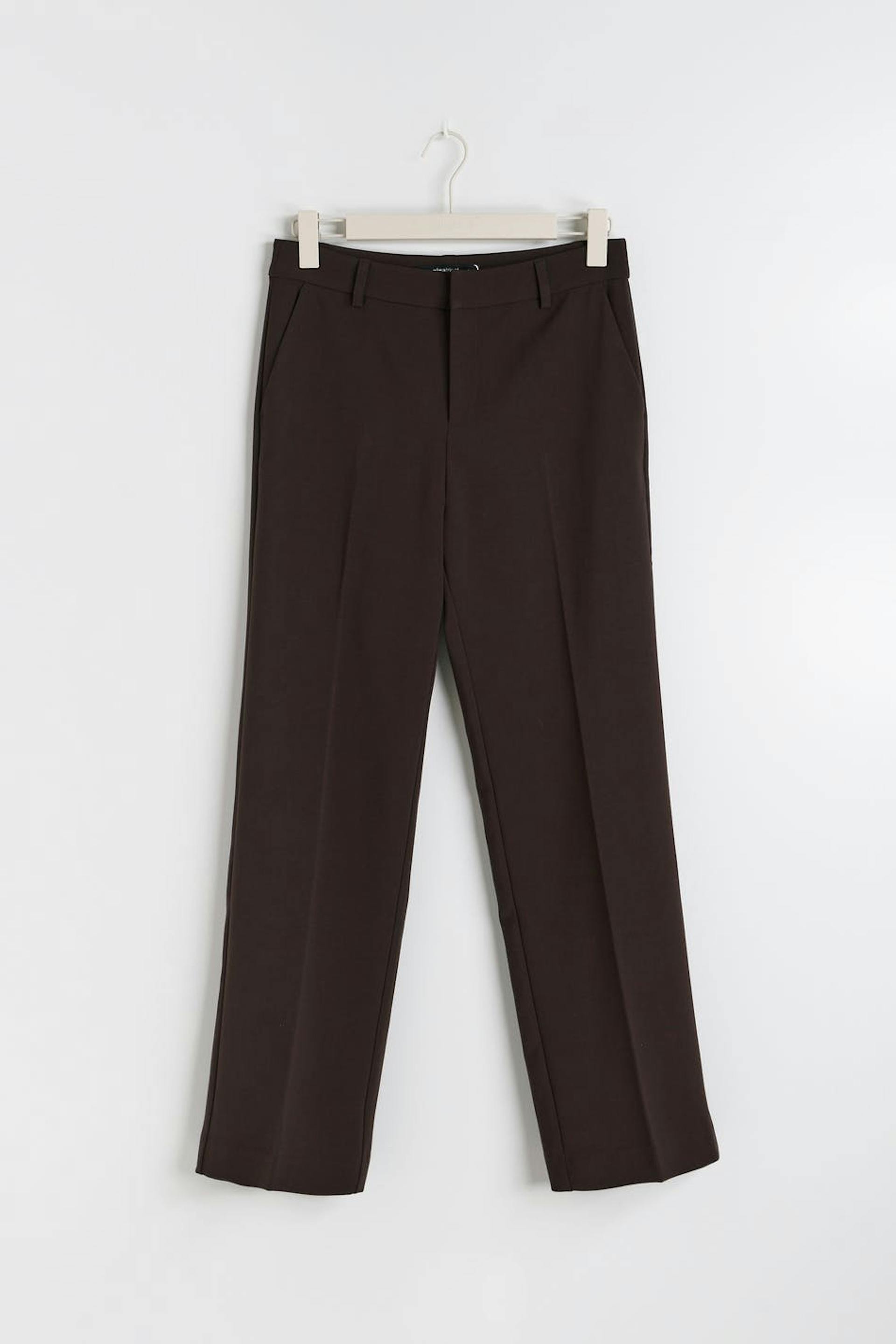 Rette dressbukser med press foran. Buksene er brune og har lommer i sidene. De har delte lommer baktil og rette buksebein med en lenger benlengde. Passer til deg som er 175 cm eller høyere.