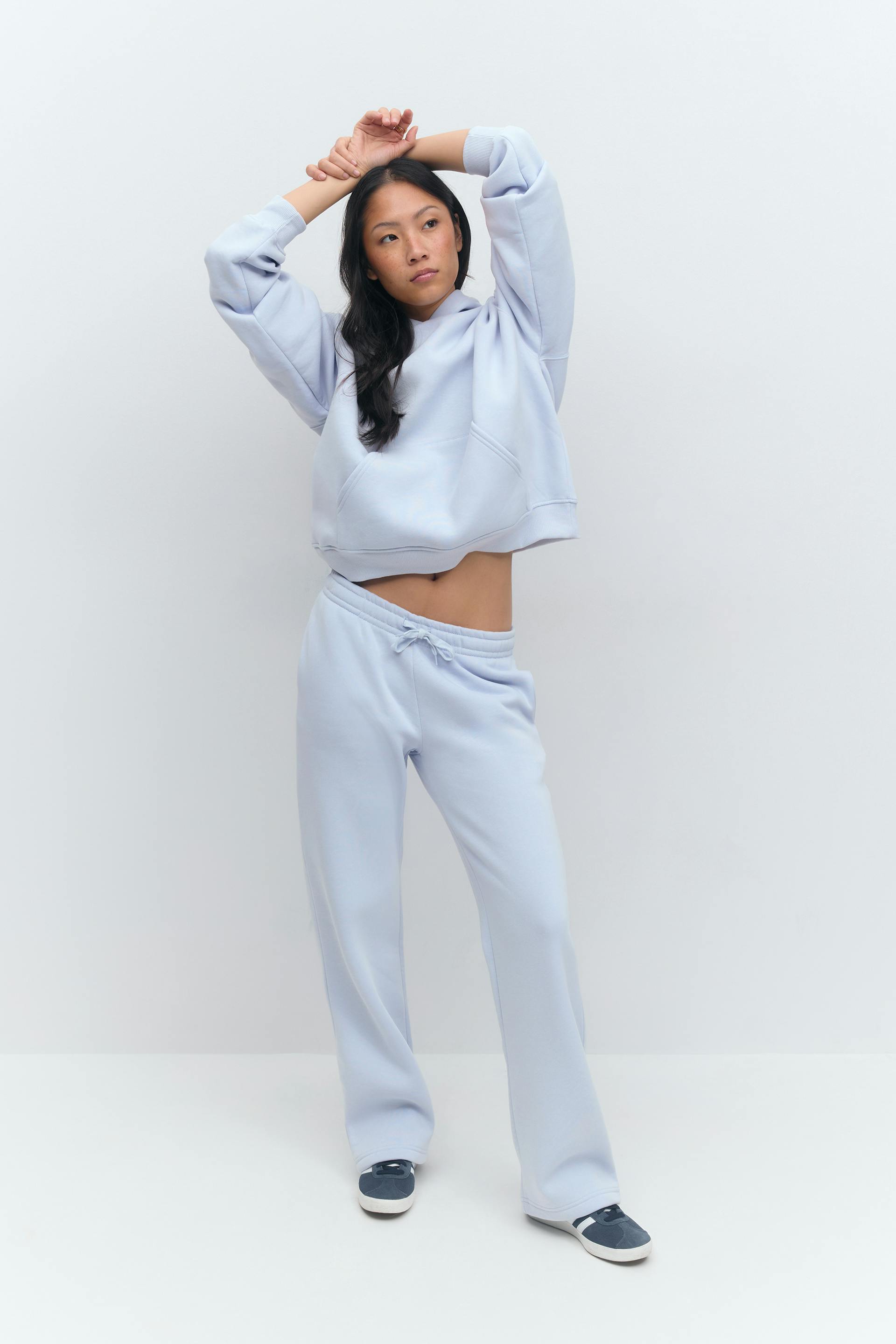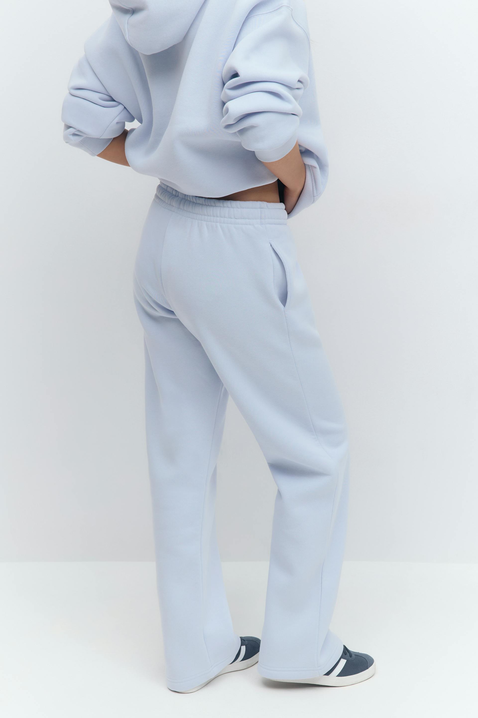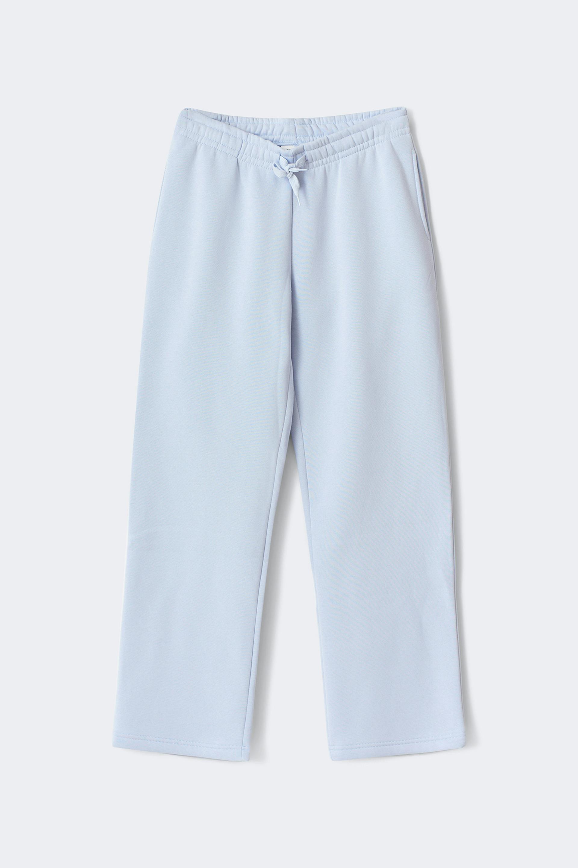Treningsbukser med normal passform. Buksene er lyseblåe og har lommer i sidene. De har rette bein og gummistrikk ved midjen med knyting foran.