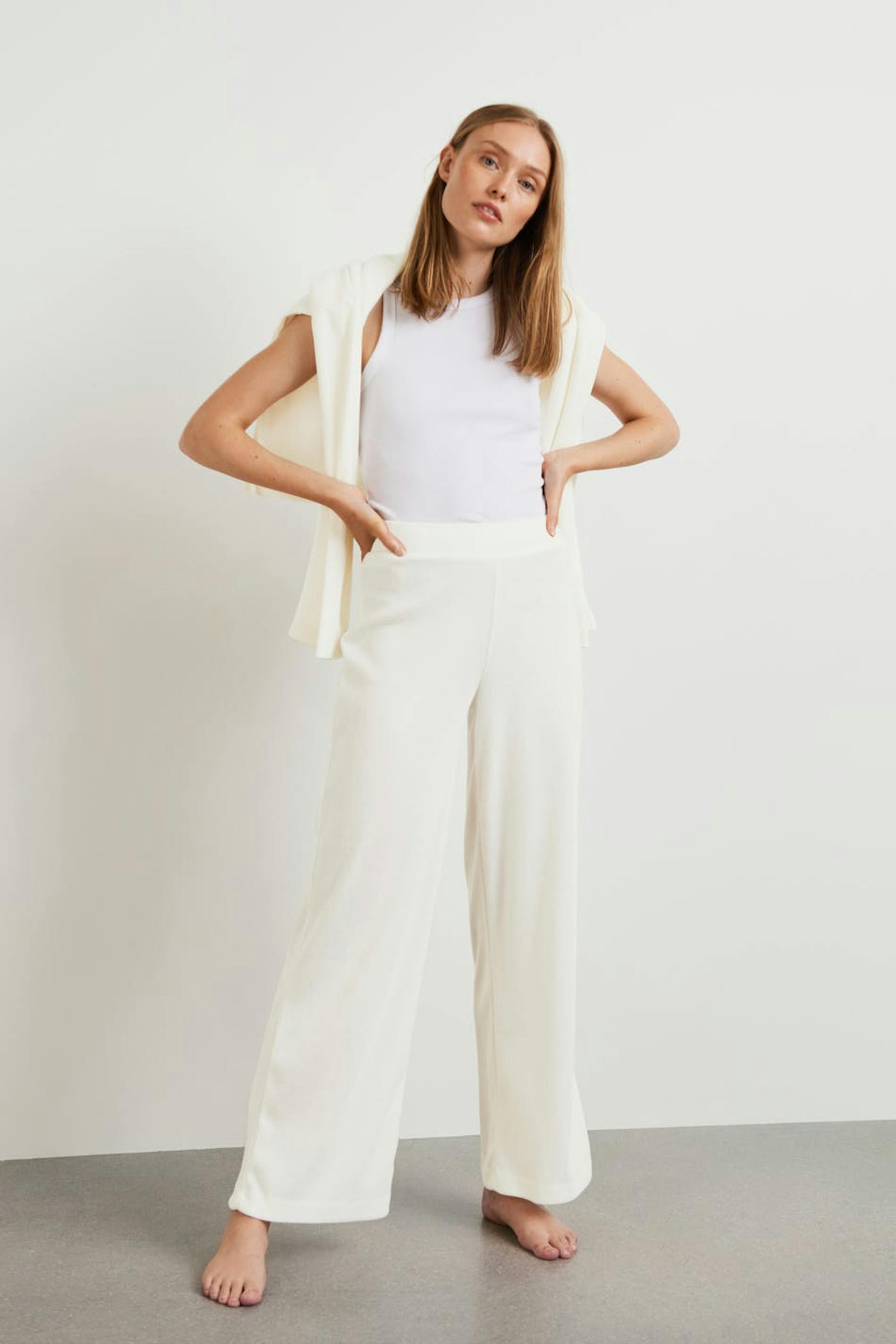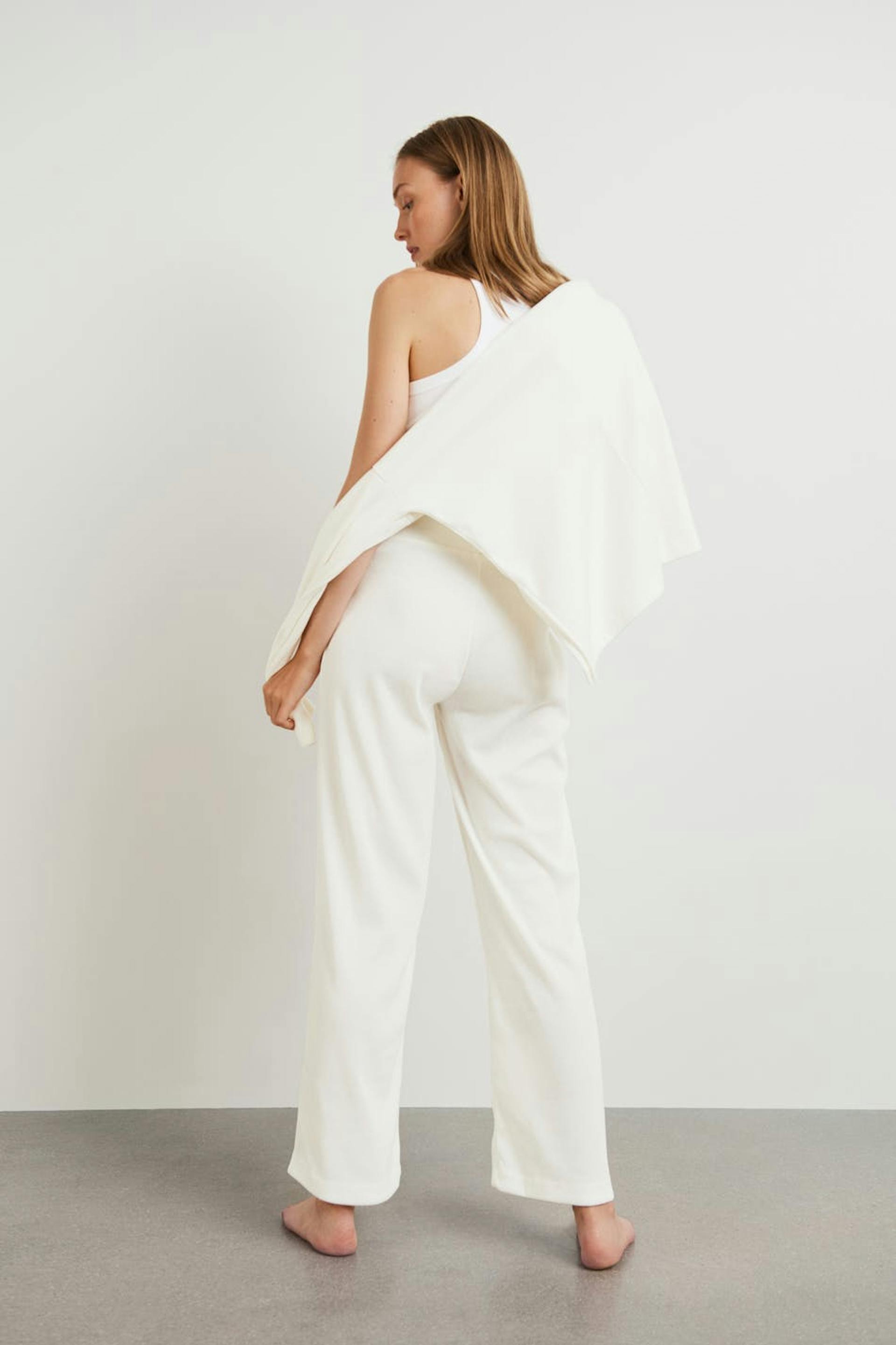 Treningsbukser med en vanlig passform. Buksene er hvite og har myk kvalitet. De har rette buksebein med en full lengde og en myk gummistrikk ved midjen.