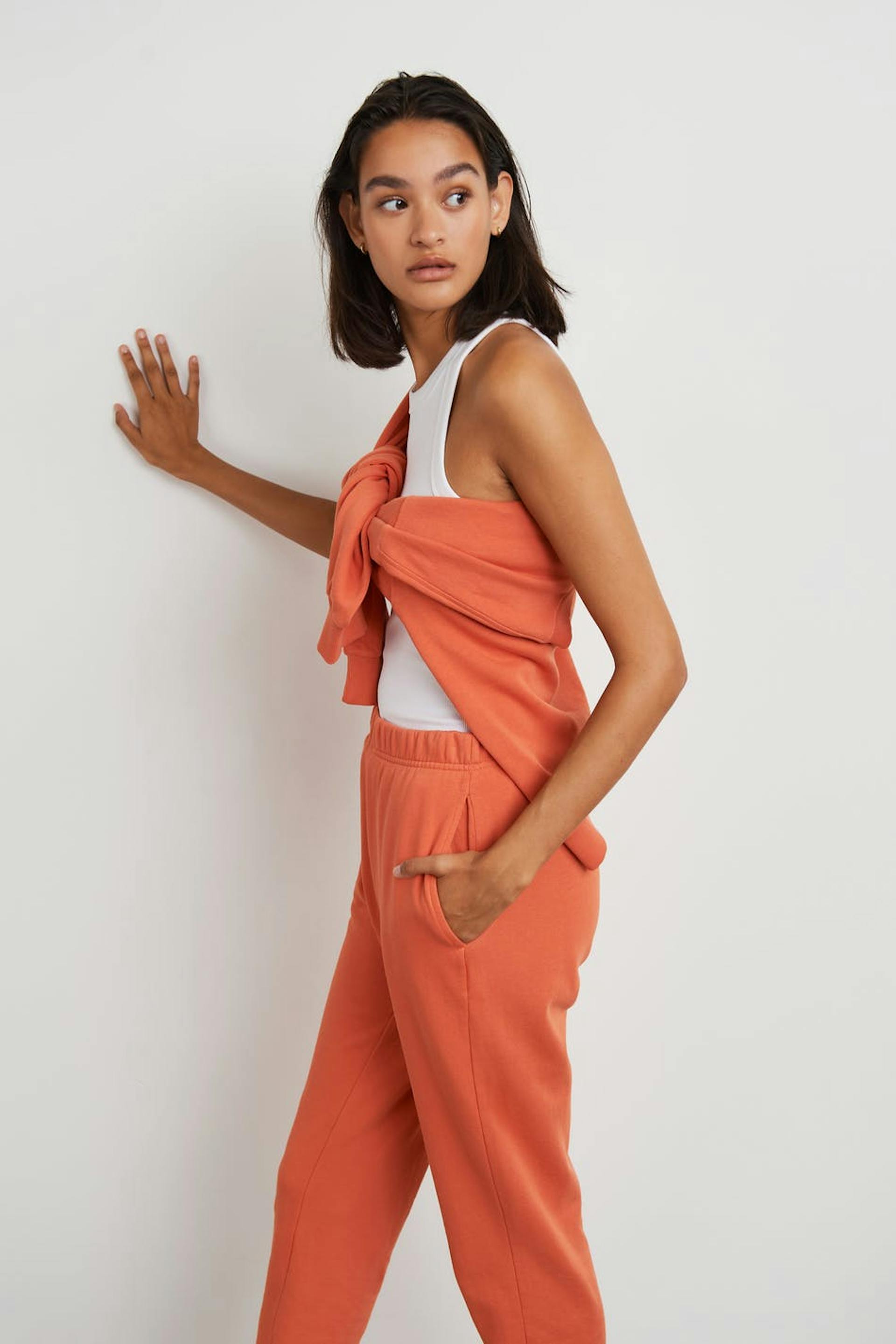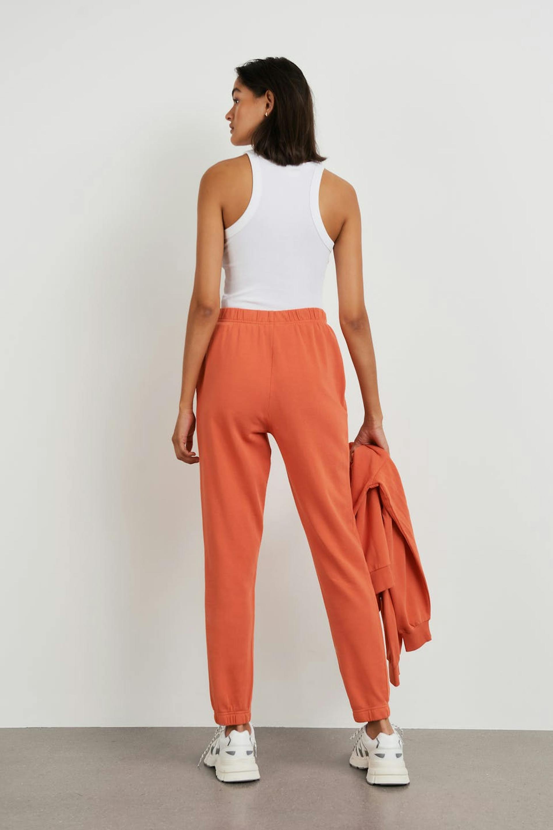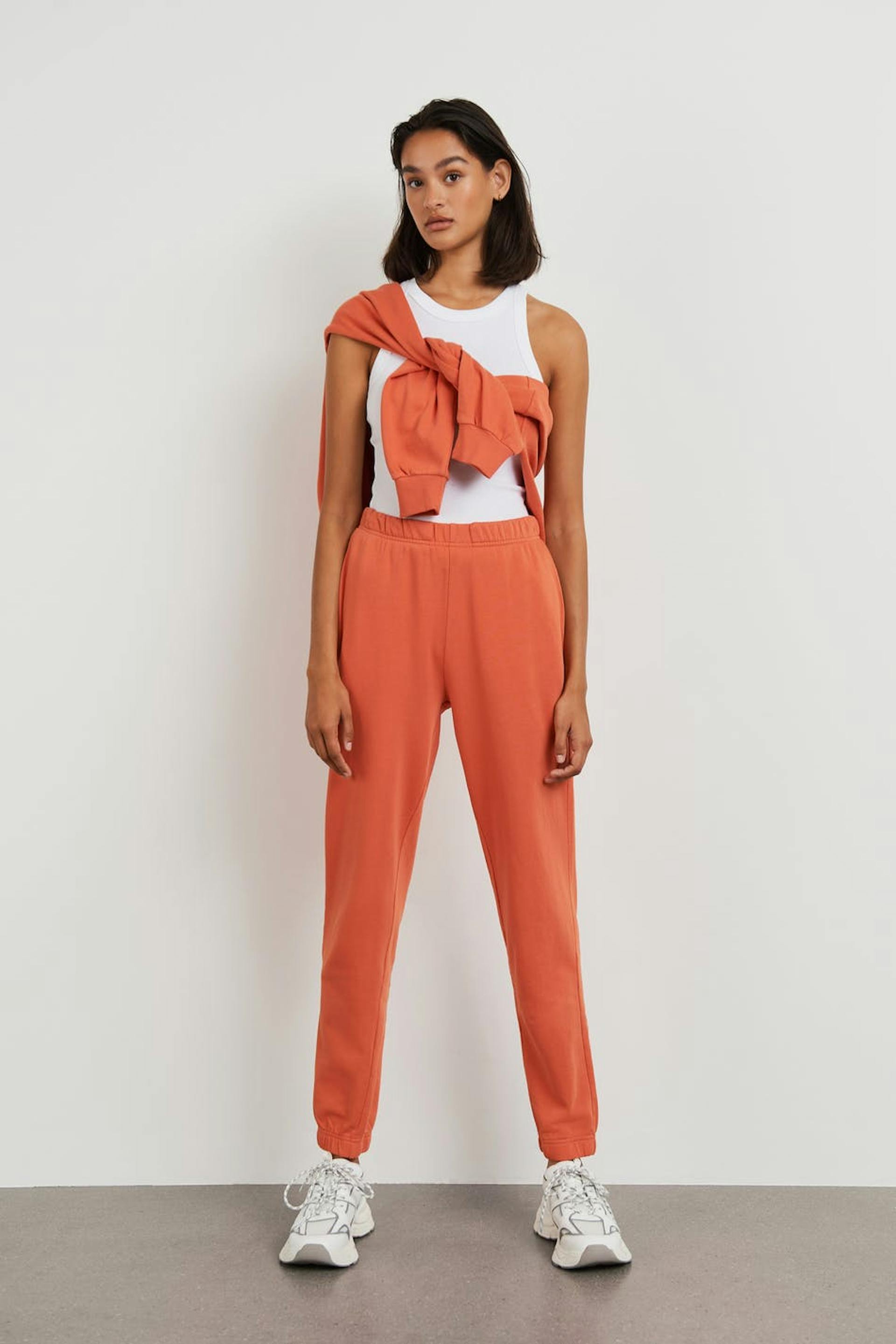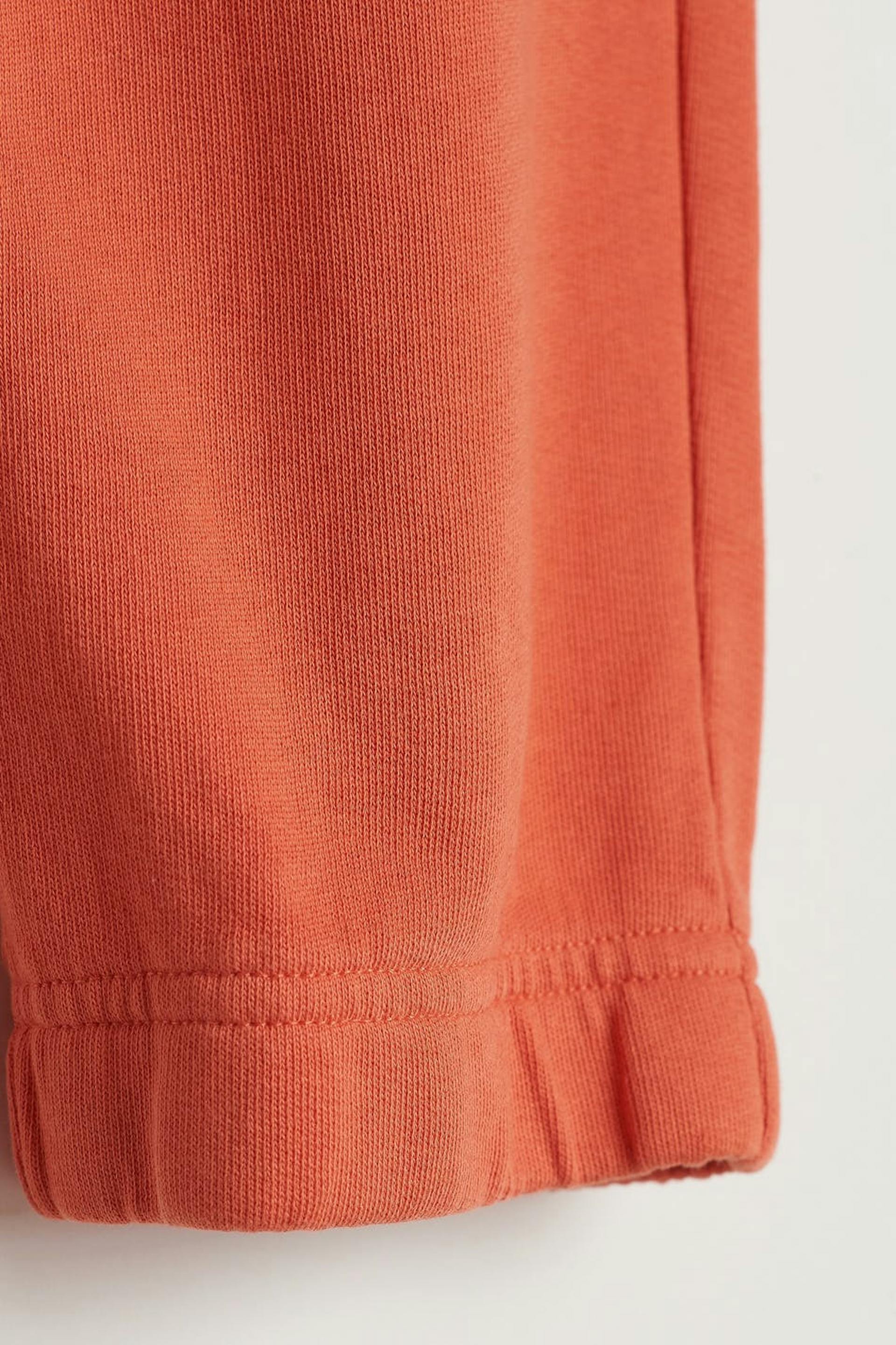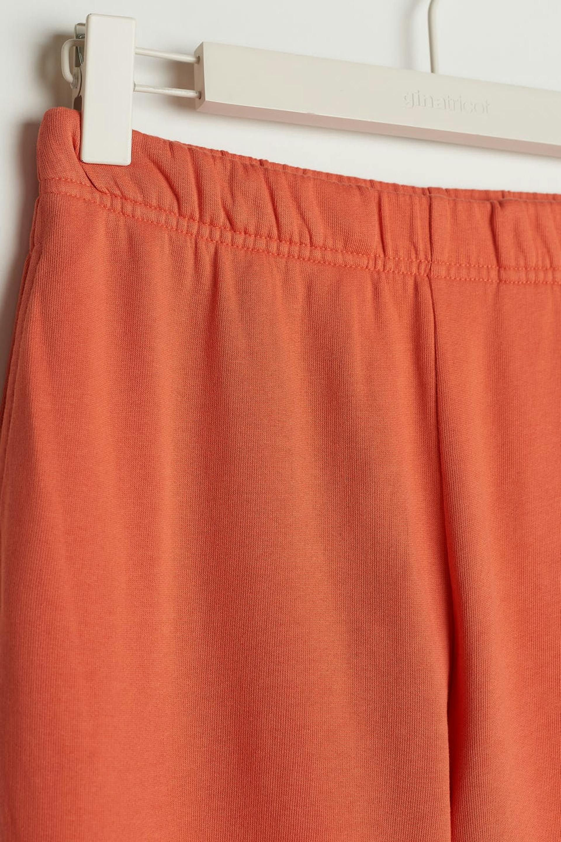 Treningsbukser med en oversized passform. Buksene er oransje og har et mykt materiale i bomull. De har lommer i sidene og en gummistrikk ved midjen og i enden av benet.