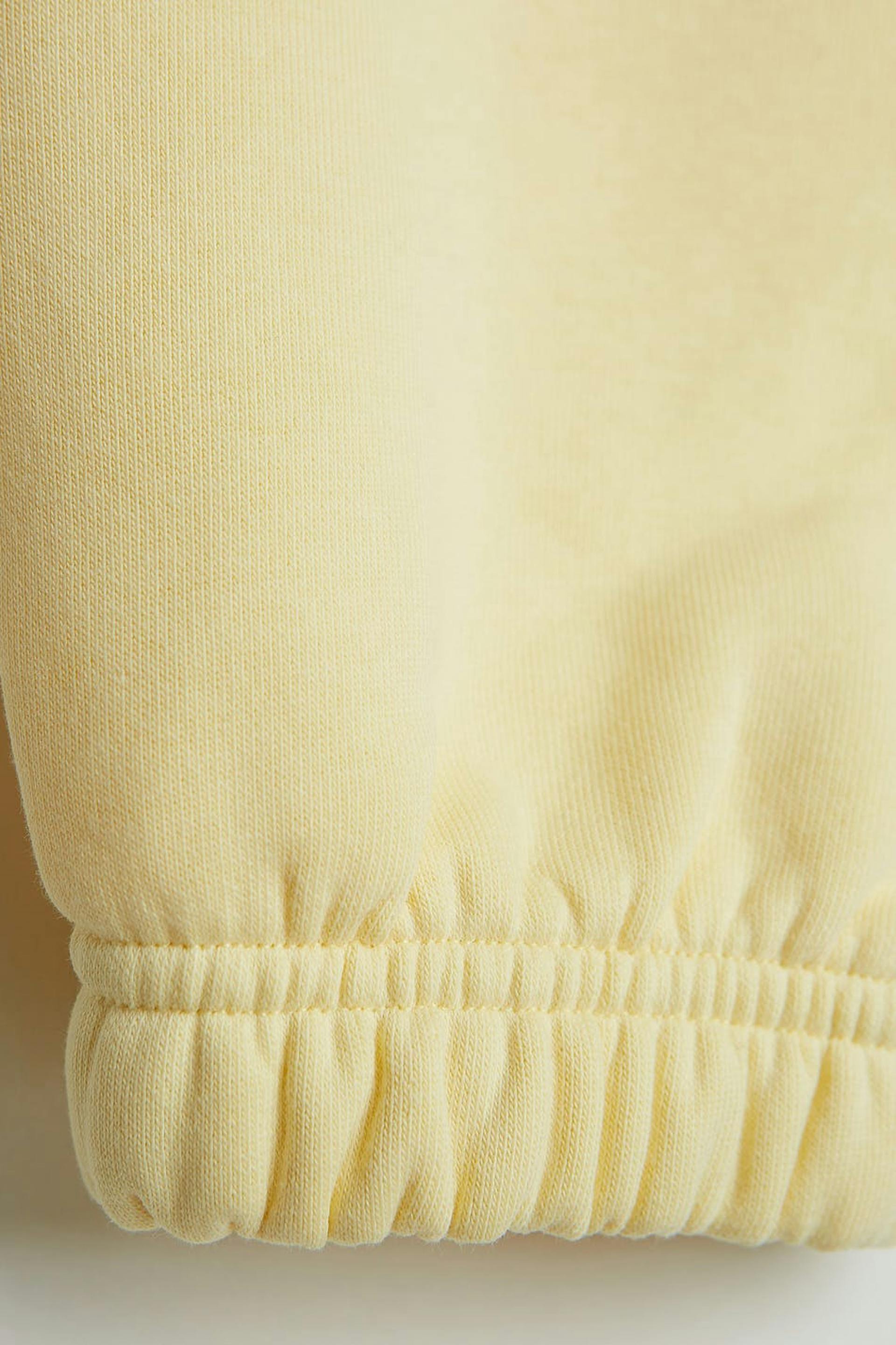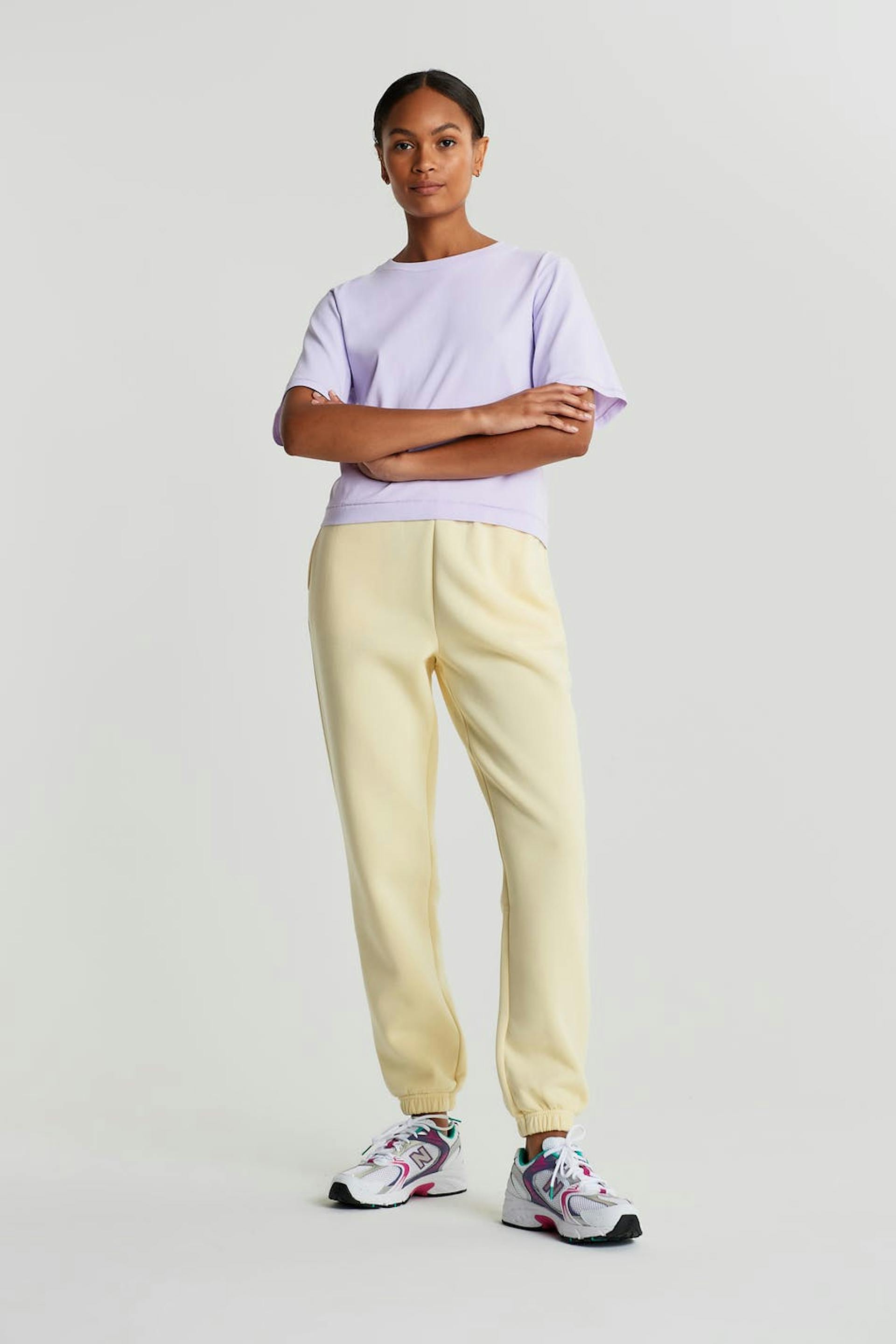 Treningsbukser med en vanlig passform. Buksene er lysegule og har en elastisk strikk ved midjen og i enden av benet.