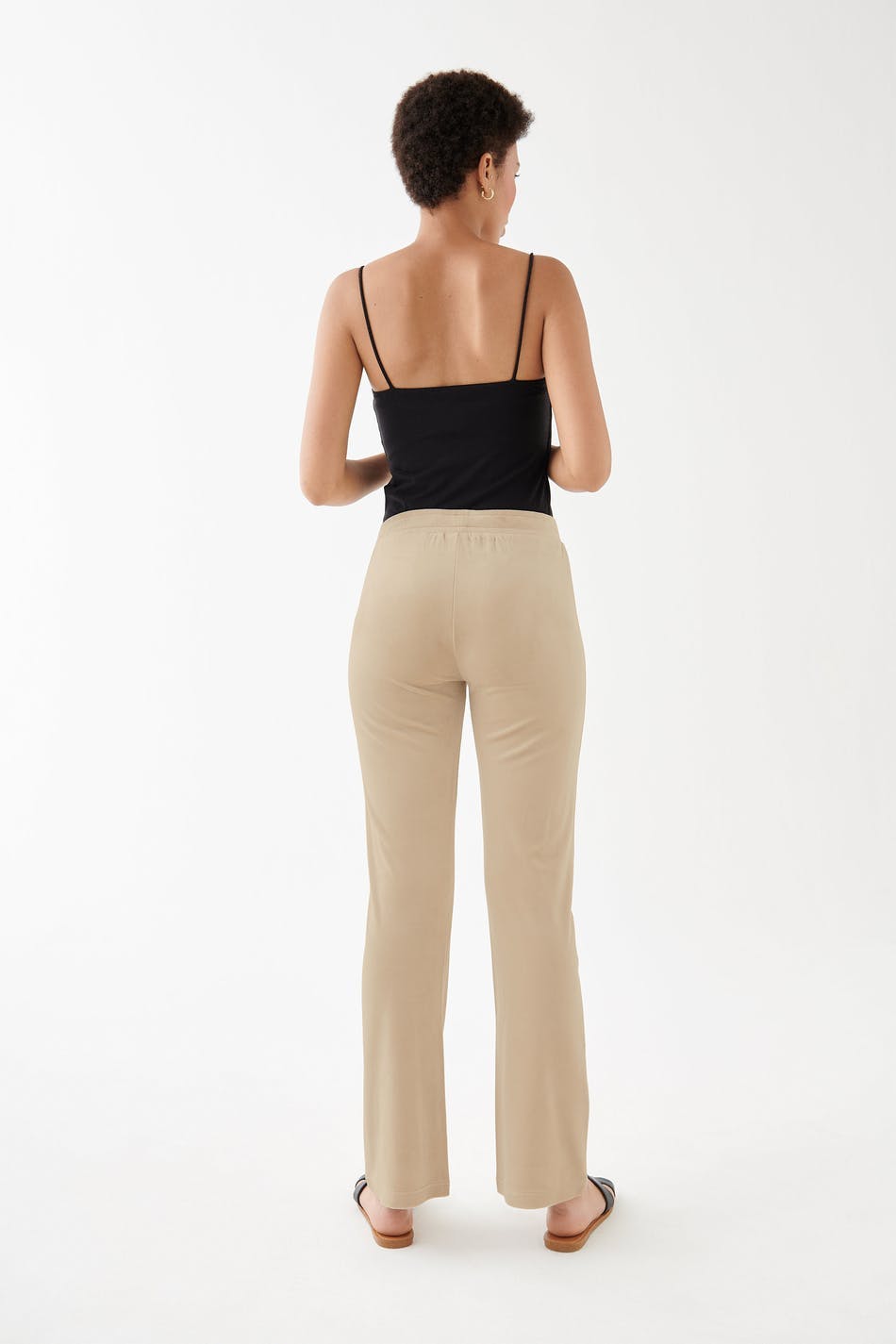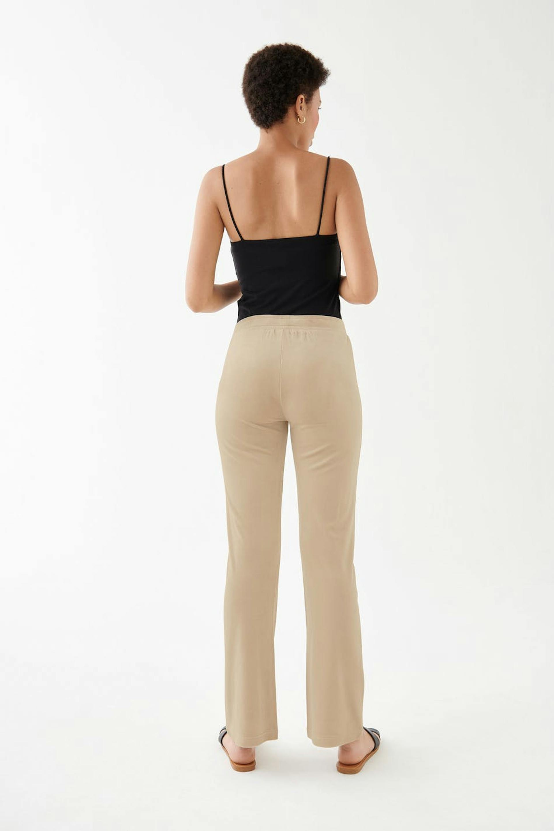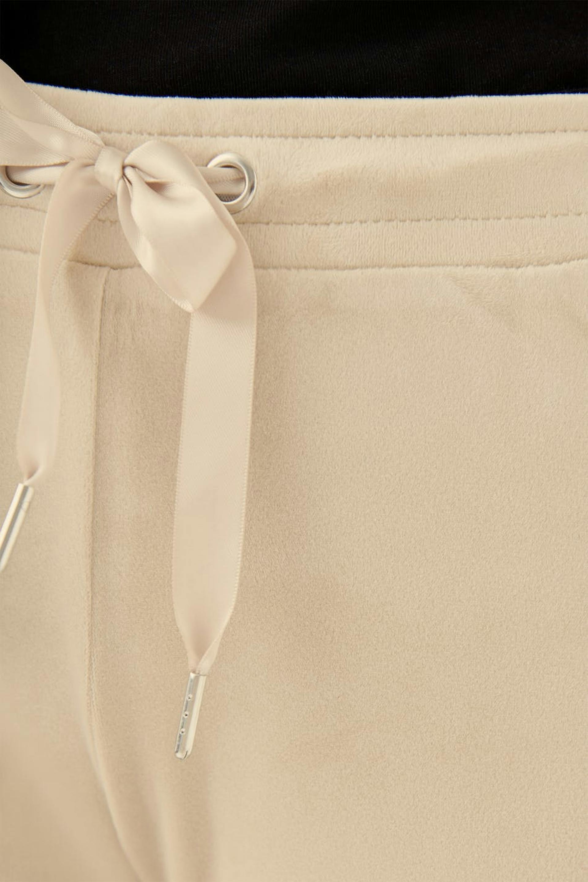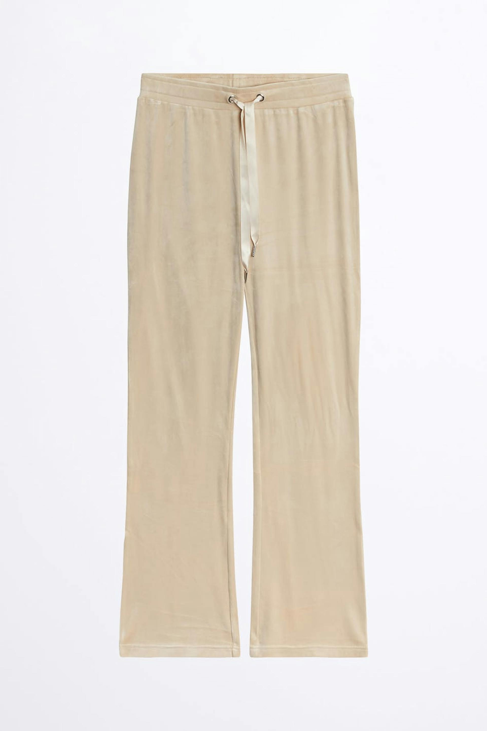 Treningsbukser med rette bein. Buksene er beige og har en midje med en elastisk stropp og en snøring. De er laget av velur. Holdes unna åpen ild.